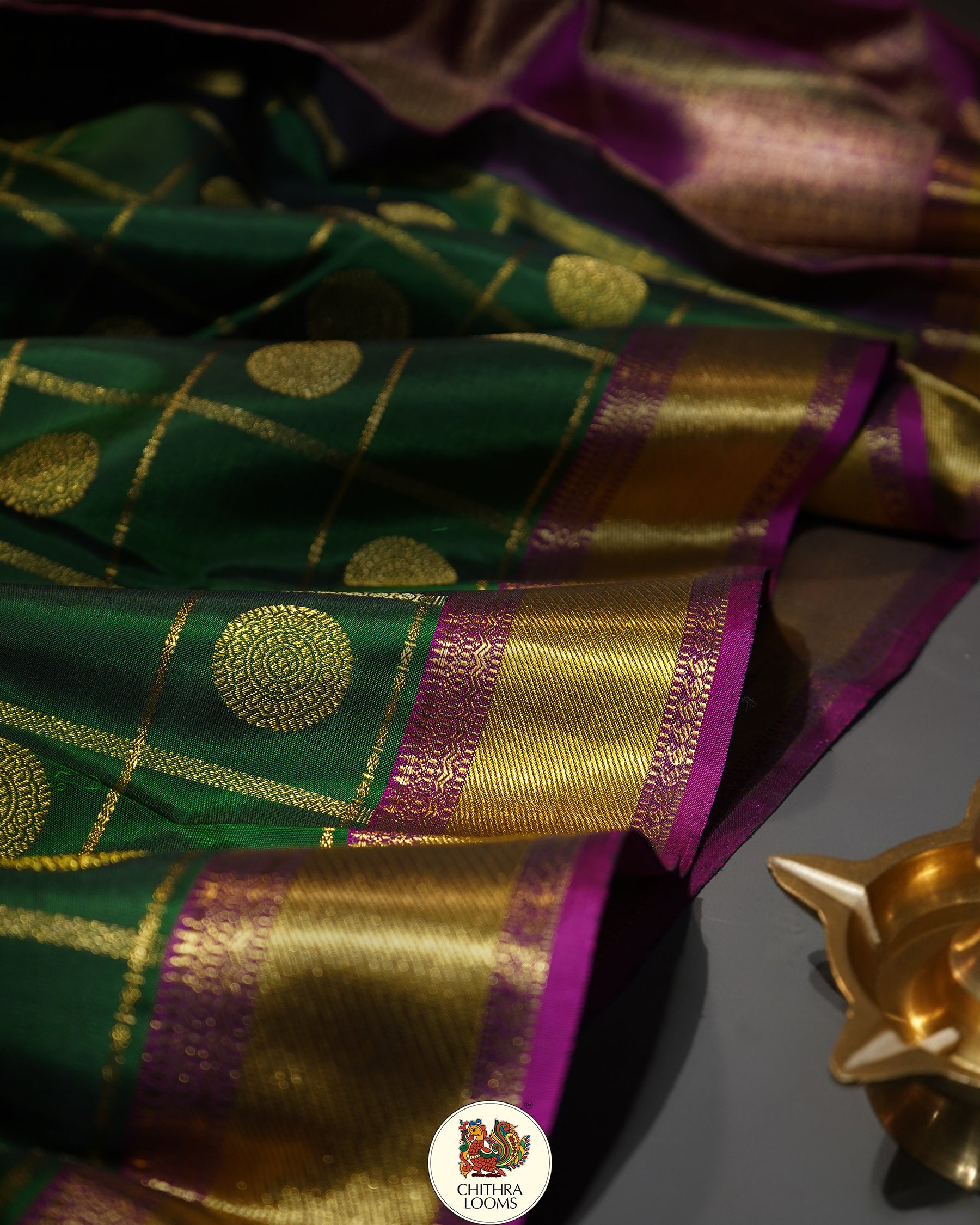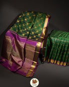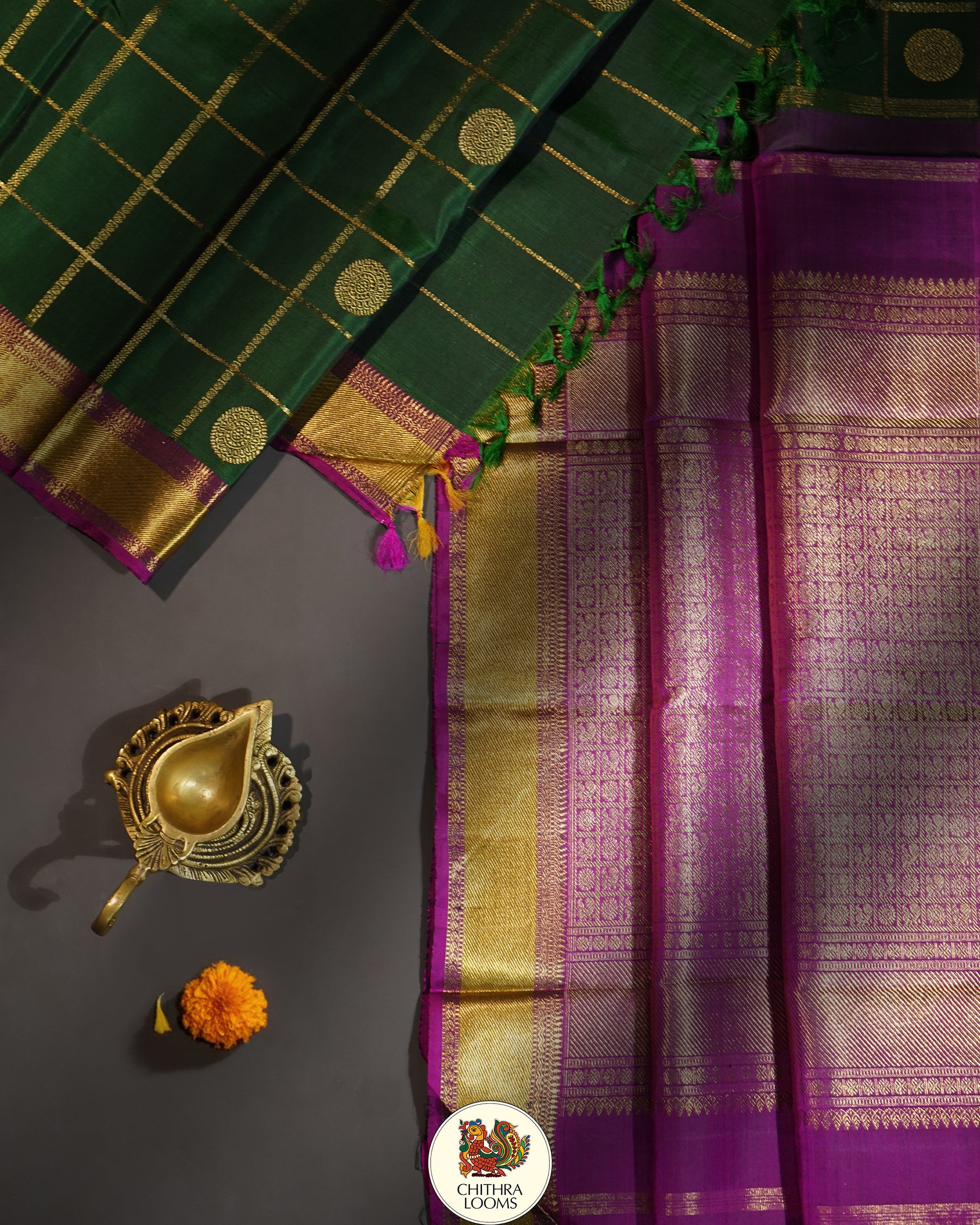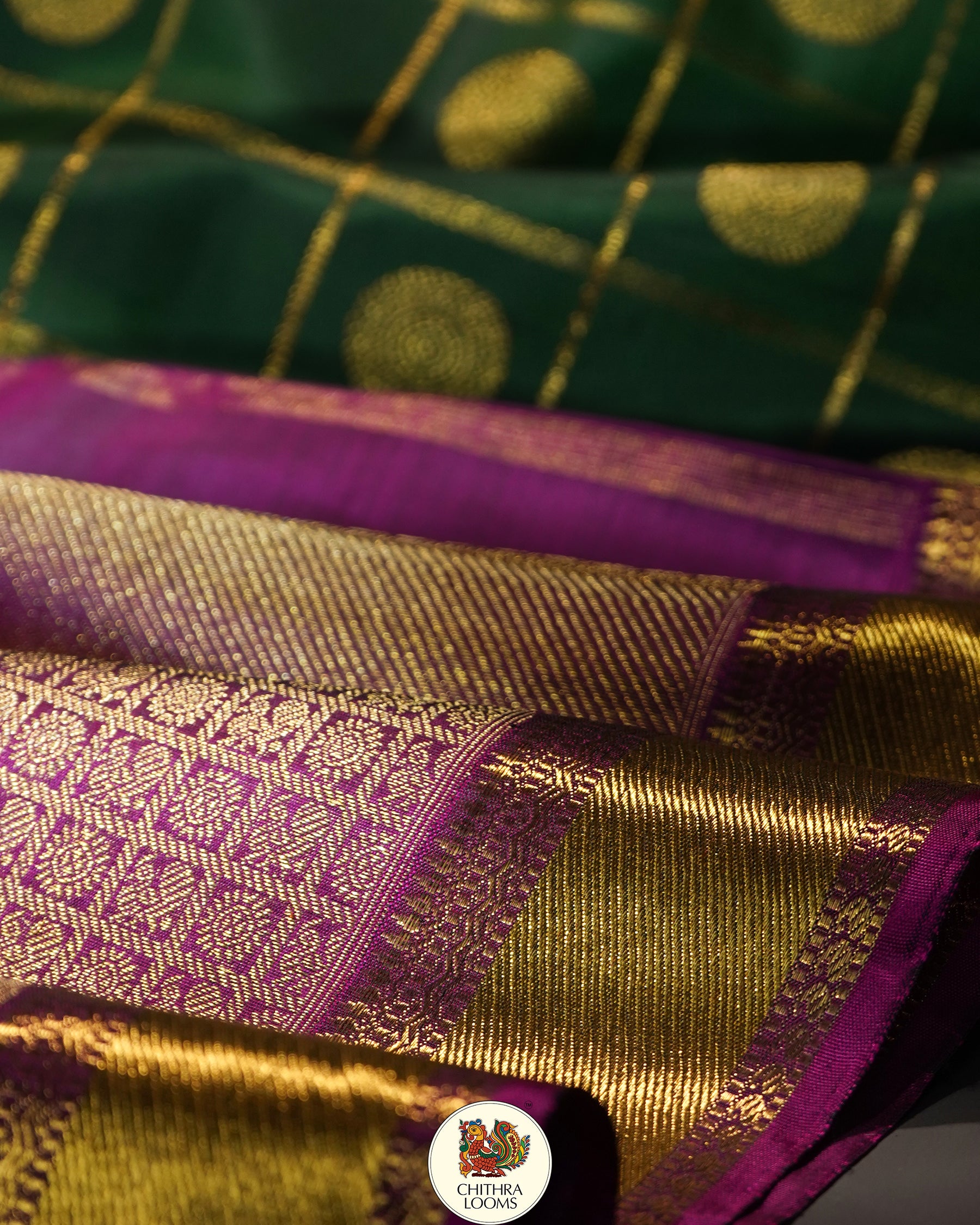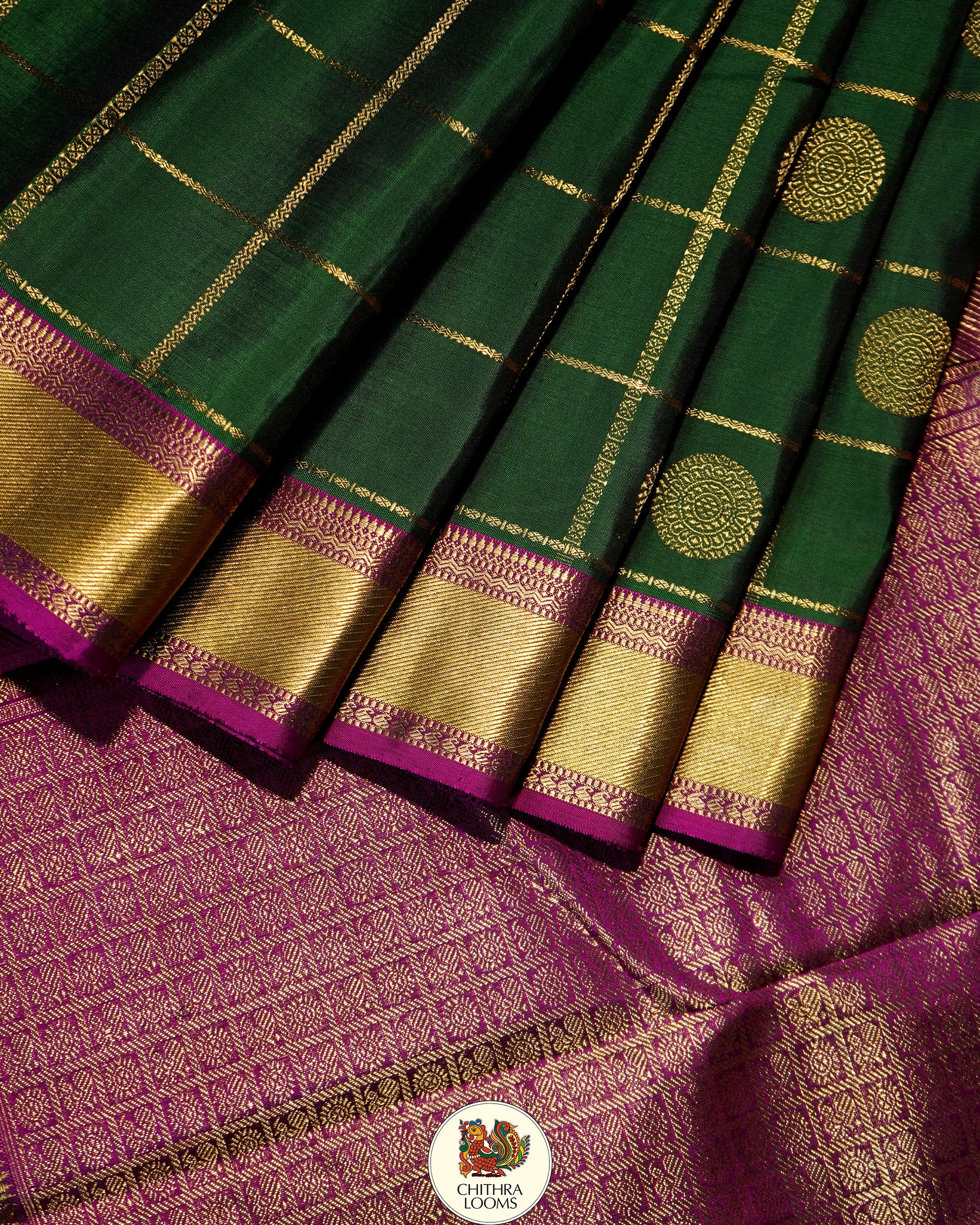 The saree is an exquisite veldhari Kattam with Chakram Butta the saree body is dark green color with pink border Beñaras pet and dense rich pure Zari Palla.