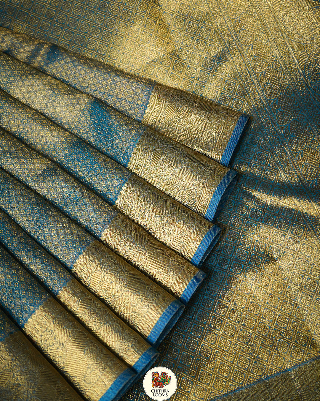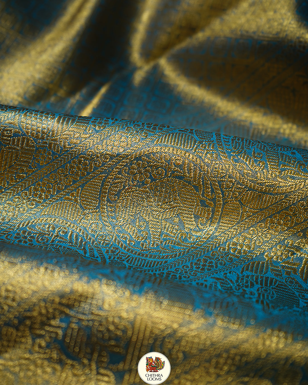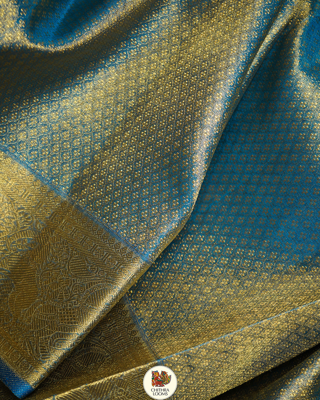 This tissue kanjipuram is a classic kanjipuram silk , the warp is blue and the weft is pure gold Zari tissue , the whole body is brocade , the border is yazhli pet and the Palla is dense pure Zari Palla and blouse