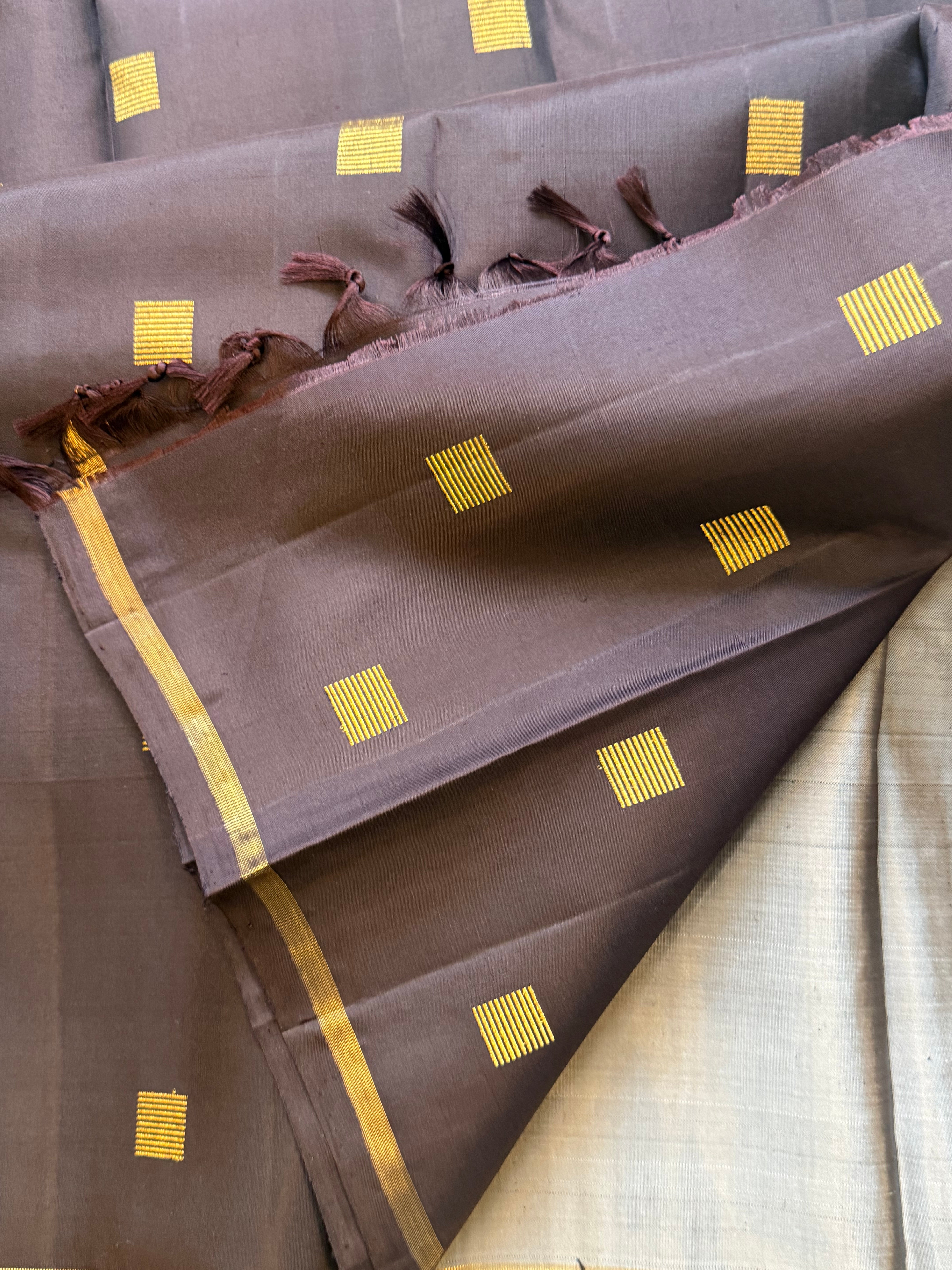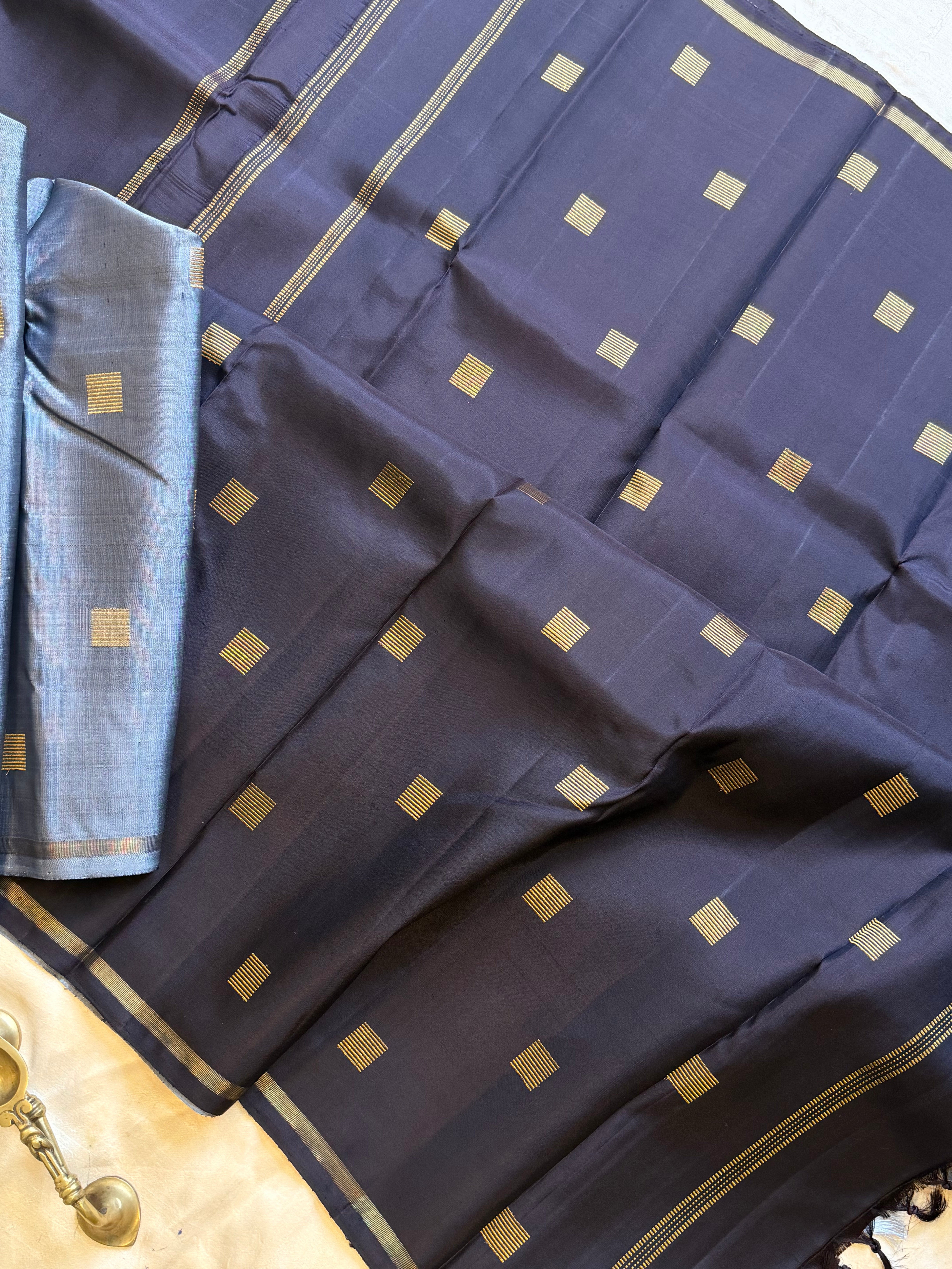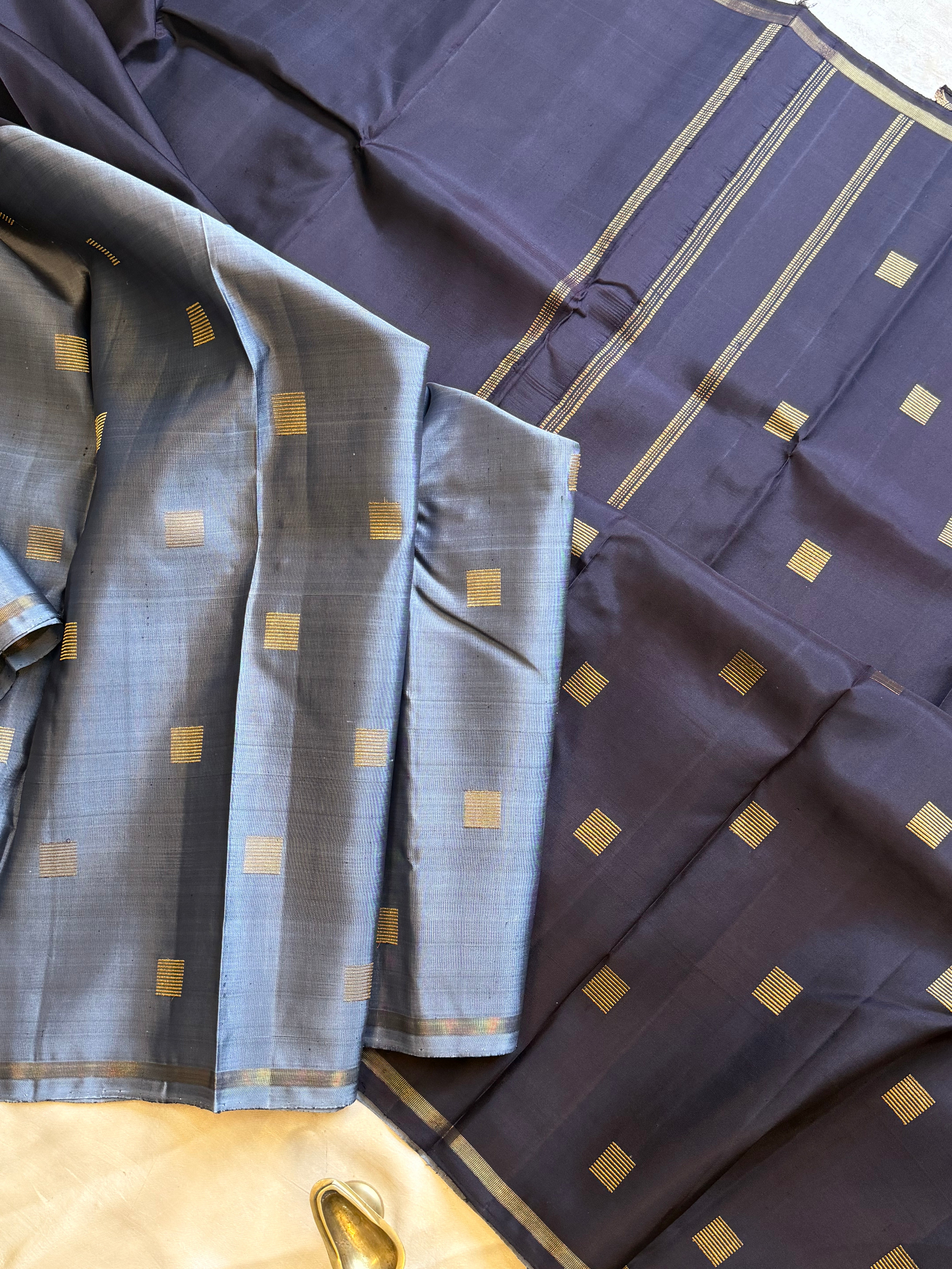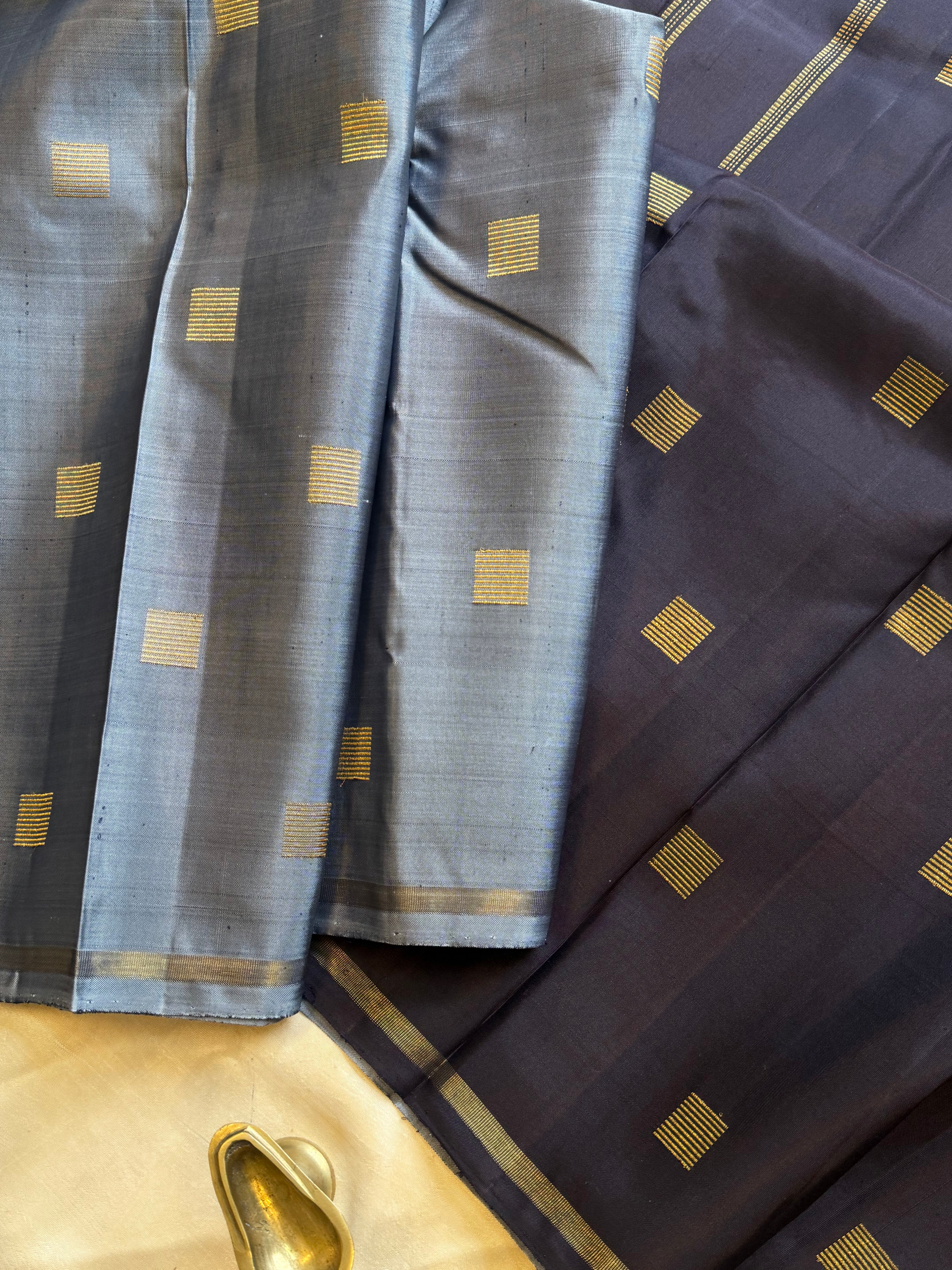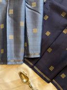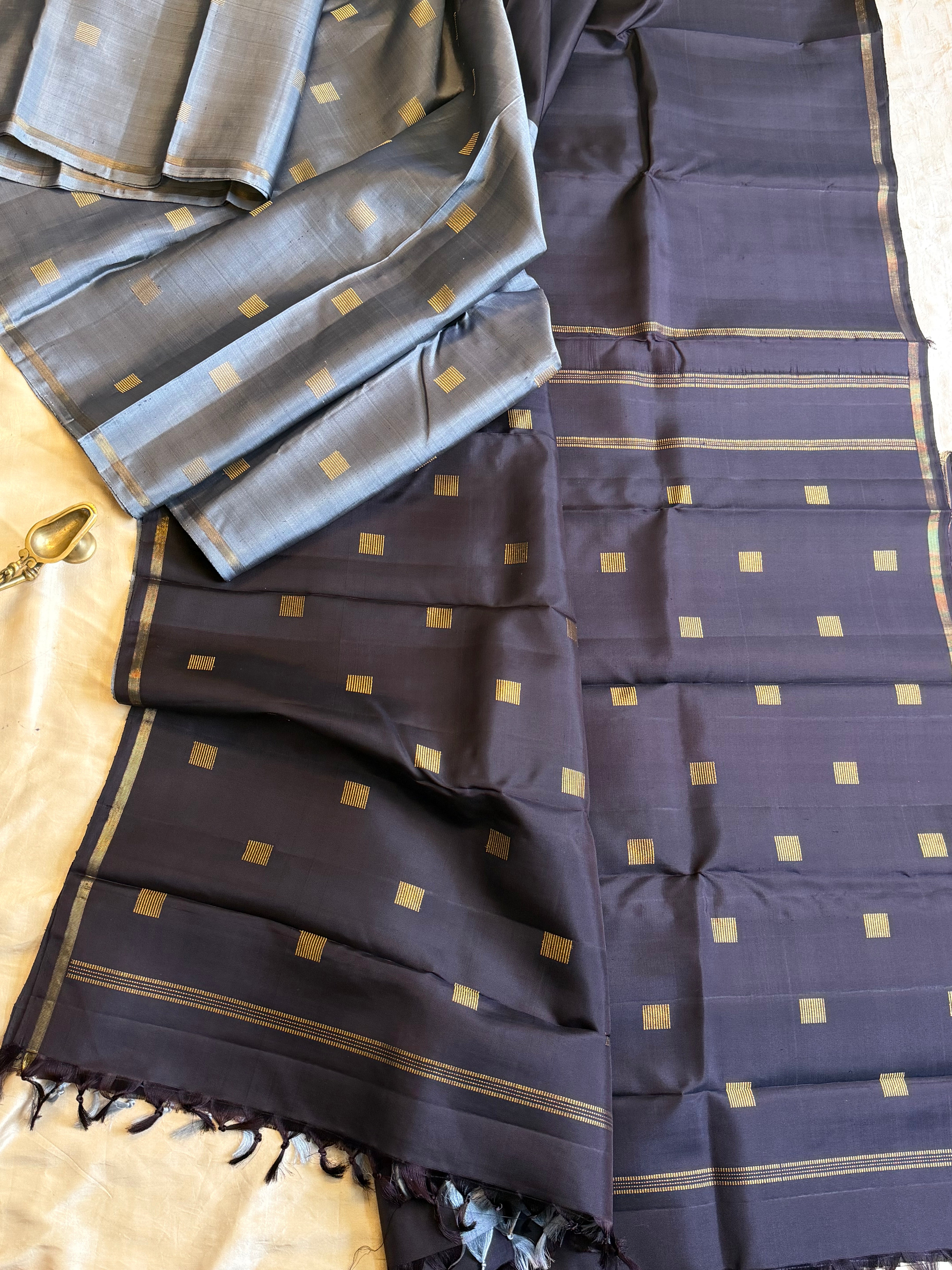 The saree is araibagam with grey and black with handwoven old style box Butta and Rekku palla and blouse