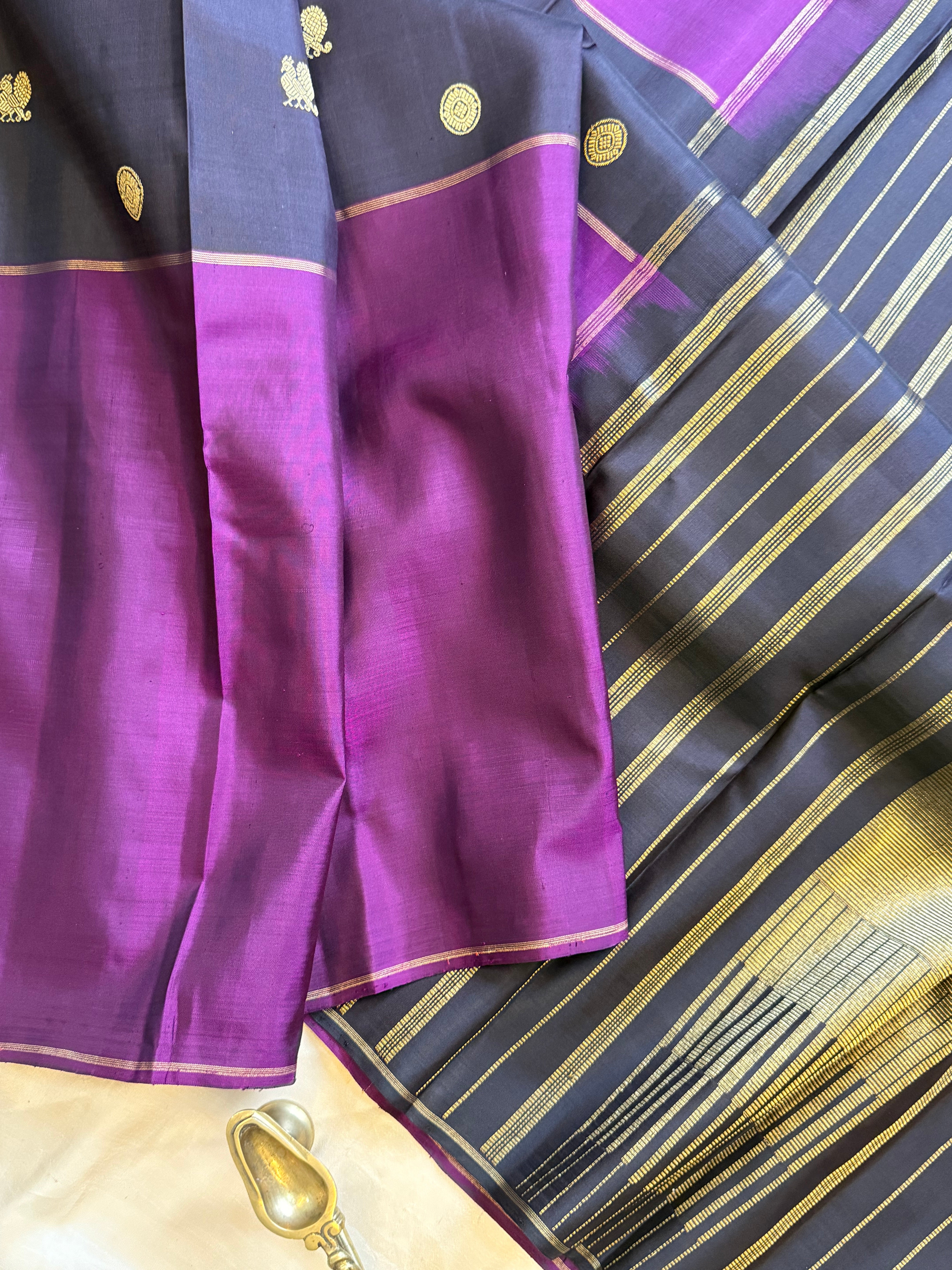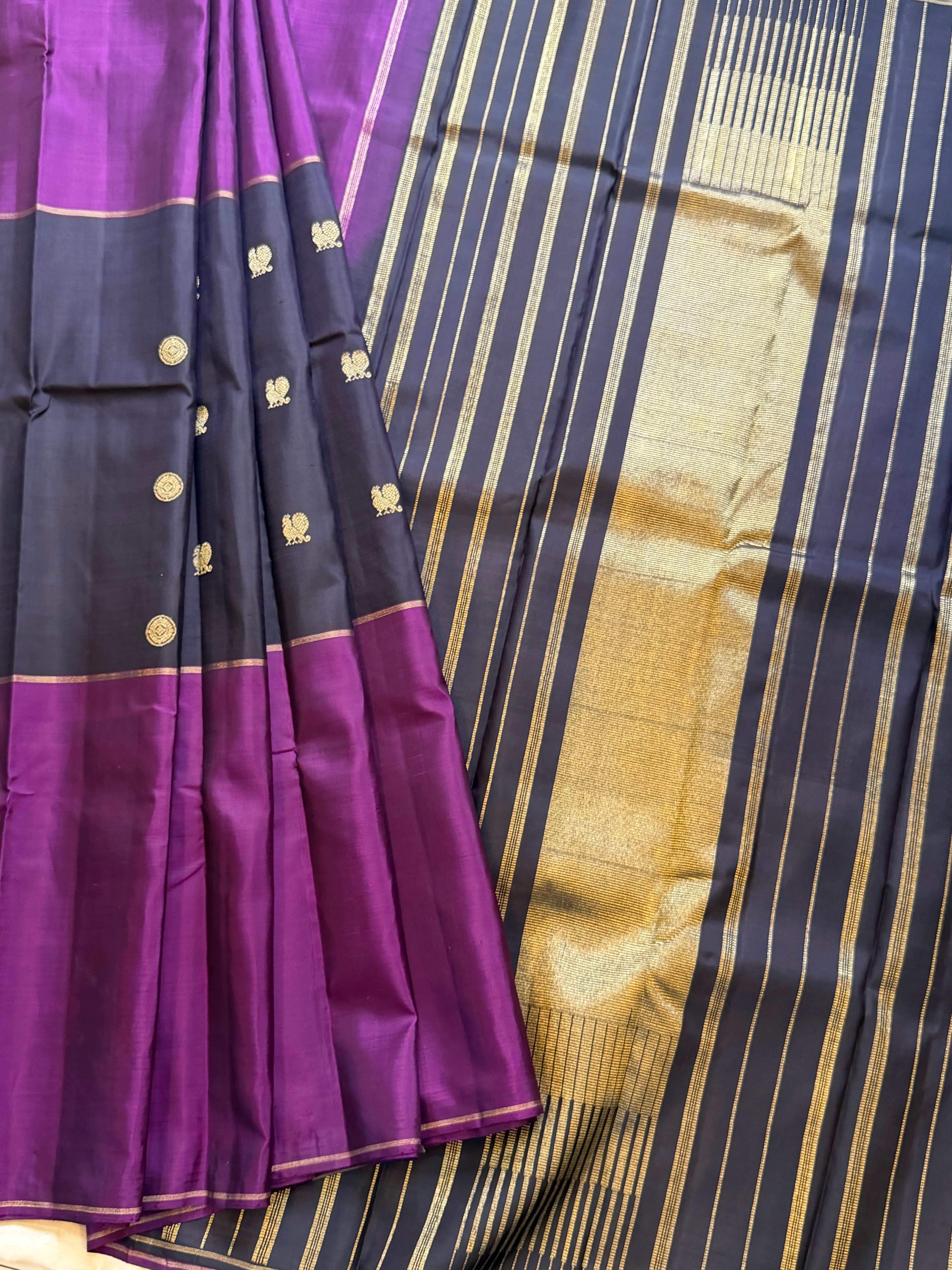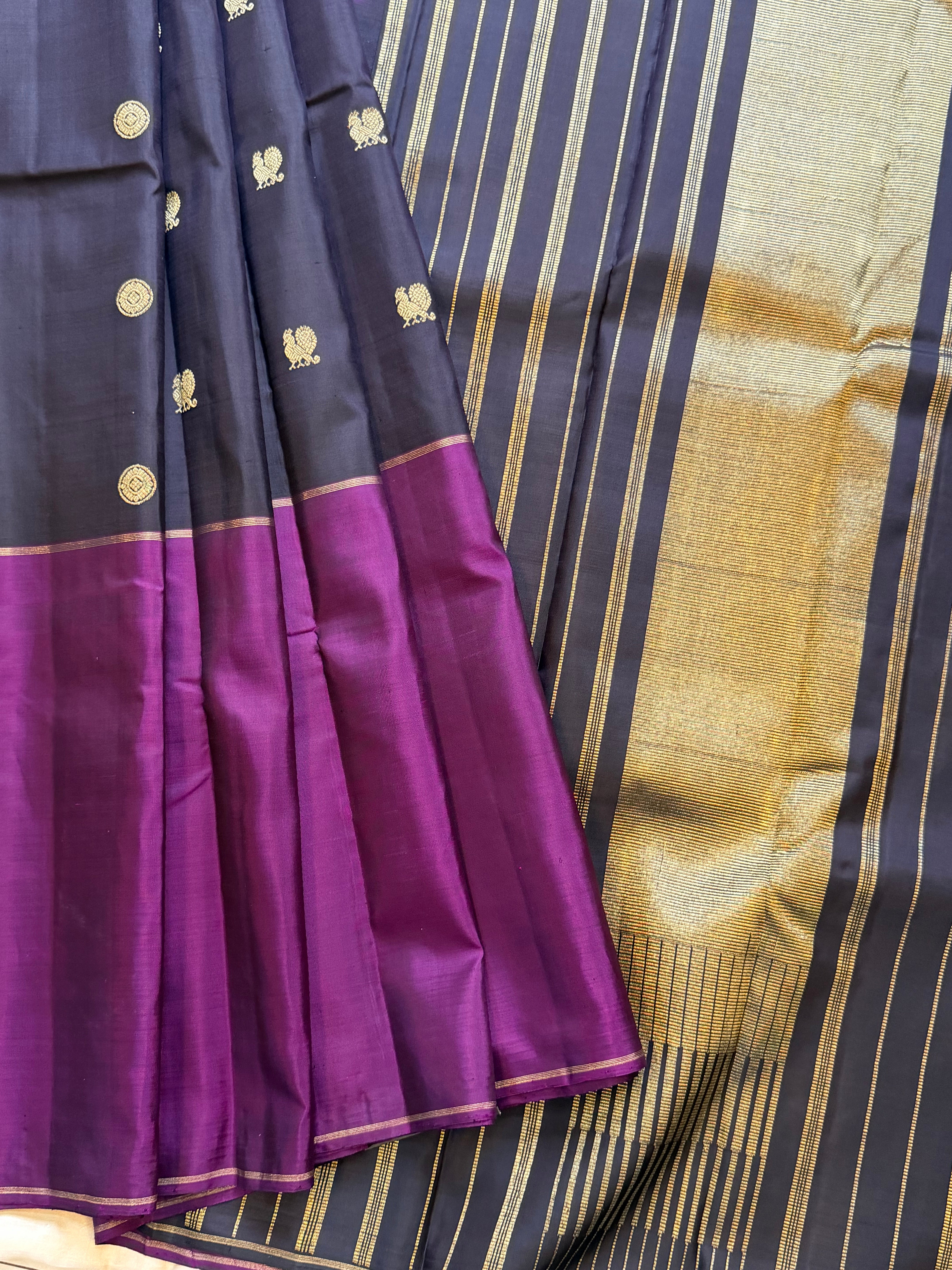 The saree is a long border kanjipuram , the body is Kanchana color and the borders are purple long border retta pet Rudraksh and pure Zari rekku Palla and blouse