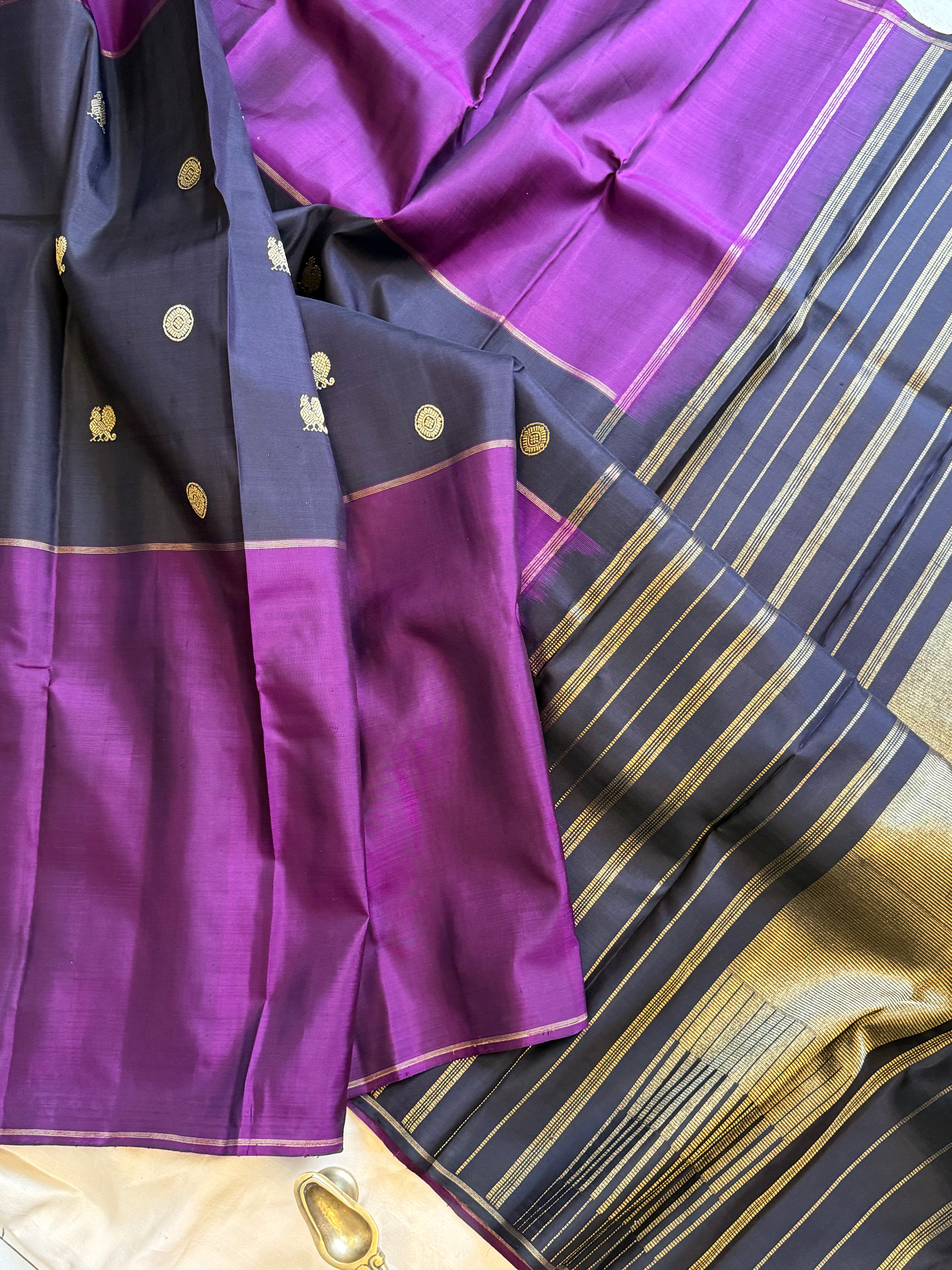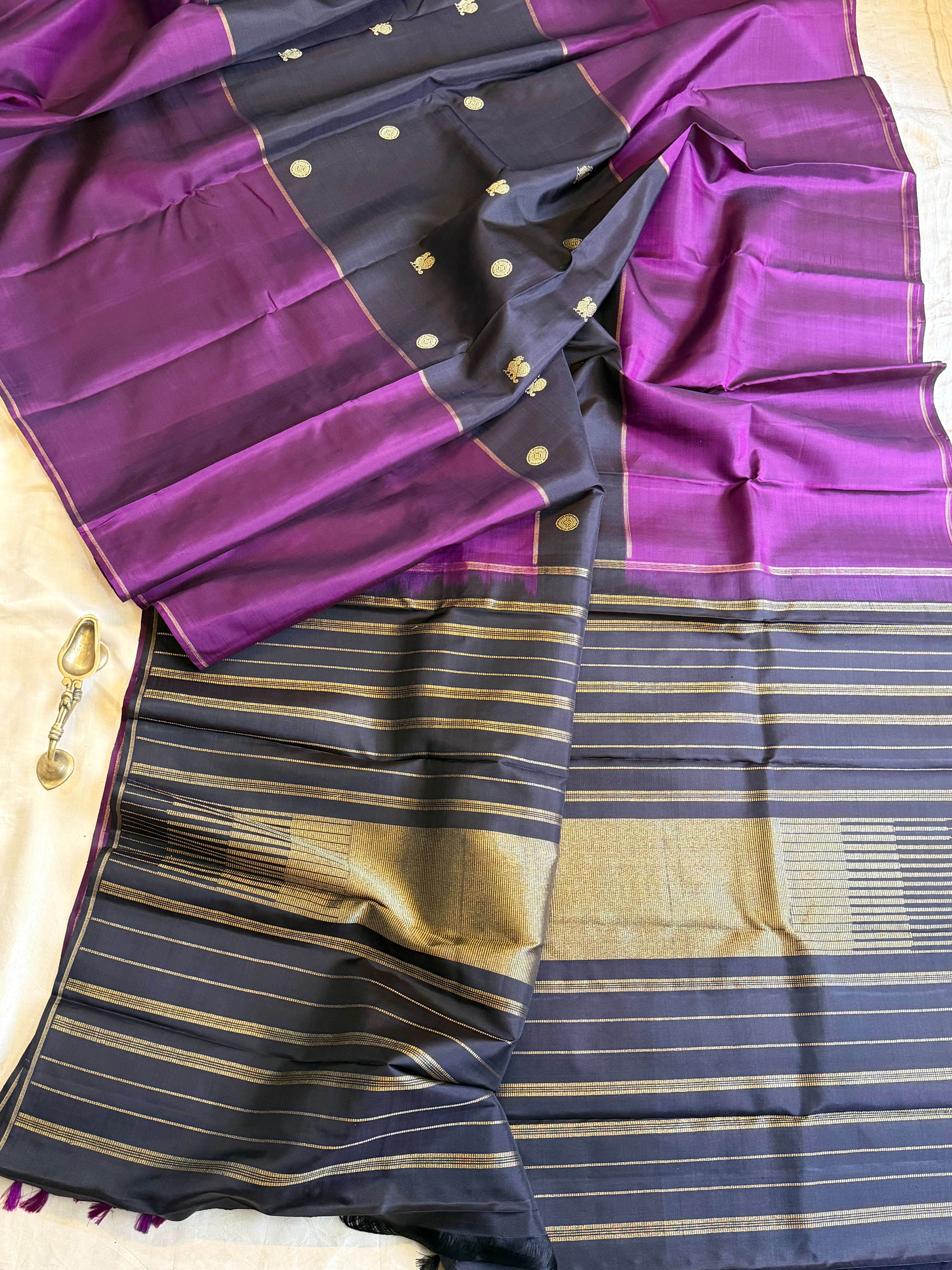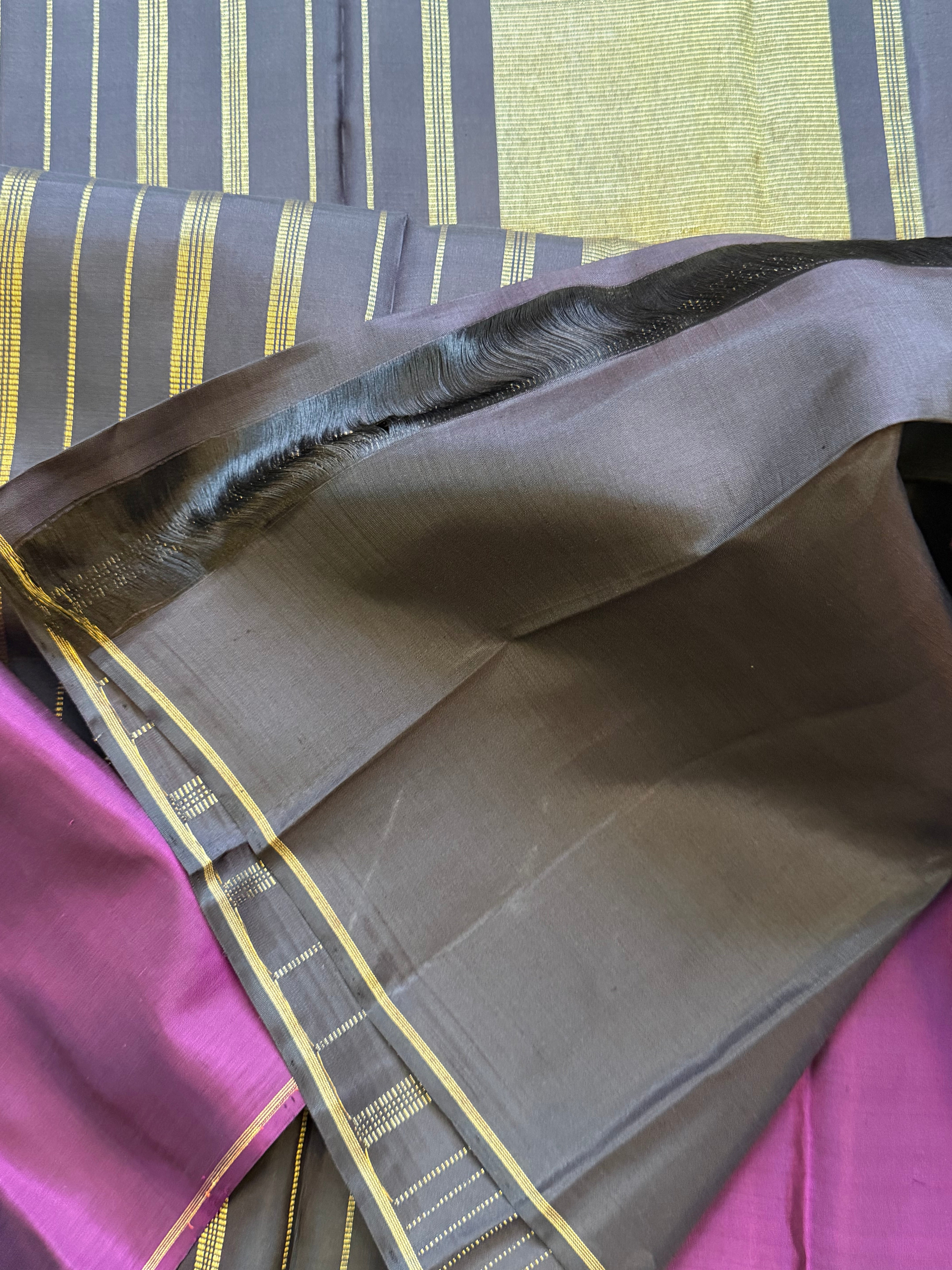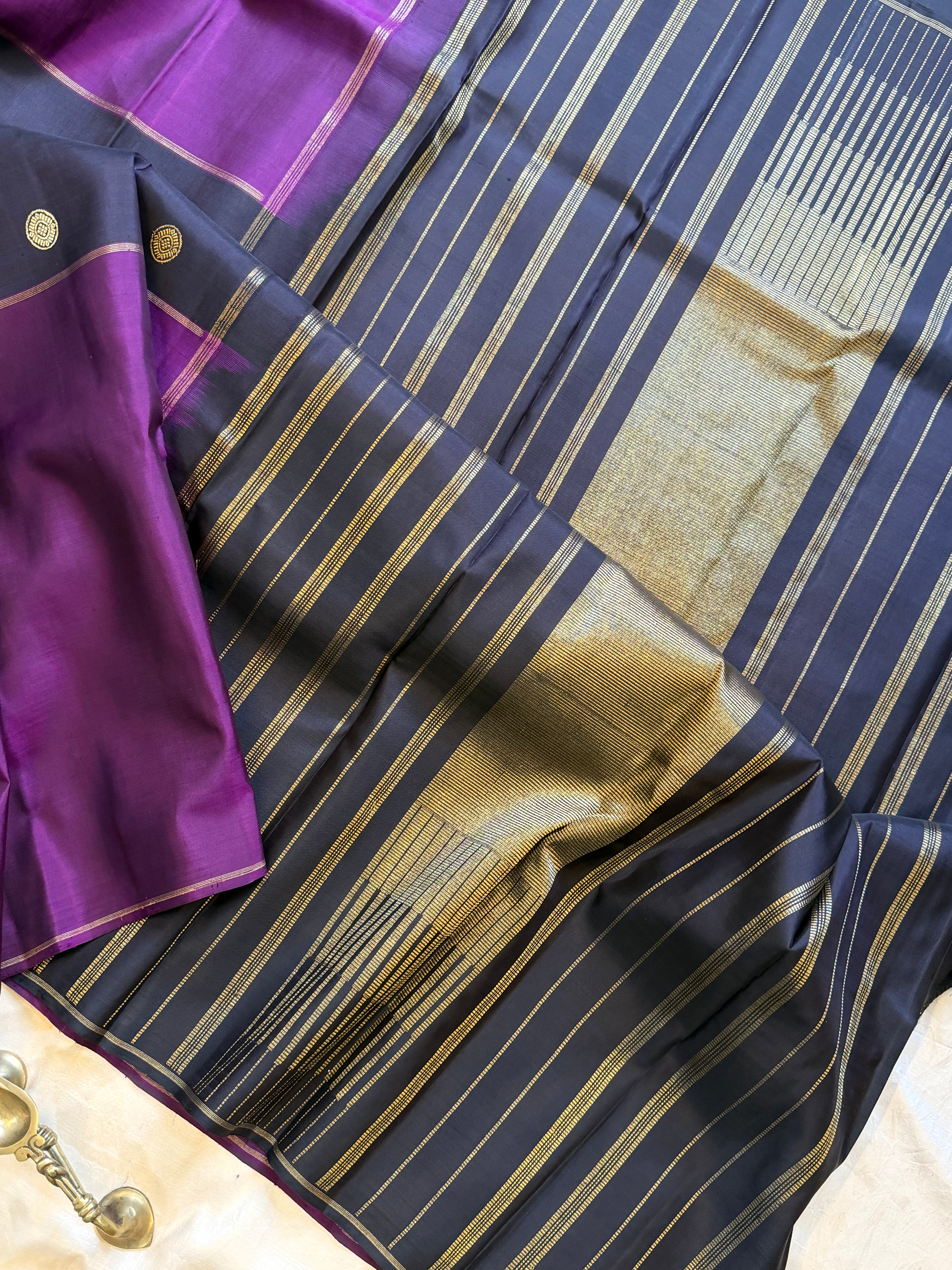 The saree is a long border kanjipuram , the body is Kanchana color and the borders are purple long border retta pet Rudraksh and pure Zari rekku Palla and blouse