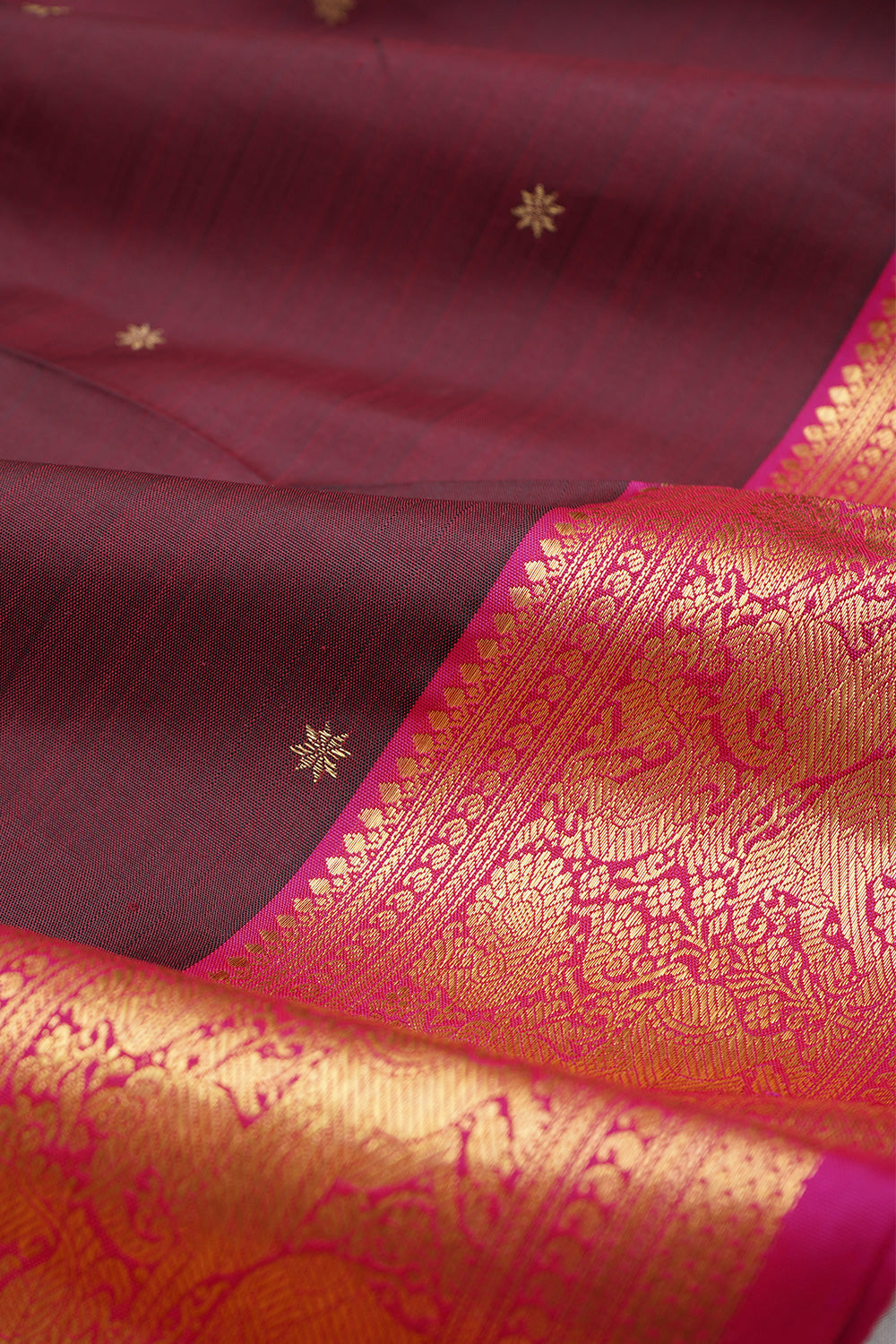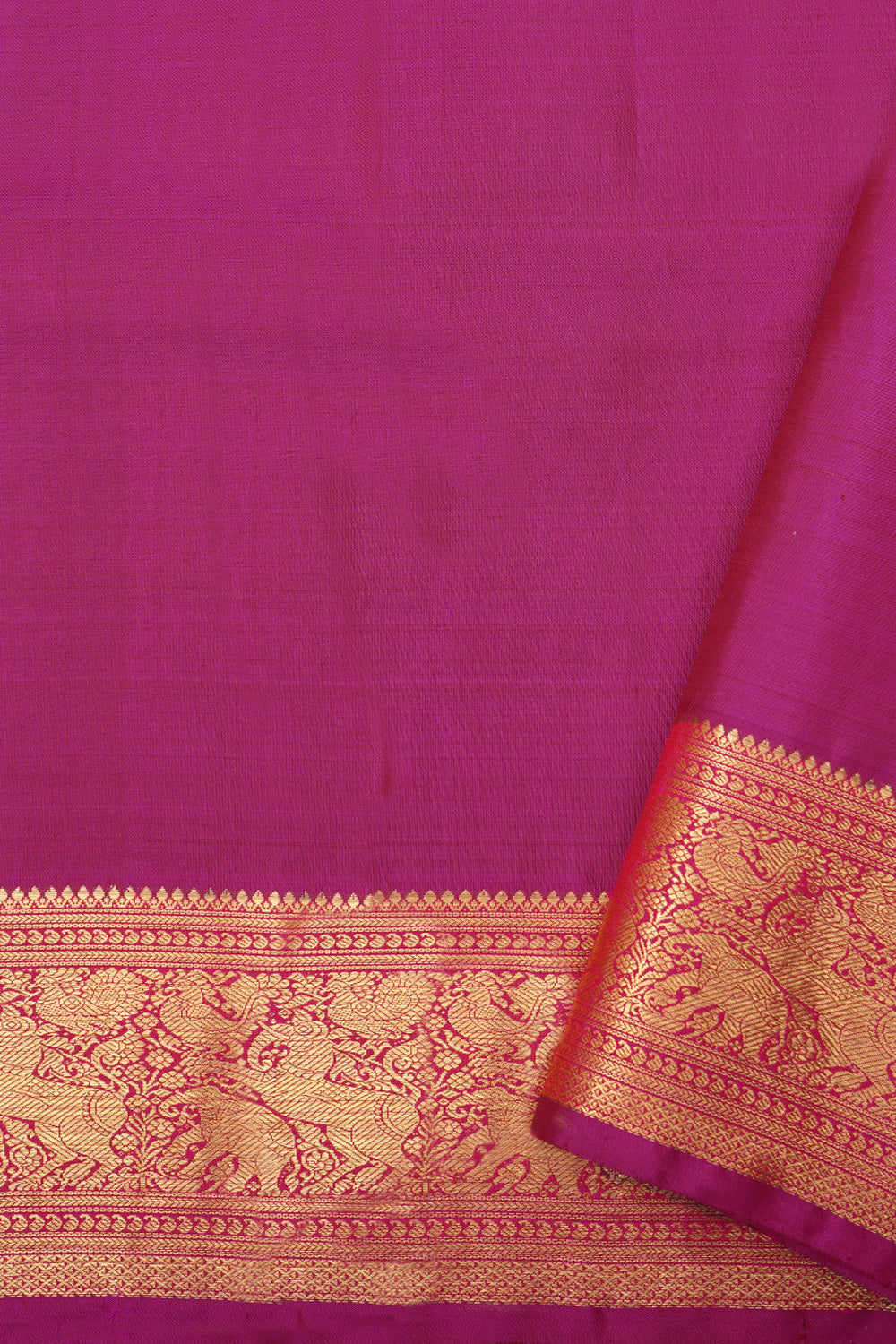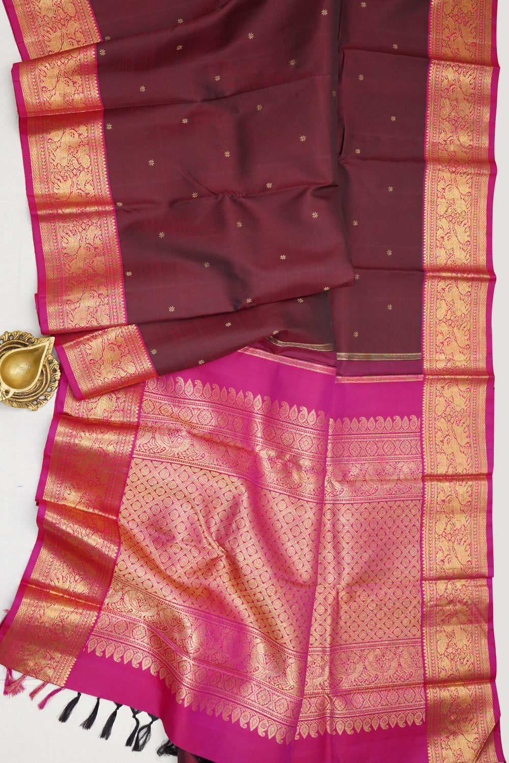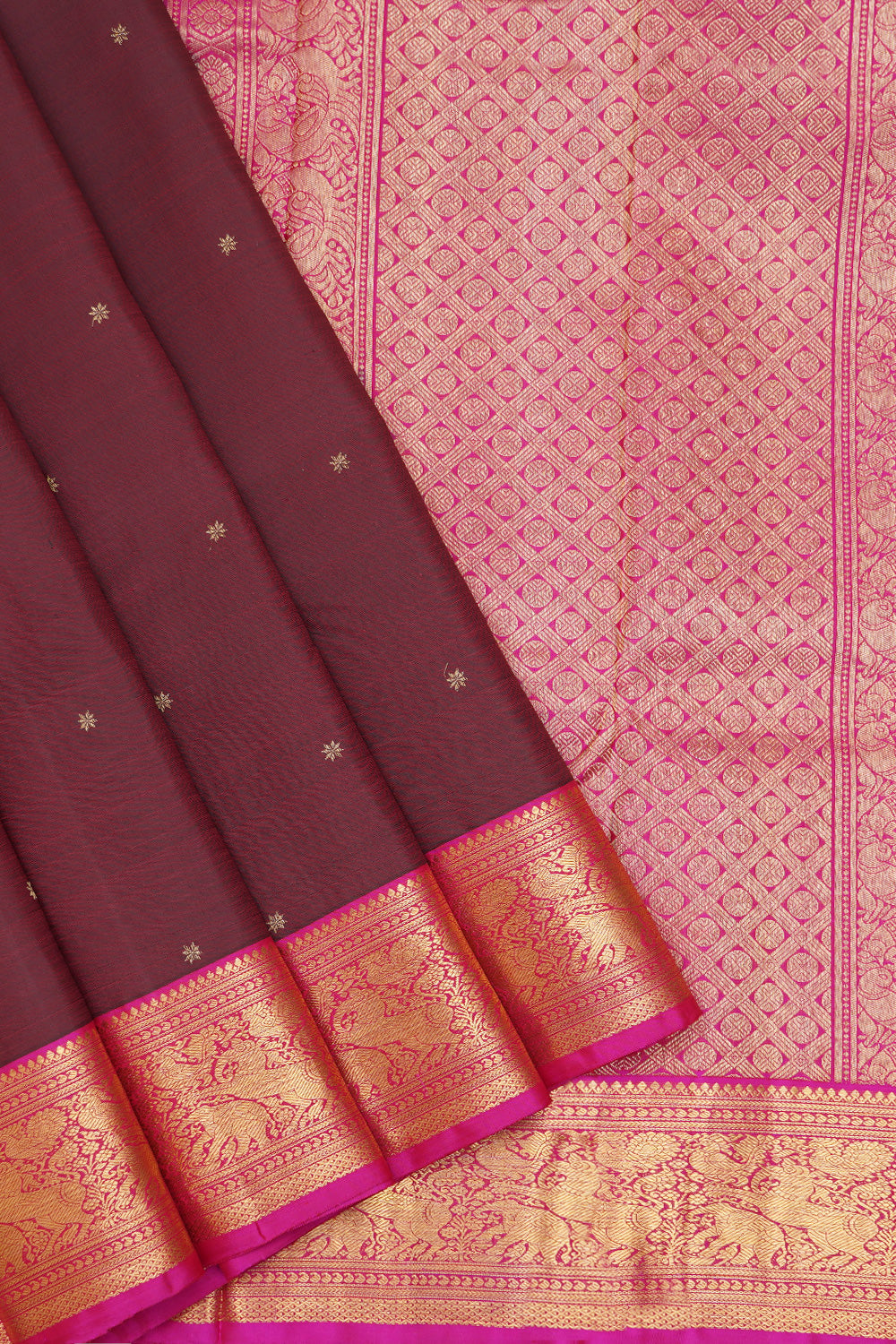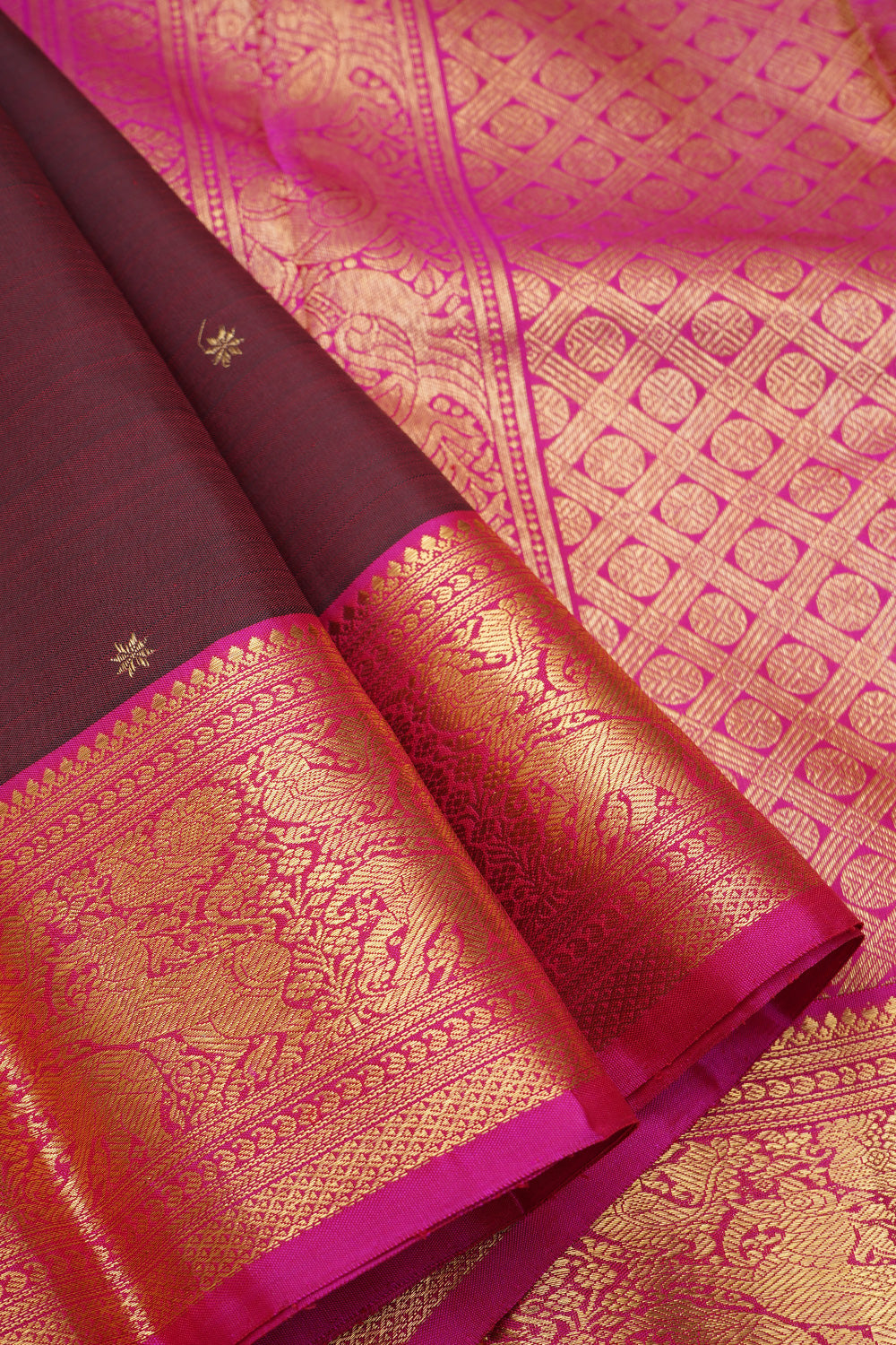 The body is dark Paaku color with pink border with yazhli, annam and yaanai in border and rich dense pure Zari Palla and blouse.