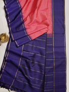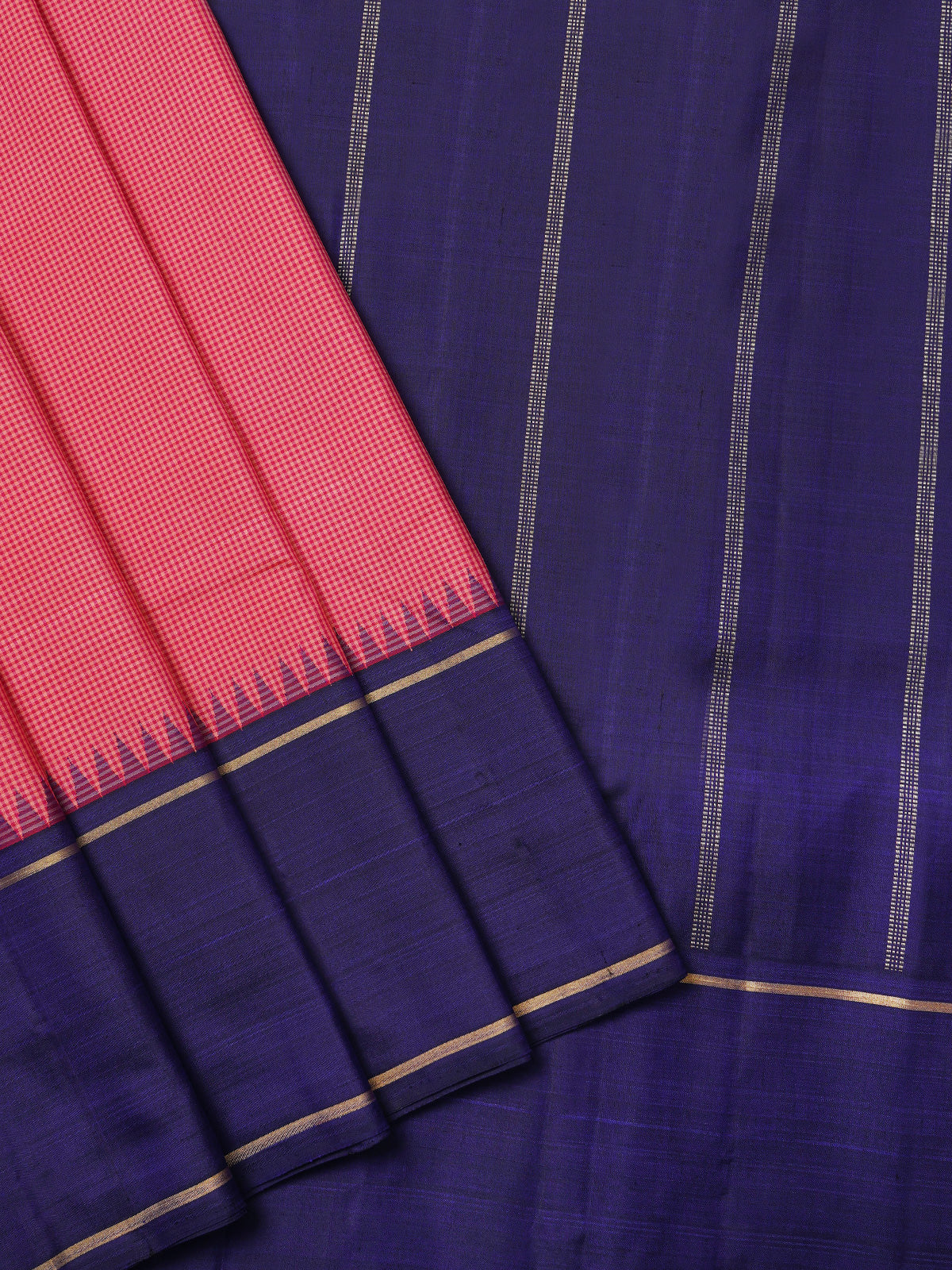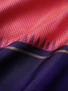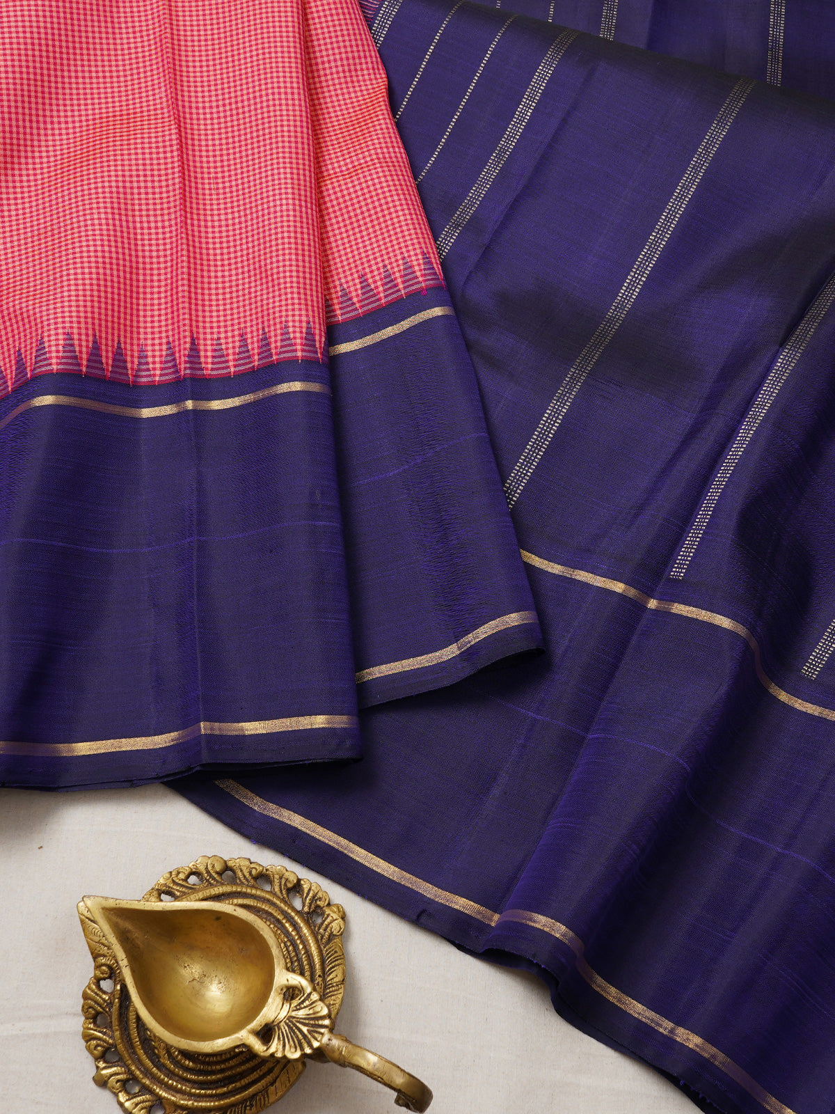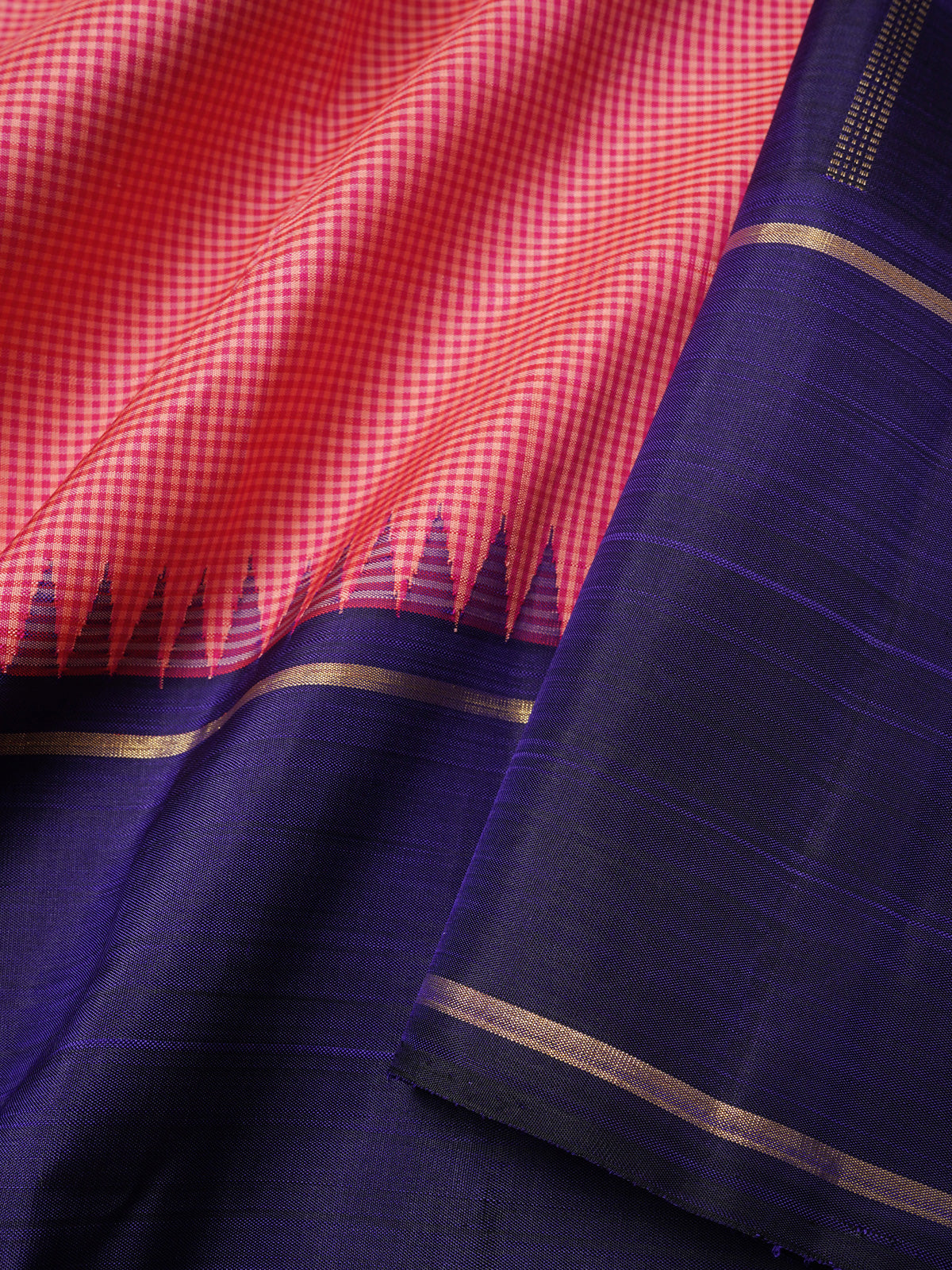 The body is light pink and red tiny checks called podi Kattam with blue Kai Korvai border Palla rekku Palla.