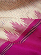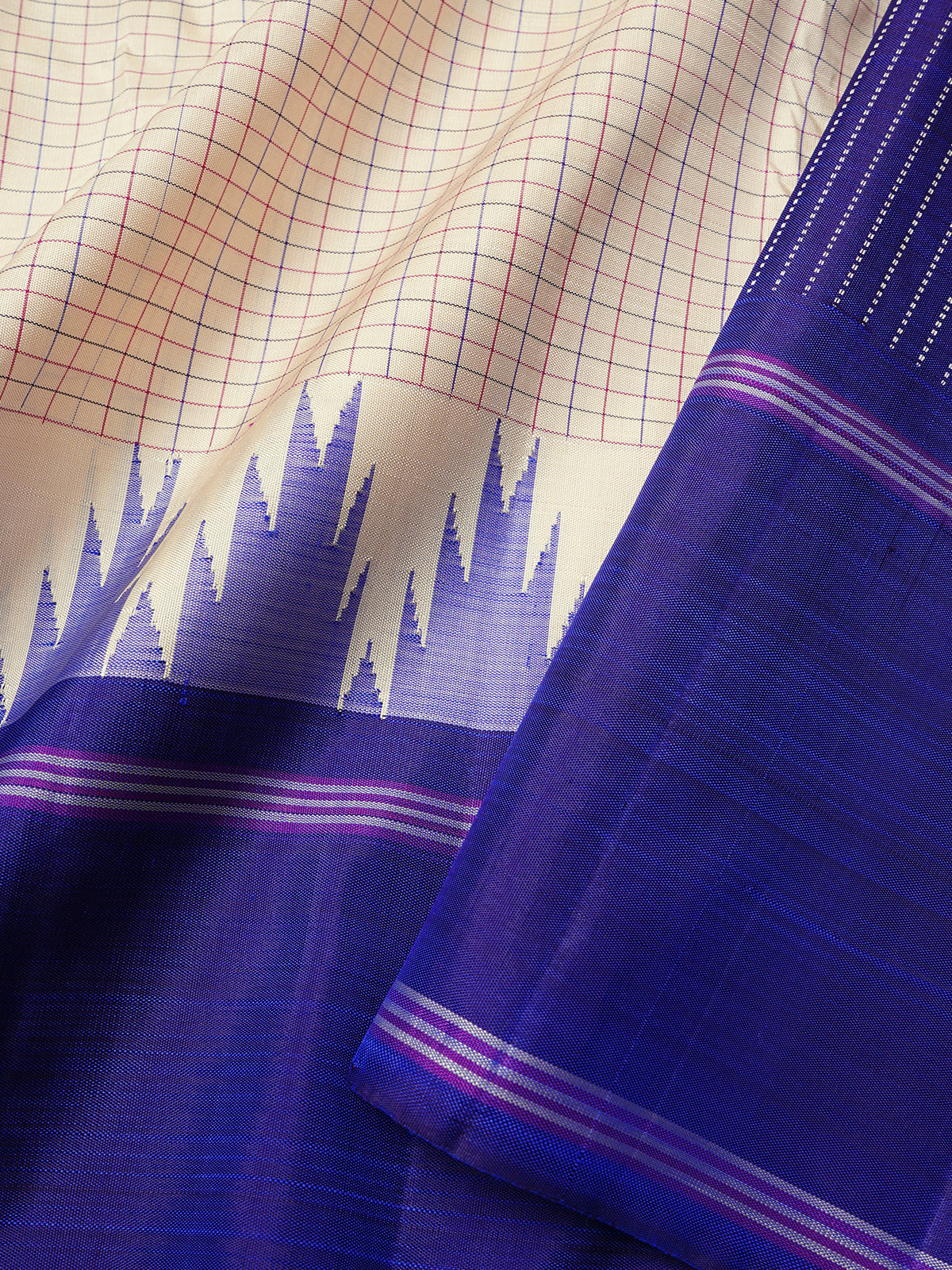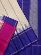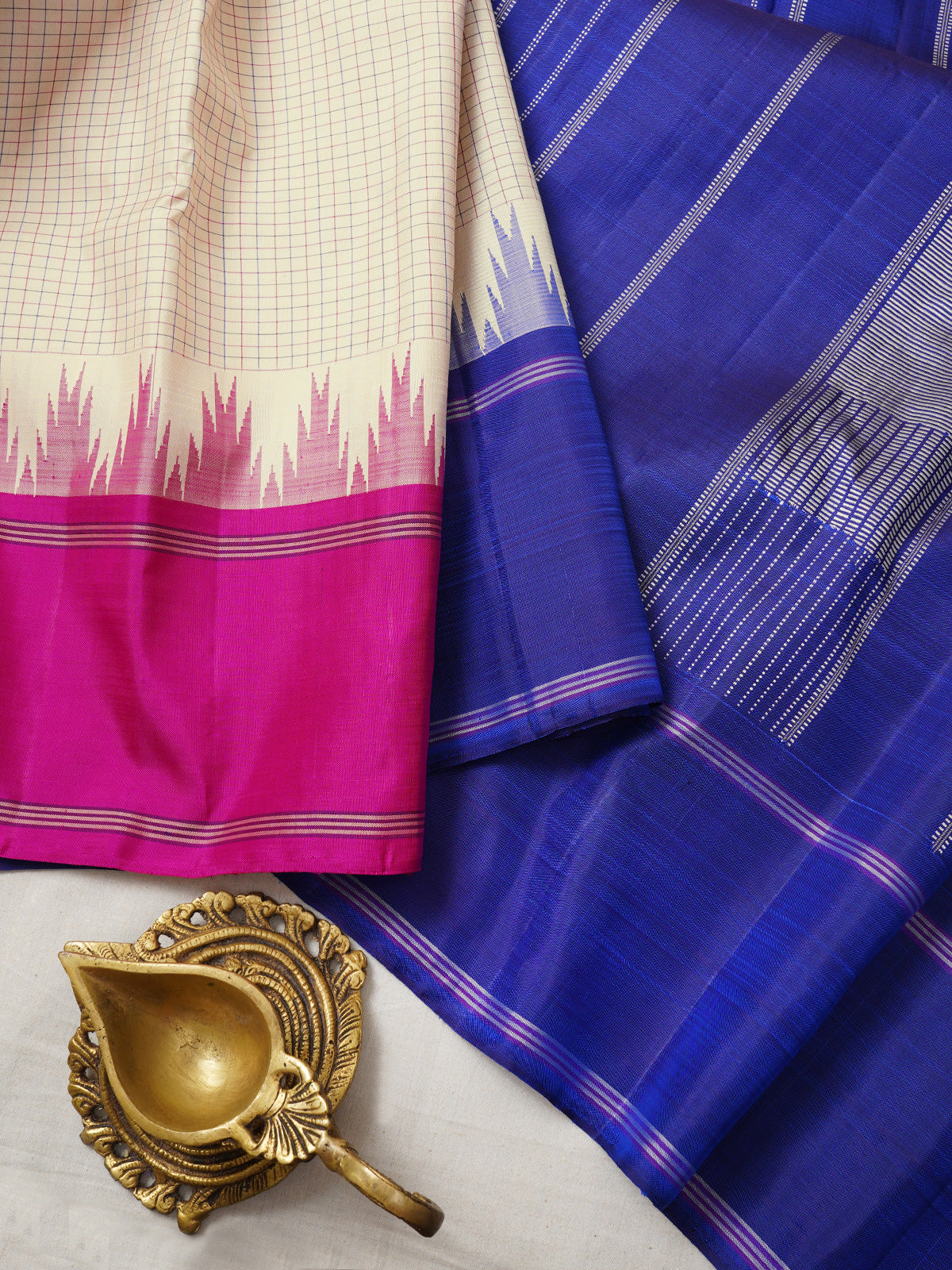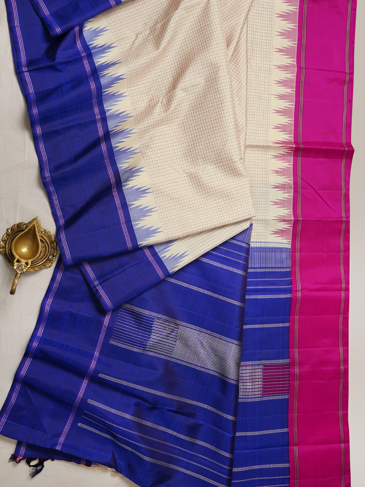 The saree border is Ganga Jamuna with pink and blue and the body has thread Oosi Kattam in thread and rekku Palla and blouse