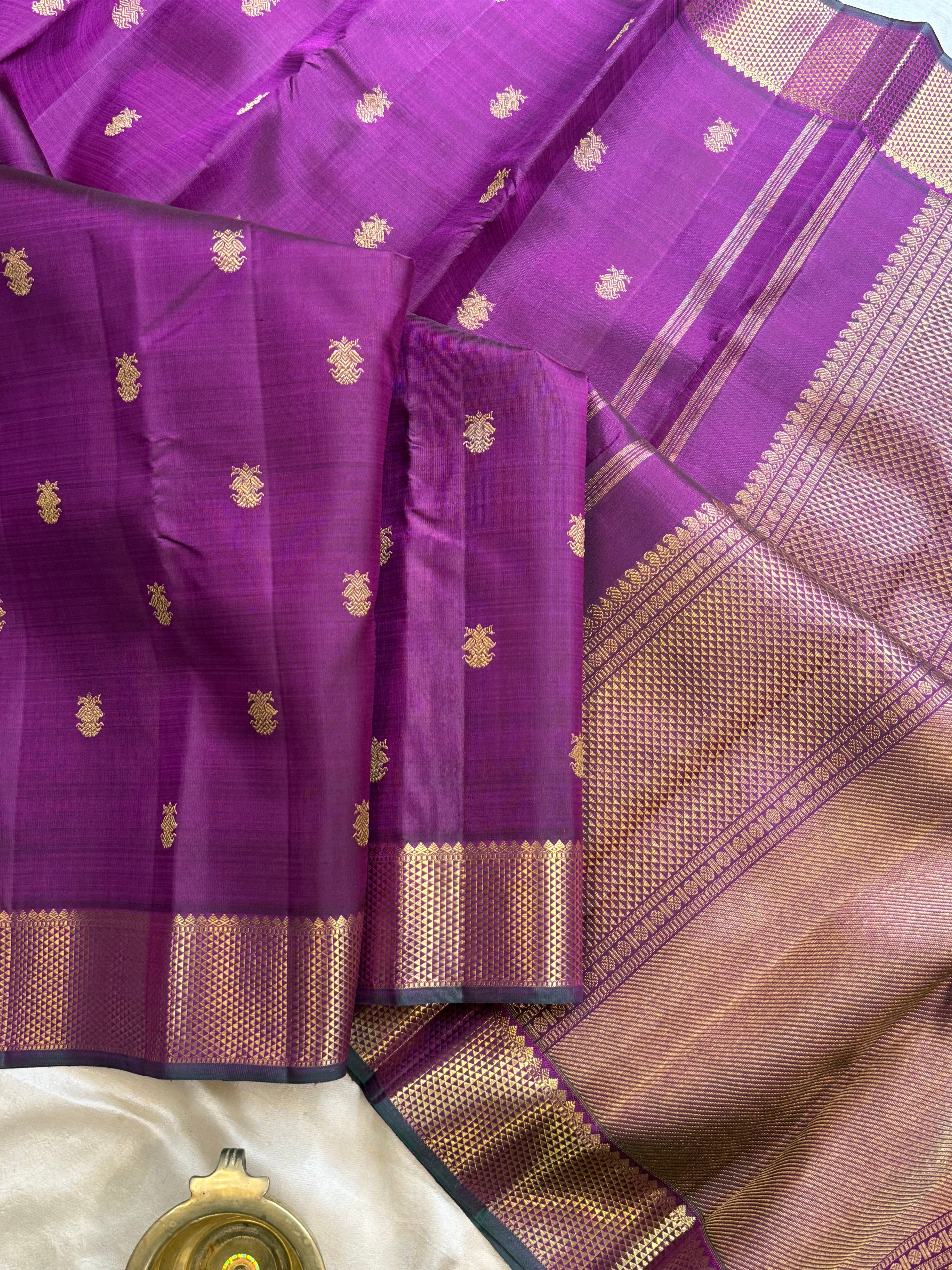 The body is aubergine color with irutalaipakshi Butta and the border is araimadam pet and dense pure Zari Palla and blouse