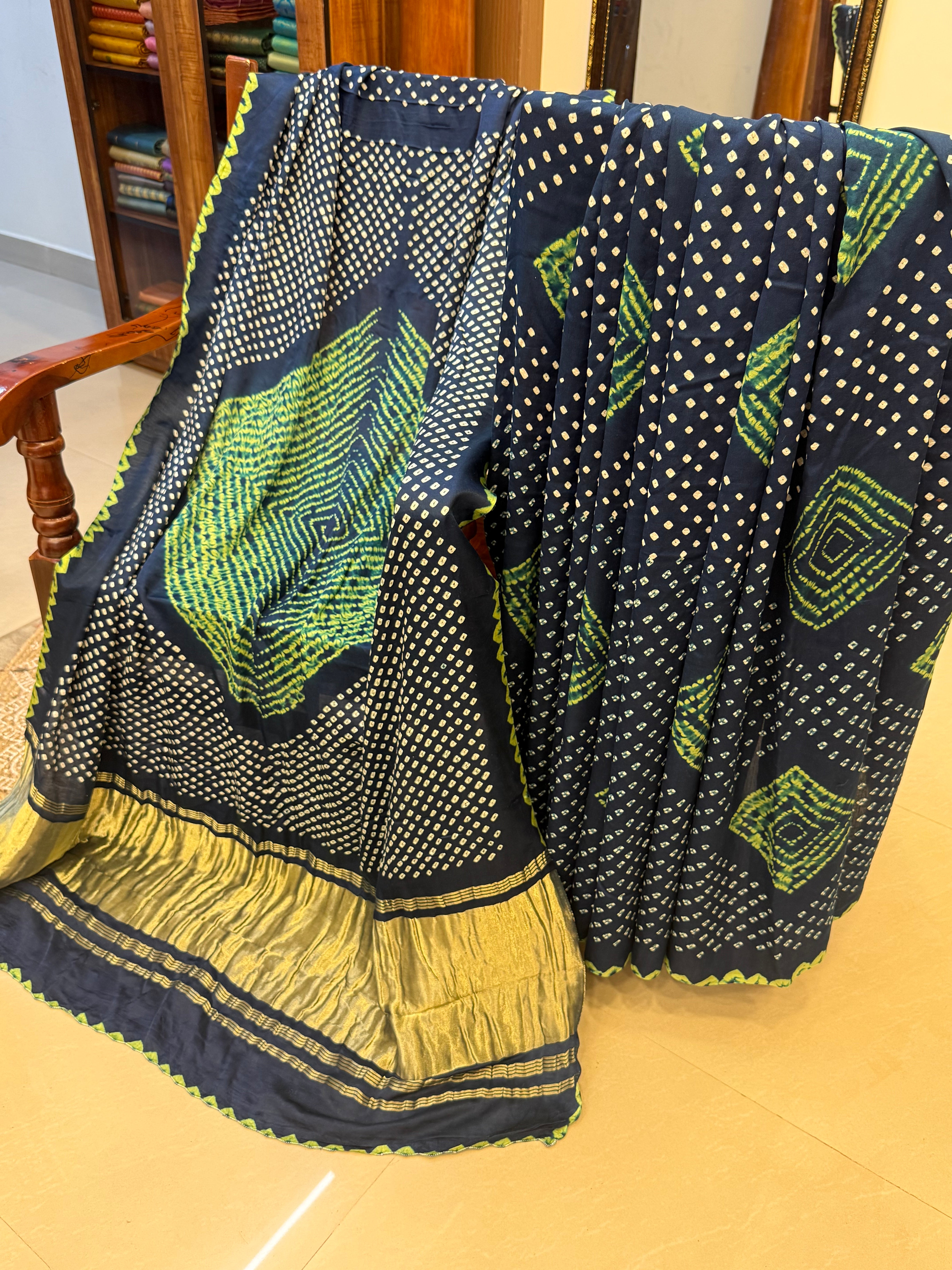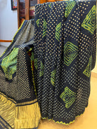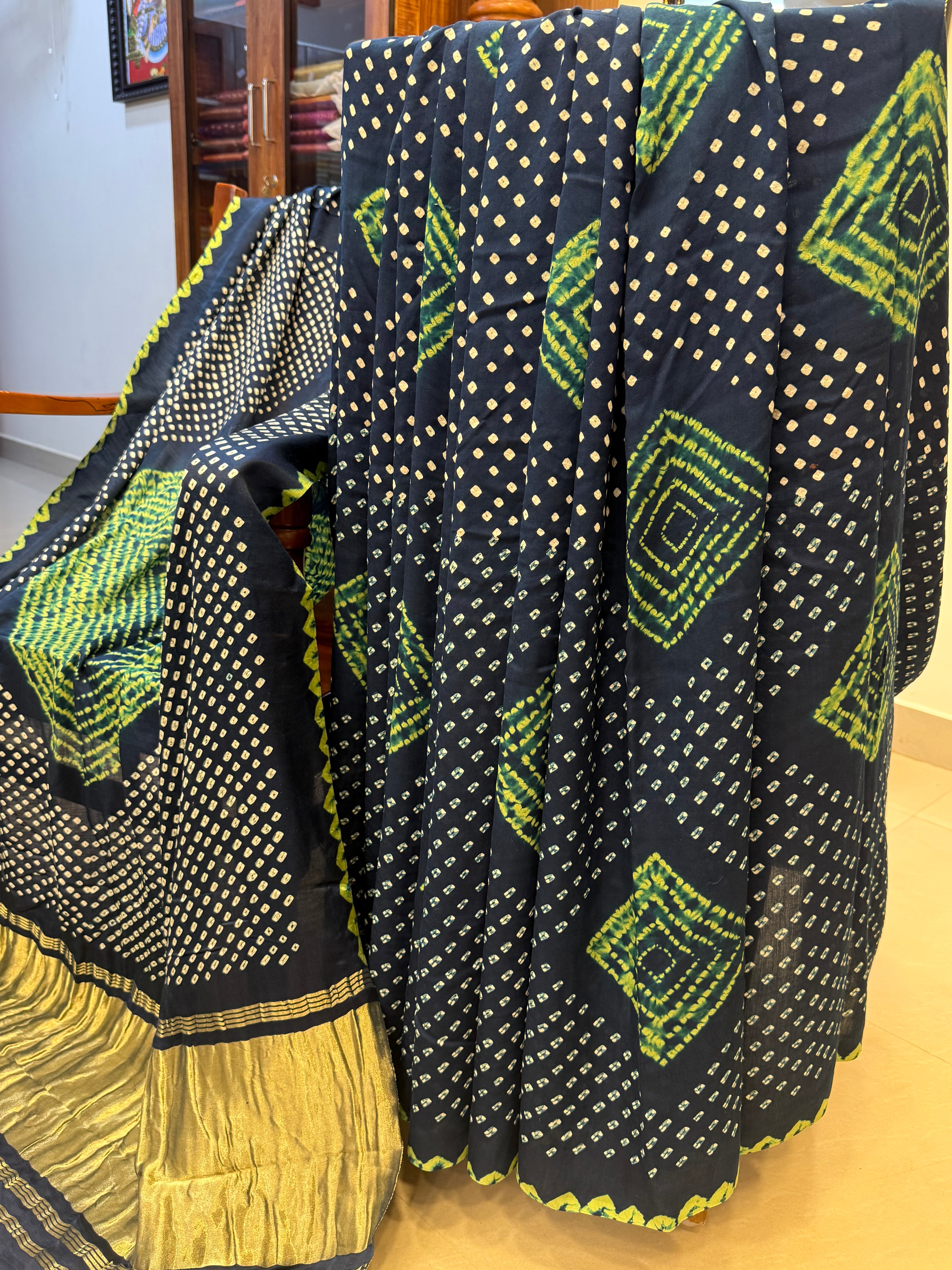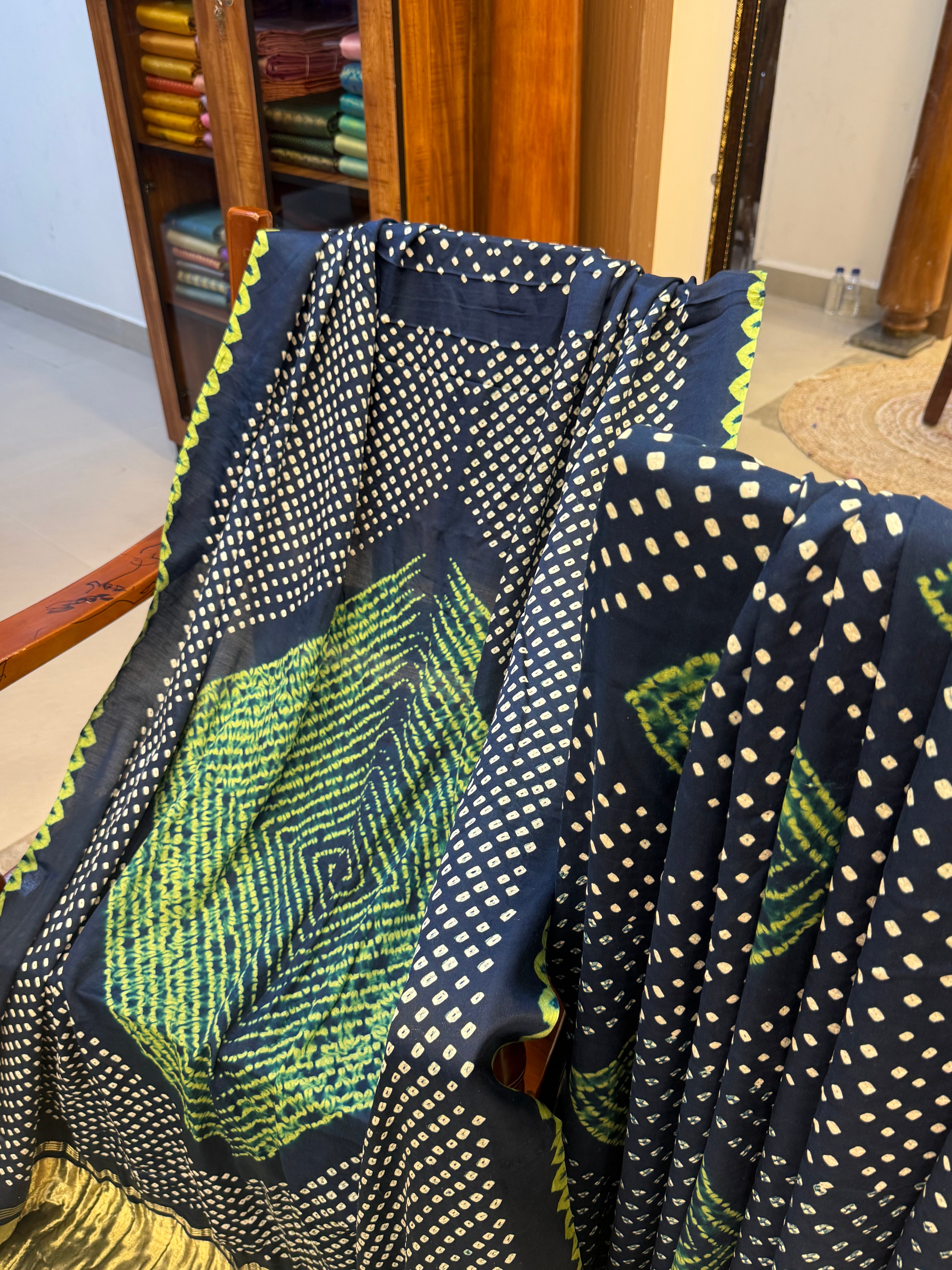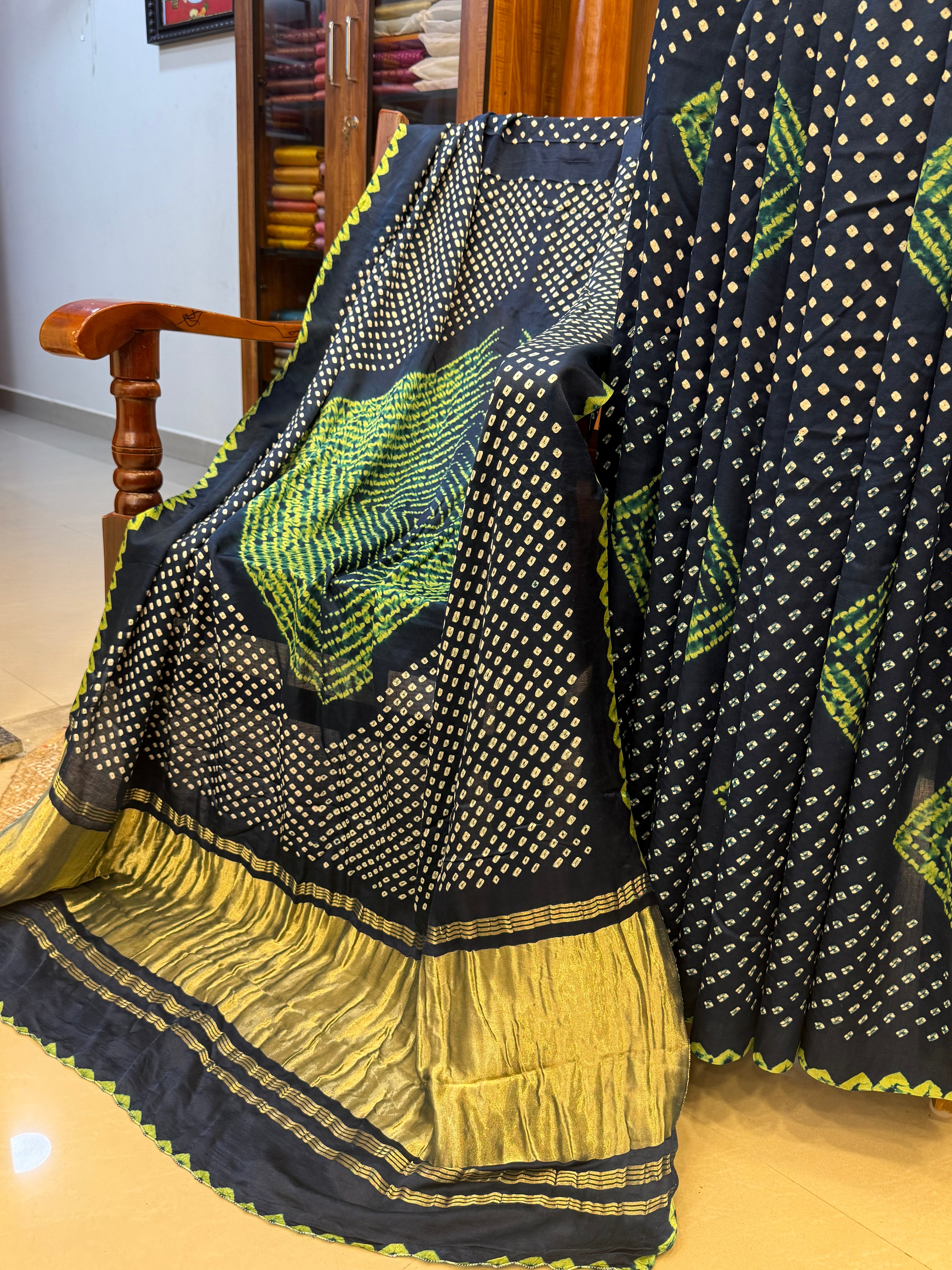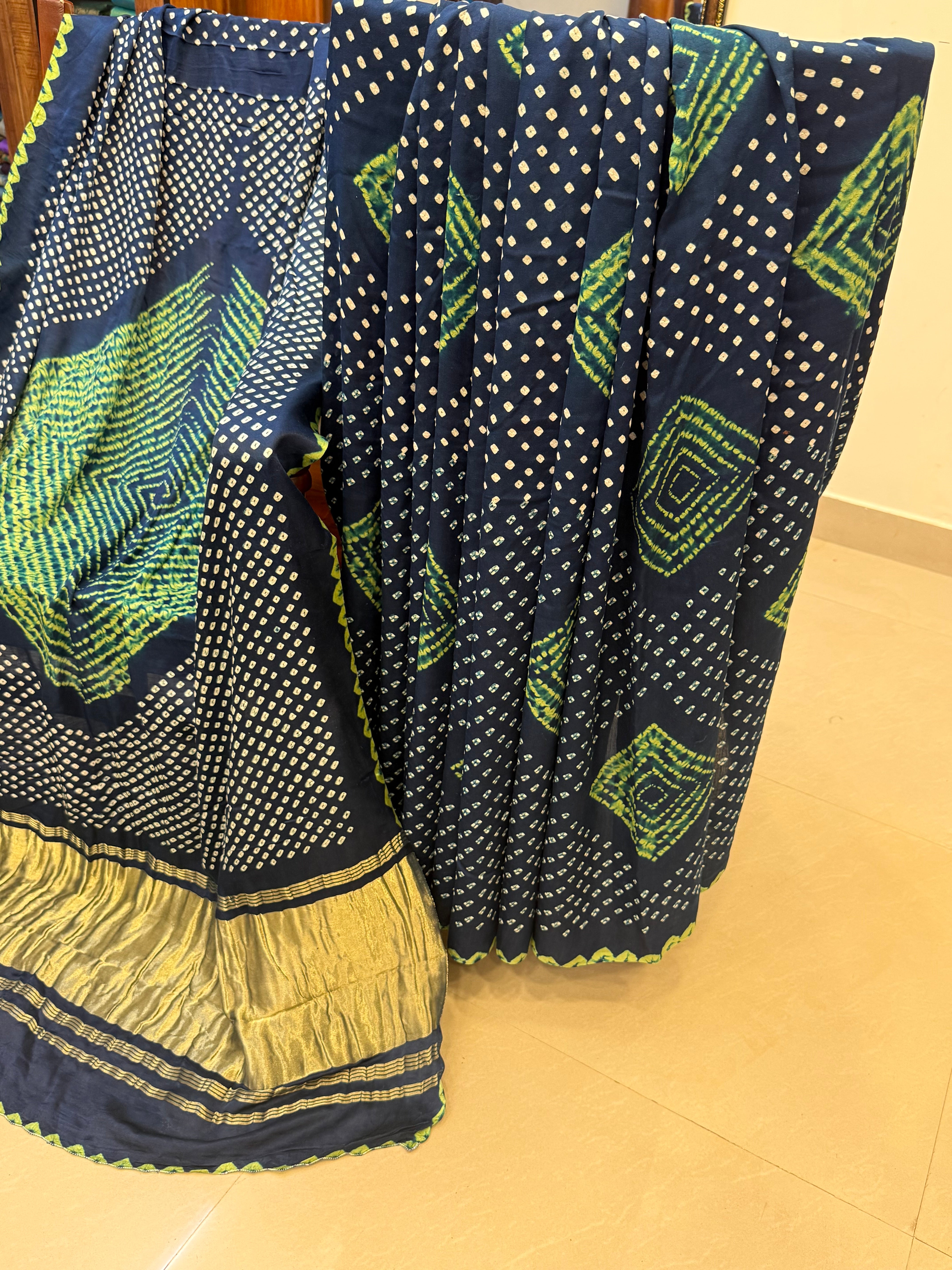 The saree is gajji silk roll pressed , attached blouse , the bandhini in the saree is hand knotted
