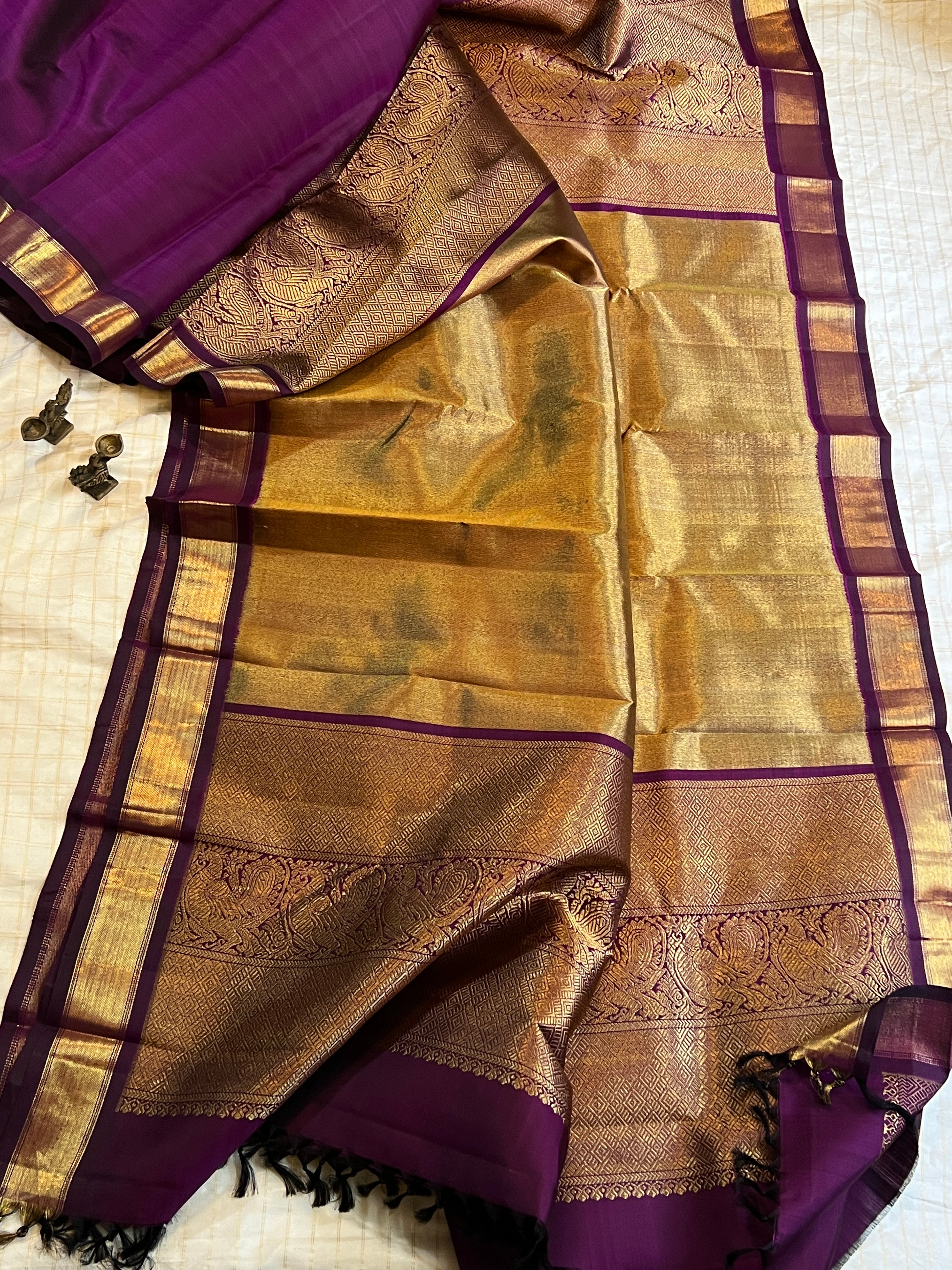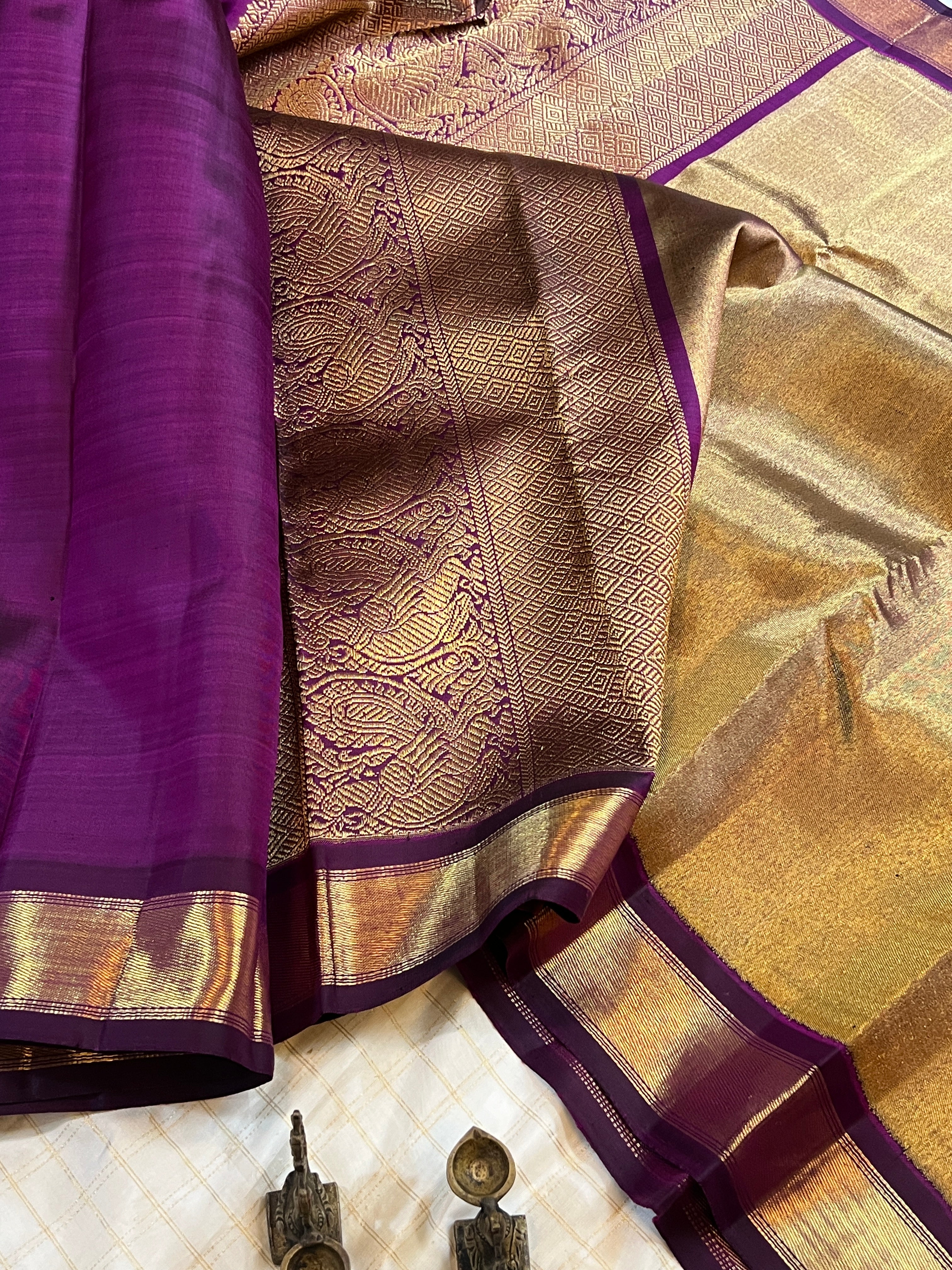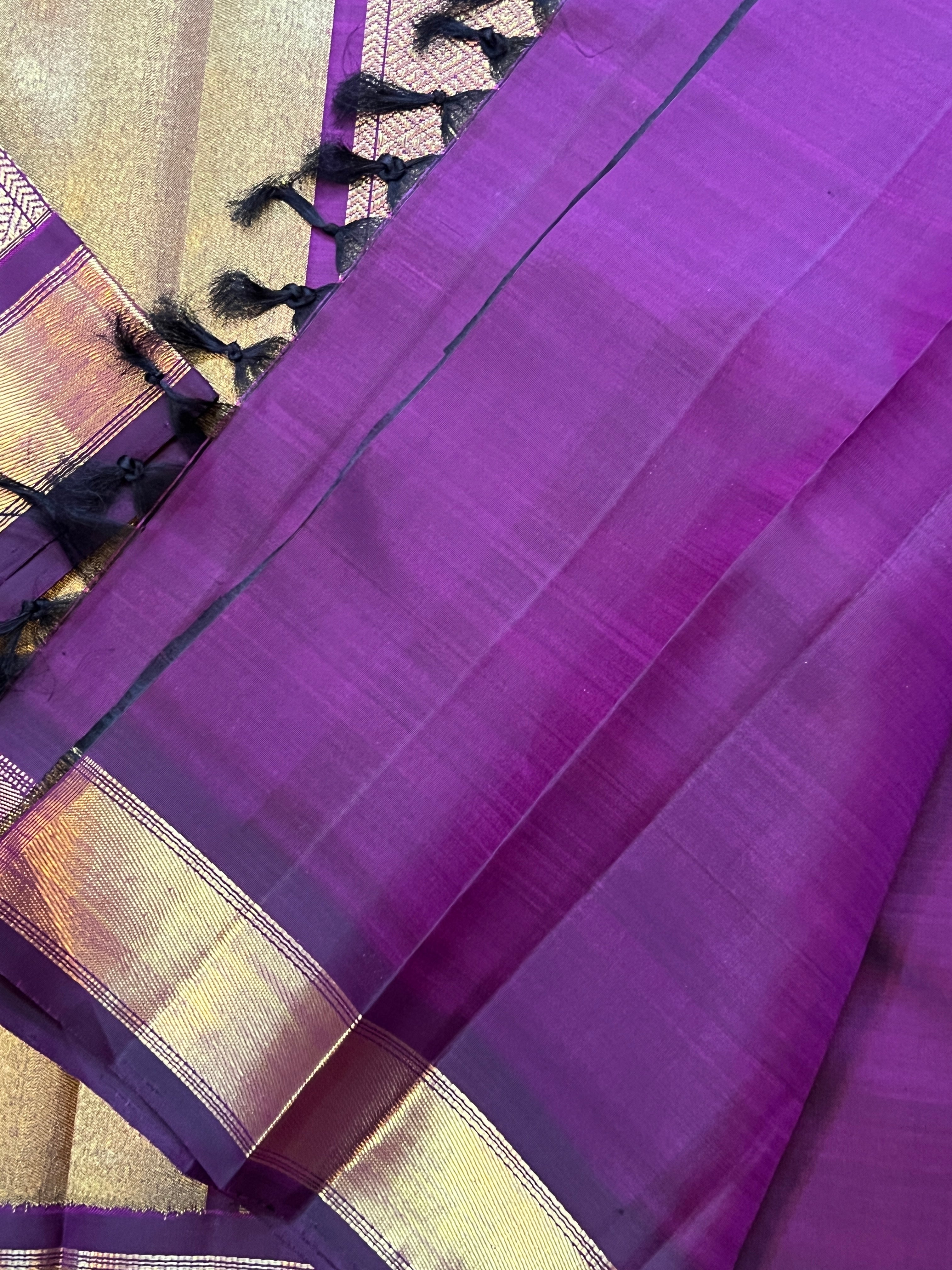 the saree is a dark vadamalli color , with long palla like orissa Berhampuri style , the palla is a rich 8 kol woven palla on centre and big Annam butta and the border is benarsi style palla . Attached blouse