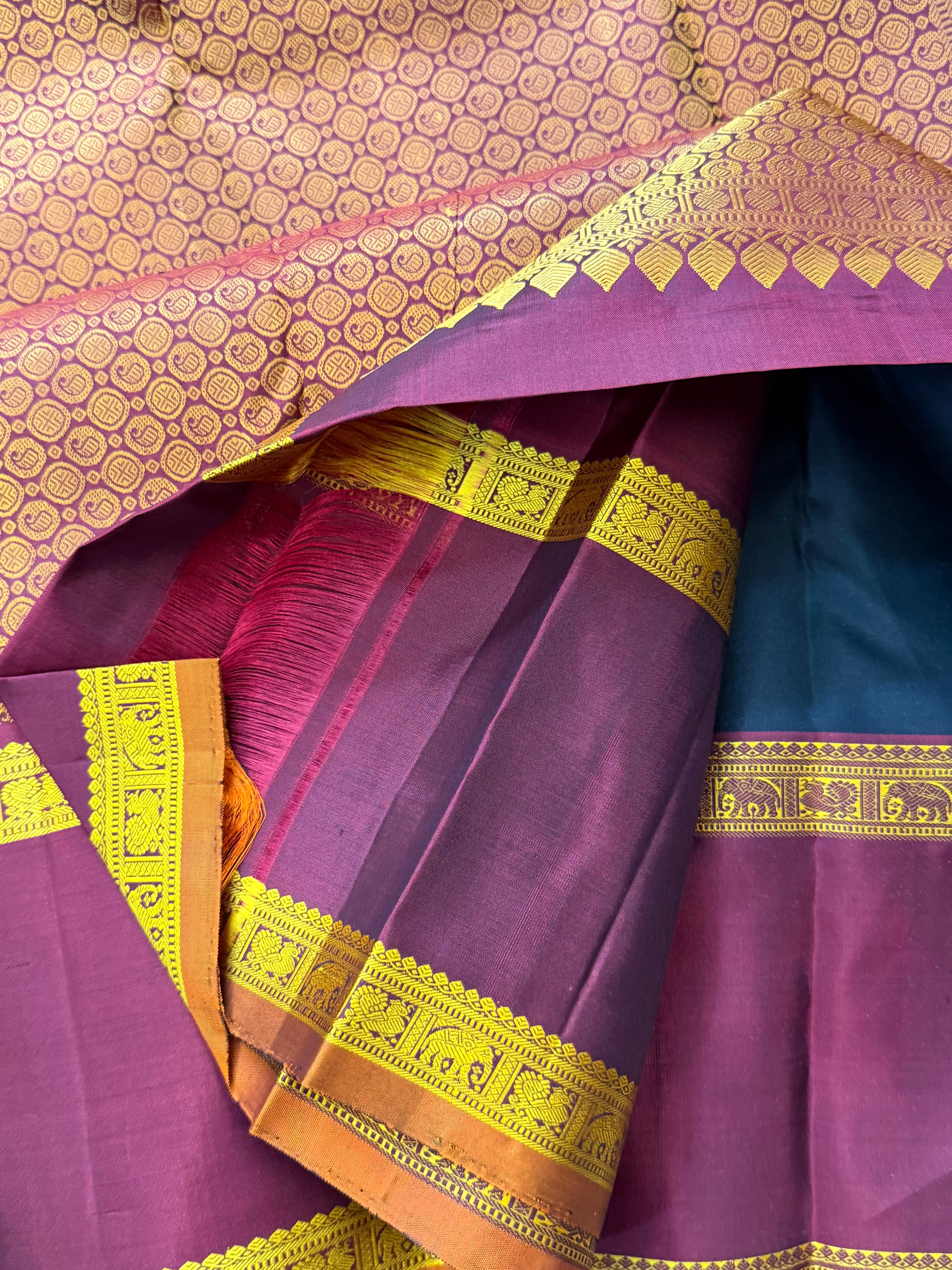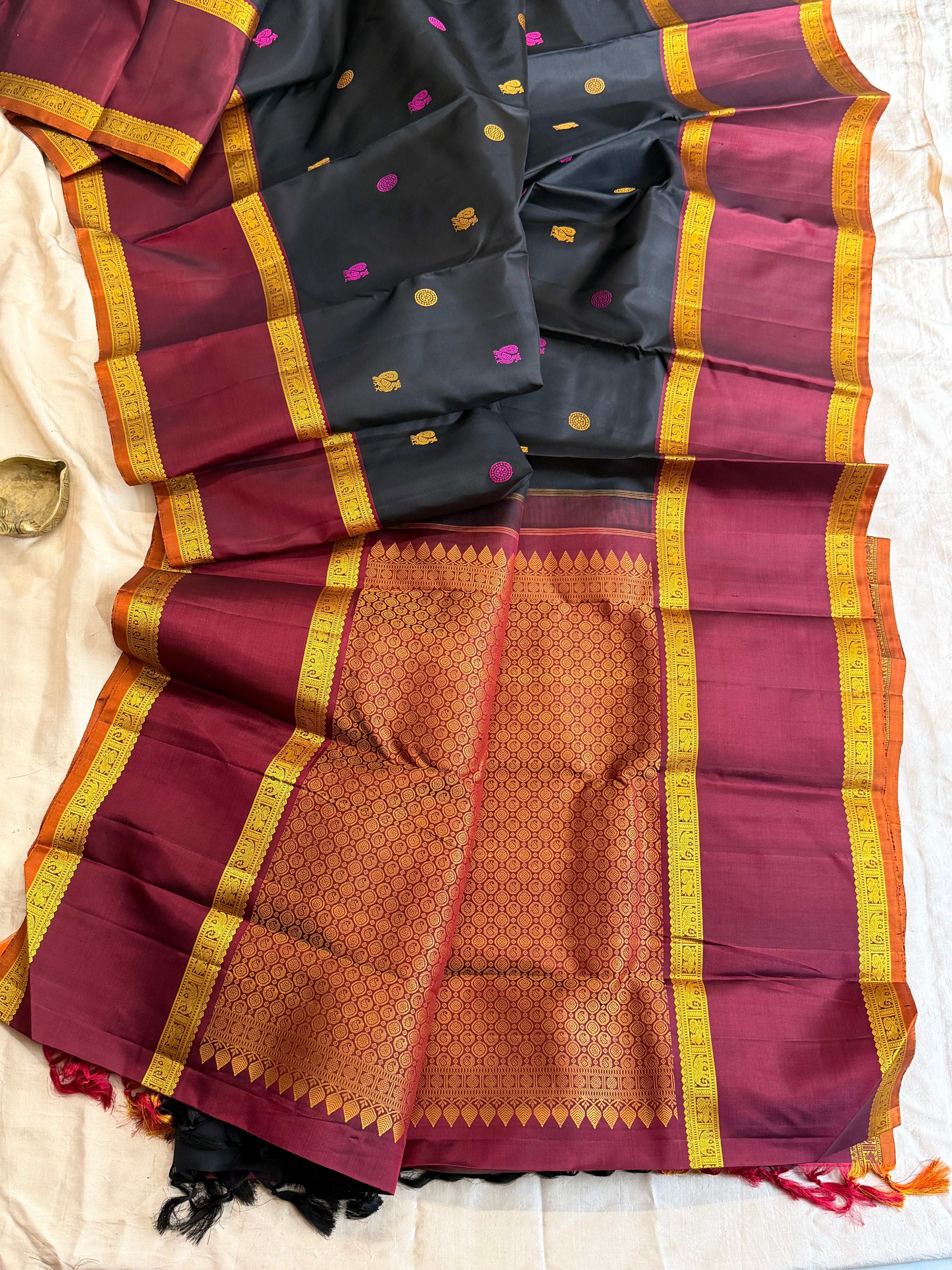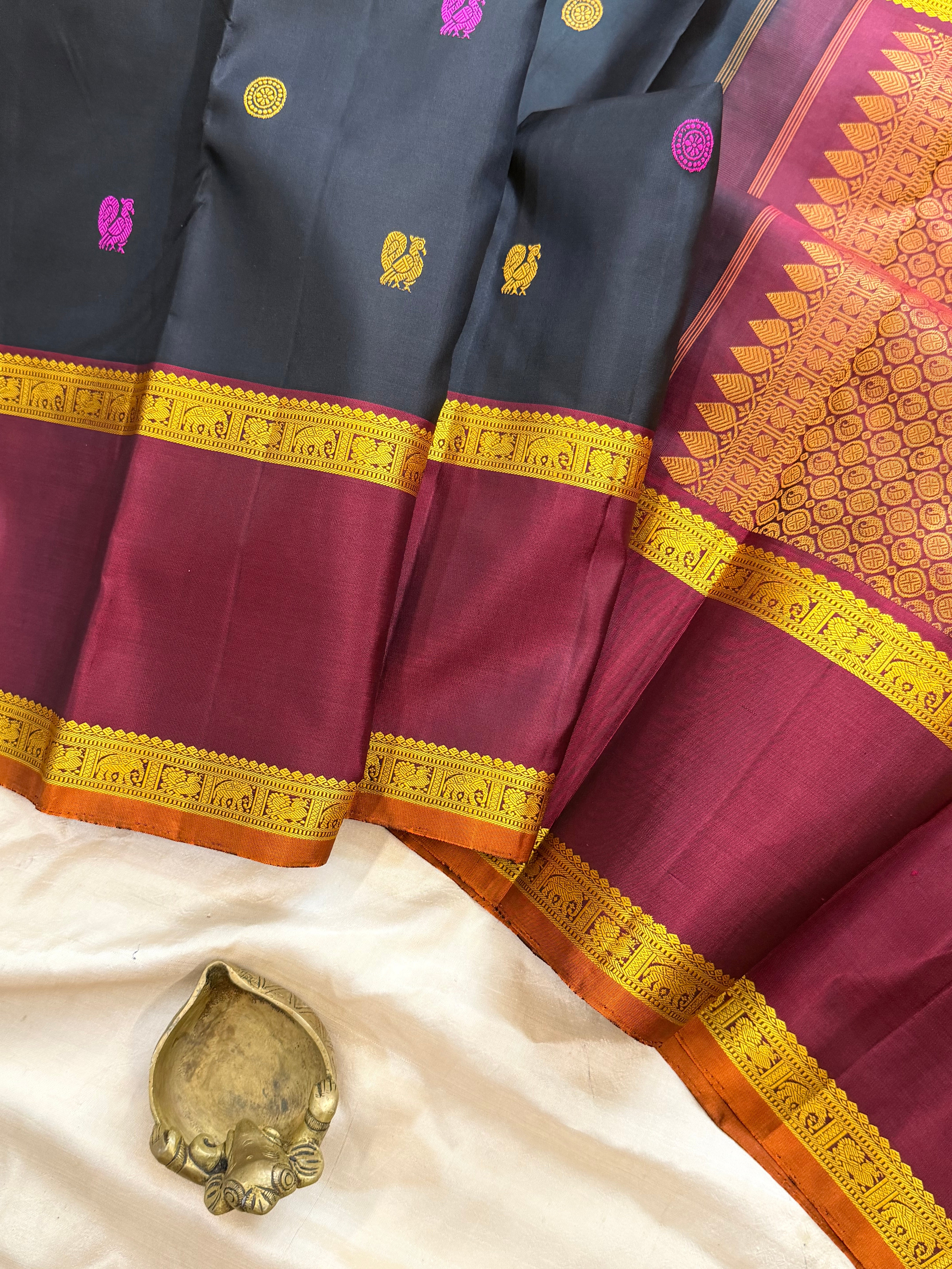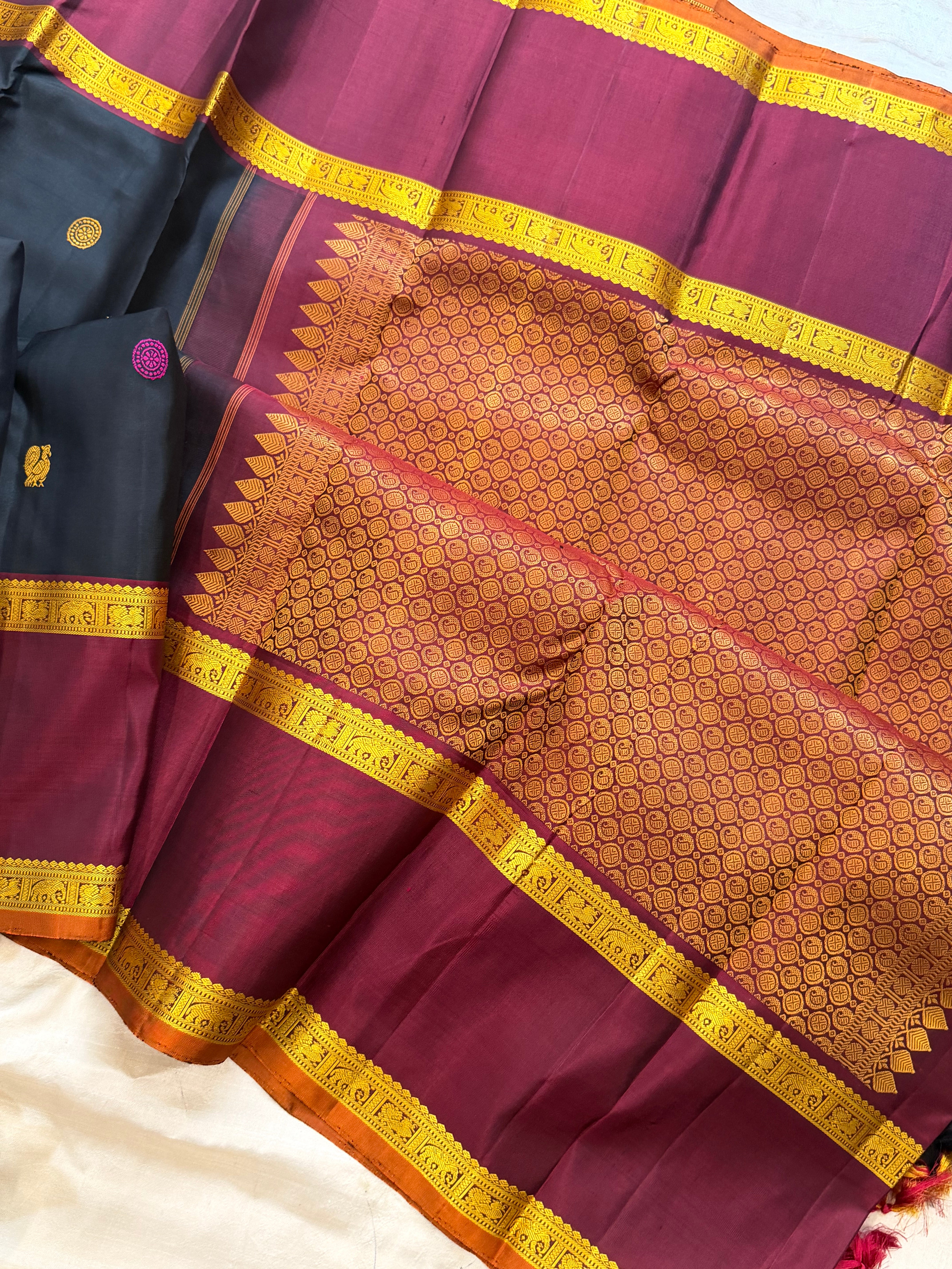 The saree is black retta pet thread work border and the body is annam chakram Butta and the palla is dense palla