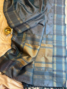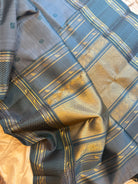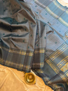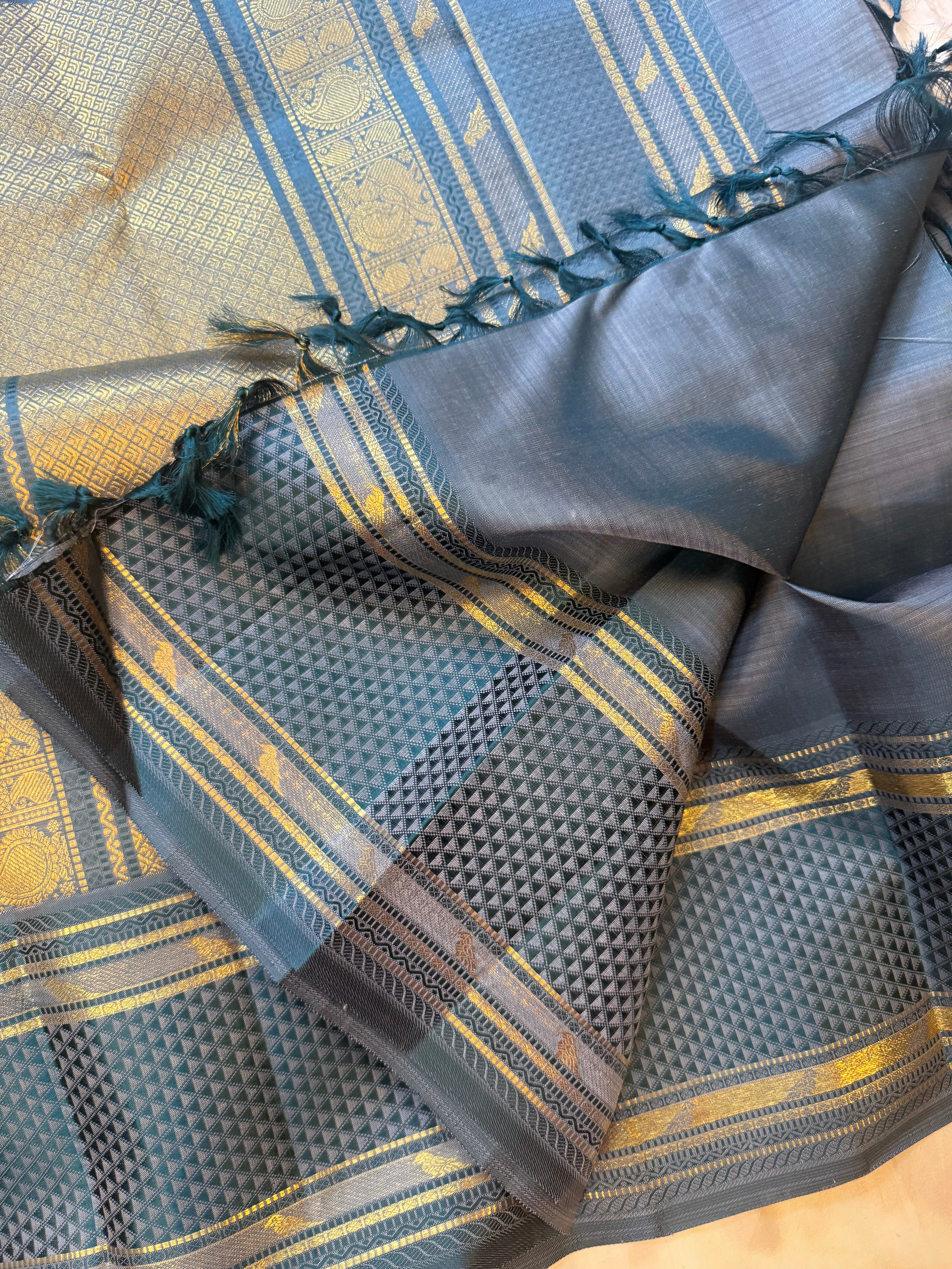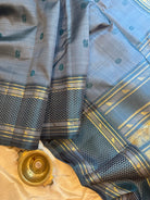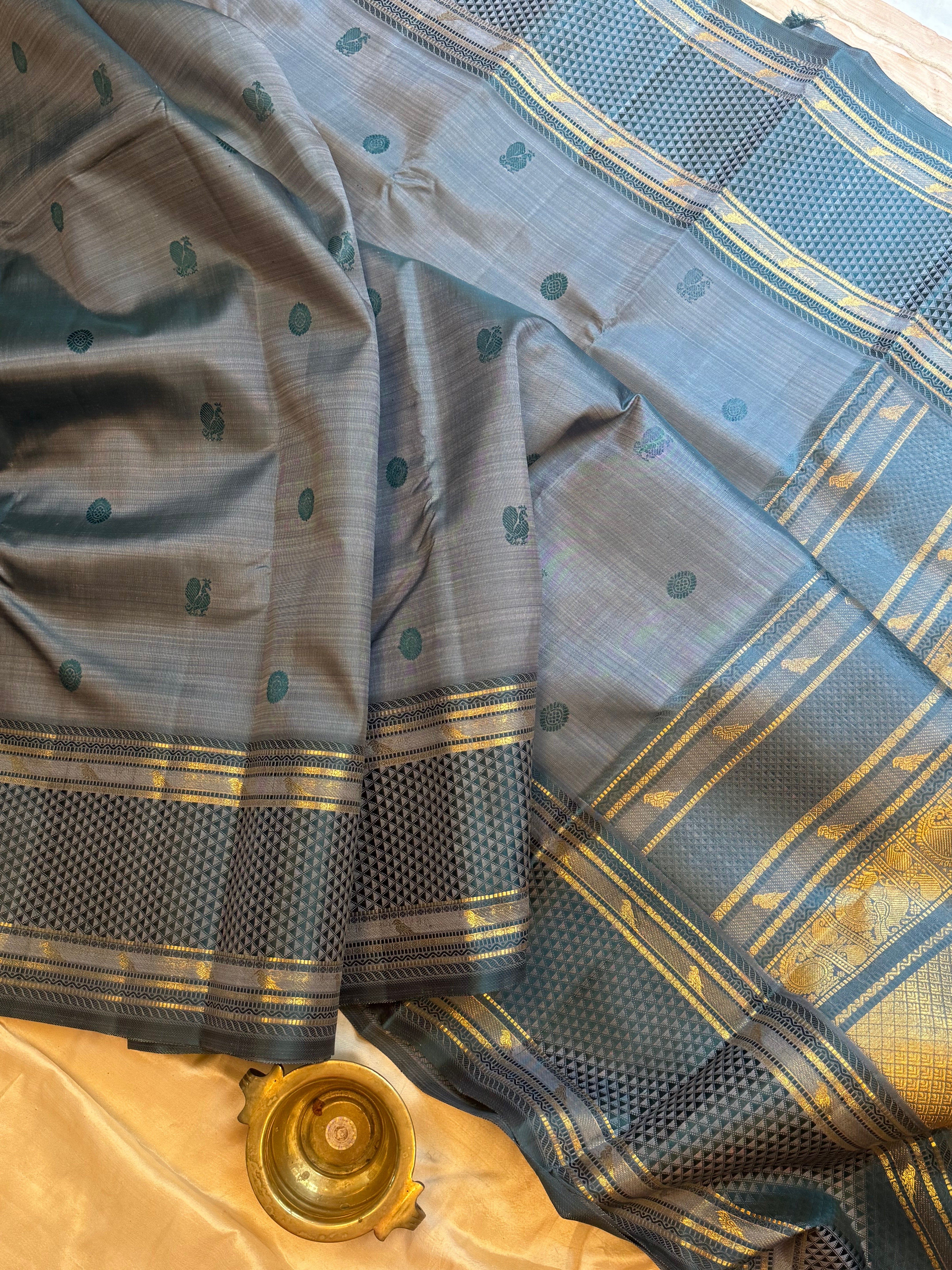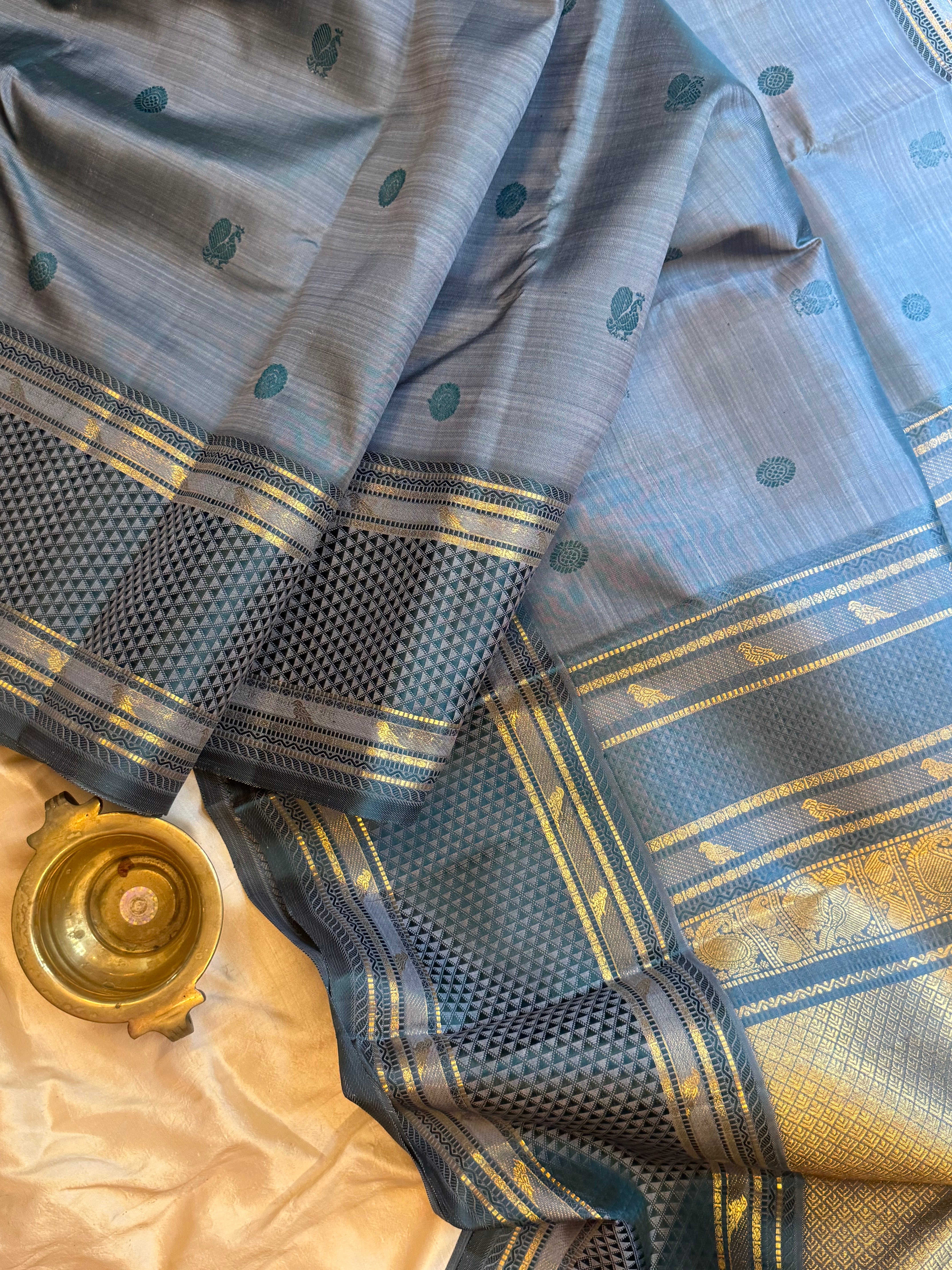 The body is bluish grey color with annam chakram Butta in silk thread and the border has both gold and thread work with bird Butta and araimadam border and Palla rich dense pure Zari Palla and blouse