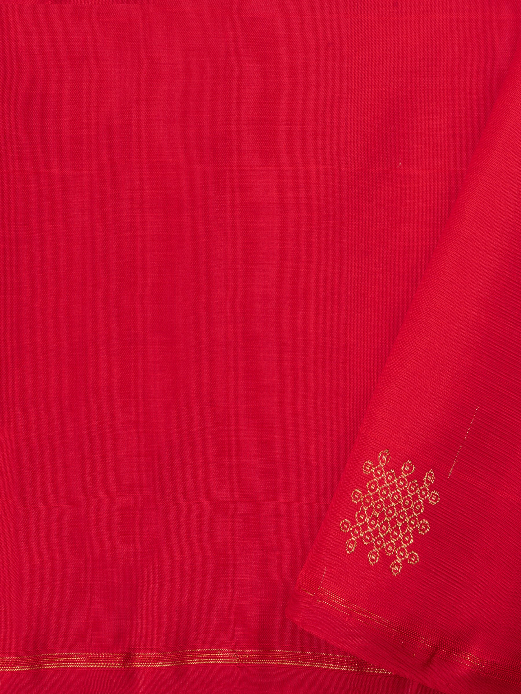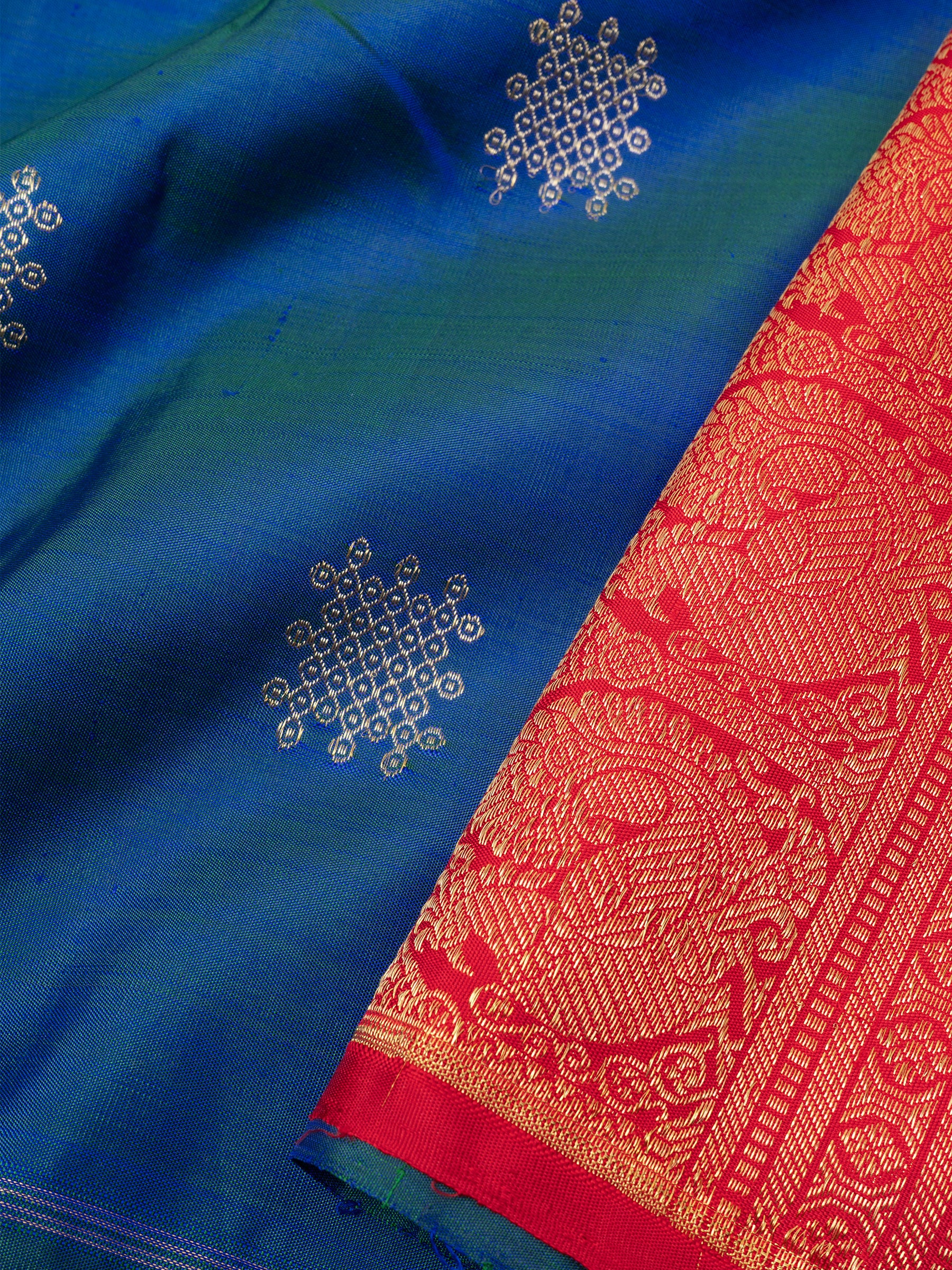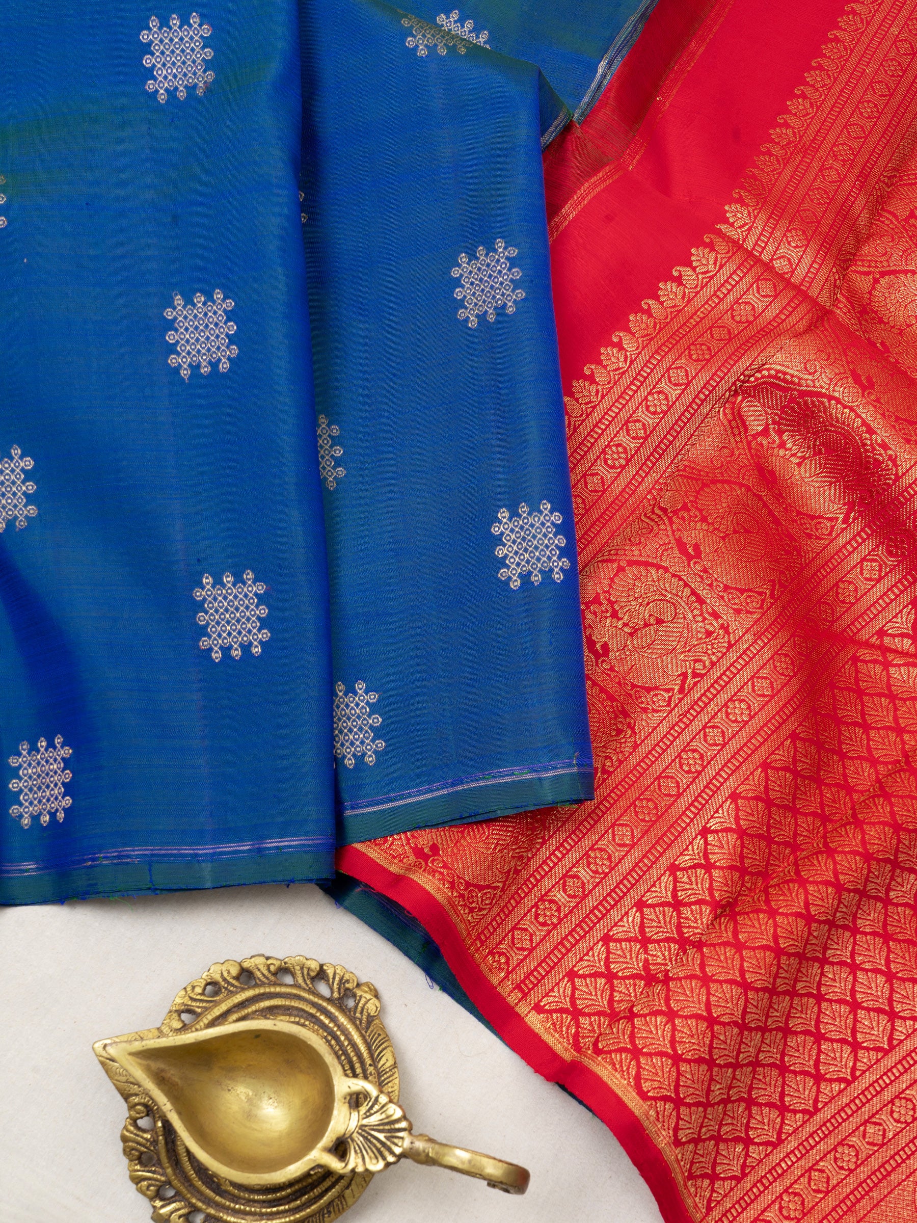 The body is mayilkazhuthu colour with Kolam Butta in body and red dense pure Zari Palla and blouse