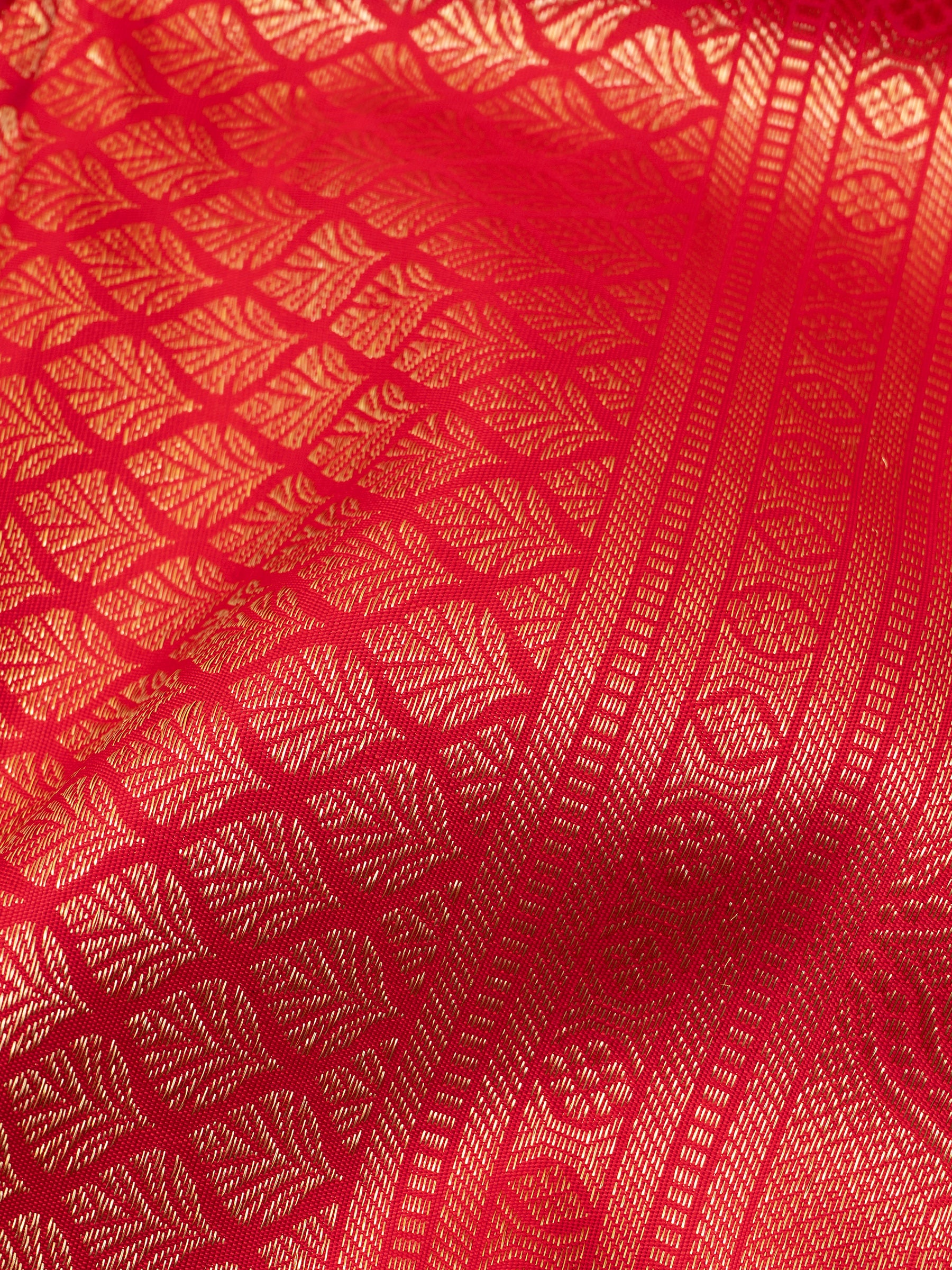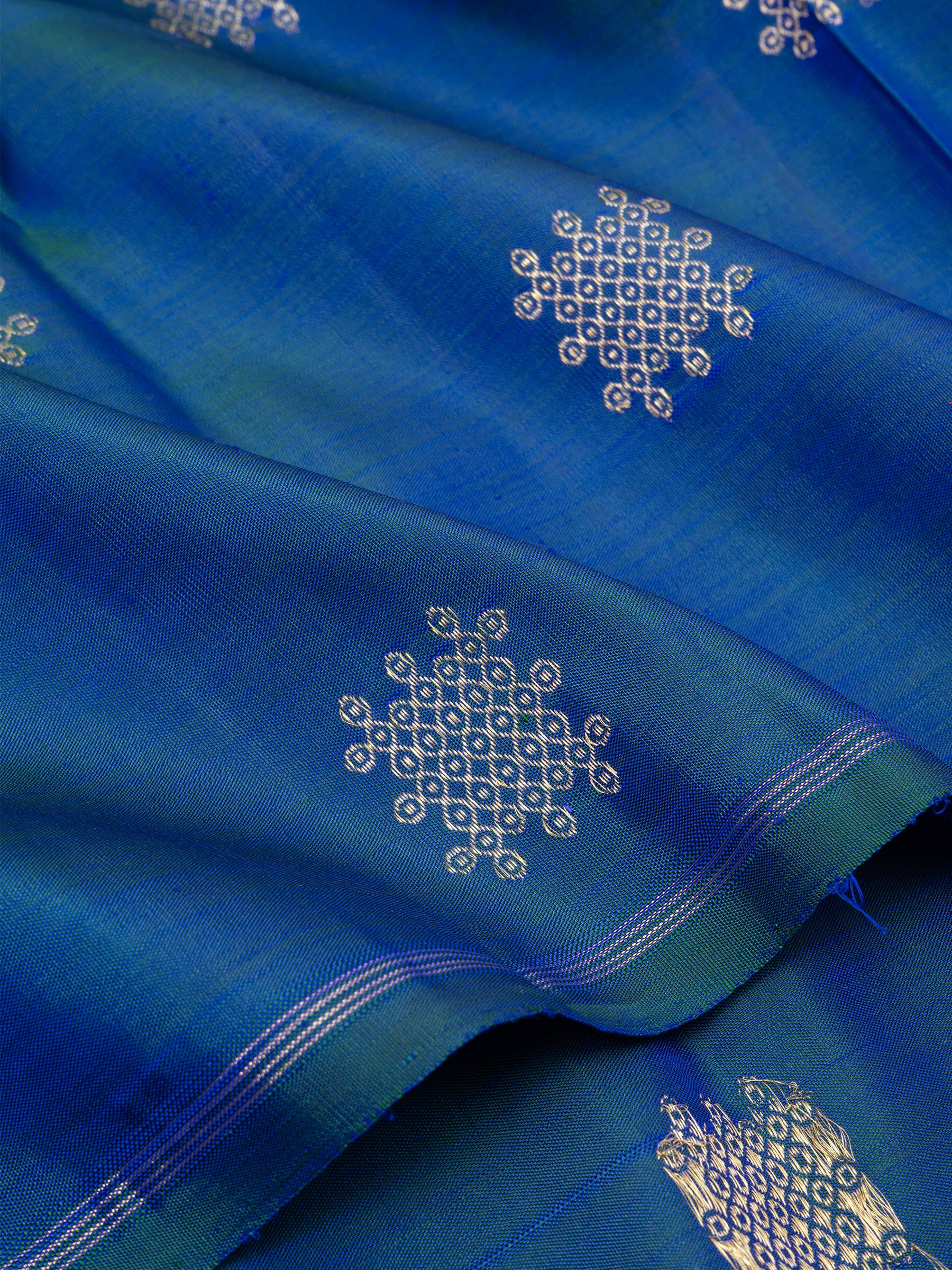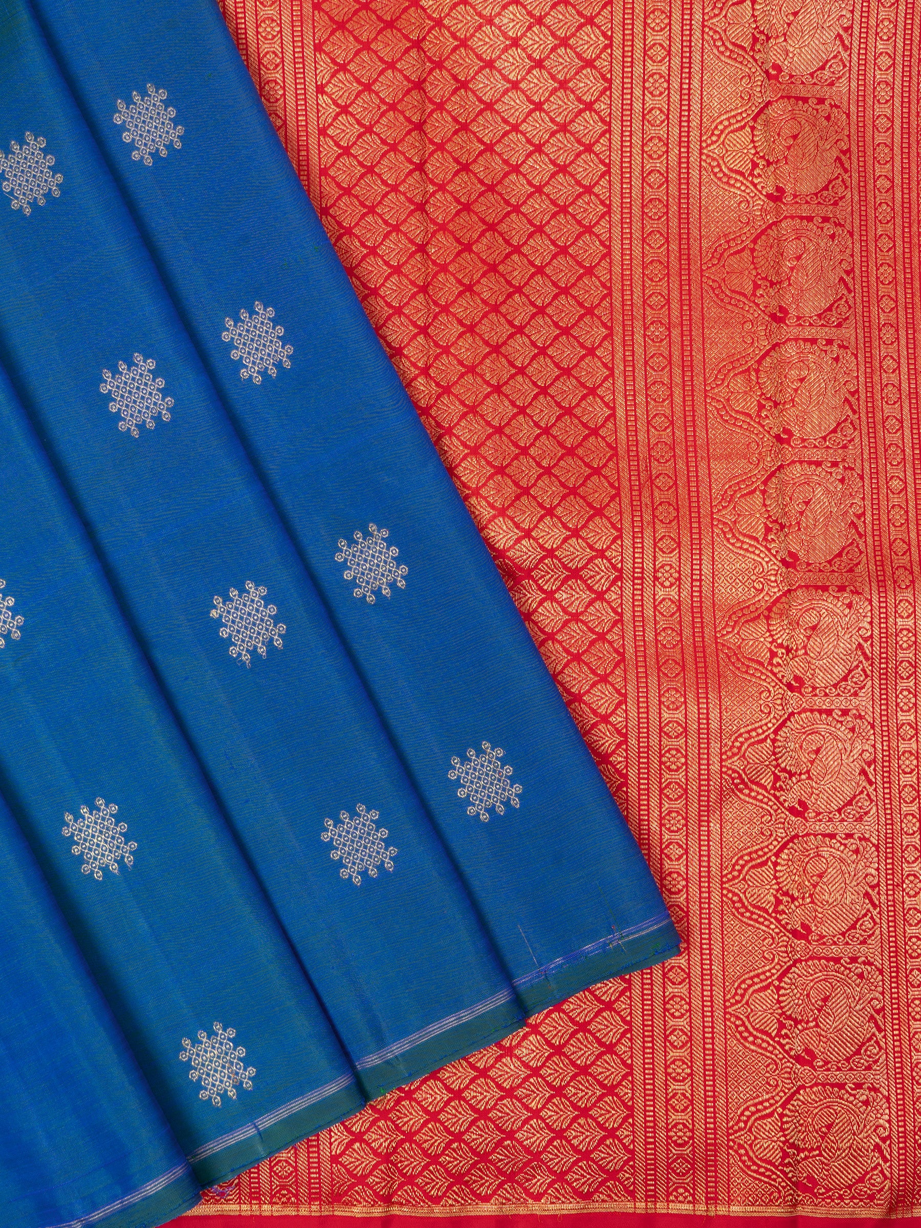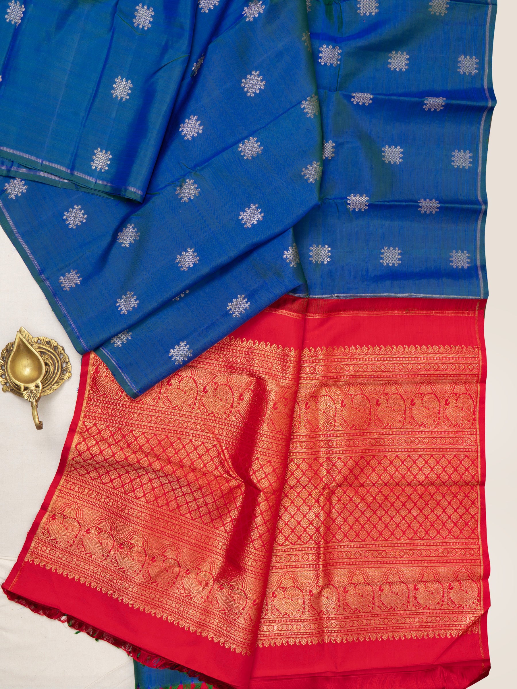 The body is mayilkazhuthu colour with Kolam Butta in body and red dense pure Zari Palla and blouse