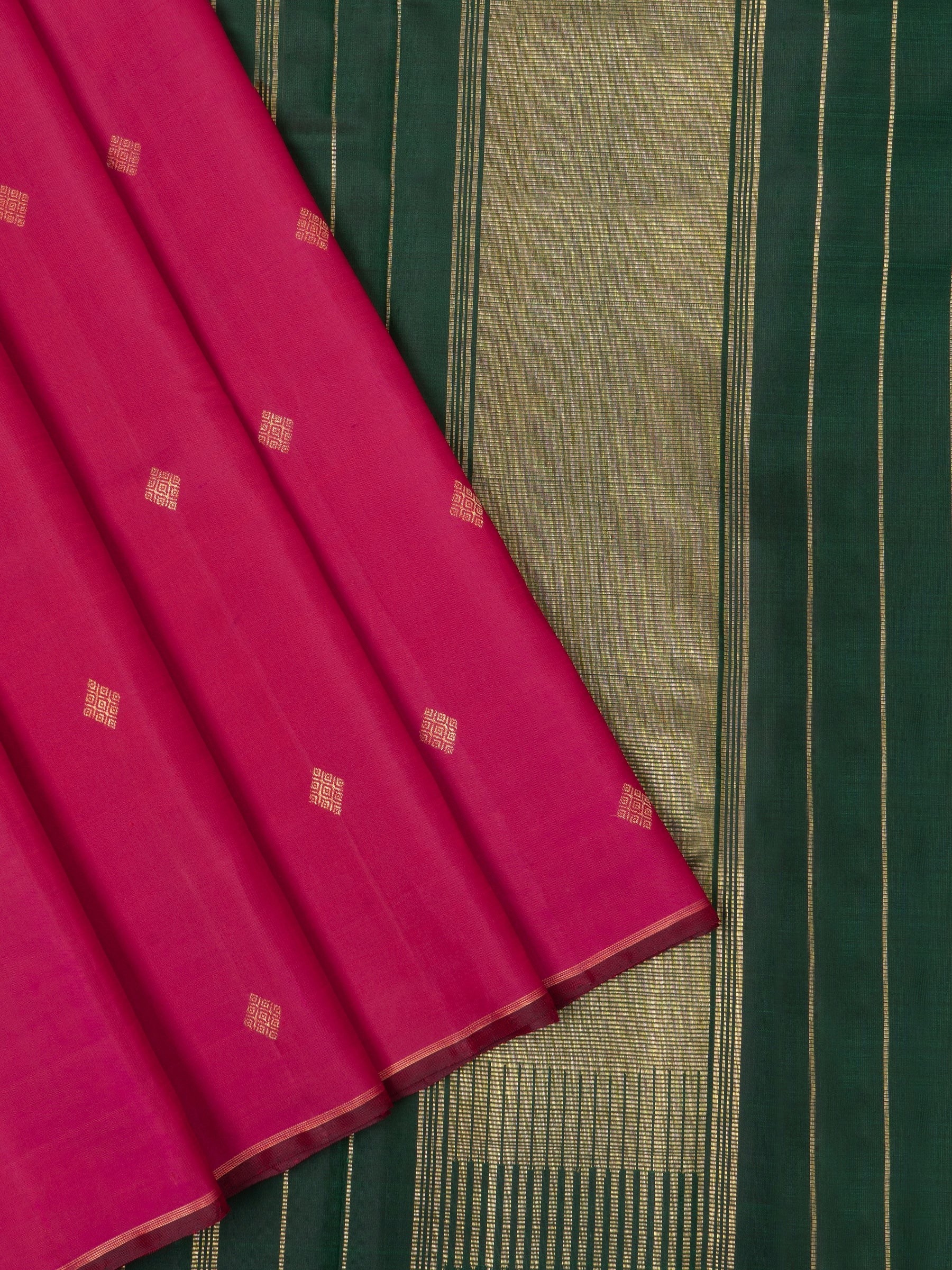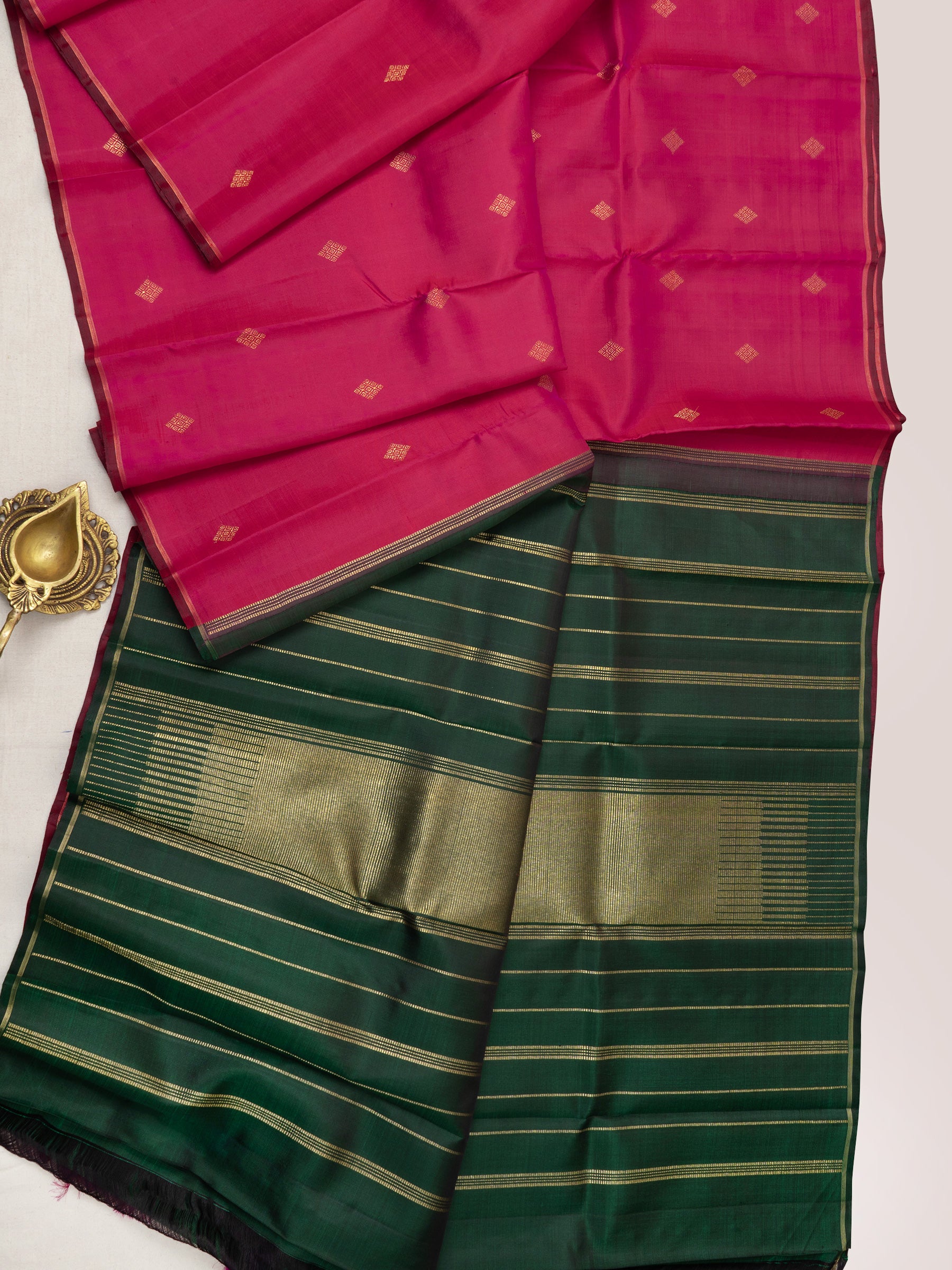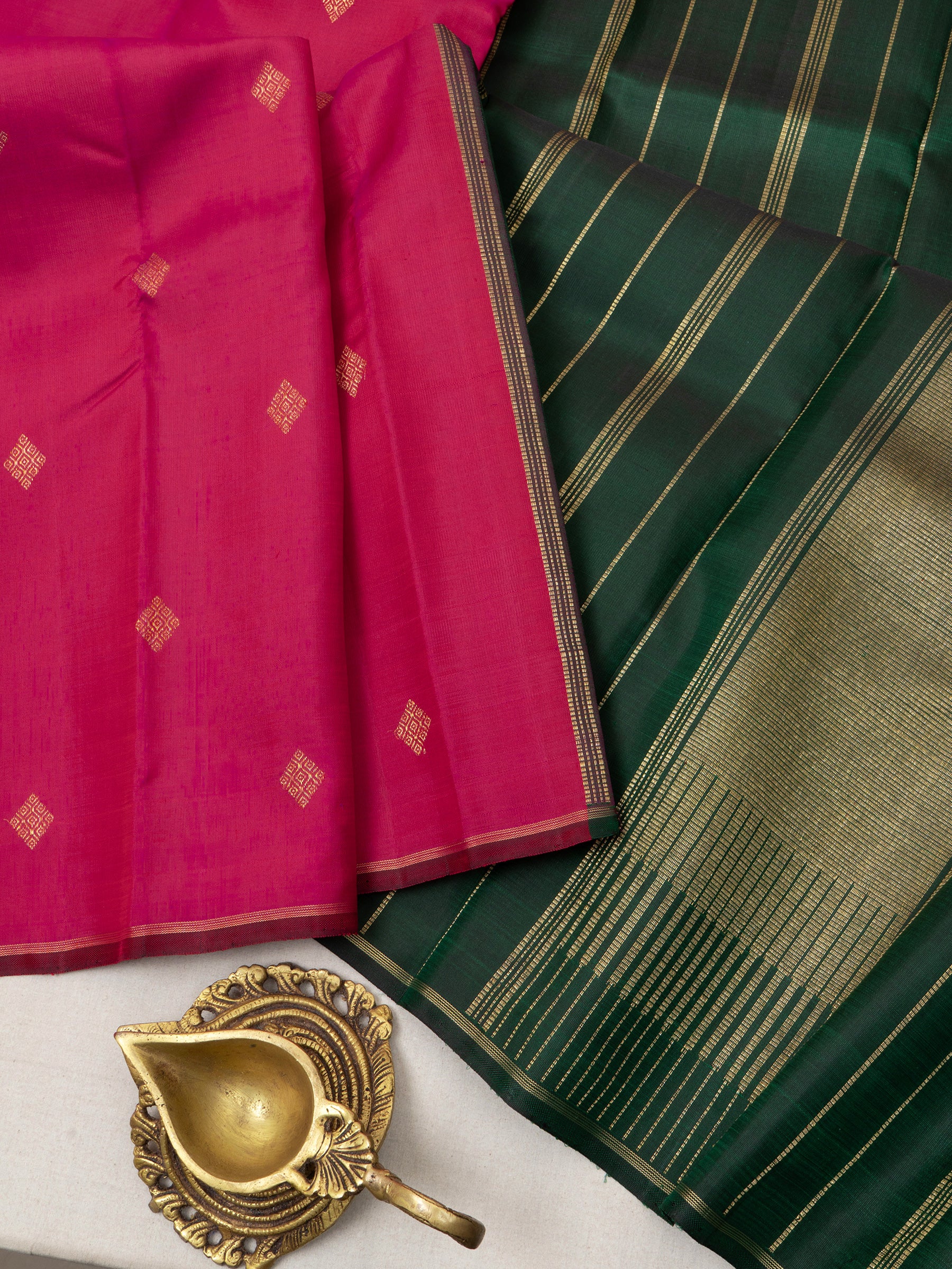 The body is deep pink with star Kasuti Butta and the Palla is dark green Zari Palla and blouse