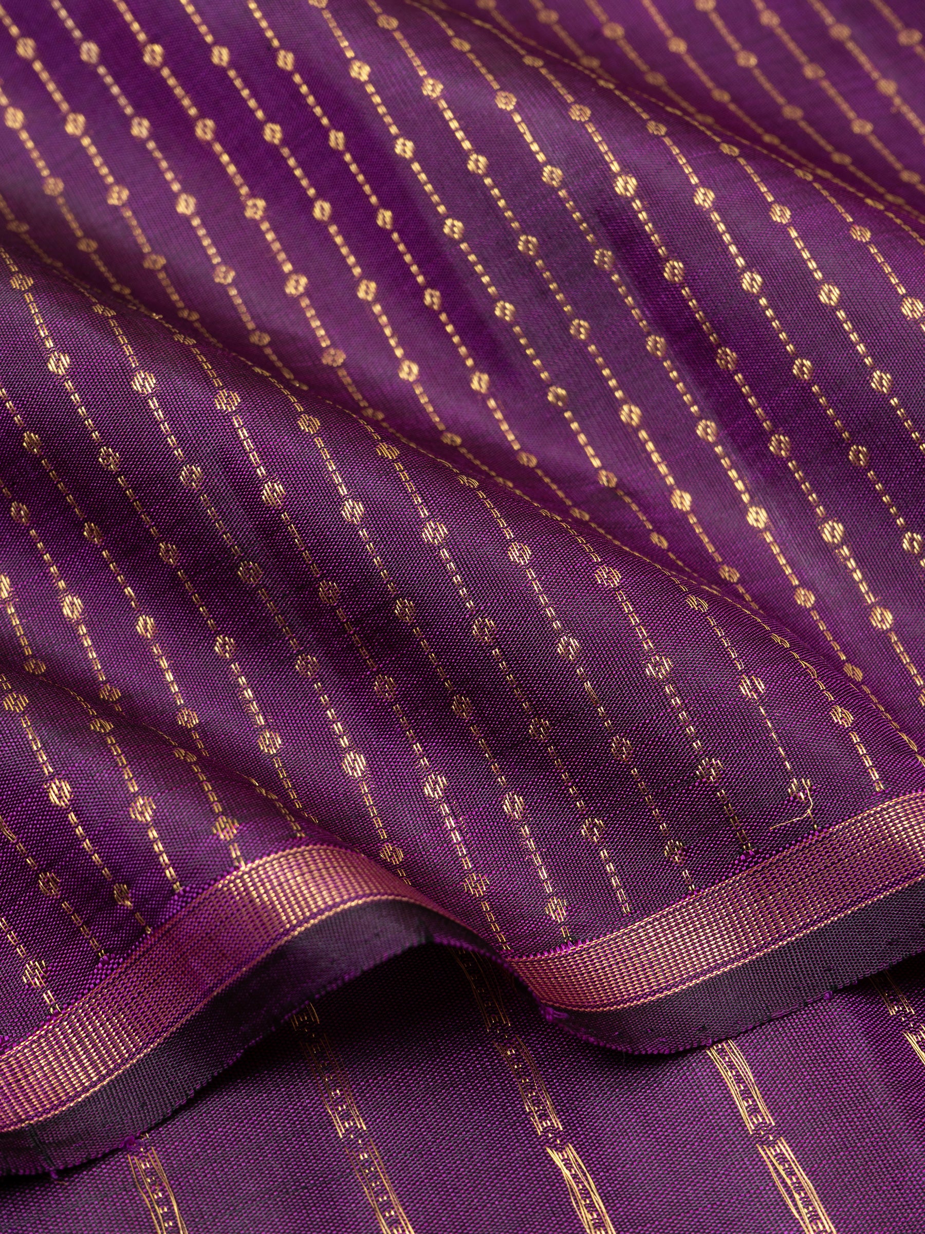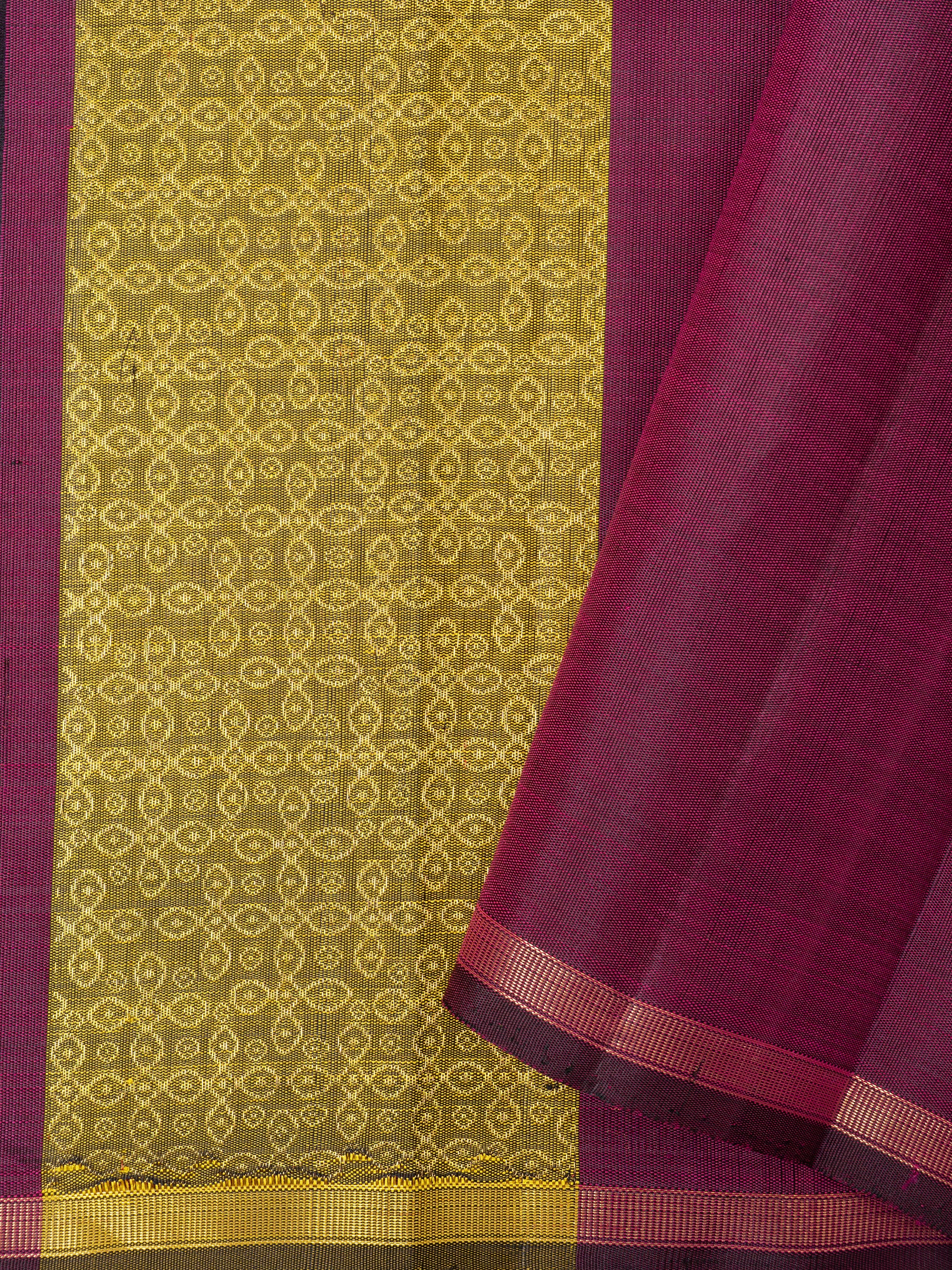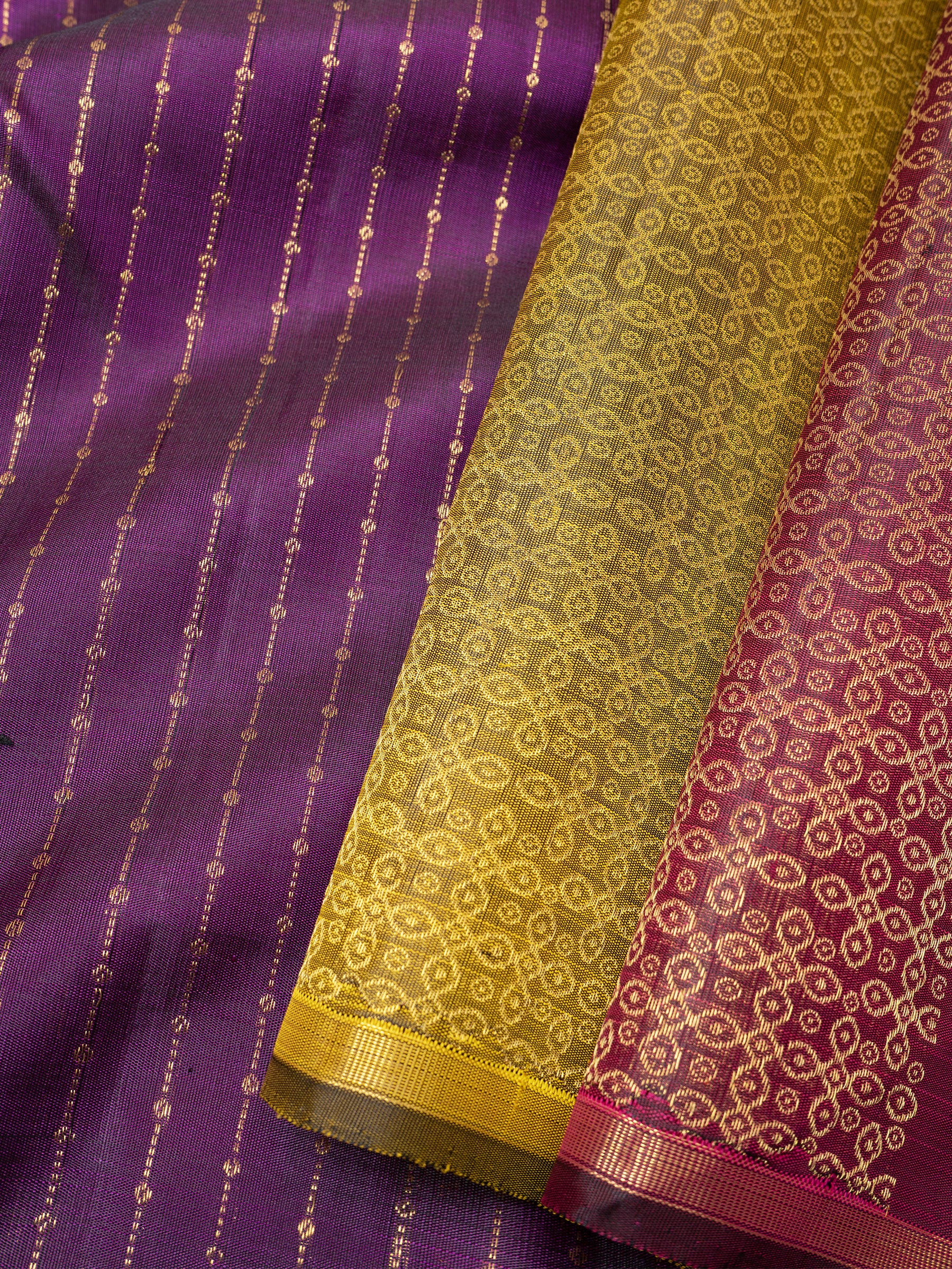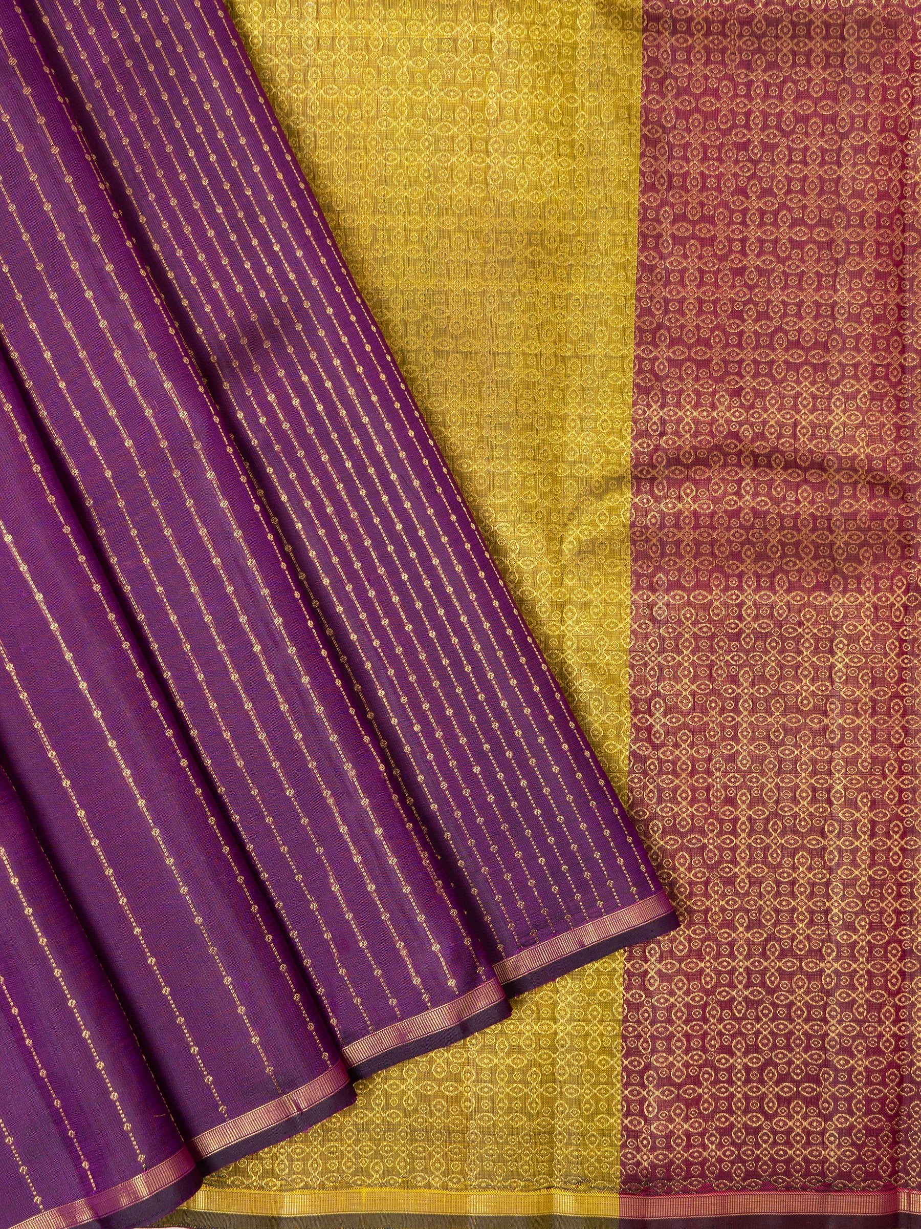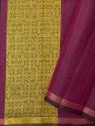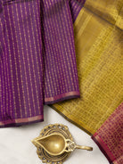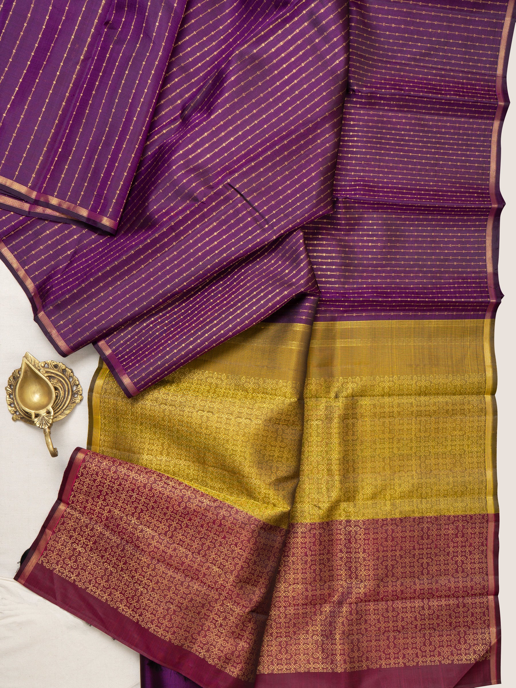 The body is deep purple with Thodar Butta and the Palla is retta Palla in yellow and brown Kolam style all in pure zari and blouse attached.