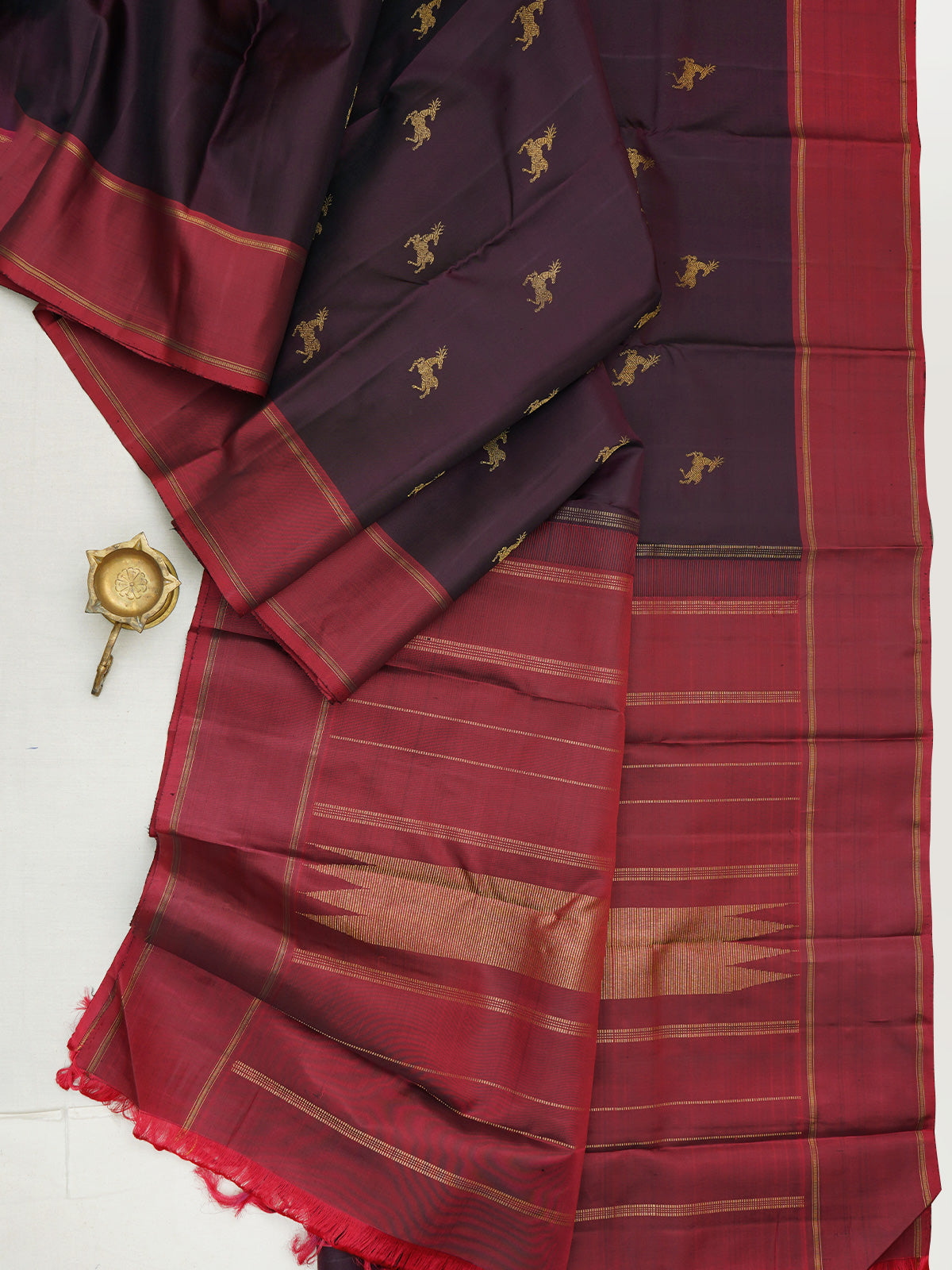 The body is deep brown with maan Butta and araku border and Zari rekku Palla and blouse