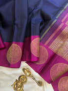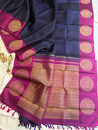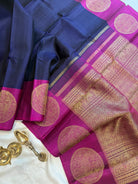 The body is a dark blue with magenta border with round yazhli pet border and the Palla is dense pure Zari Palla and blouse