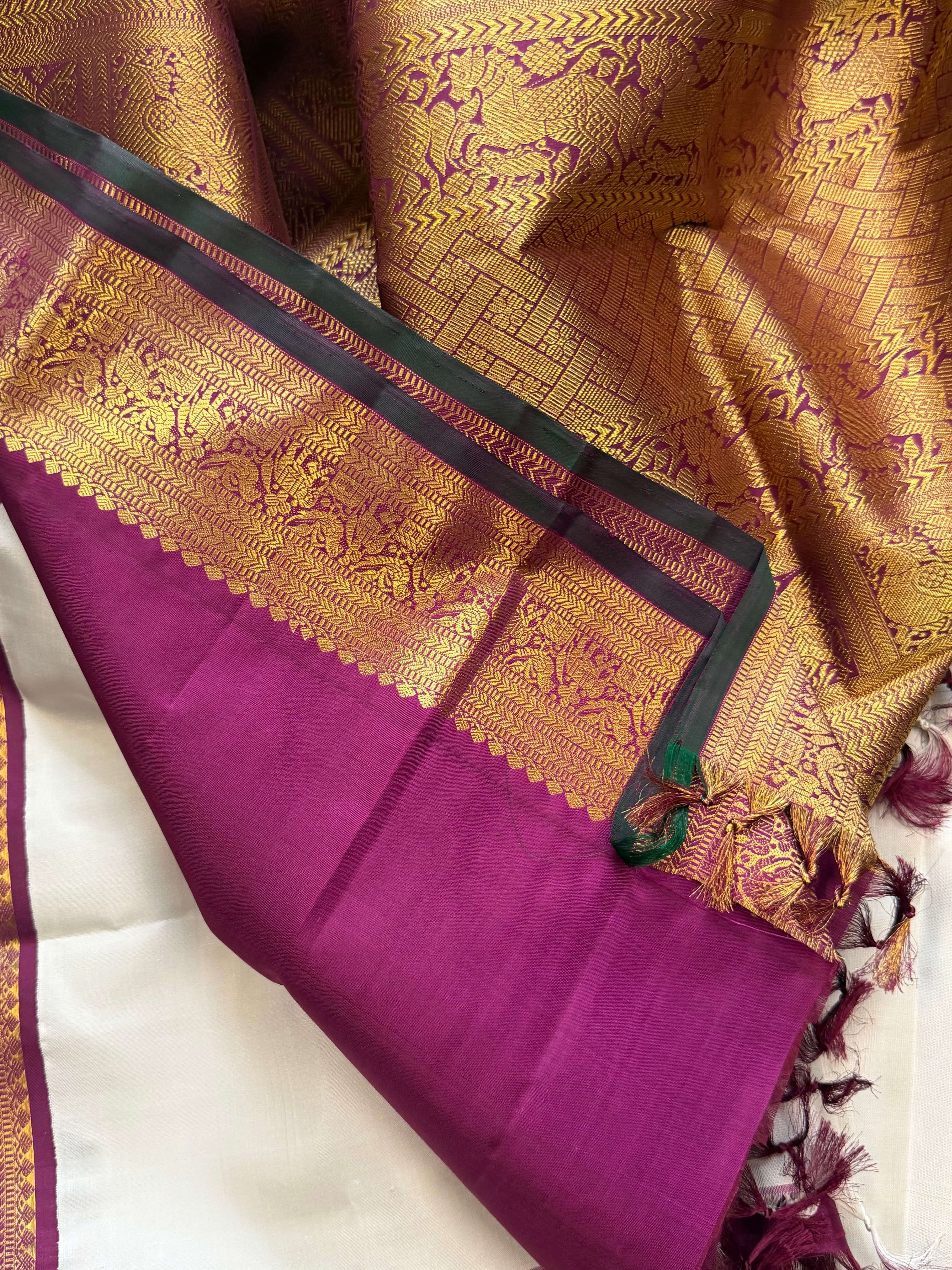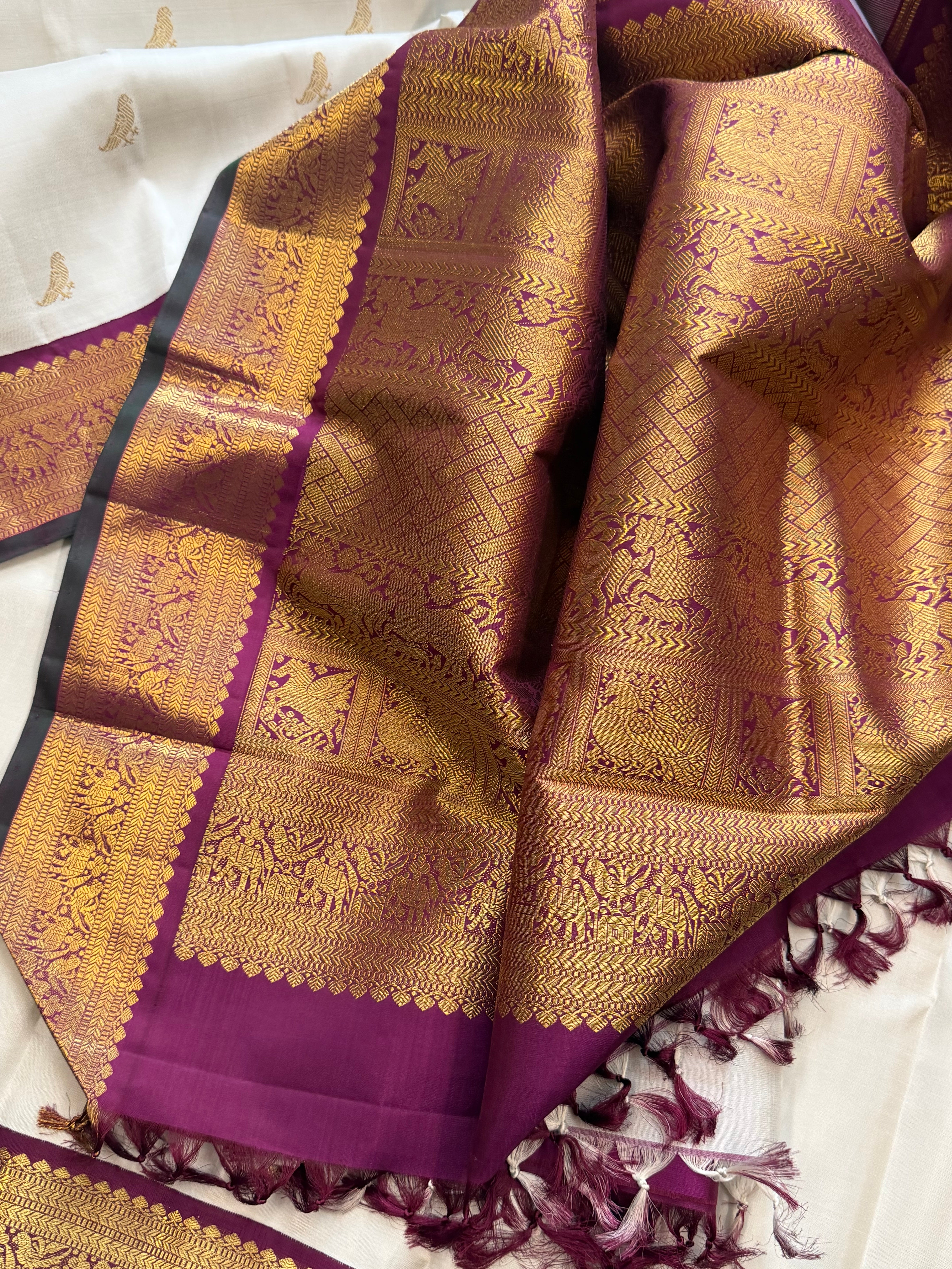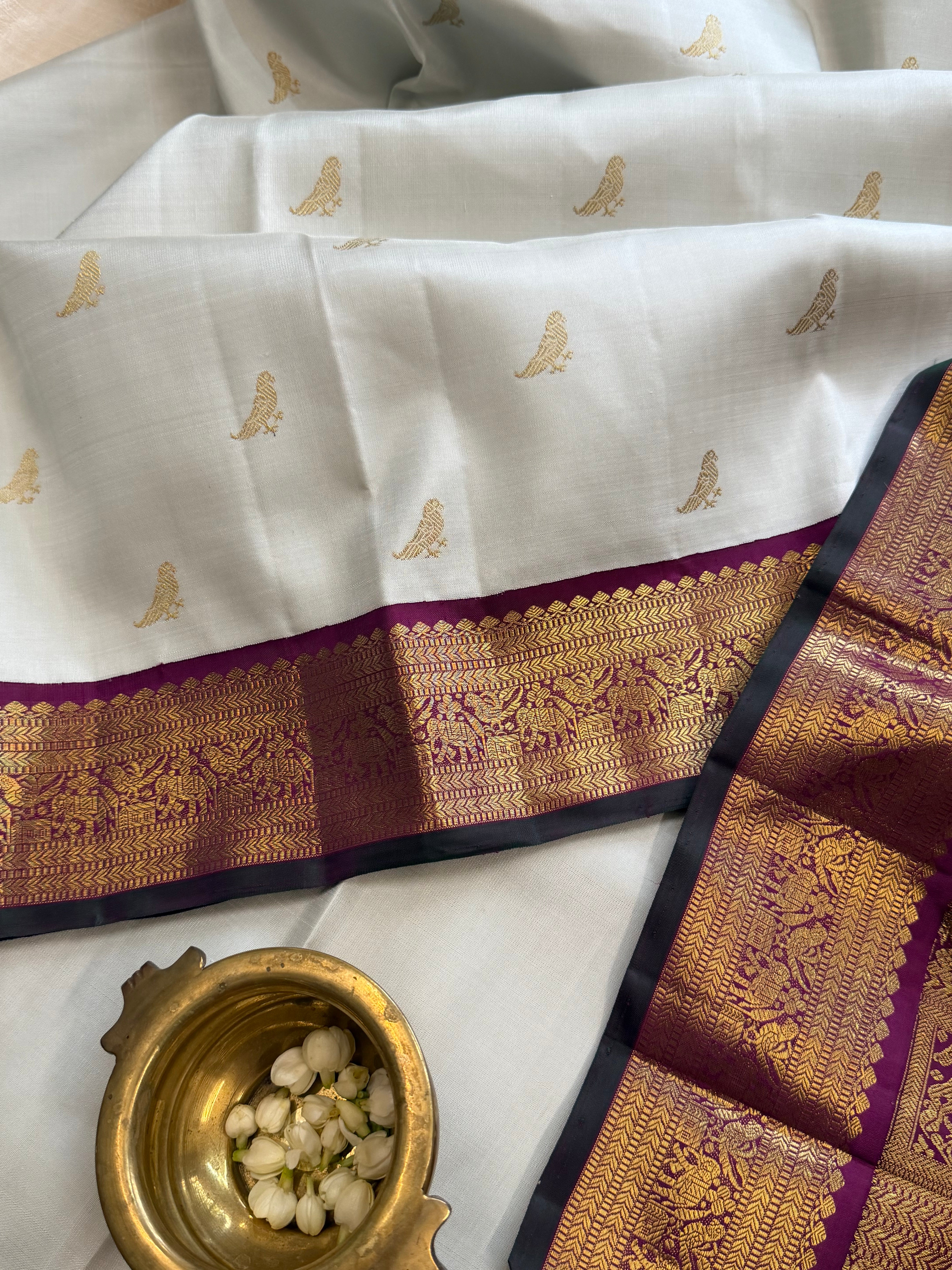 The saree body is eeyam colour with bird Butta all over and the border is purple Kai Korvai with bird houses motif and dense pure Zari palls and blouse