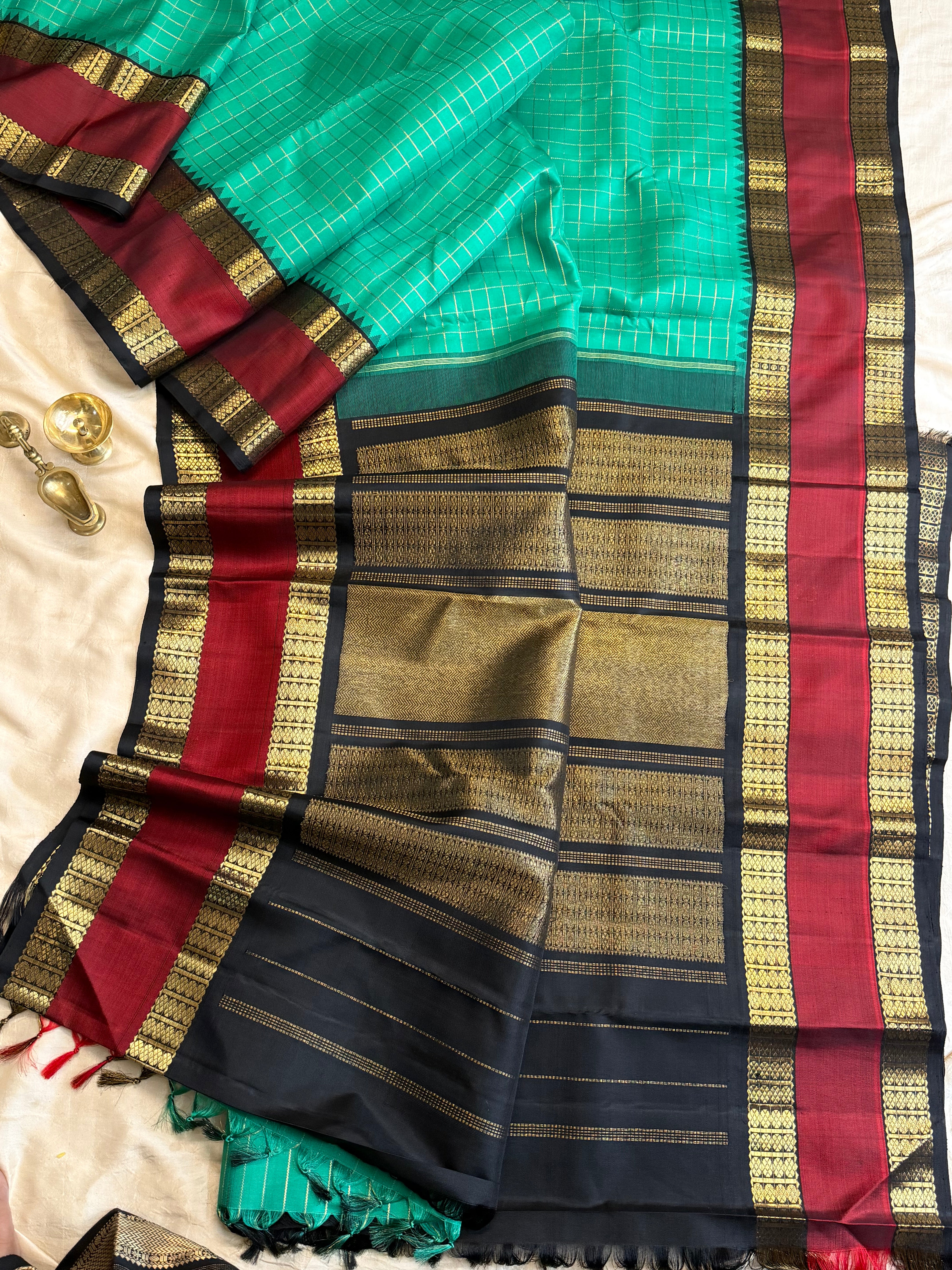 The body is a light emerald green (Jade green colour ) on  body with Zari Kattam and the border is Kai Korvai with retta pet borders in black and centre is Araku and dense pure Zari palla and blouse