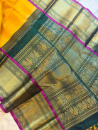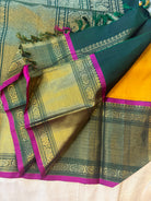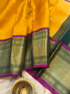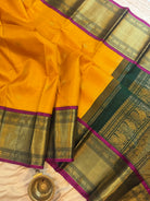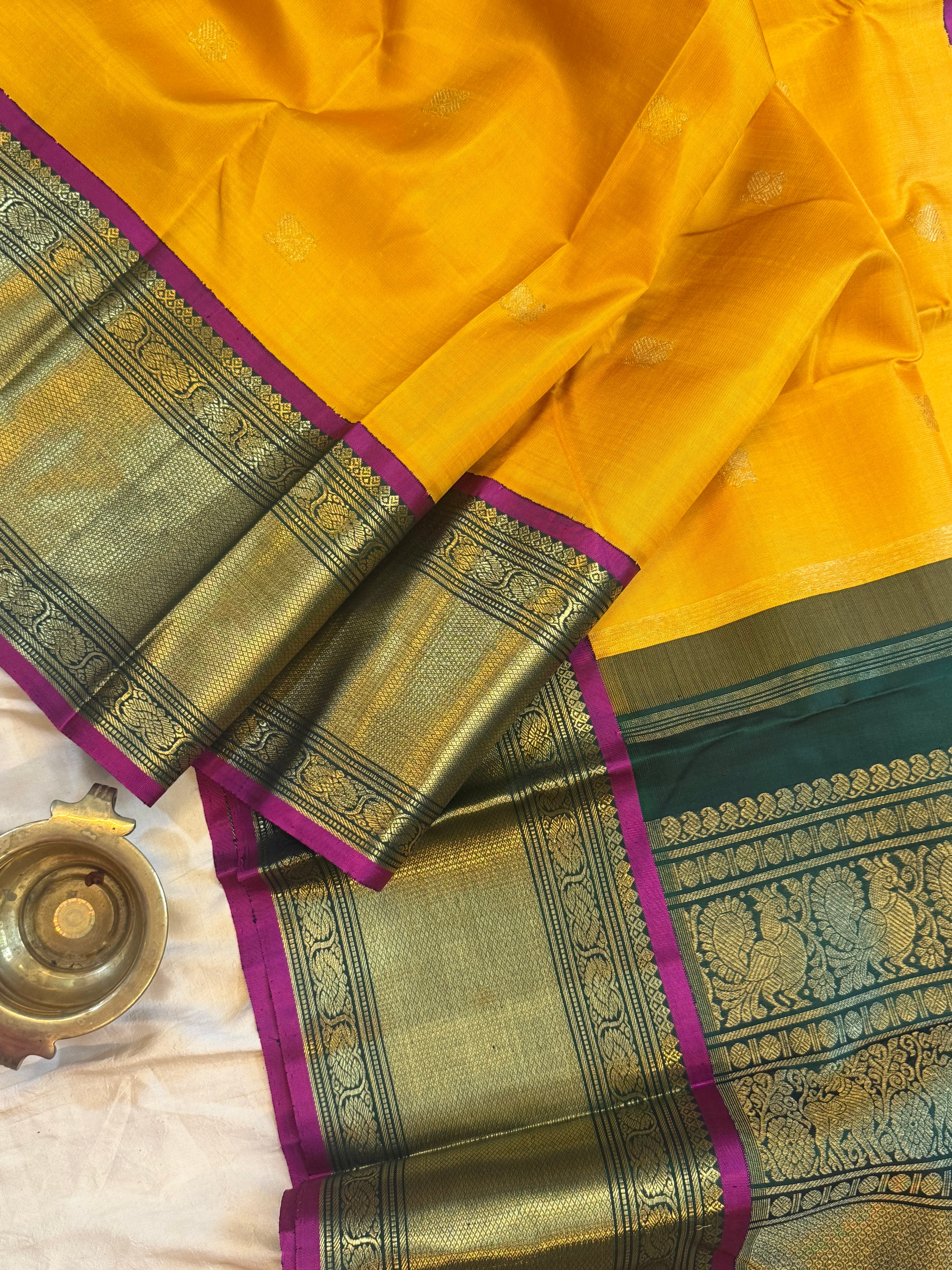 The body is pasumanjal color ( yellow ) with annam chakram Butta and the border is Kai Korvai in dark green colour with kodi visiri pattern and Kuil kann pet with purple selvedge and dense pure Zari Palla and blouse , the Zari is 3.5gm gold Zari around 35% silver . The border is 7 inches Both side
