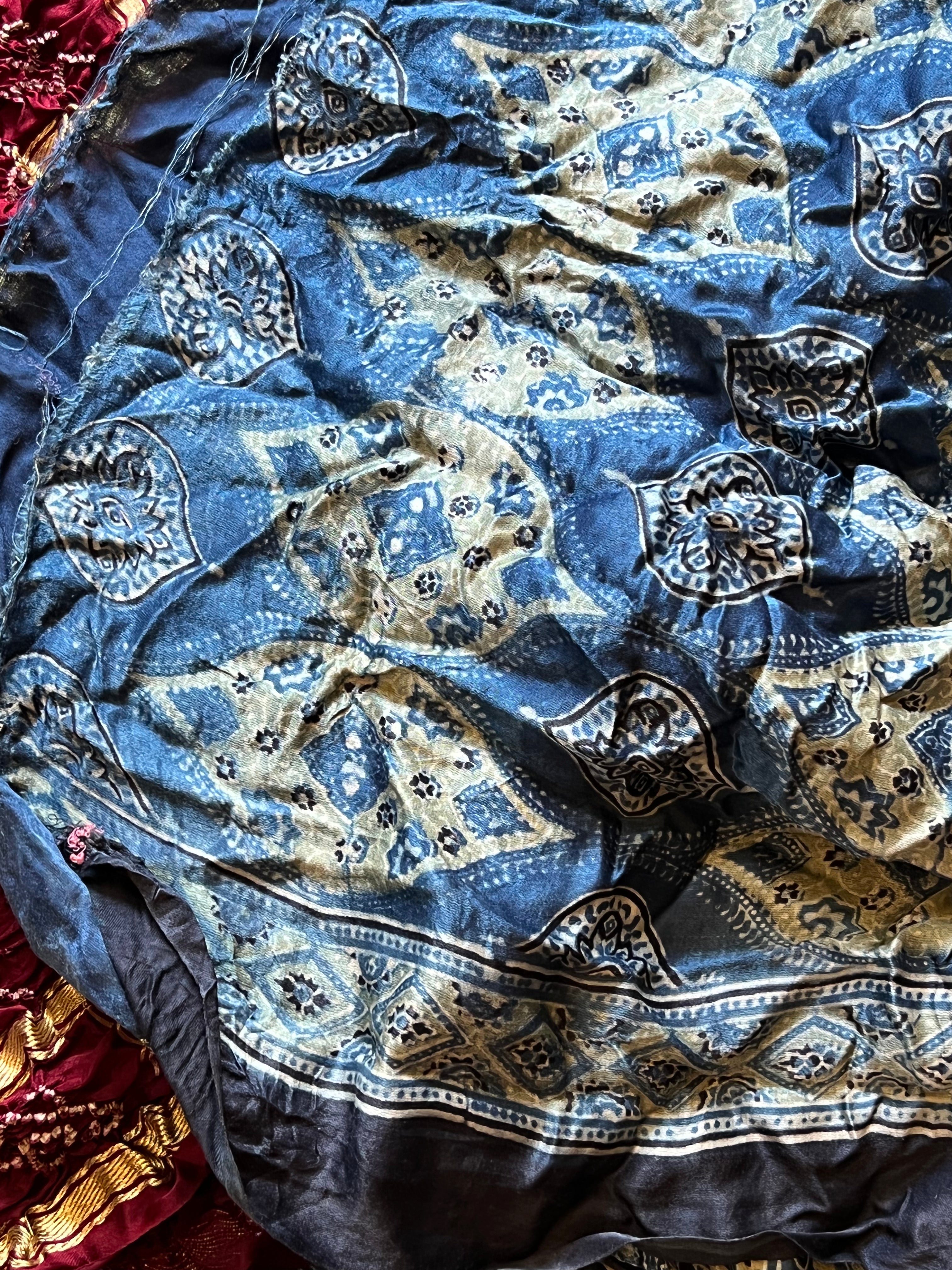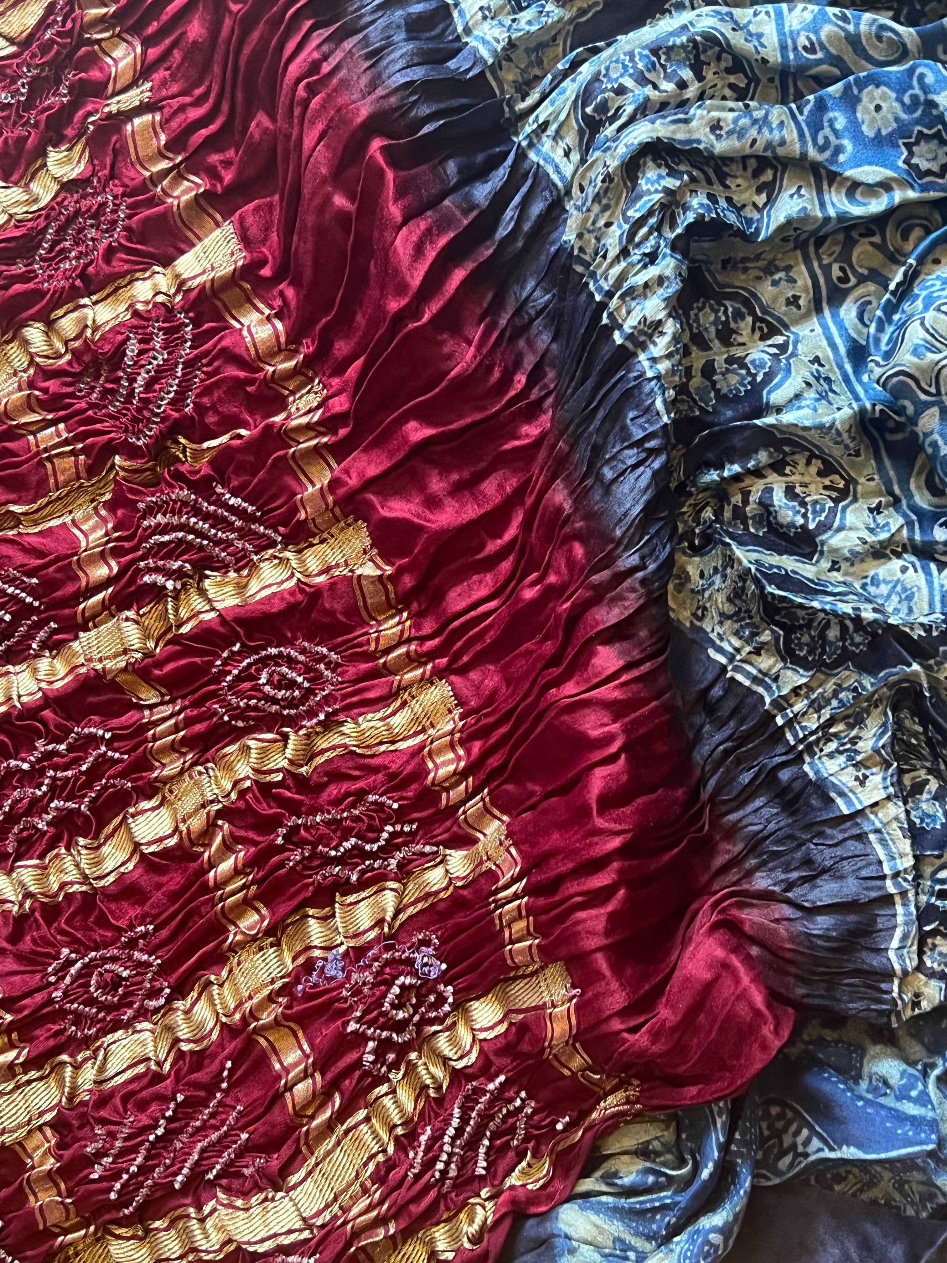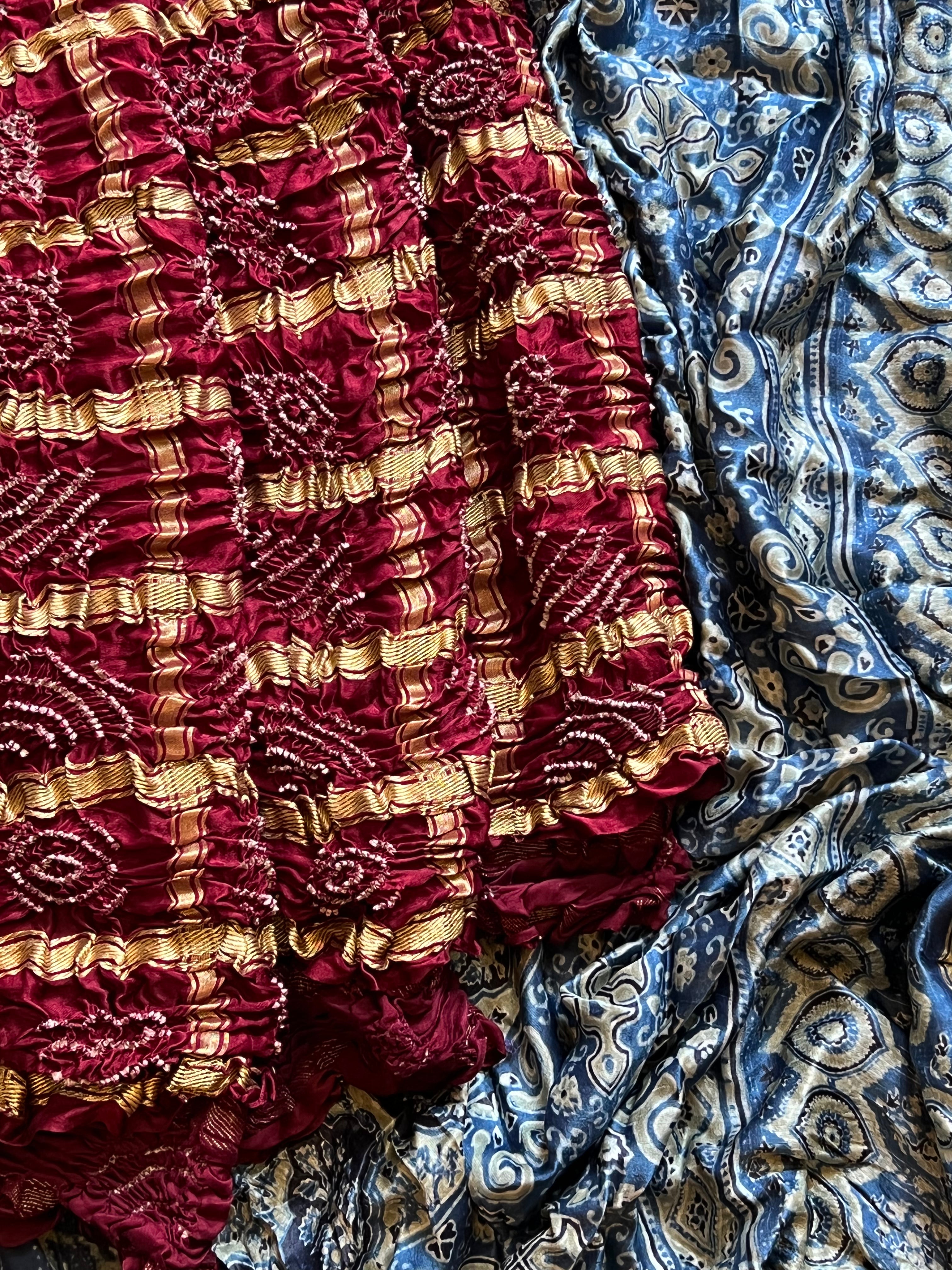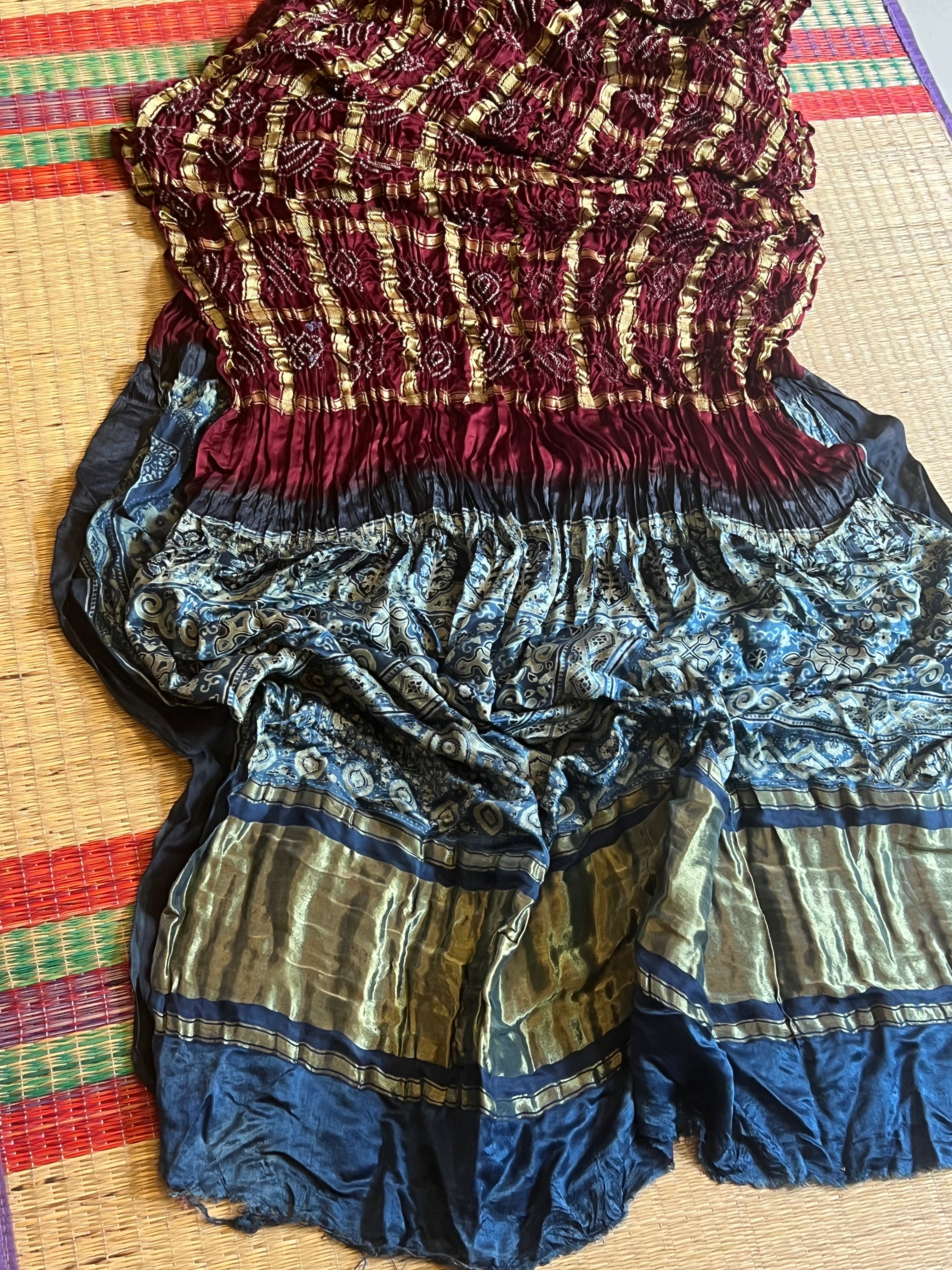 Bodydeep wine gharchola with handknotted bandhini with ajrakh palla and blouse ( note : ajrakh is handblocked )