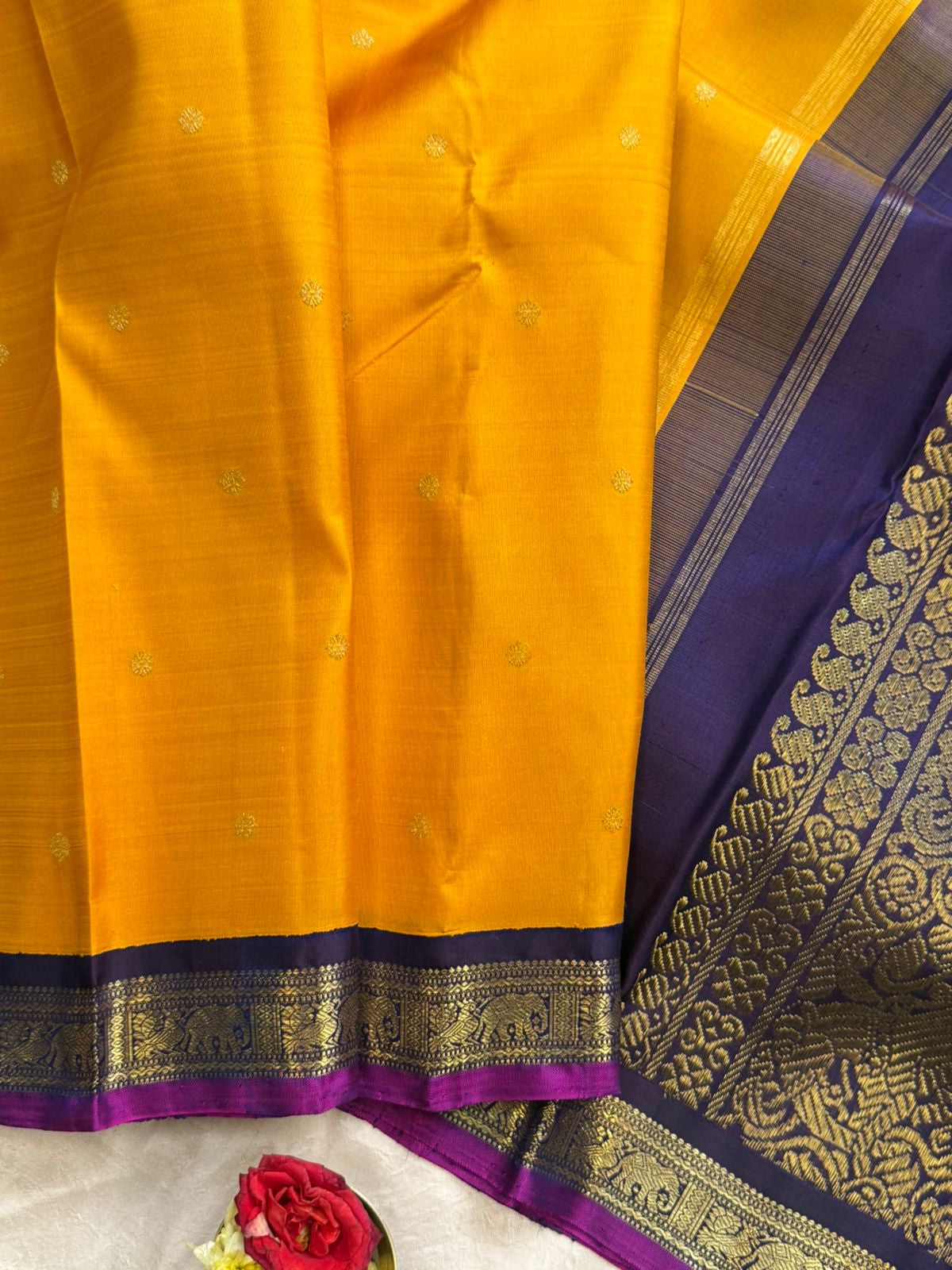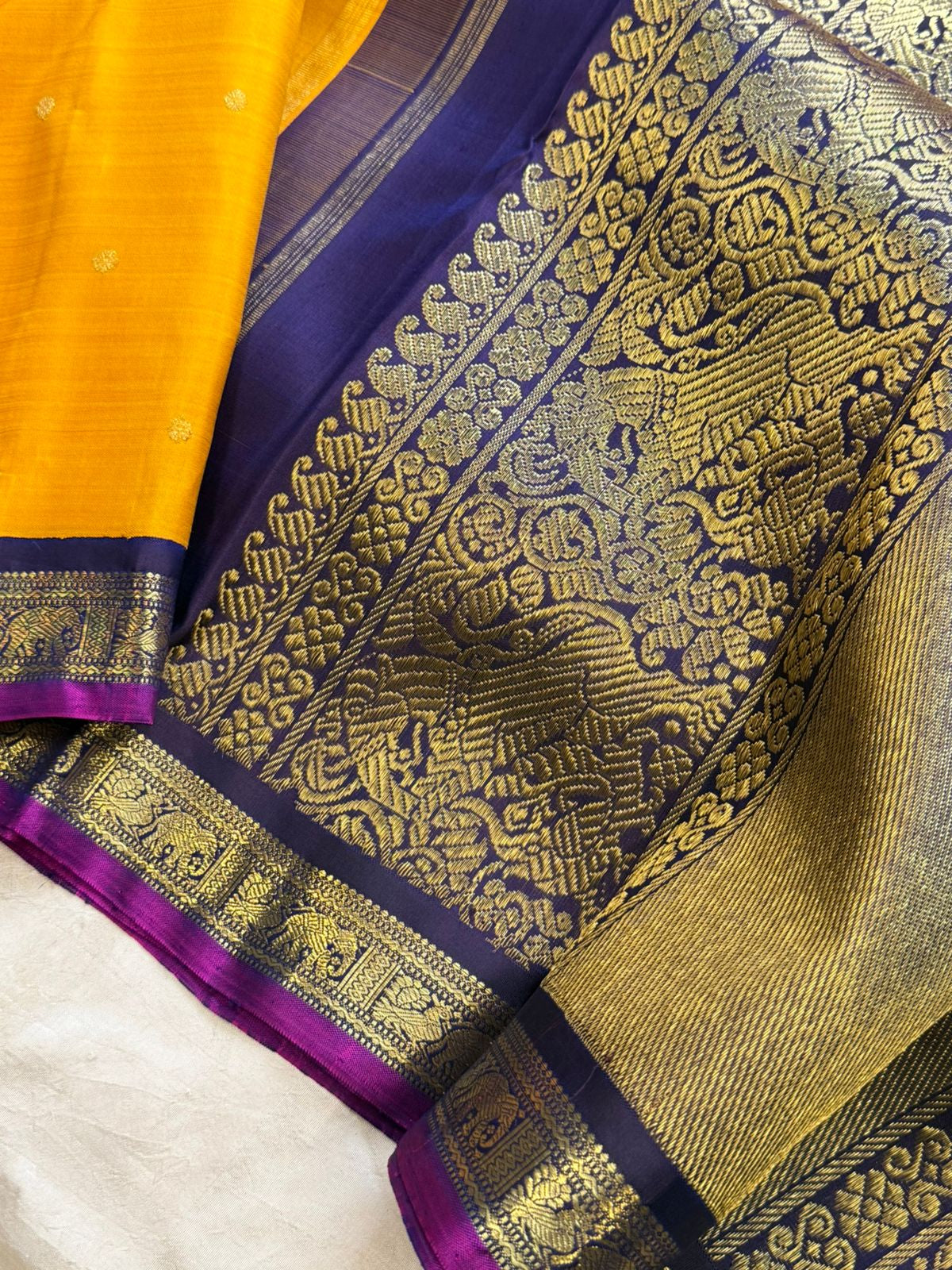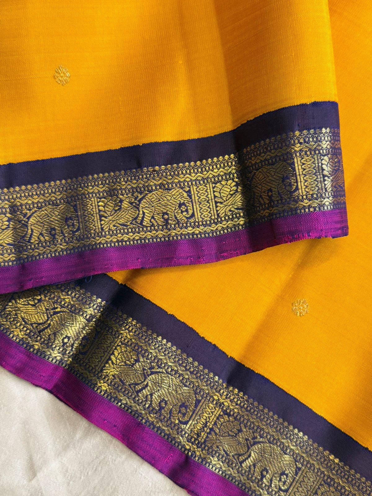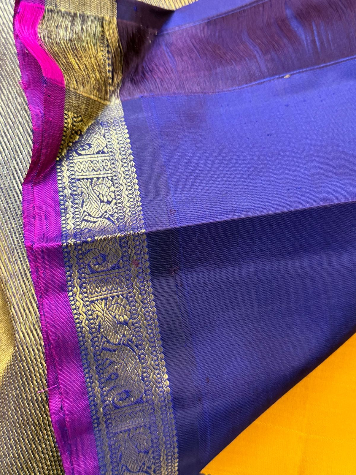 Golden yellow and dark blue (yaanai and annam) border kai korvai/ kanjipuram silk