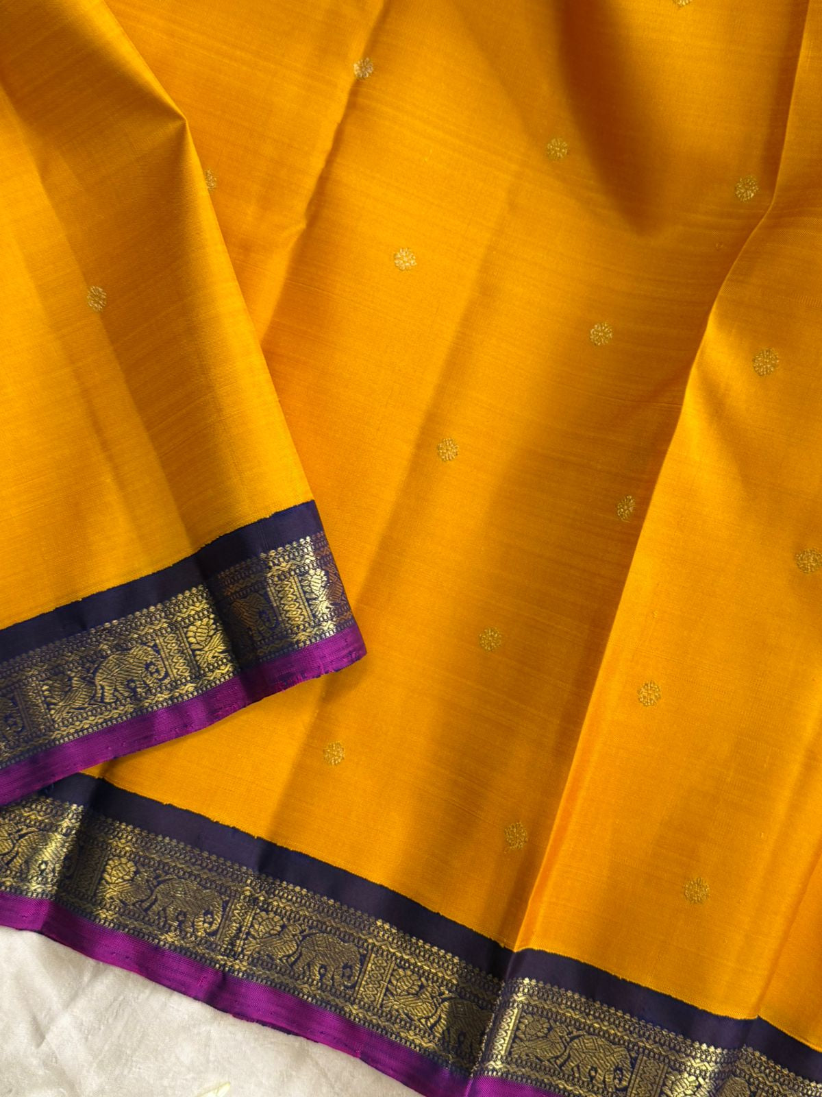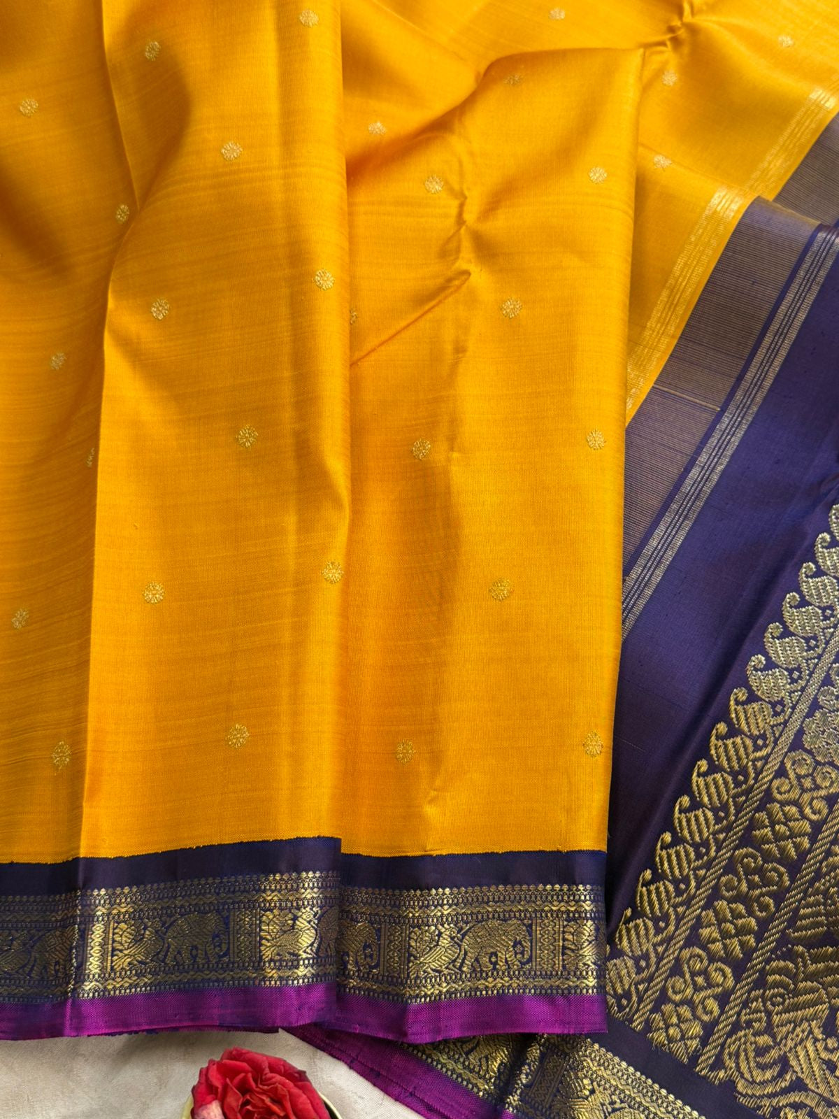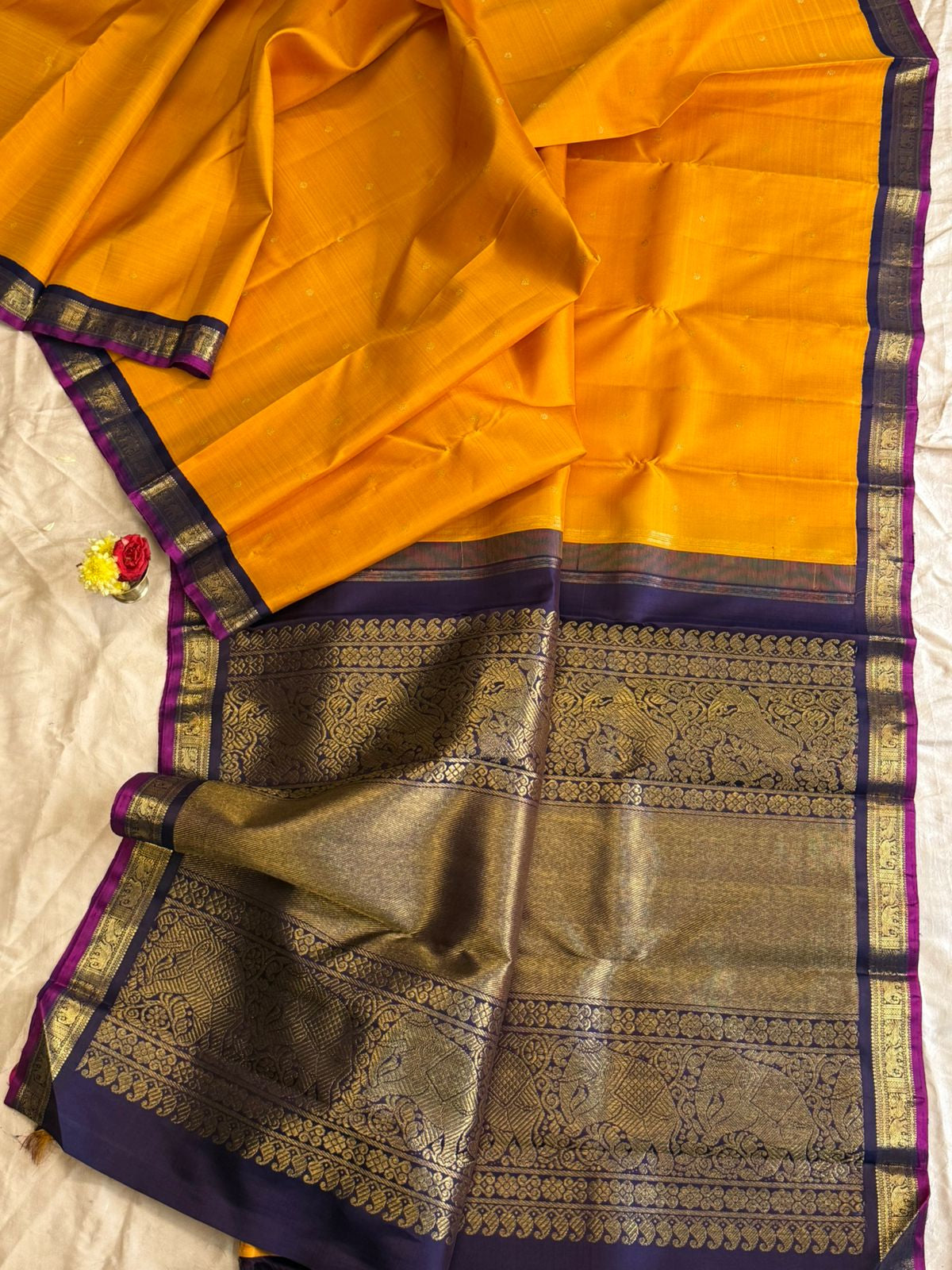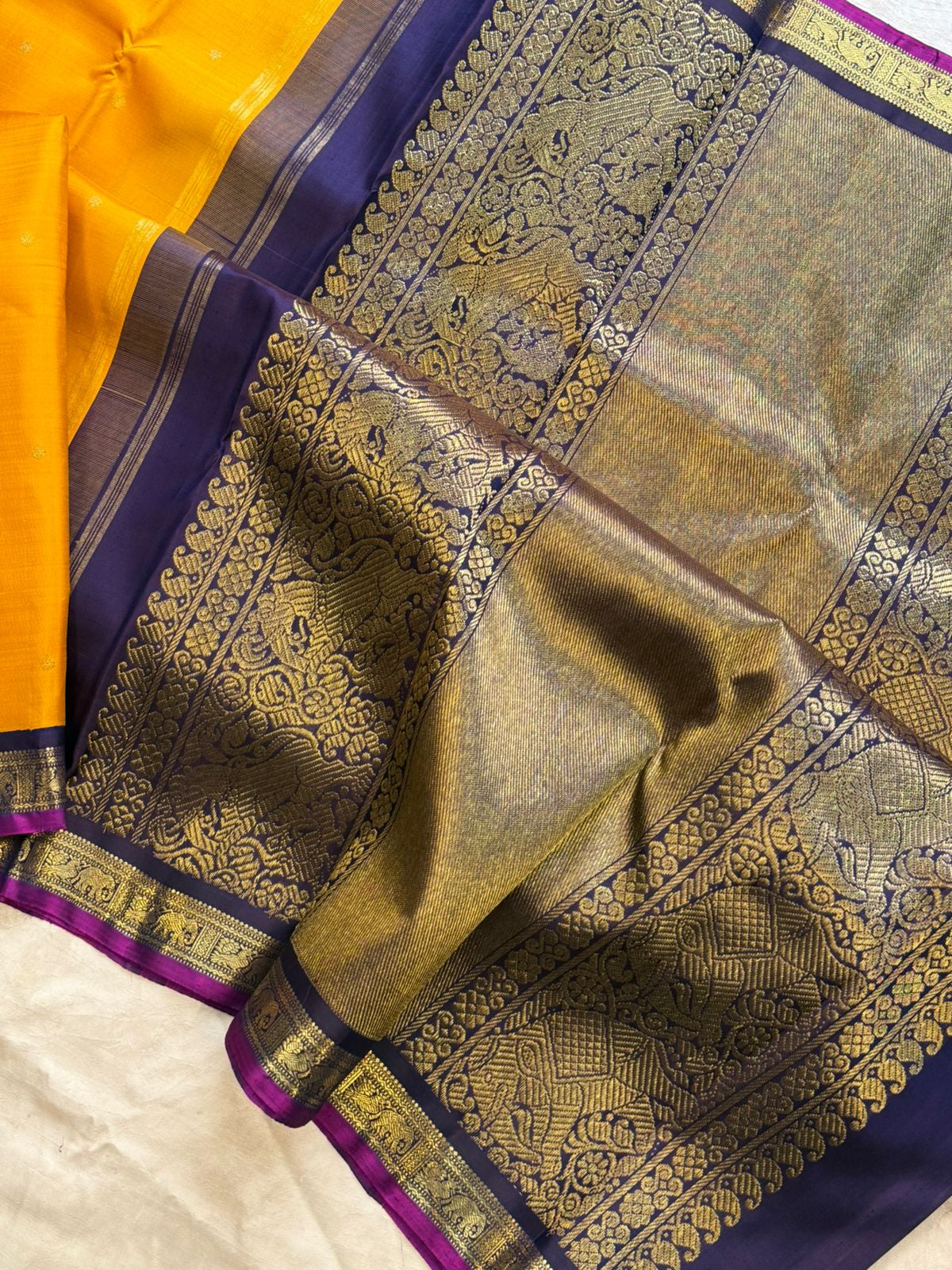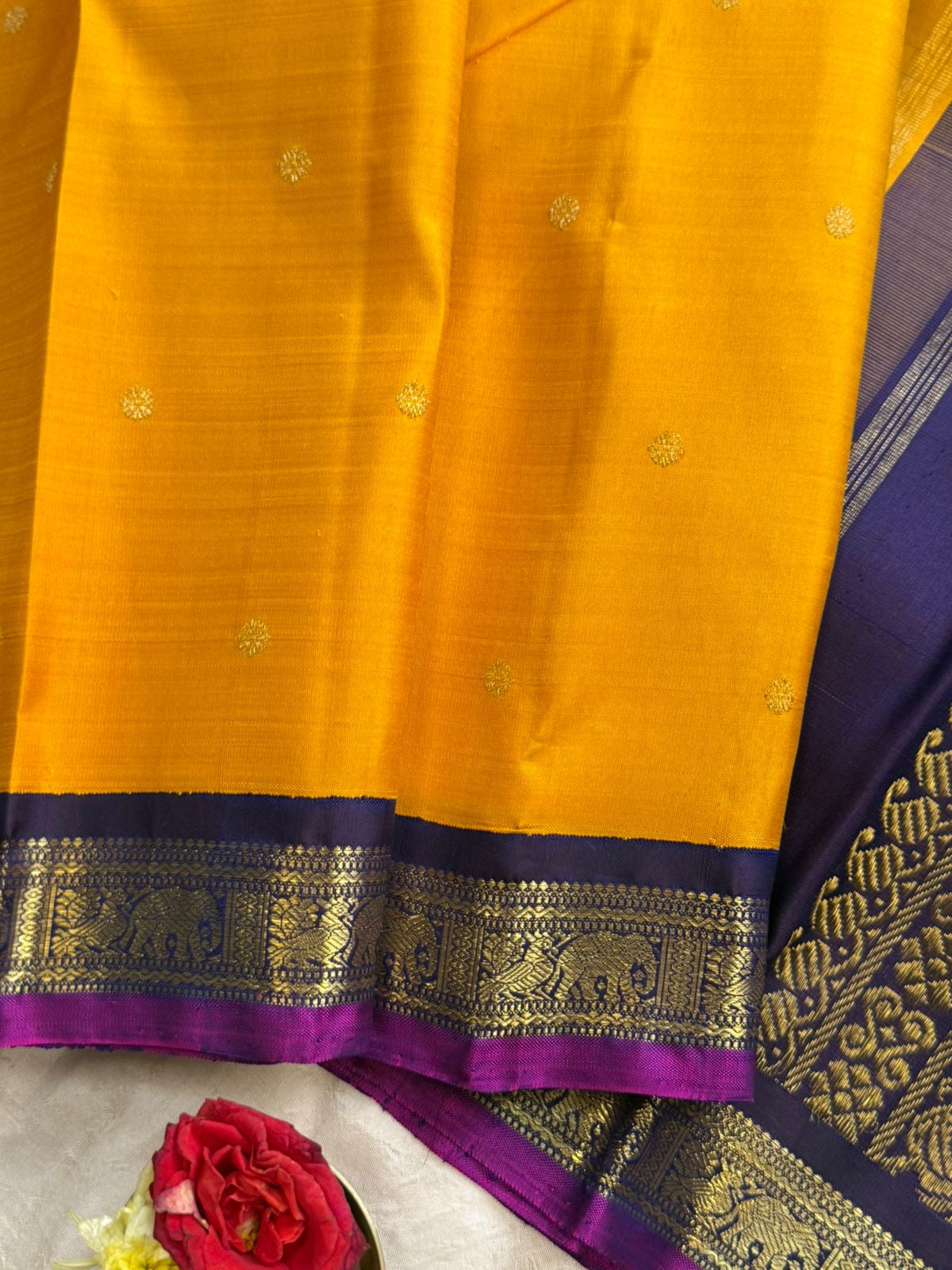 Golden yellow and dark blue (yaanai and annam) border kai korvai/ kanjipuram silk