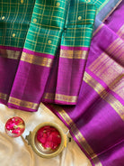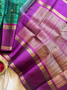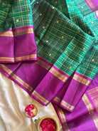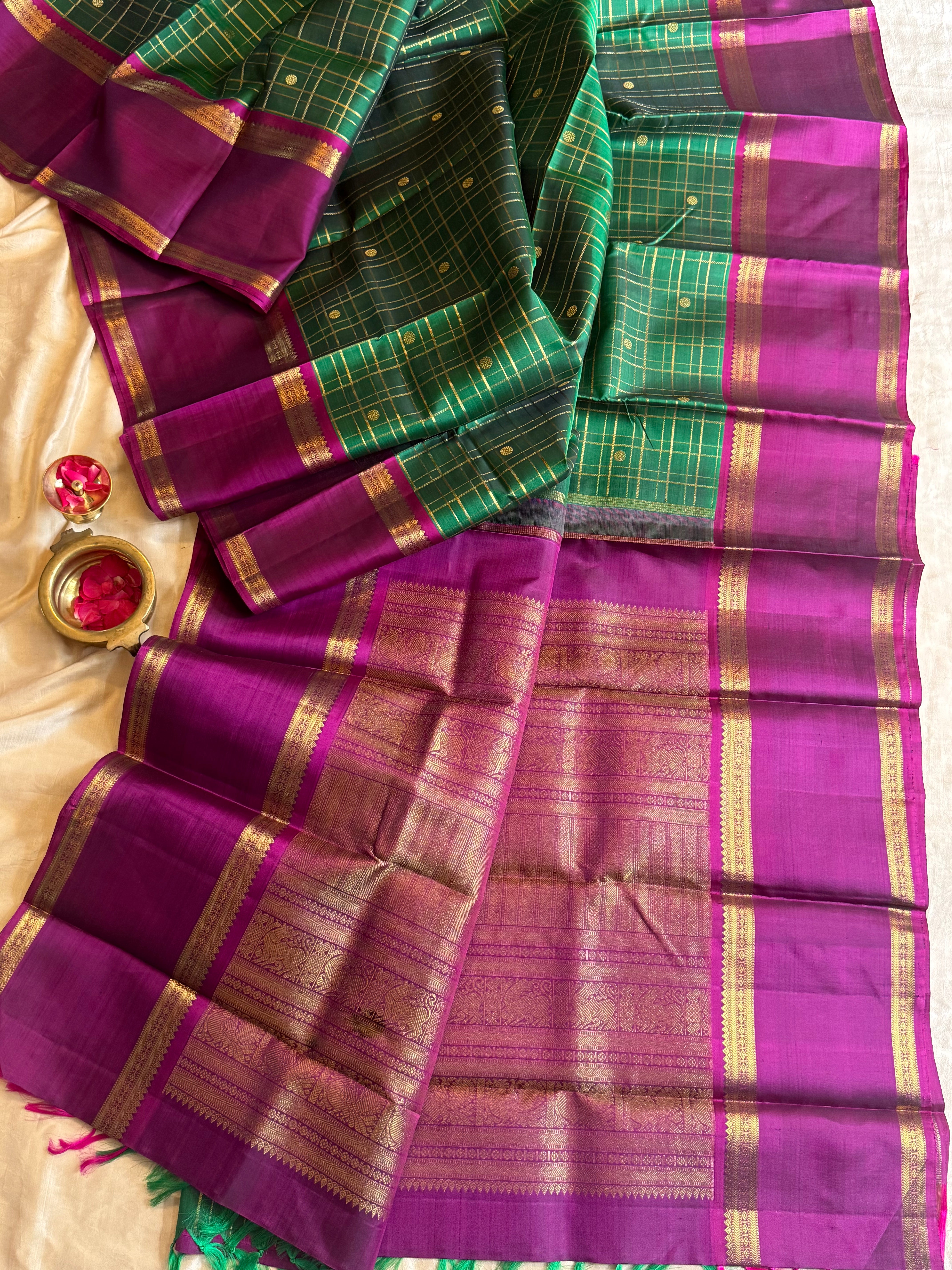 The body is dark green color with retta Zari Kattam with Kamalam Butta and pink retta pet and dense pure Zari Palla and blouse