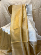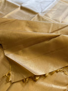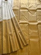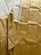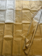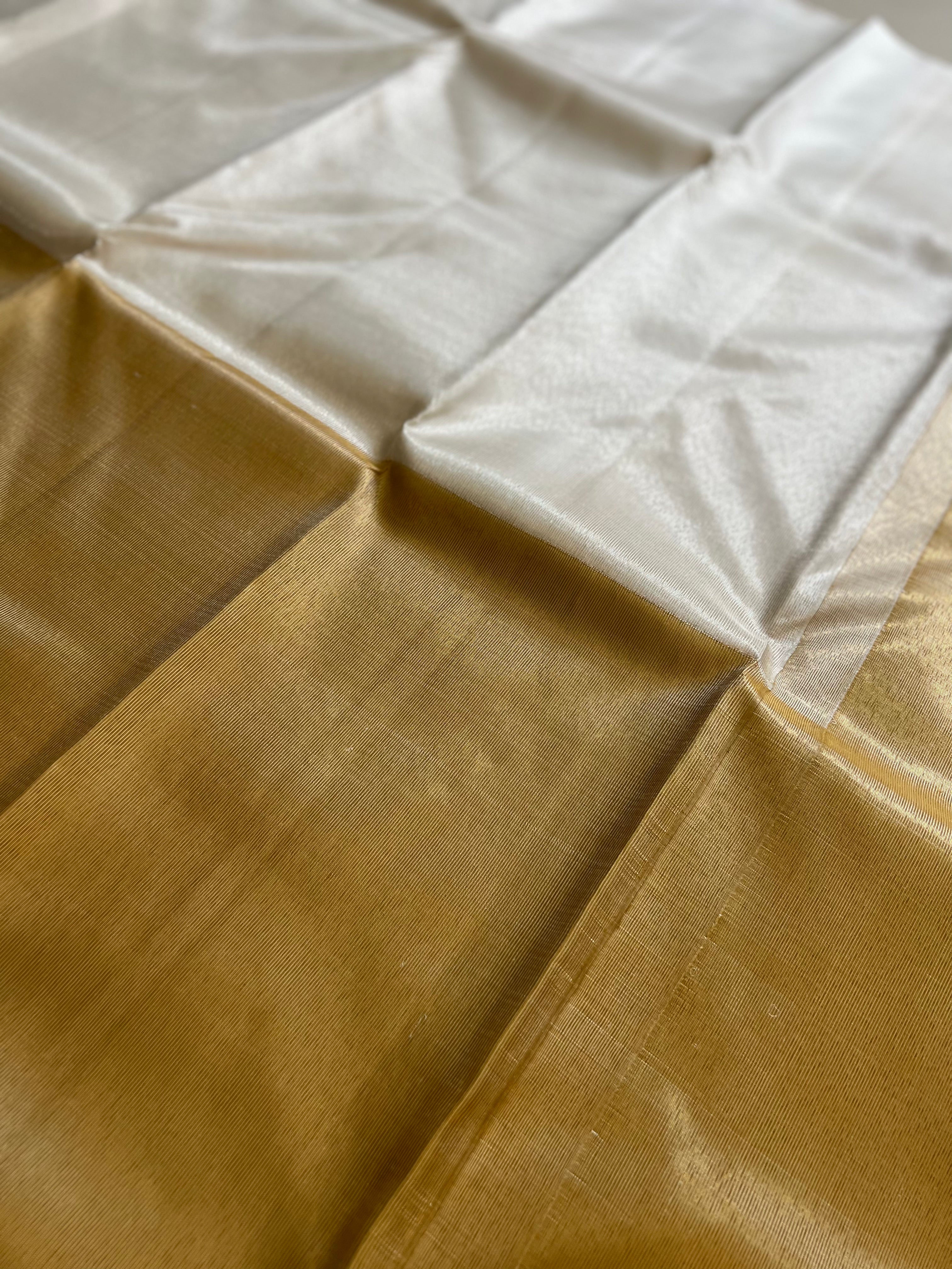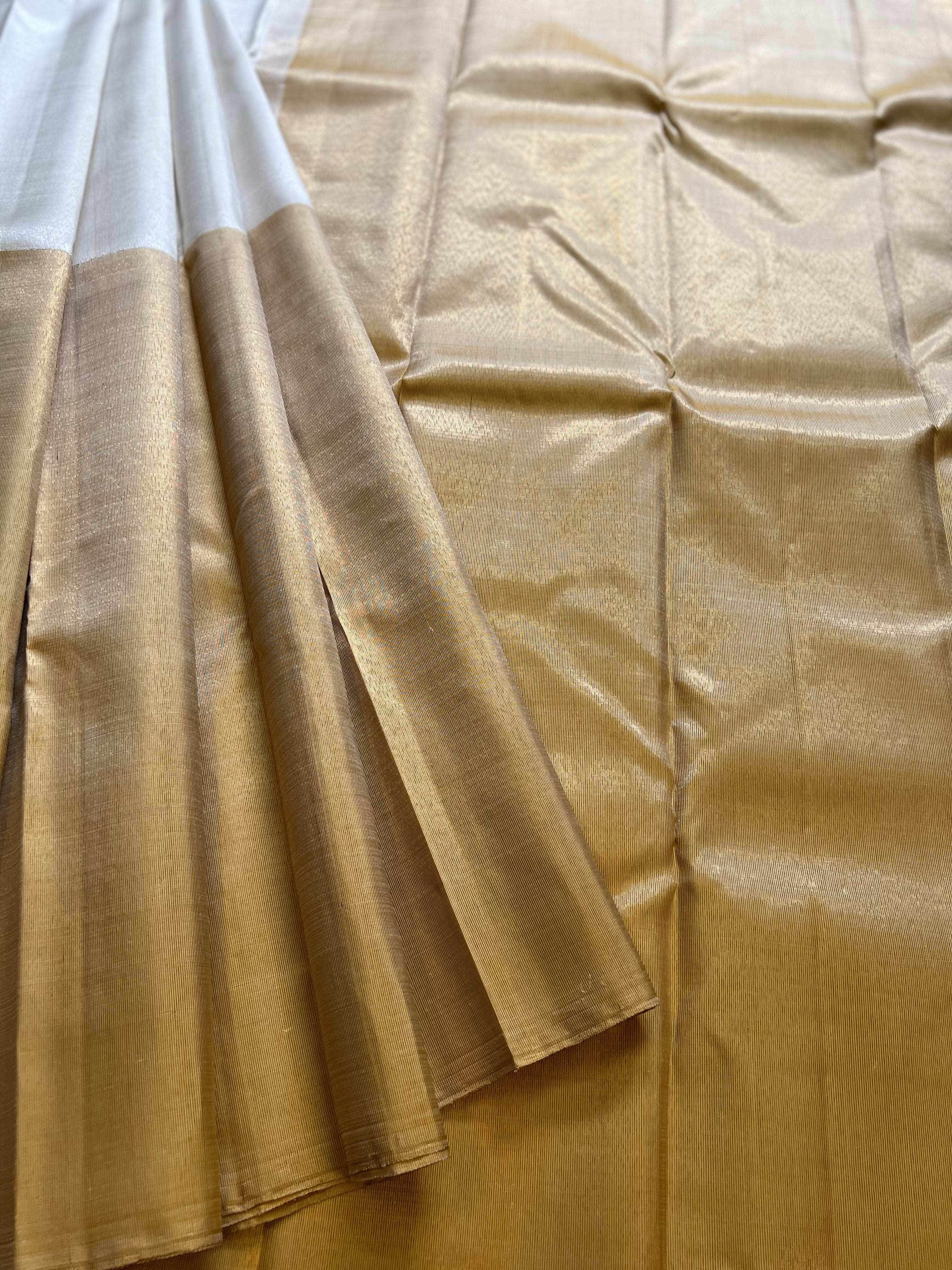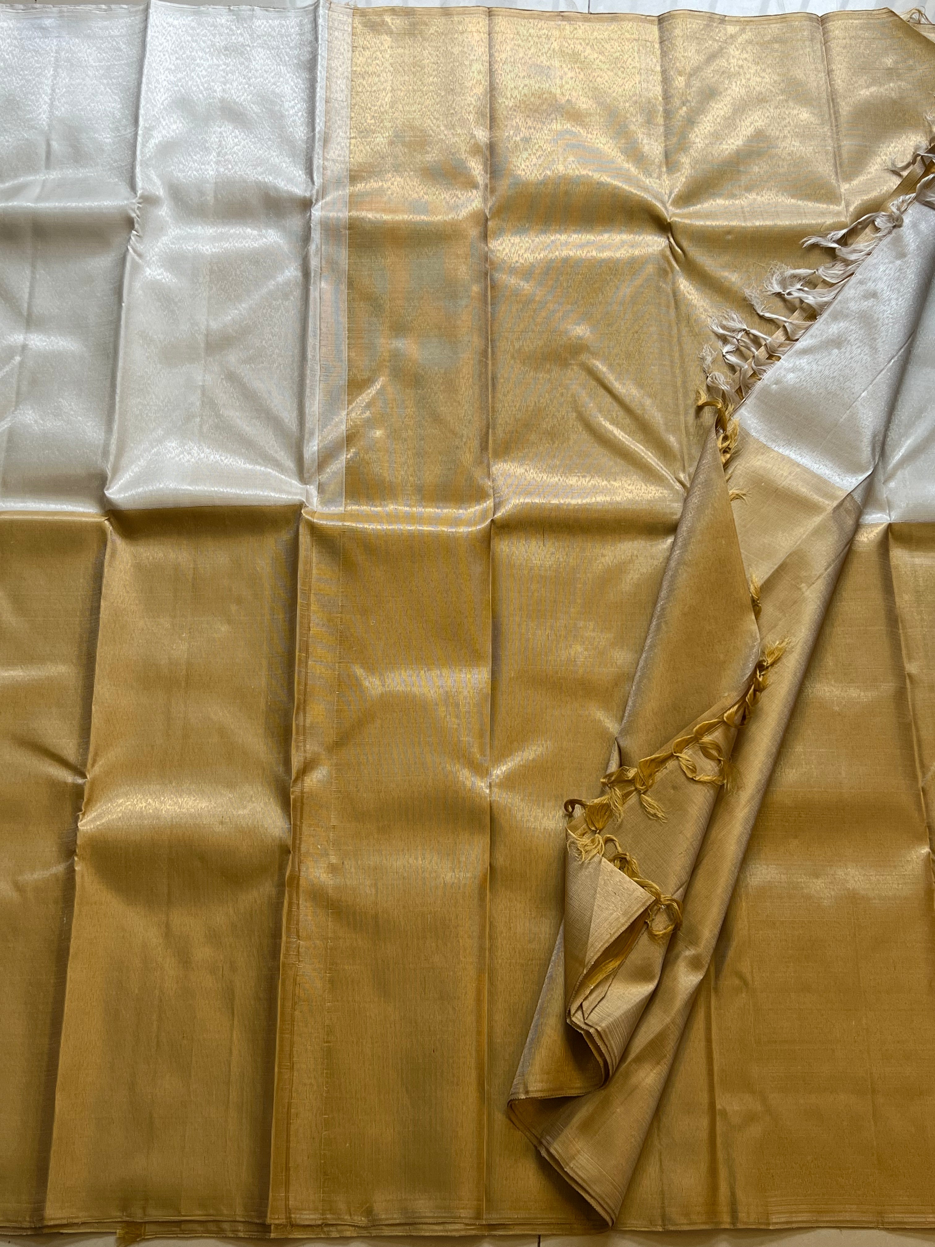 Such a gorgeous contemporary saree with half and half tissue work korvai , the top is a silver tissue and bottom is golden tissue with palla fully golden tissue