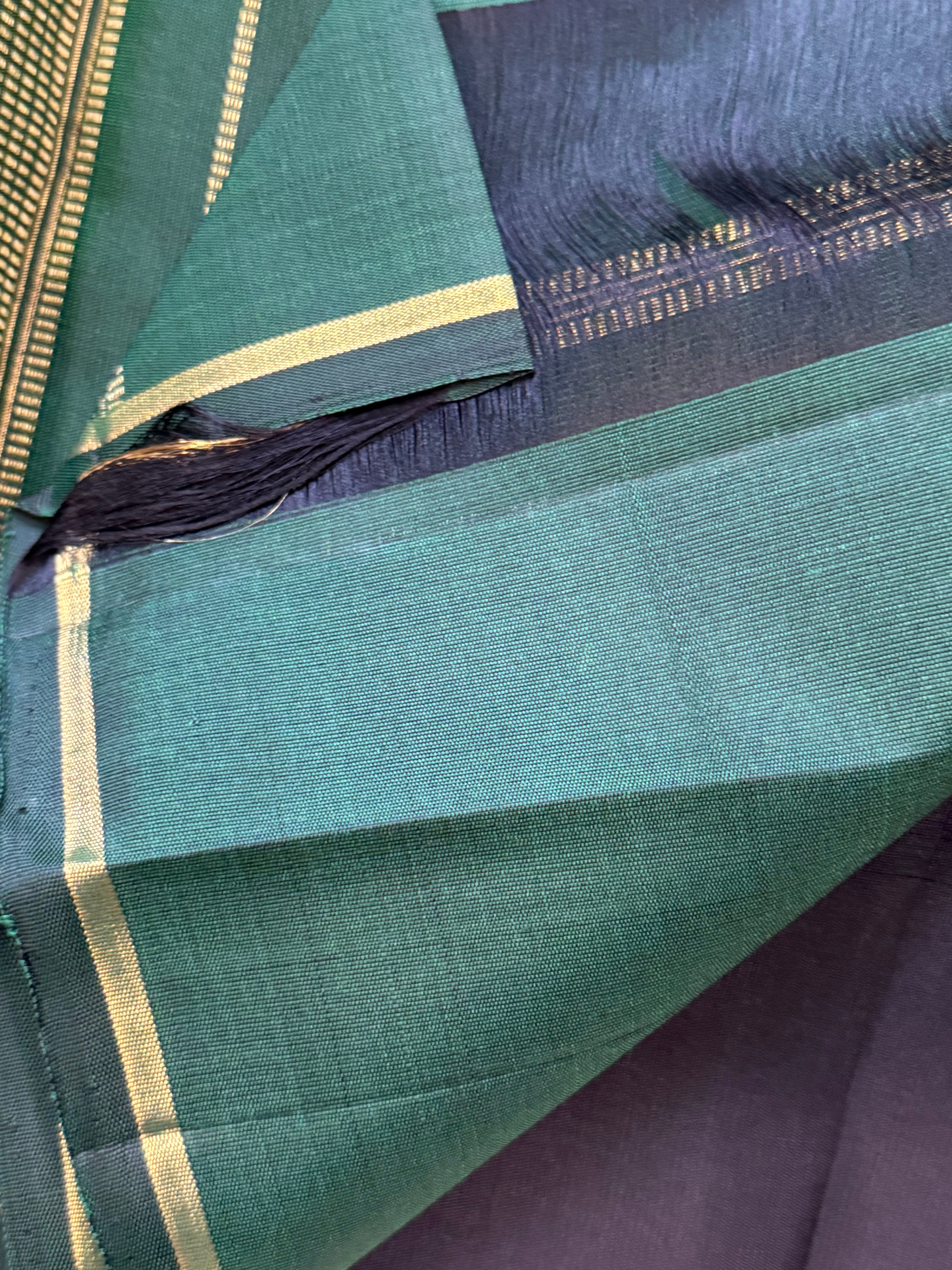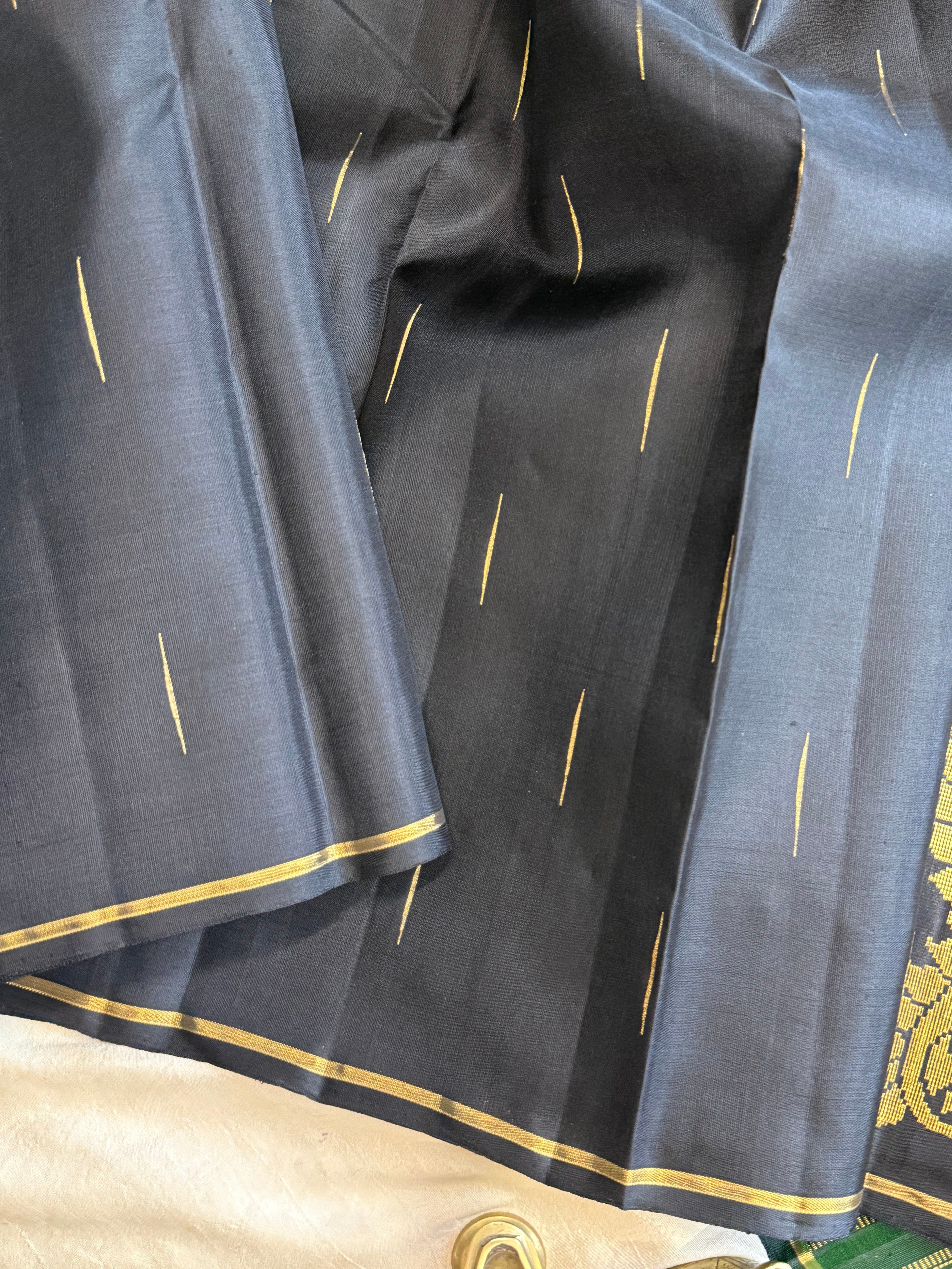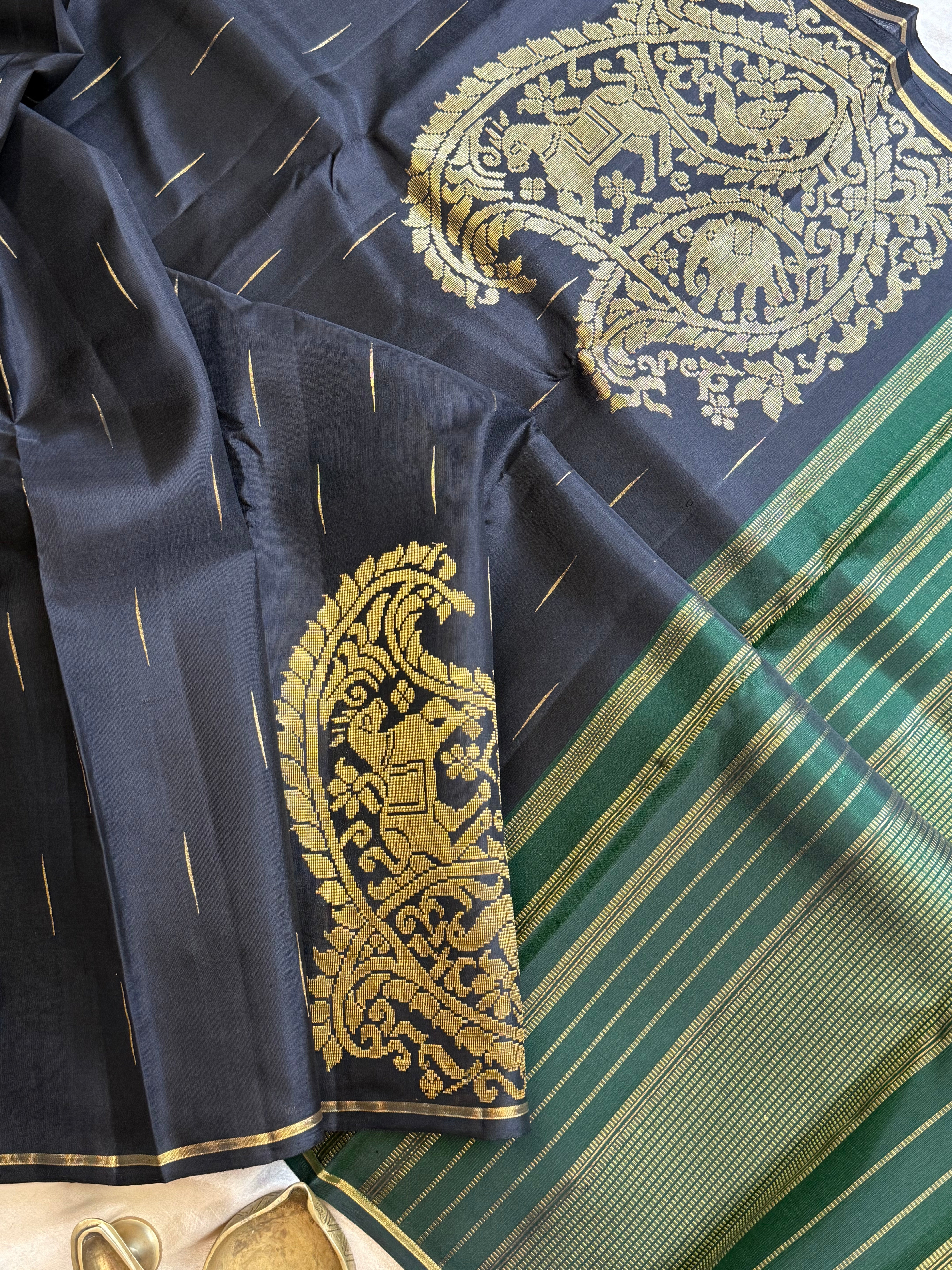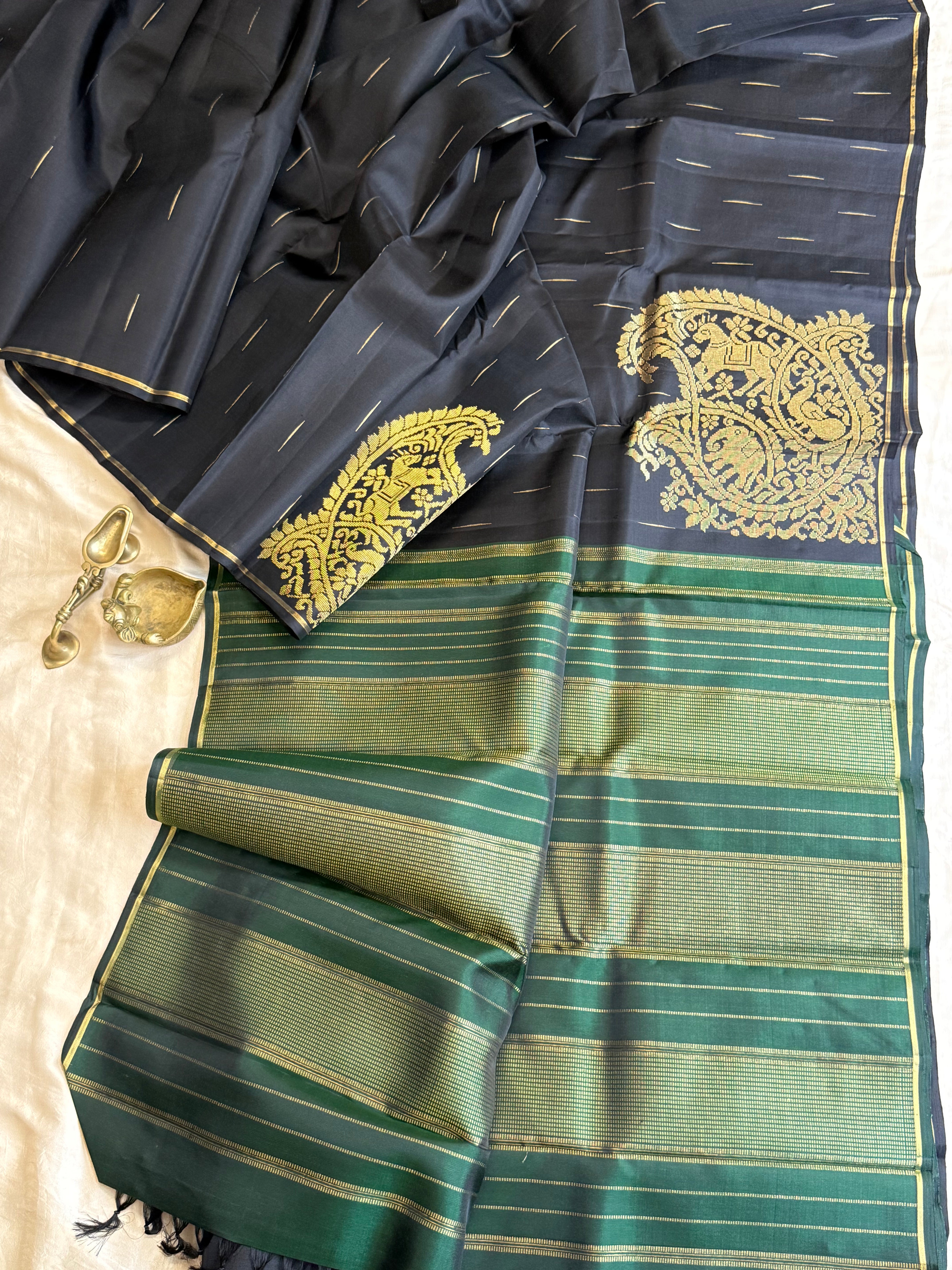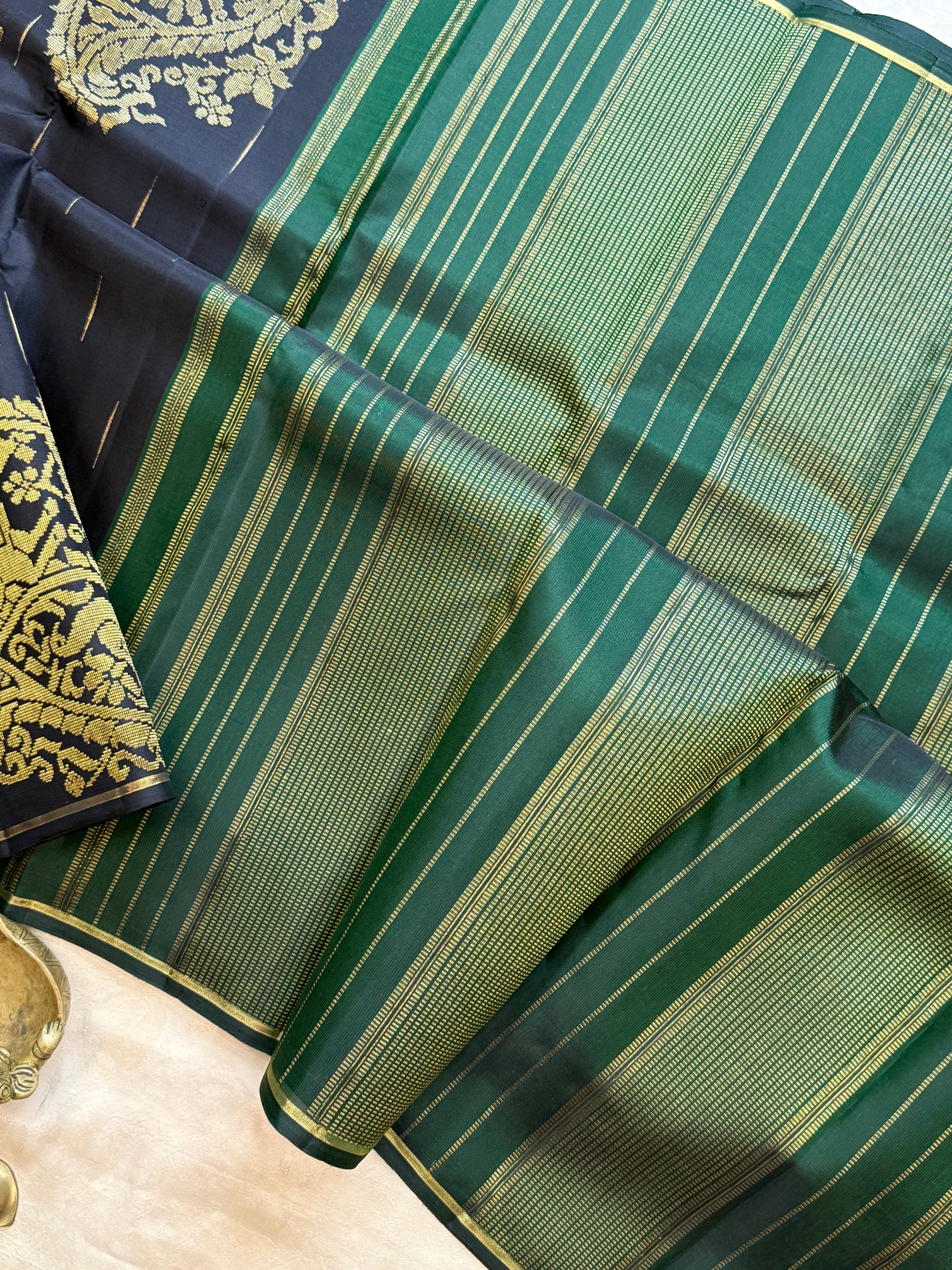 The saree is black color with malli Moggu in body and both sides have Vanasingaram corner Butta woven in Adai and green pure Zari Palla and blouse