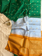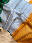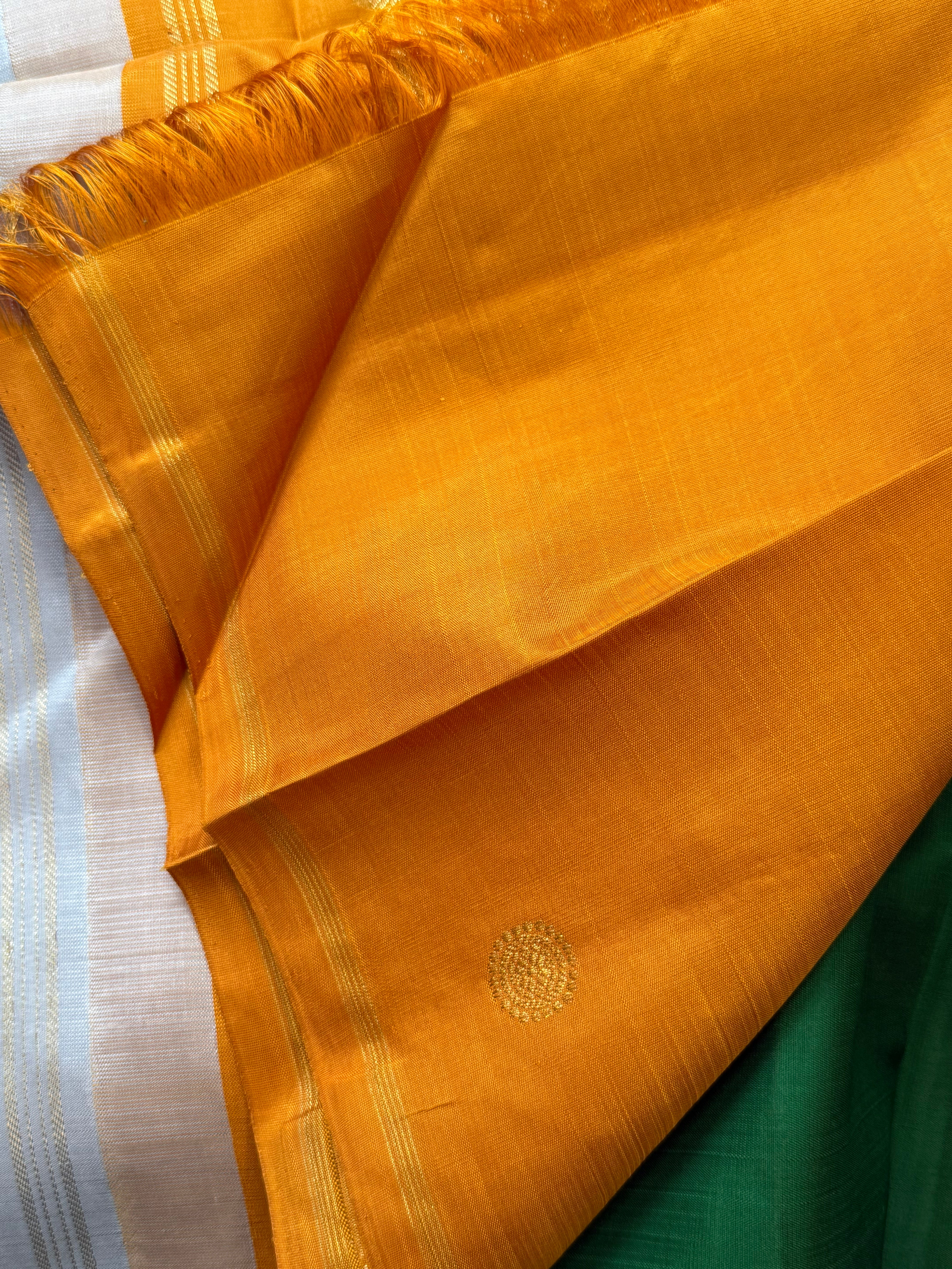 The saree is dark green colour with annam chakram Butta and the Palla is double Palla with grey and yellow Palla and blouse