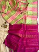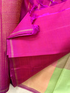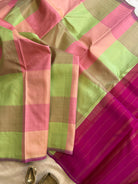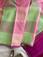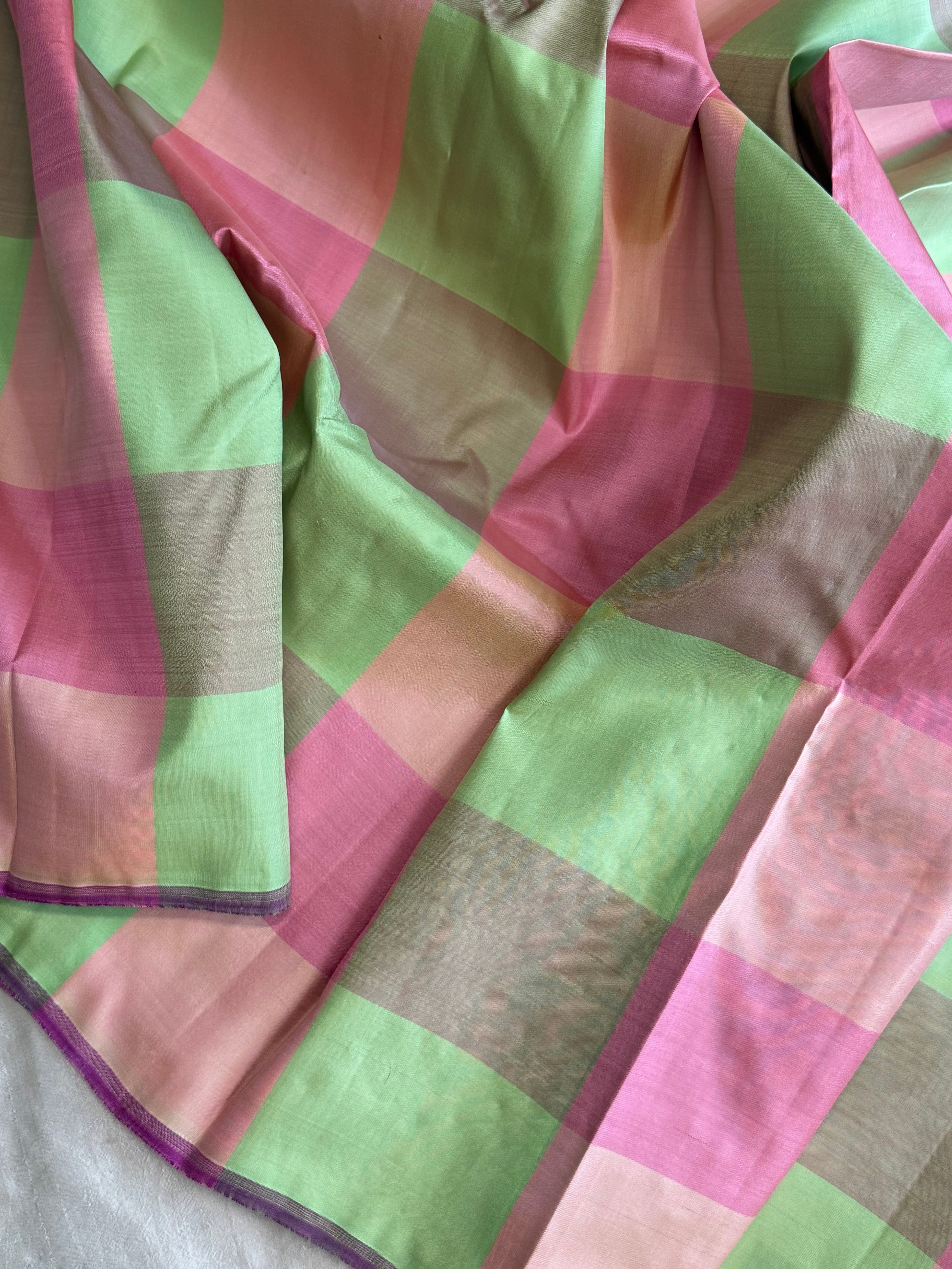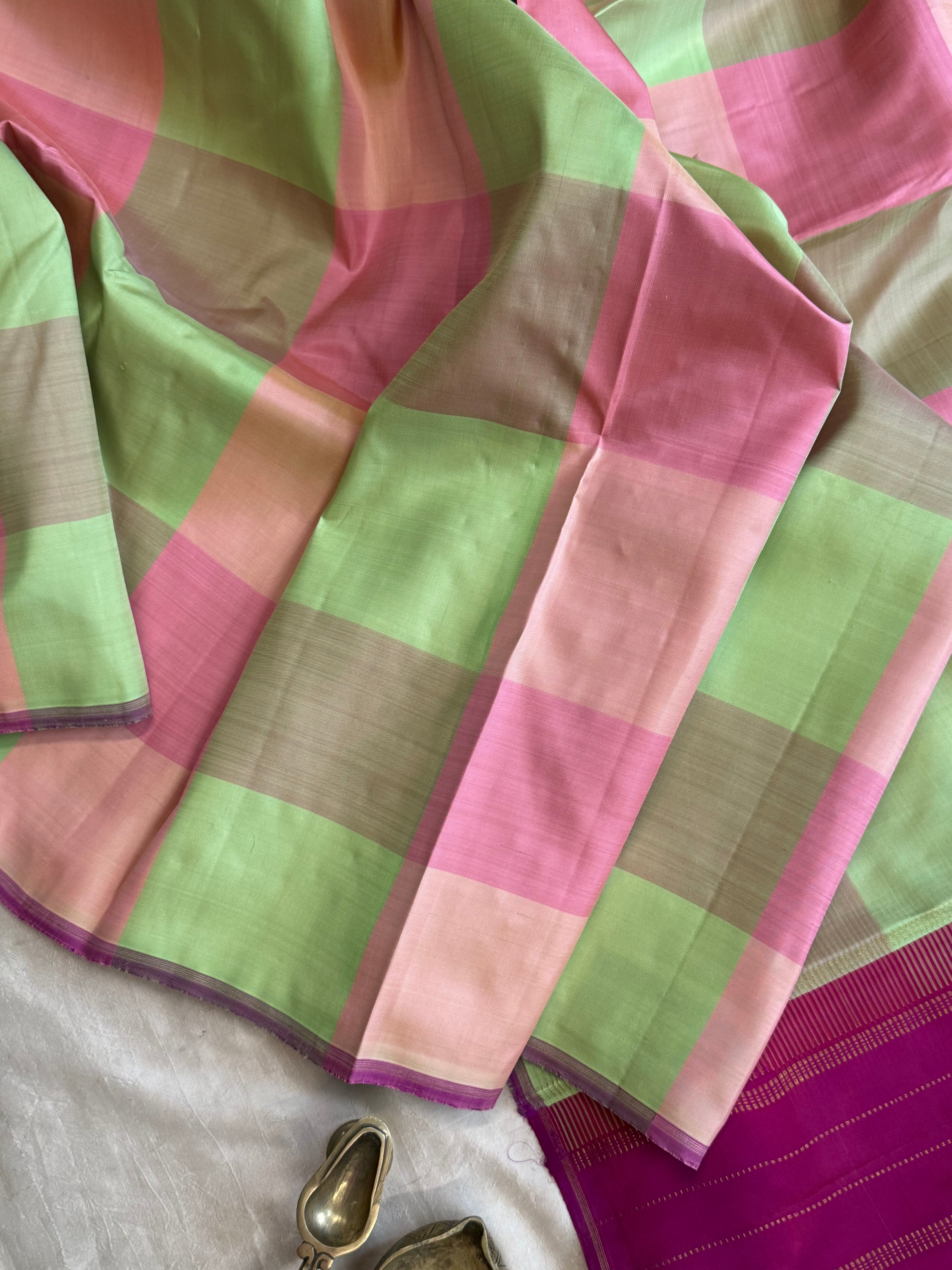 The saree is Paalum Pazhamum Kattam with green , pink checks and Rani pink Zari rekku Palla and blouse