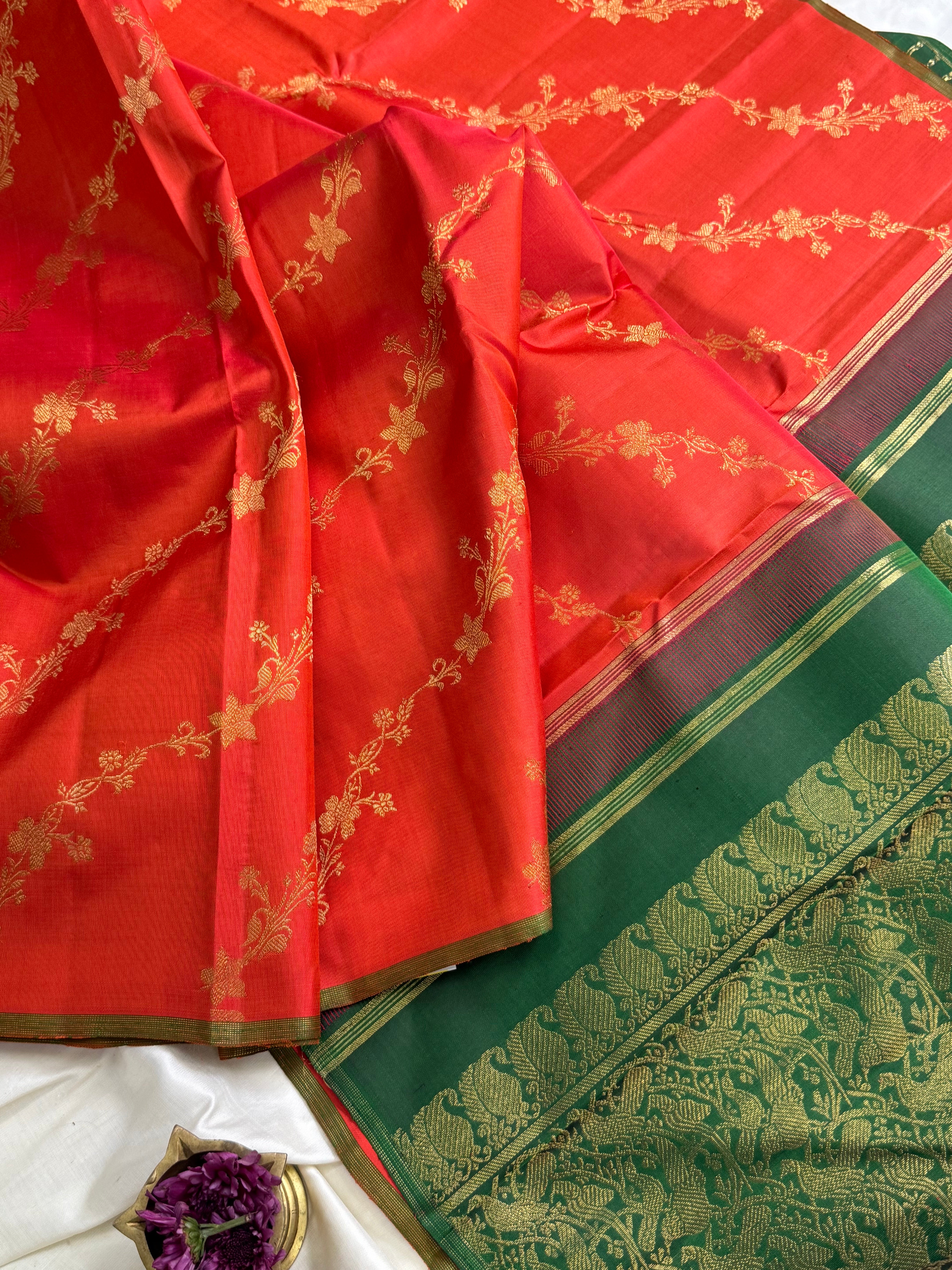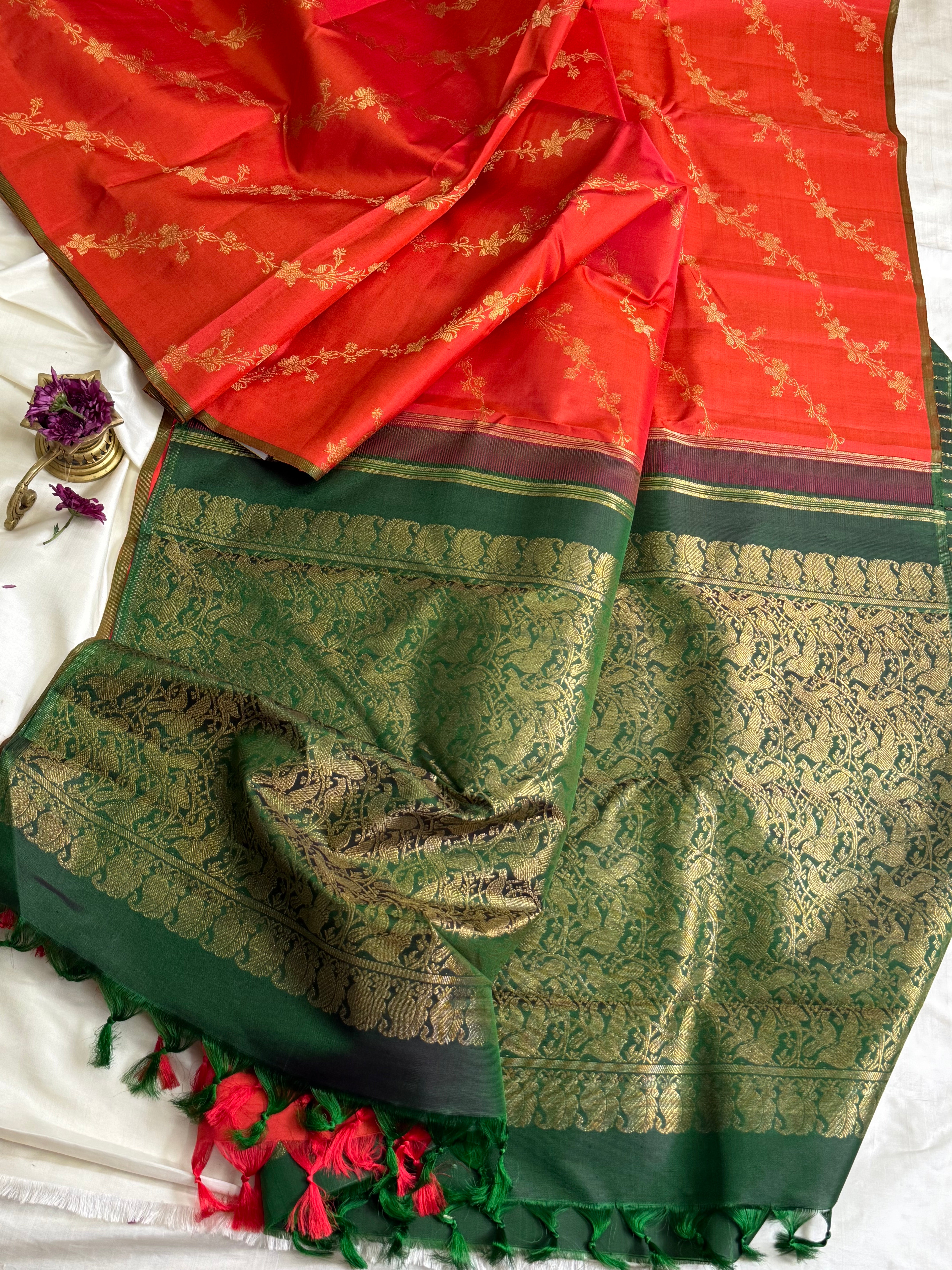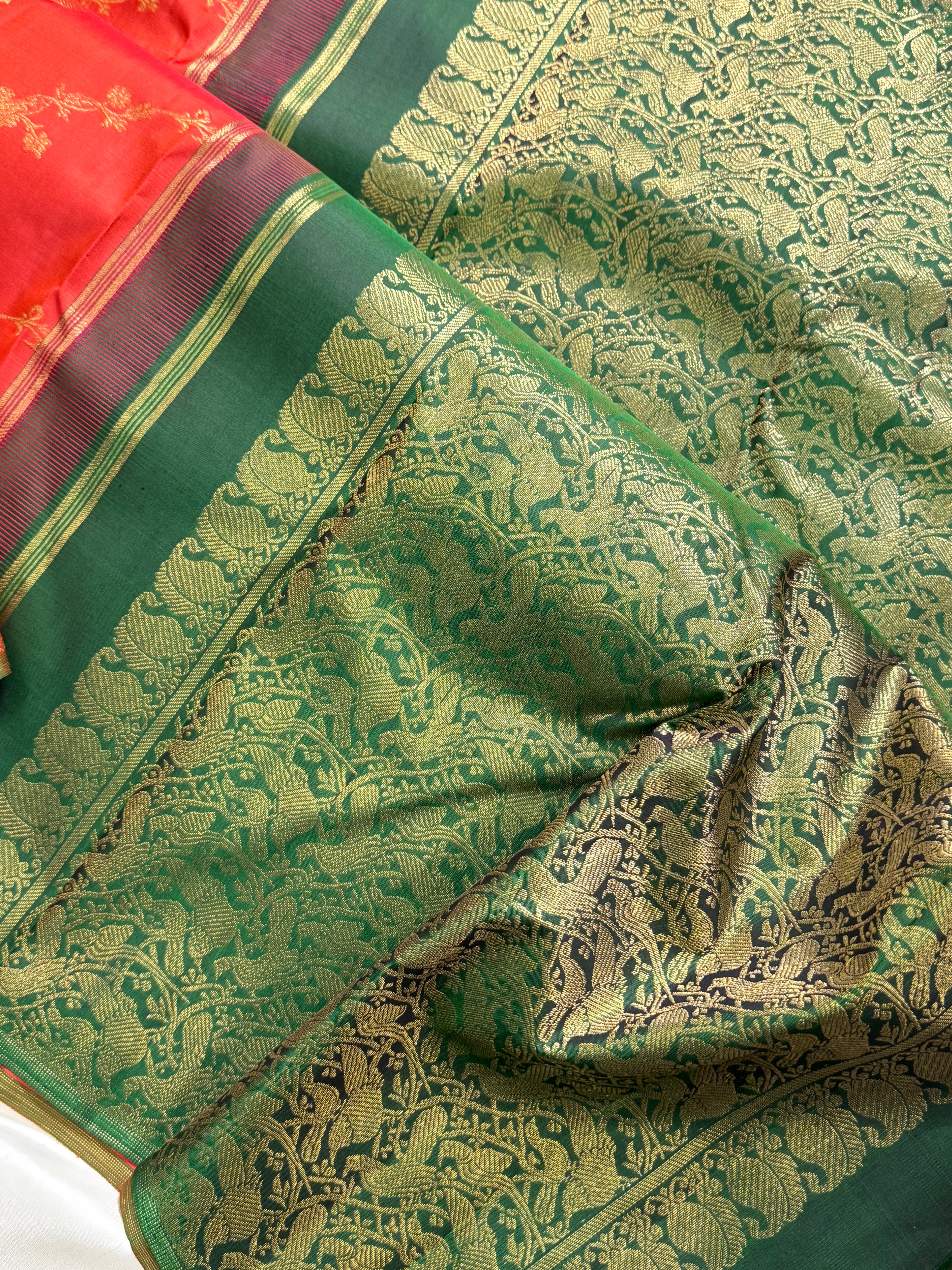 The body is rustic Ornage with pure zari Kodi around the body and the Palla is vanasingaram in pure zari and the Palla and blouse is in green color pure zari