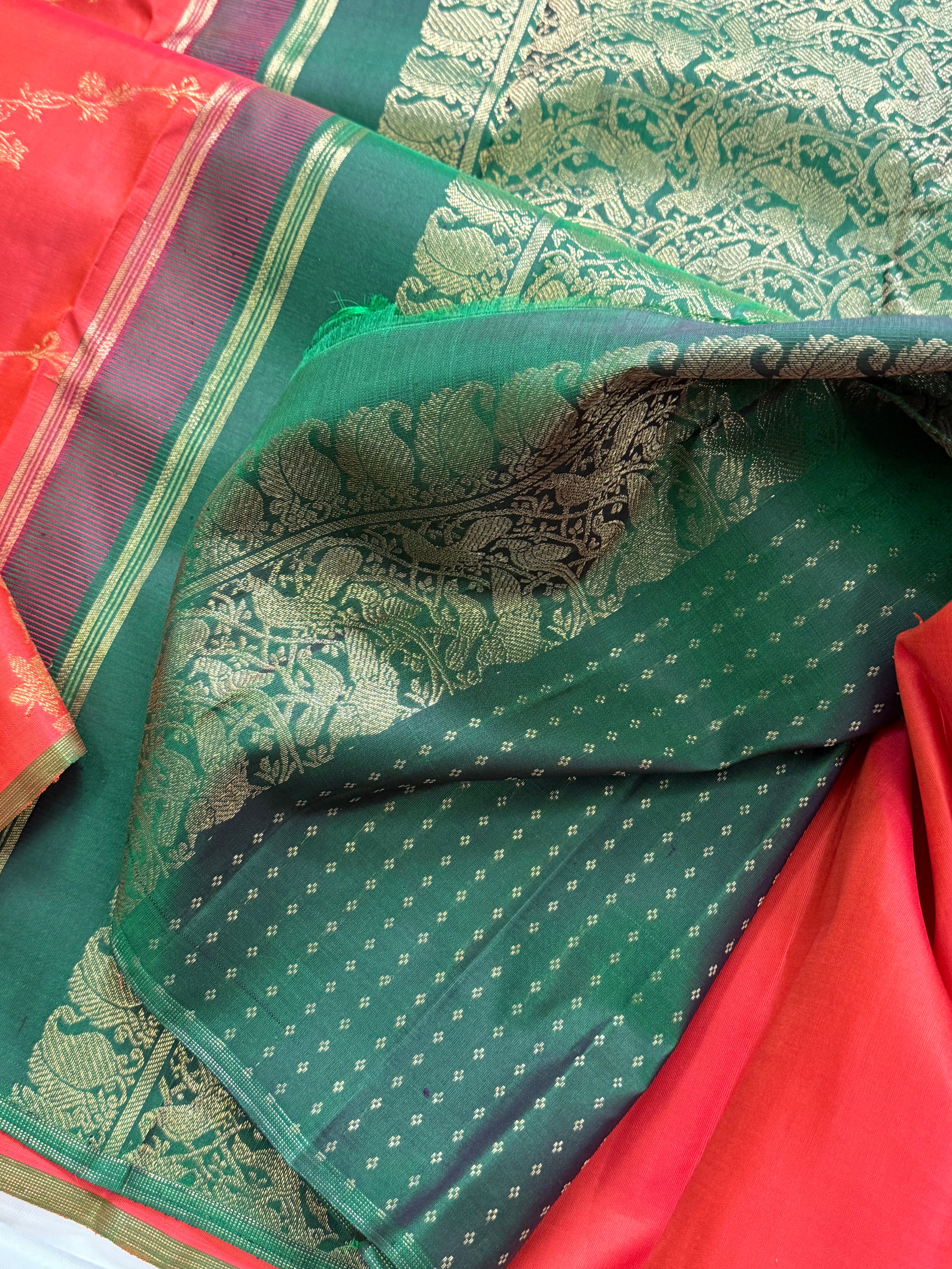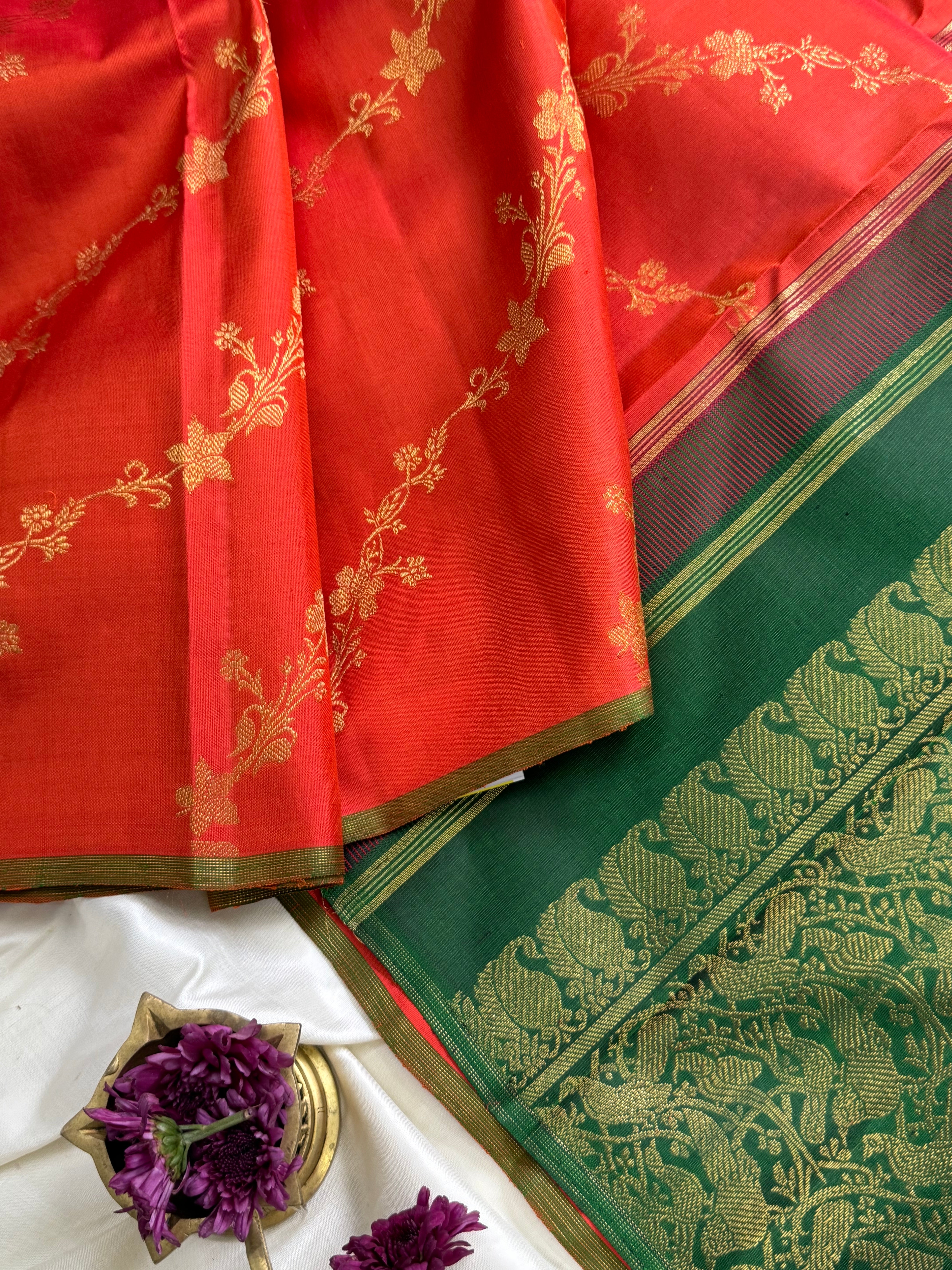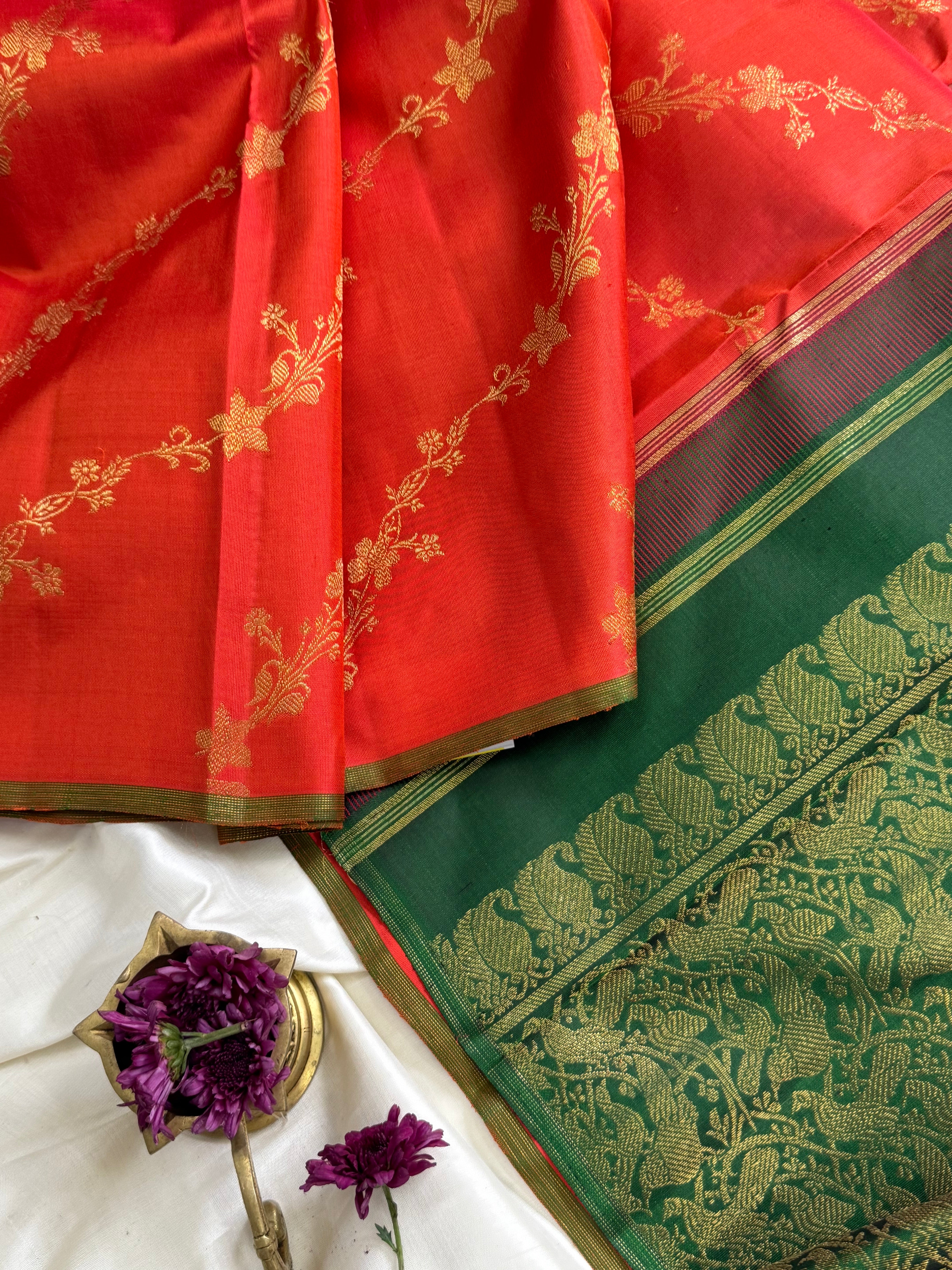The body is rustic Ornage with pure zari Kodi around the body and the Palla is vanasingaram in pure zari and the Palla and blouse is in green color pure zari