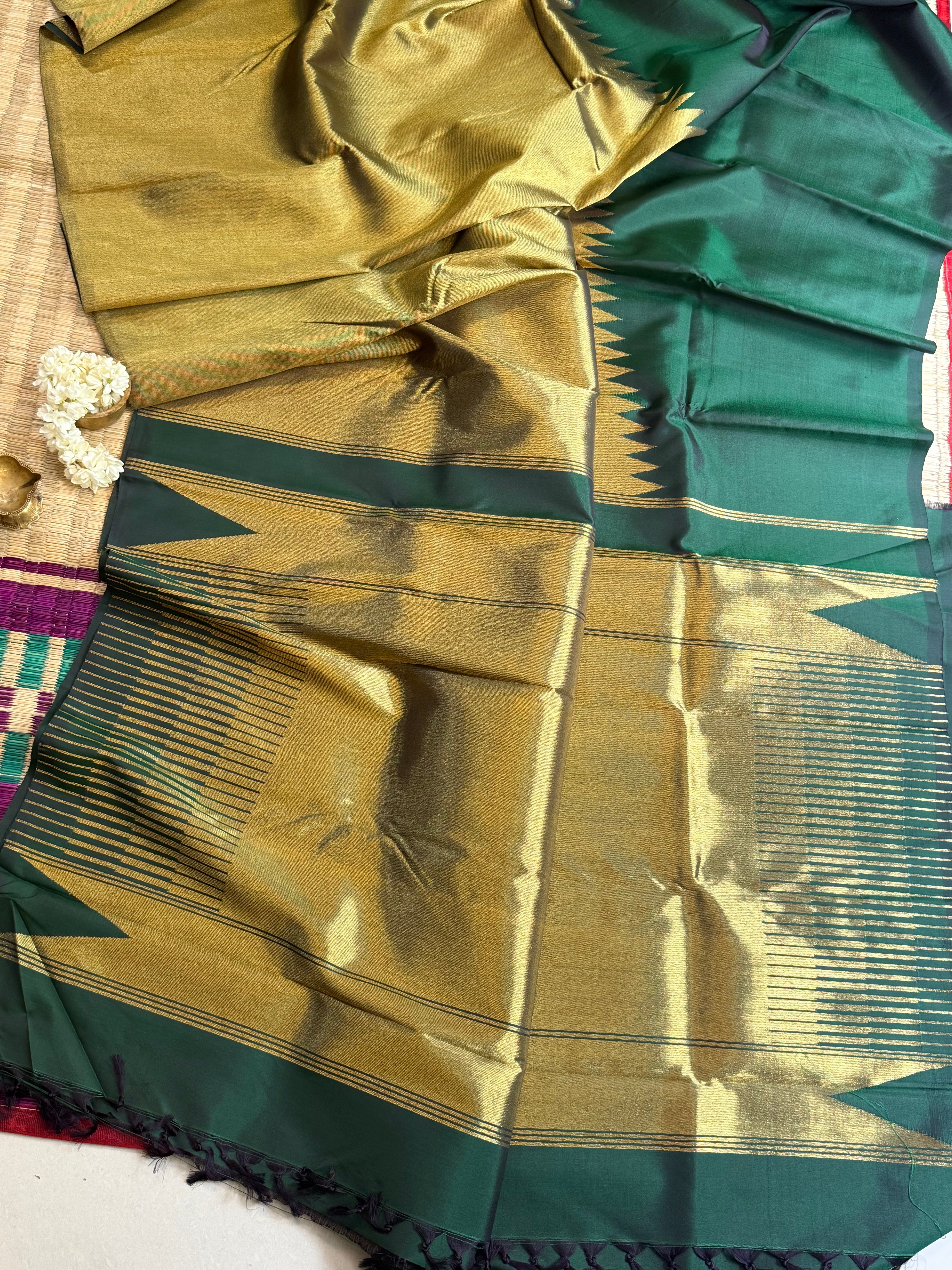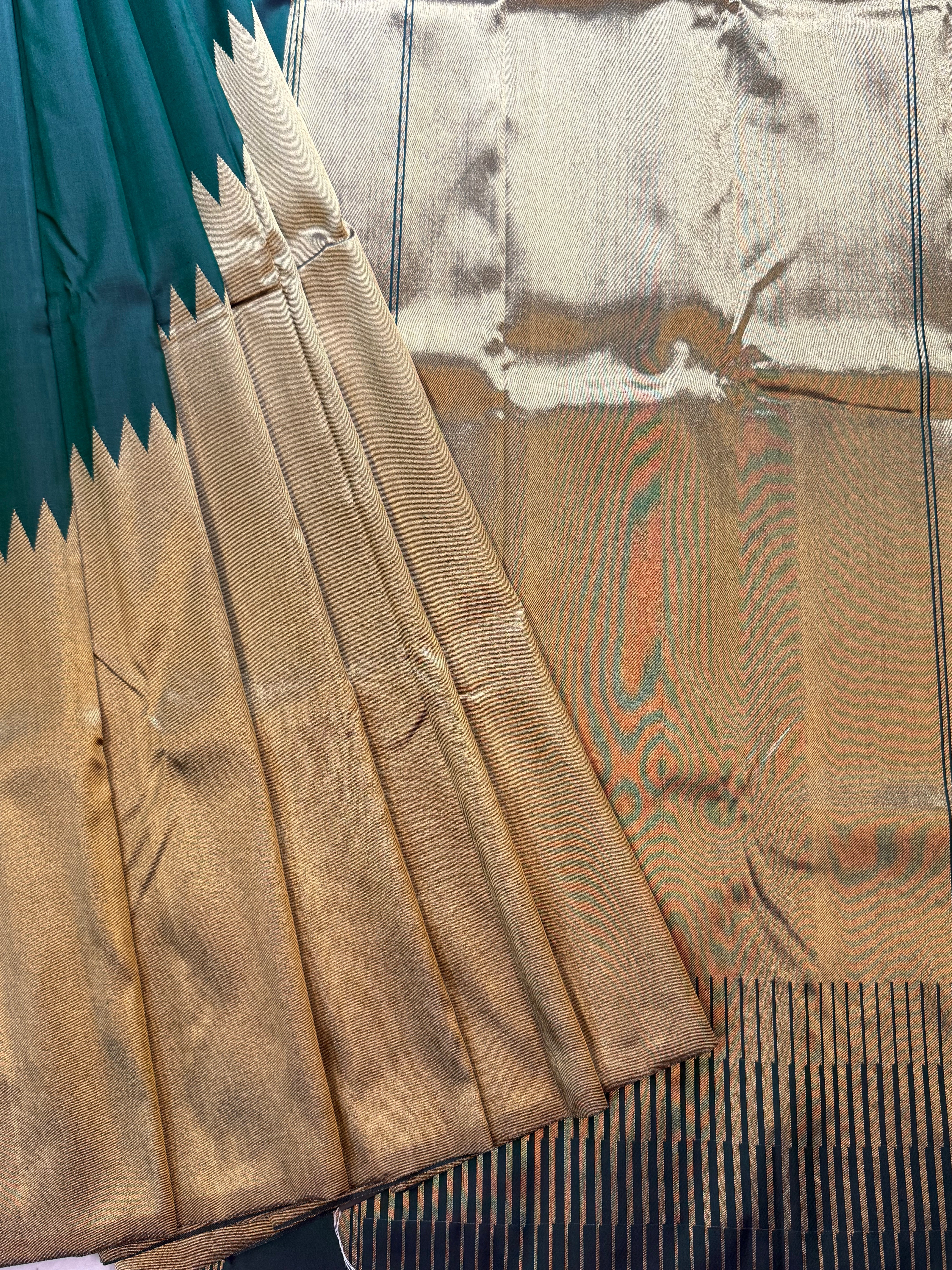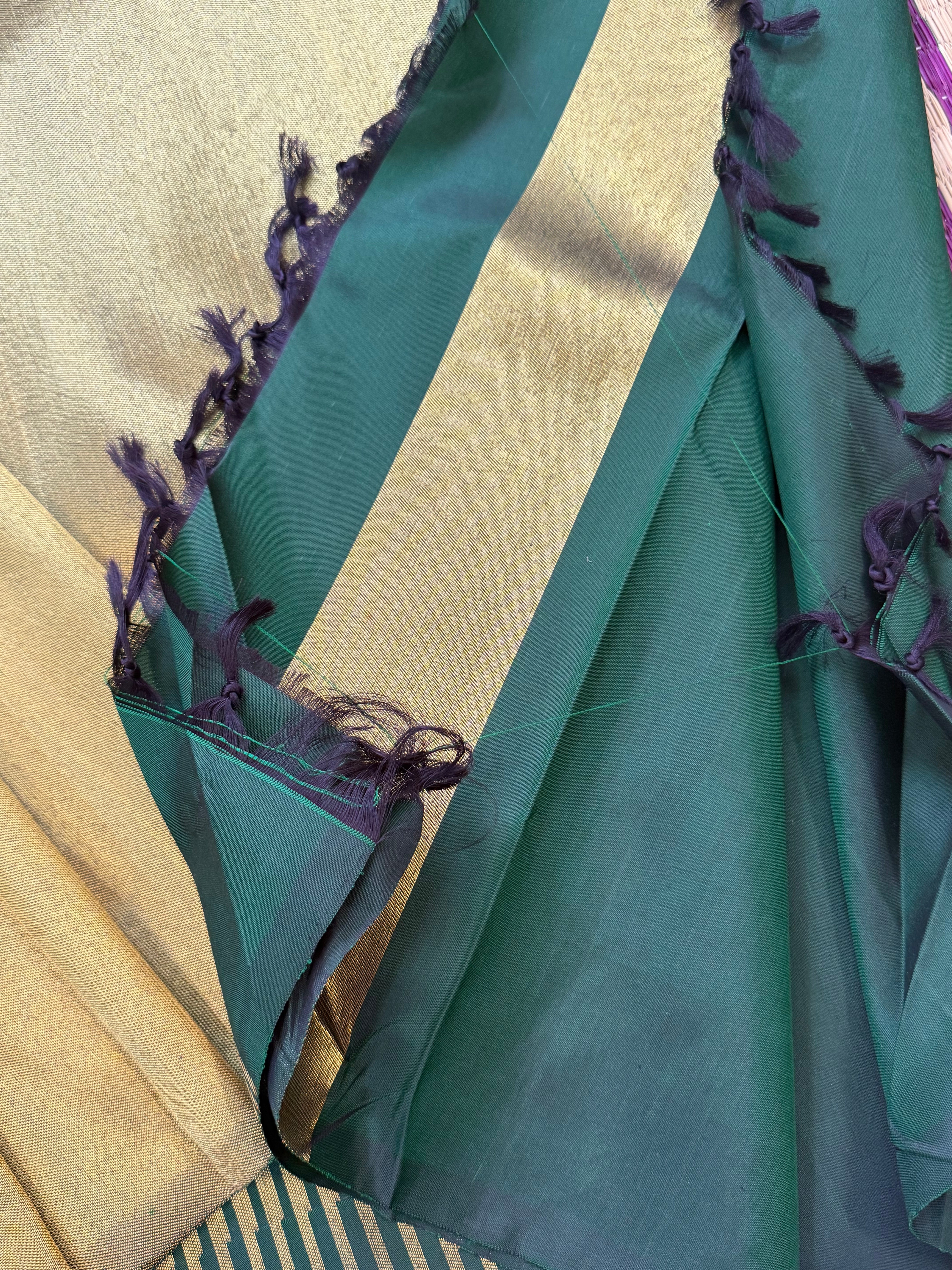 The saree is dark green color with 8 kol raising border in gold pure Zari and dense 8 kol Palla and blouse
