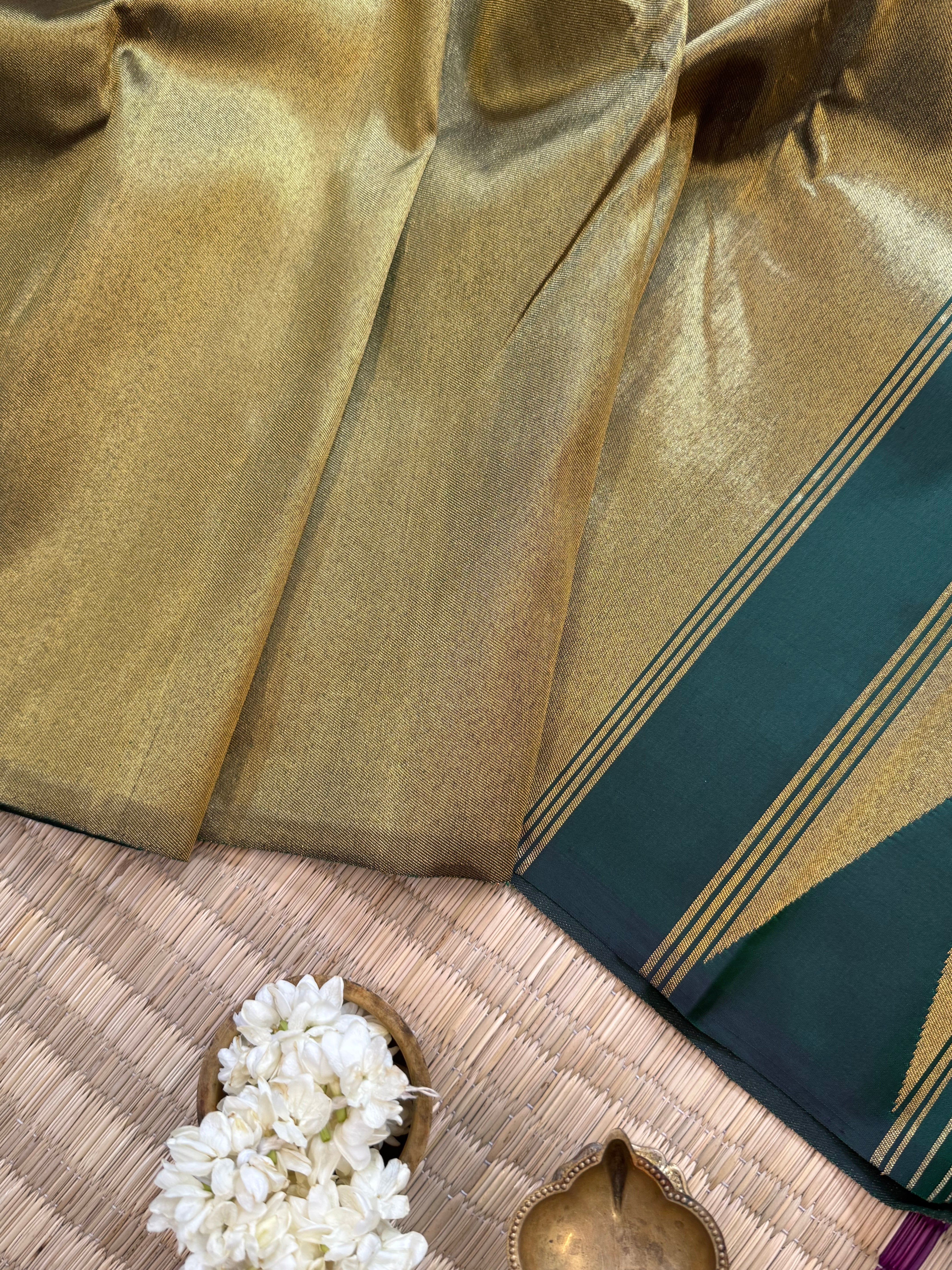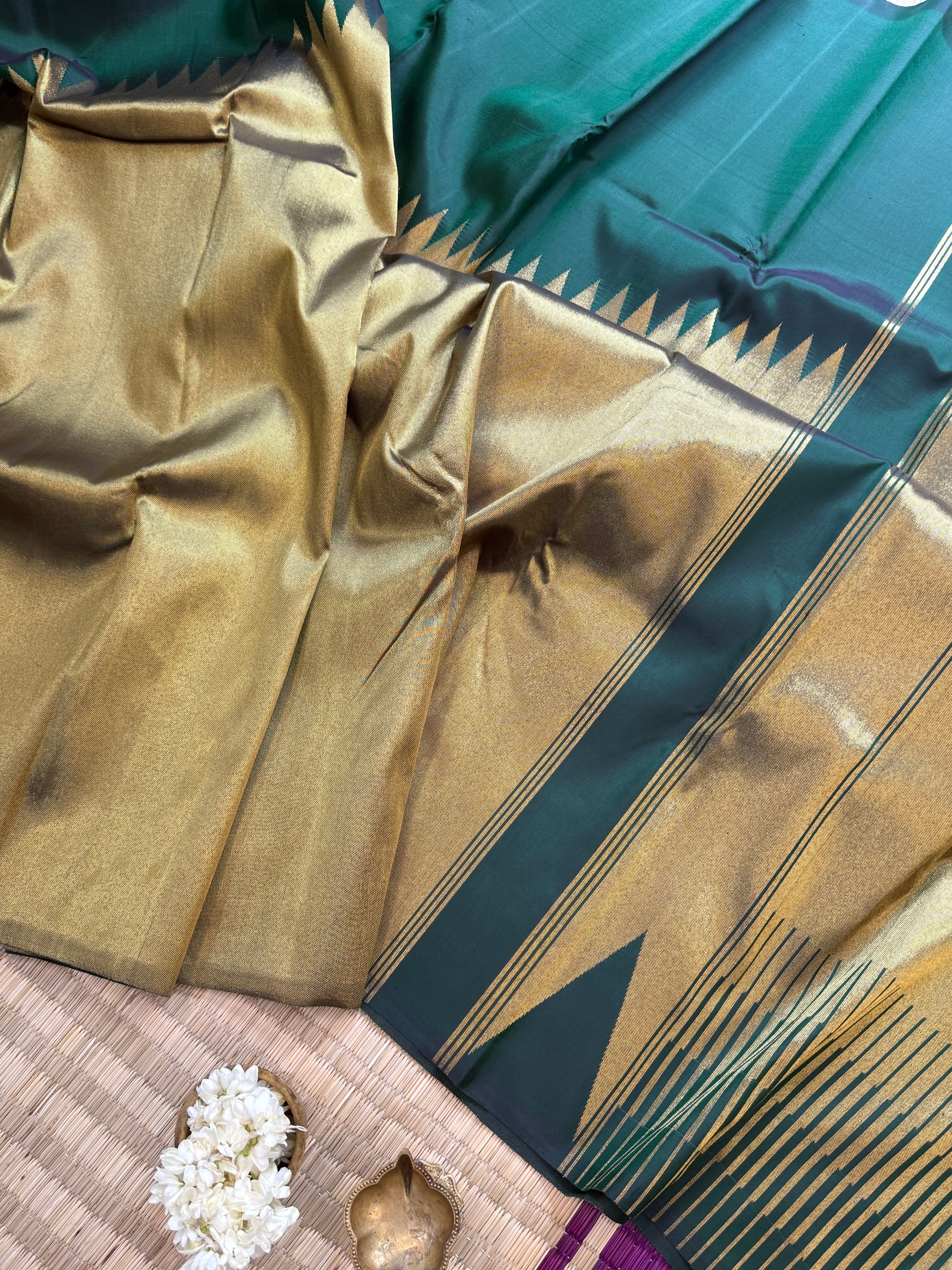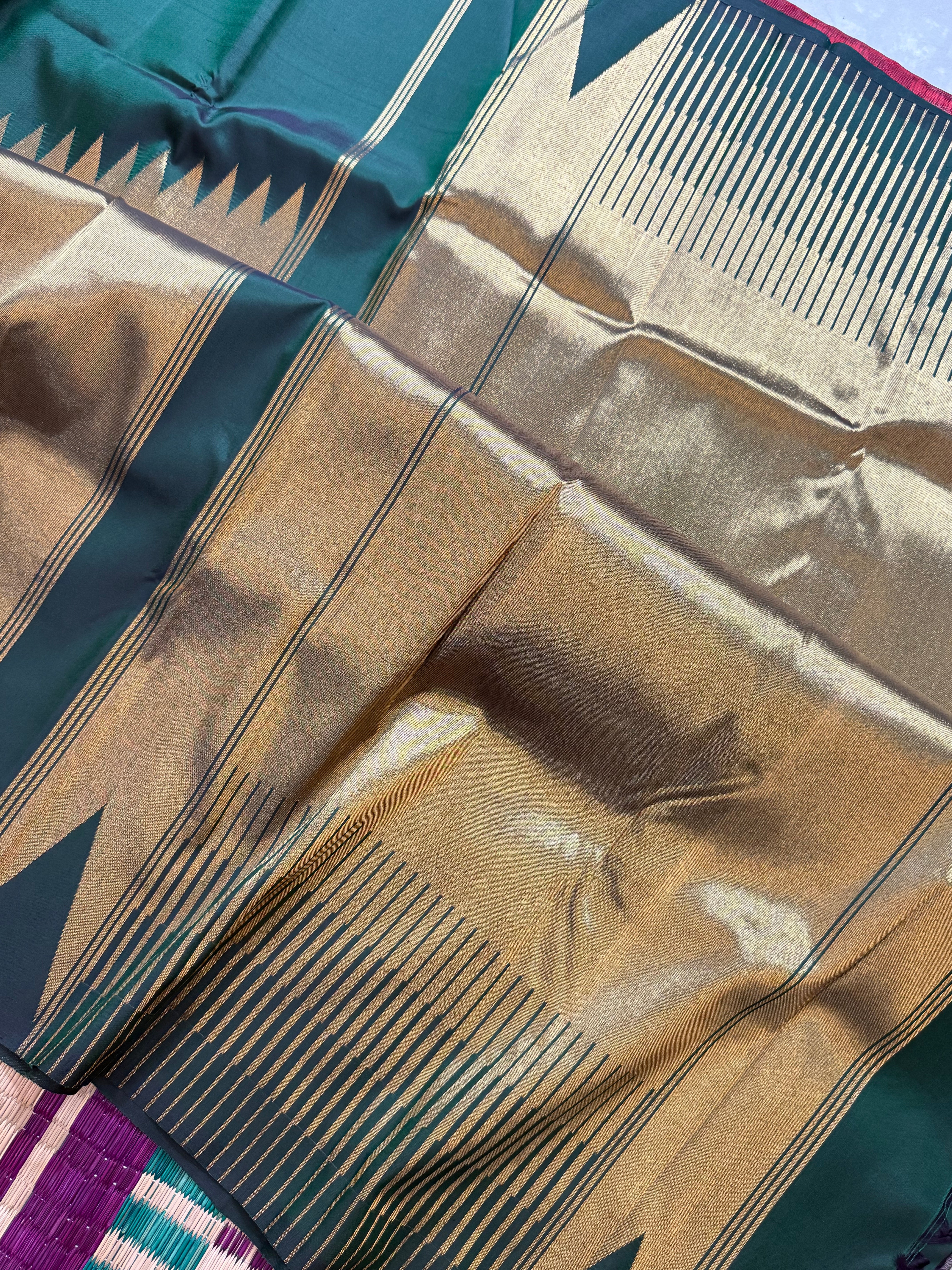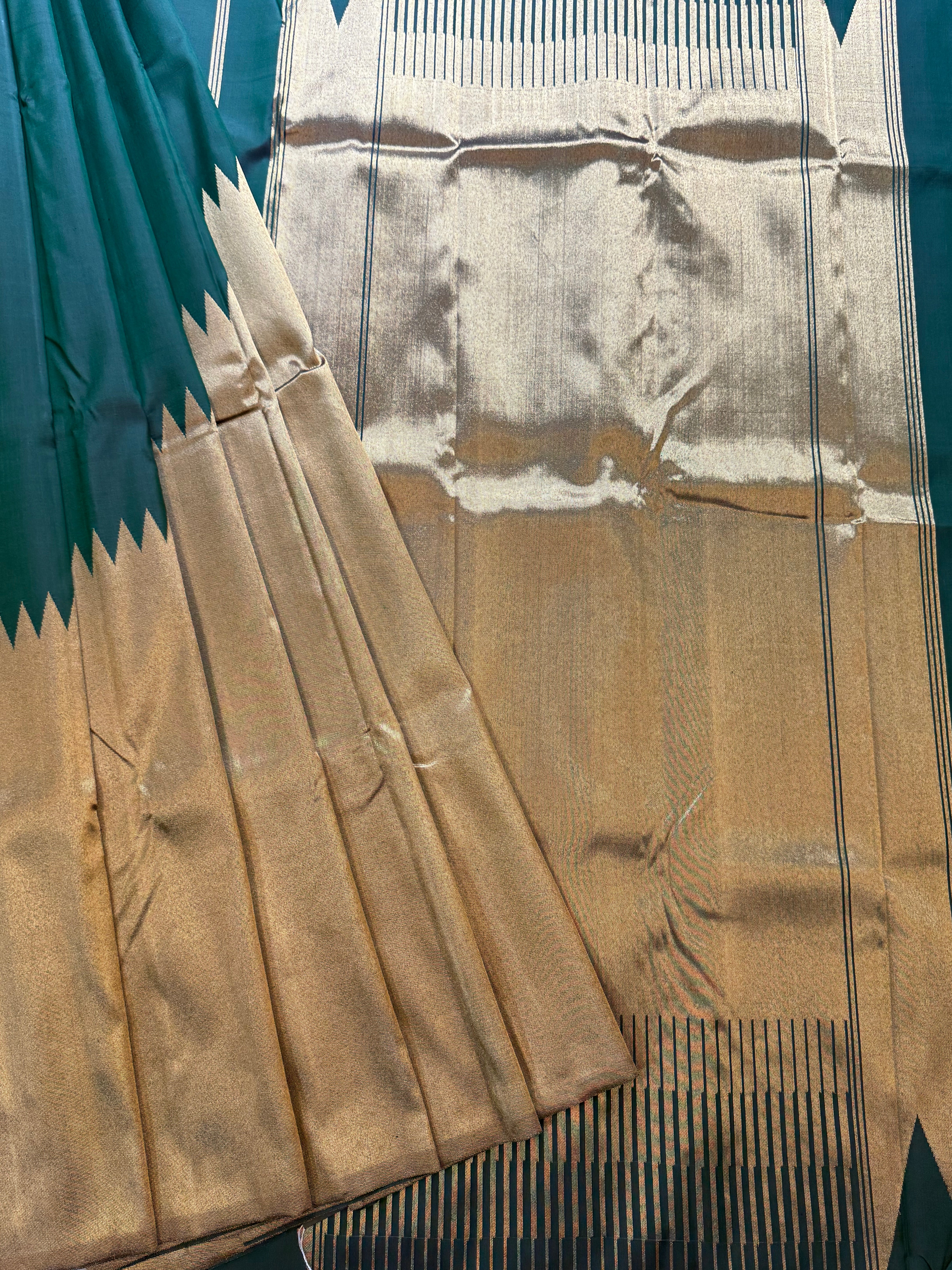 The saree is dark green color with 8 kol raising border in gold pure Zari and dense 8 kol Palla and blouse
