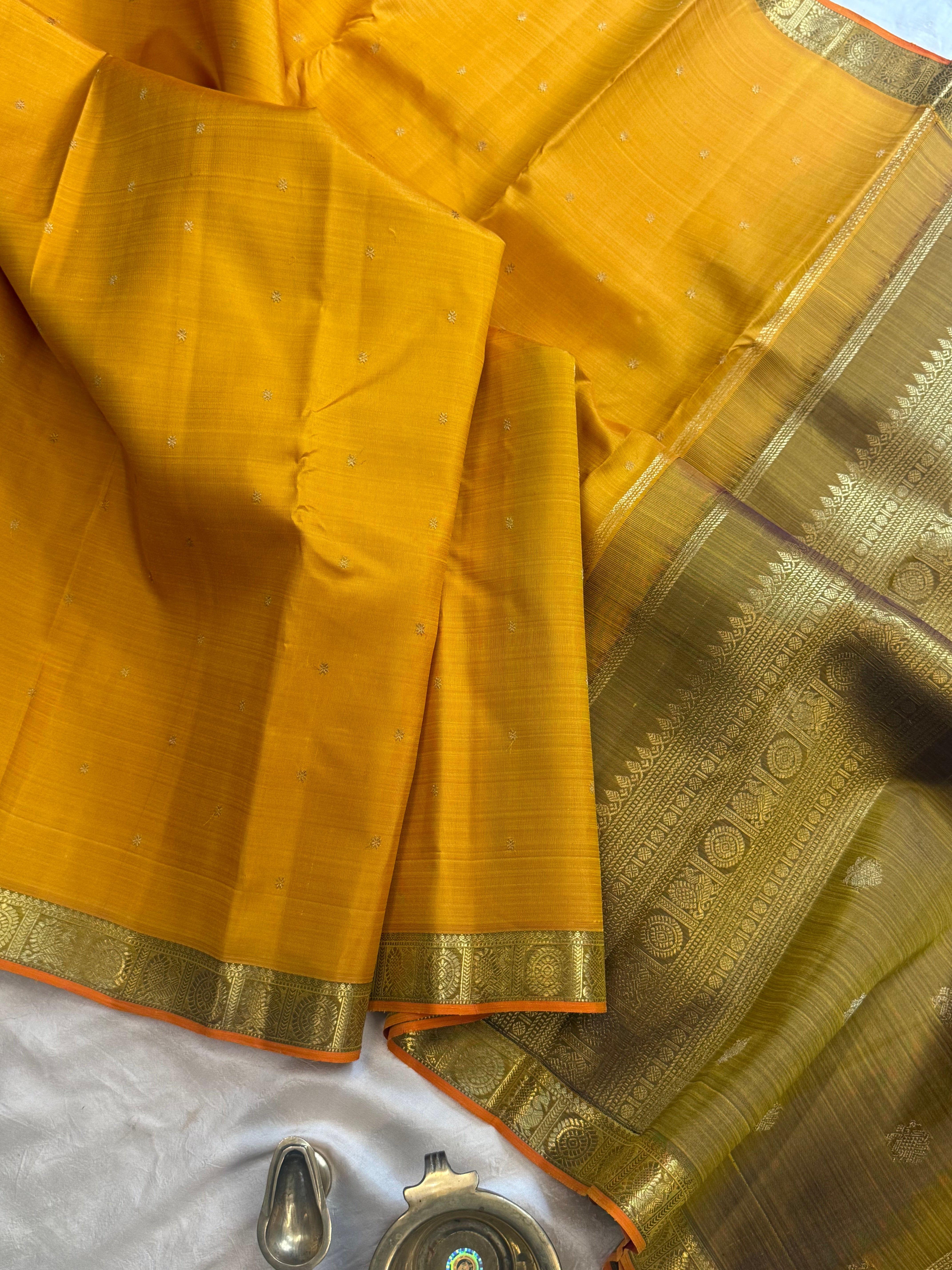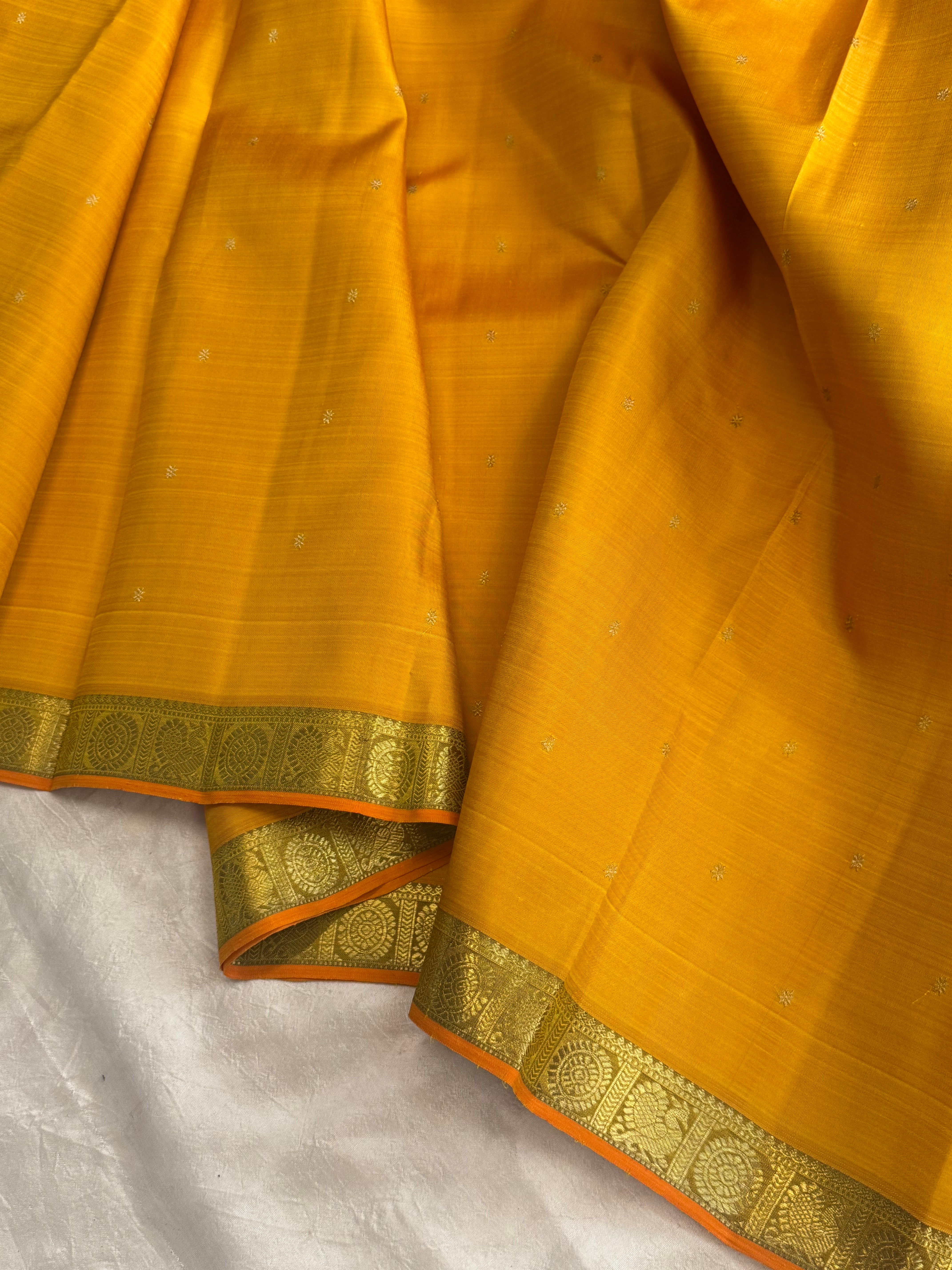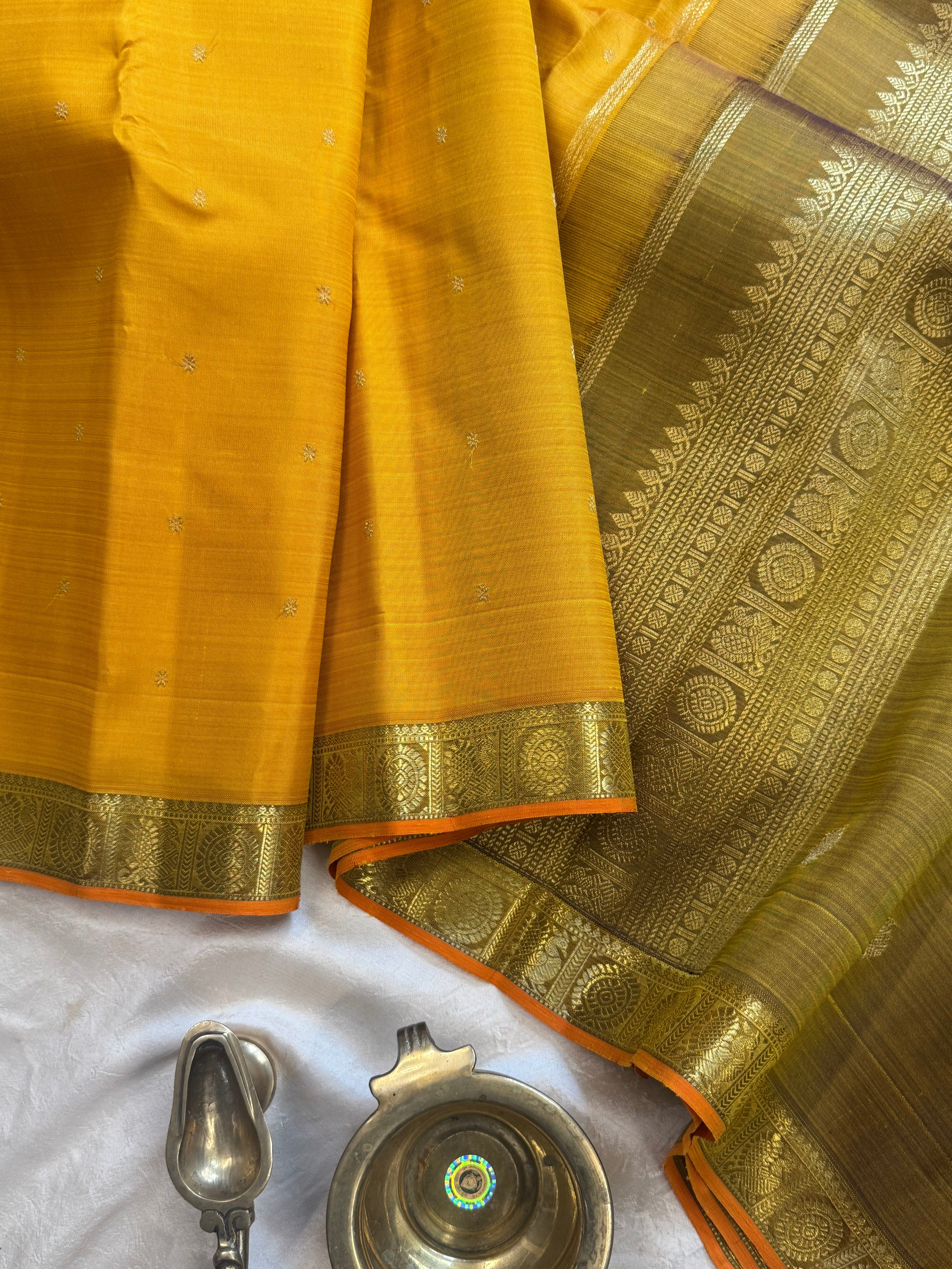 The body is mustard yellow with small Kamalam Butta with Kanchana border having annam chakrm pet and dense mustard Palla and blouse
