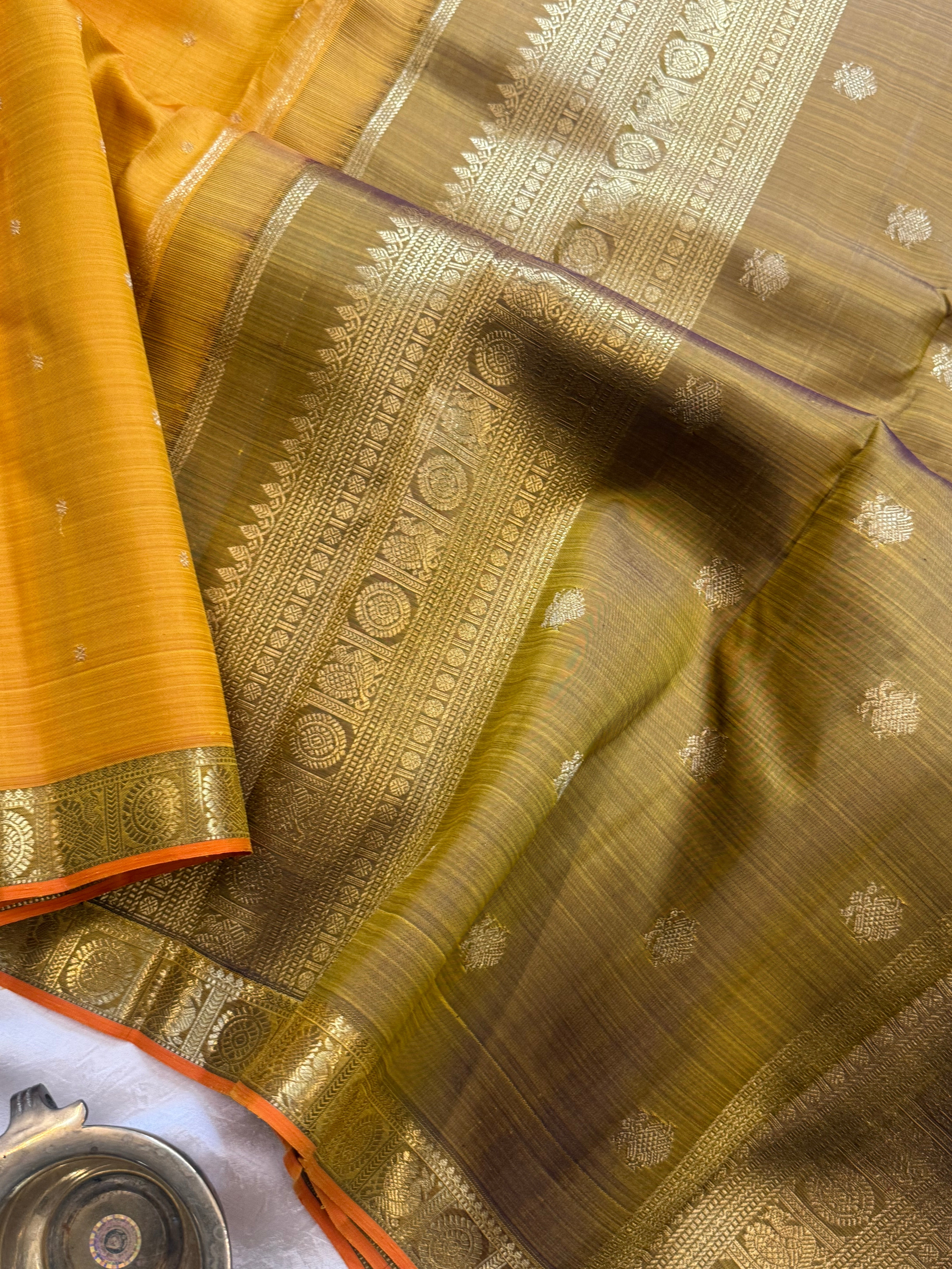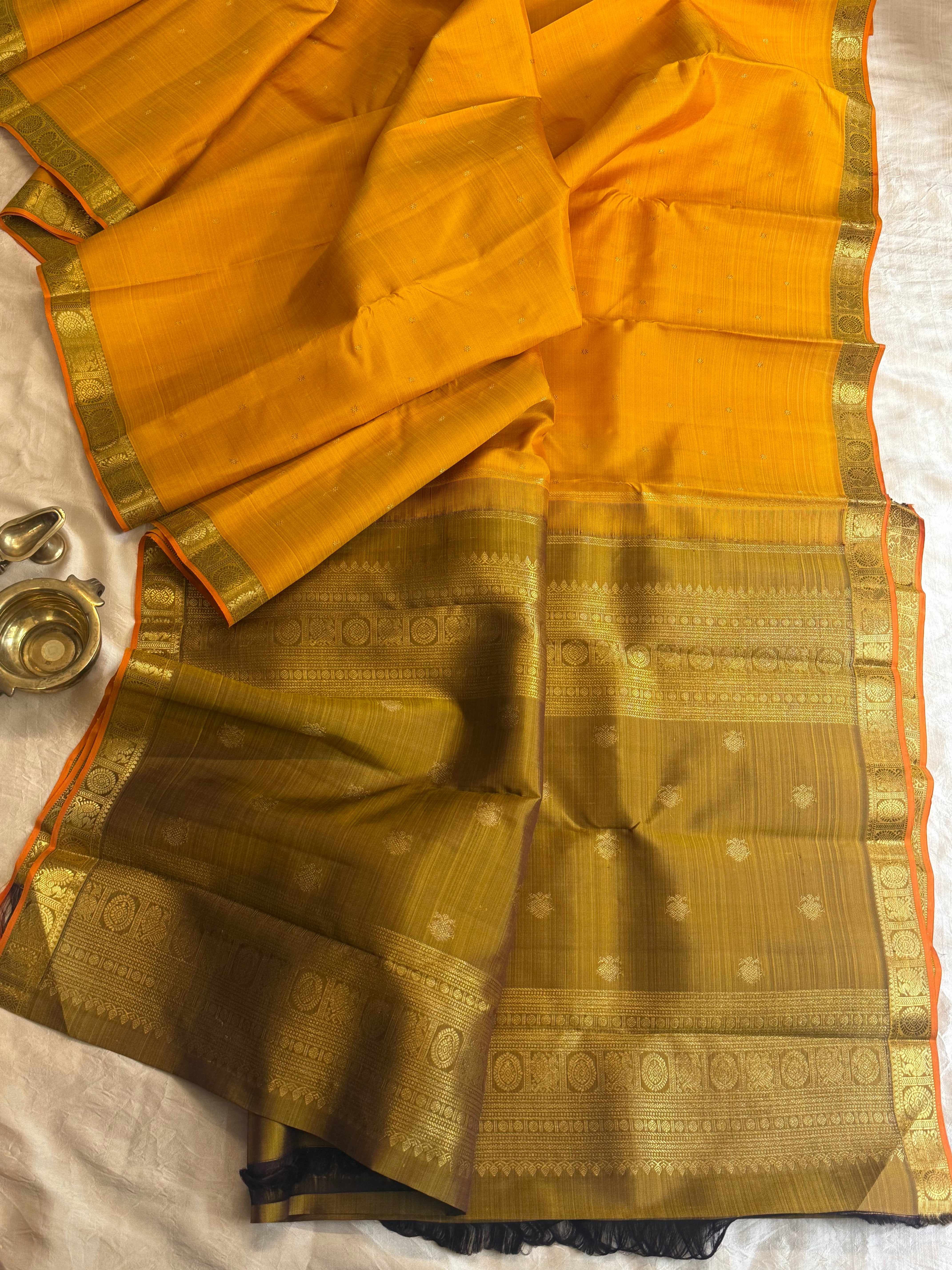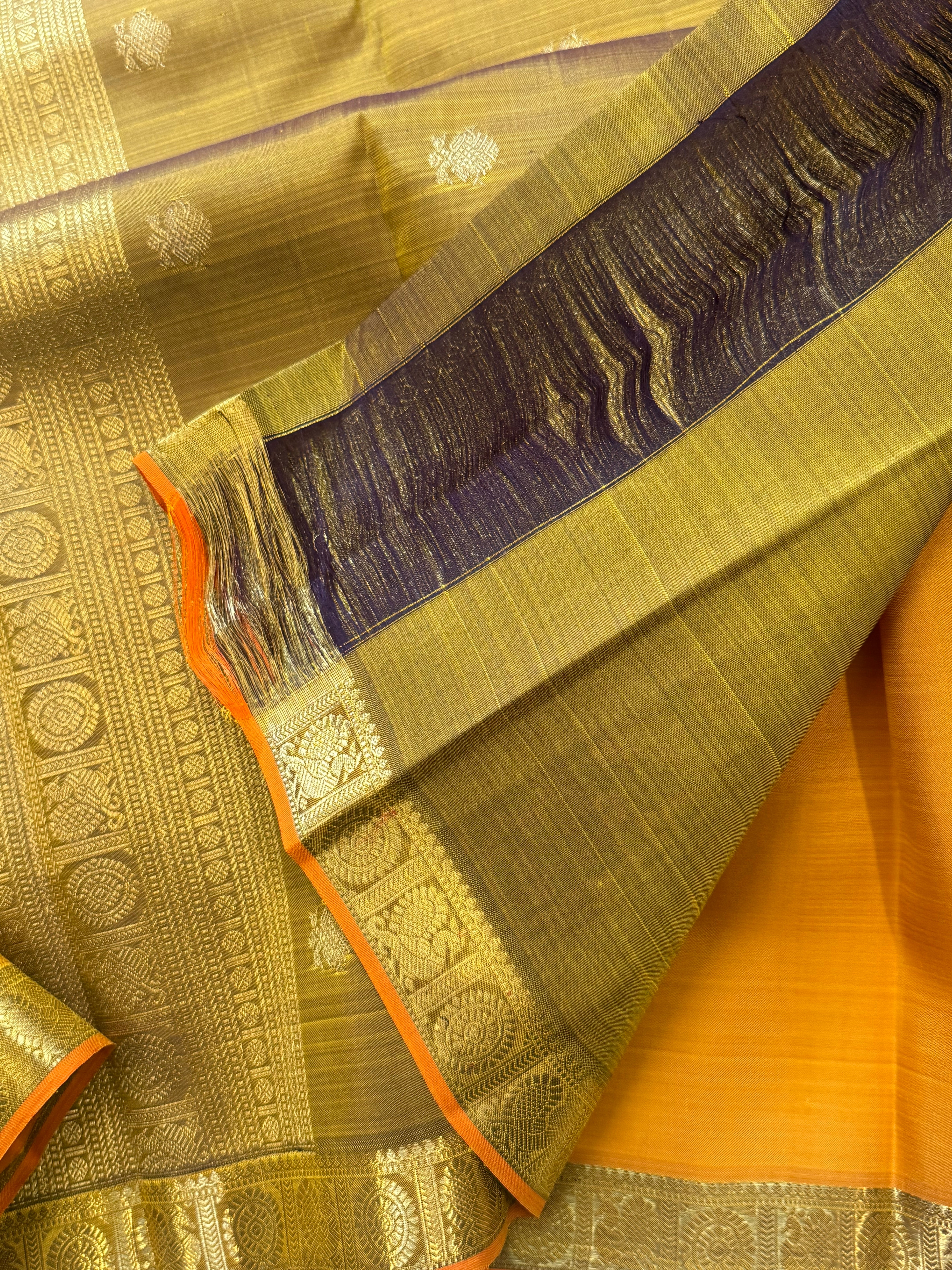 The body is mustard yellow with small Kamalam Butta with Kanchana border having annam chakrm pet and dense mustard Palla and blouse