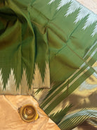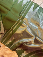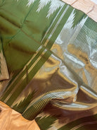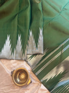 The body is dark olive green with silver Zari thazhamboo rekku and dense 8 kol Zari Palla in pure Zari and blouse attached.