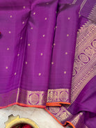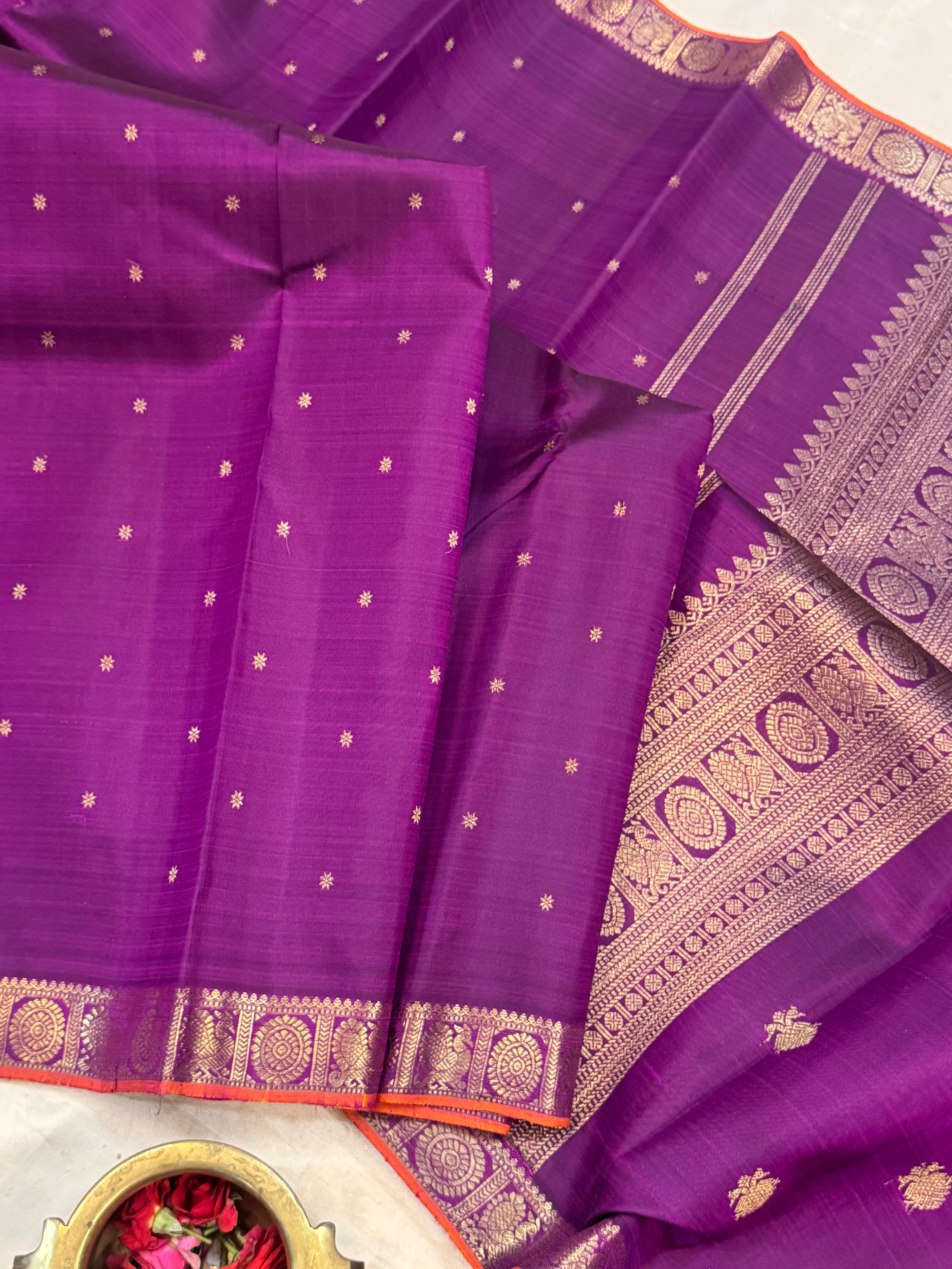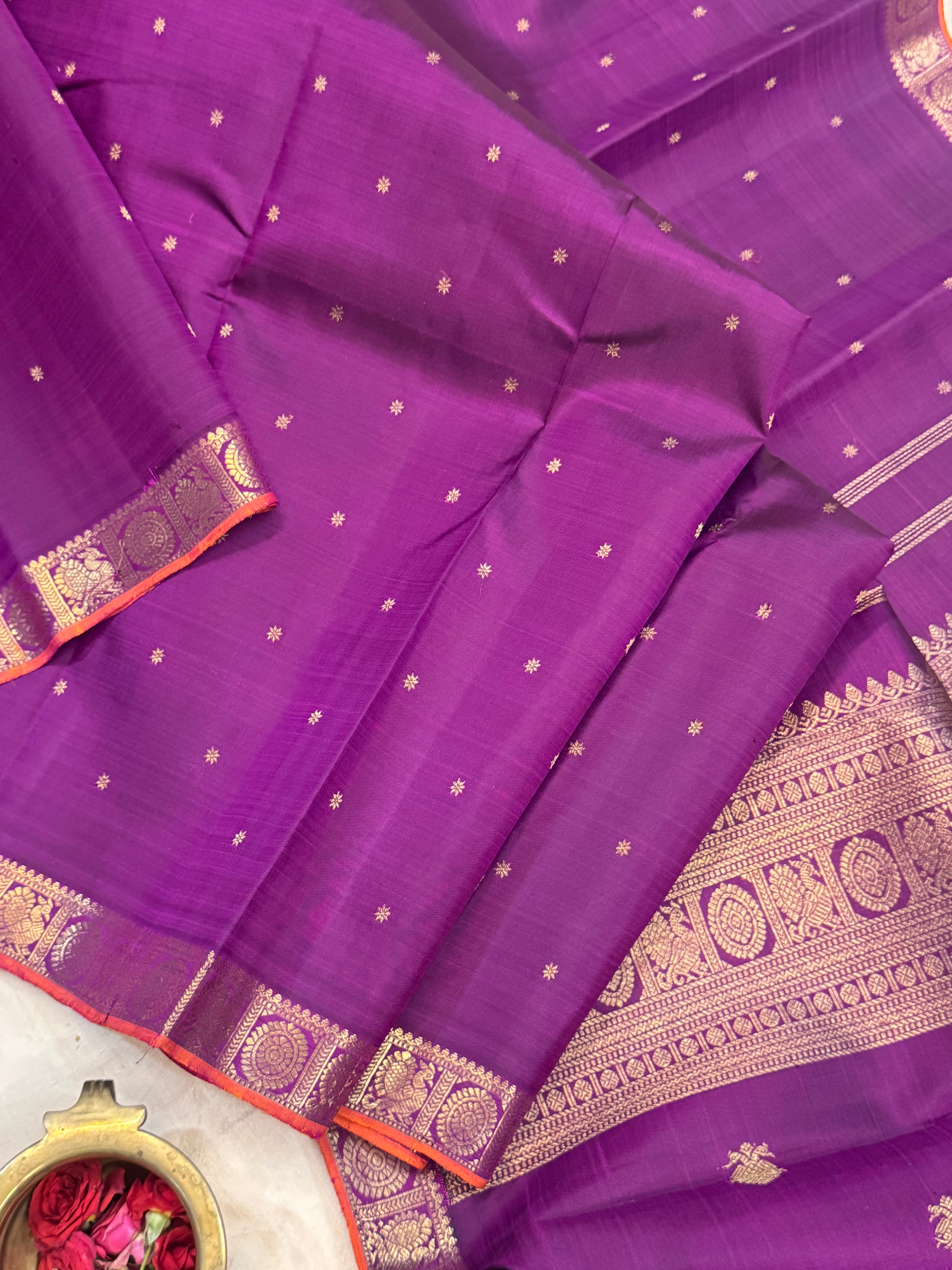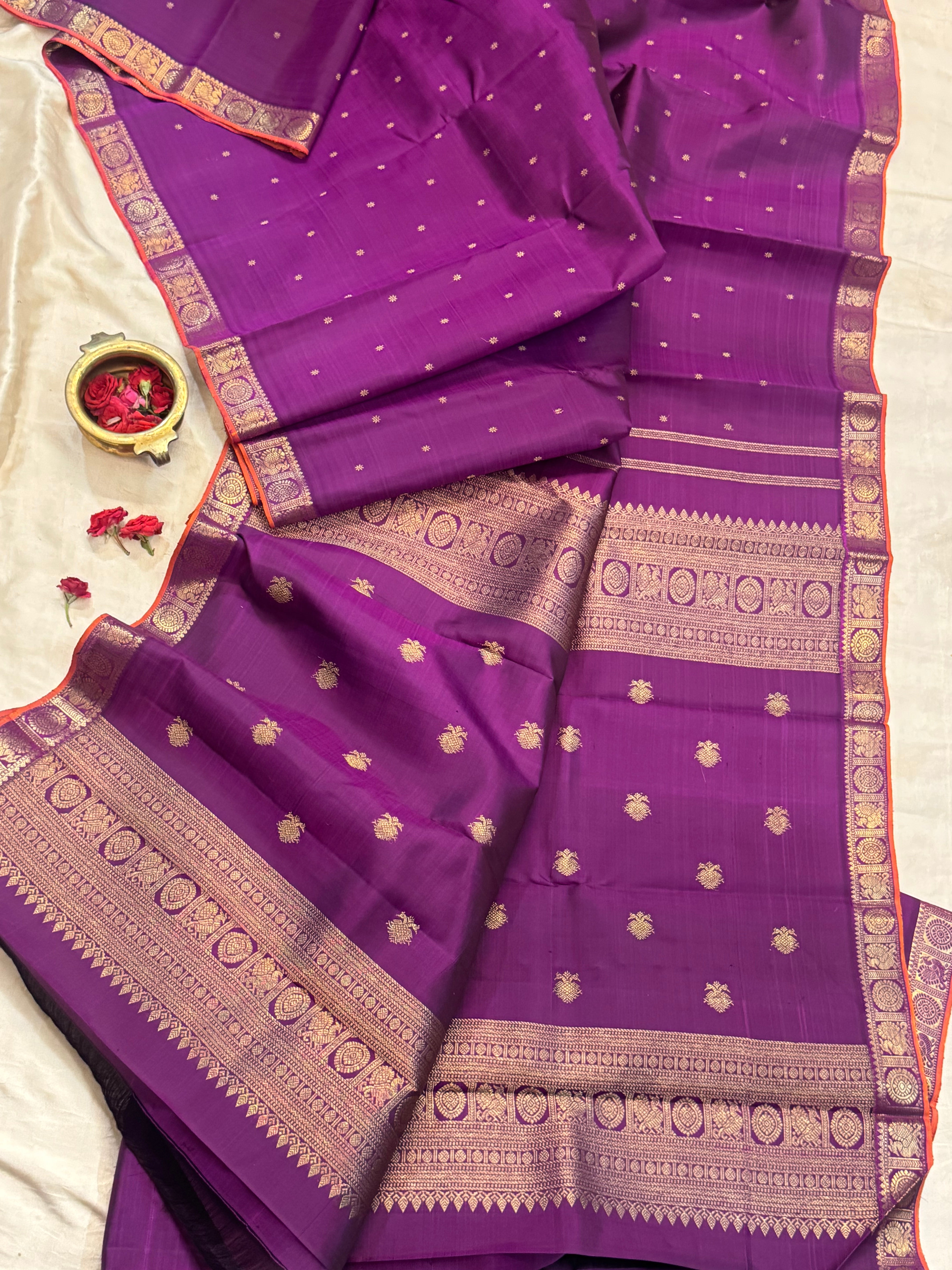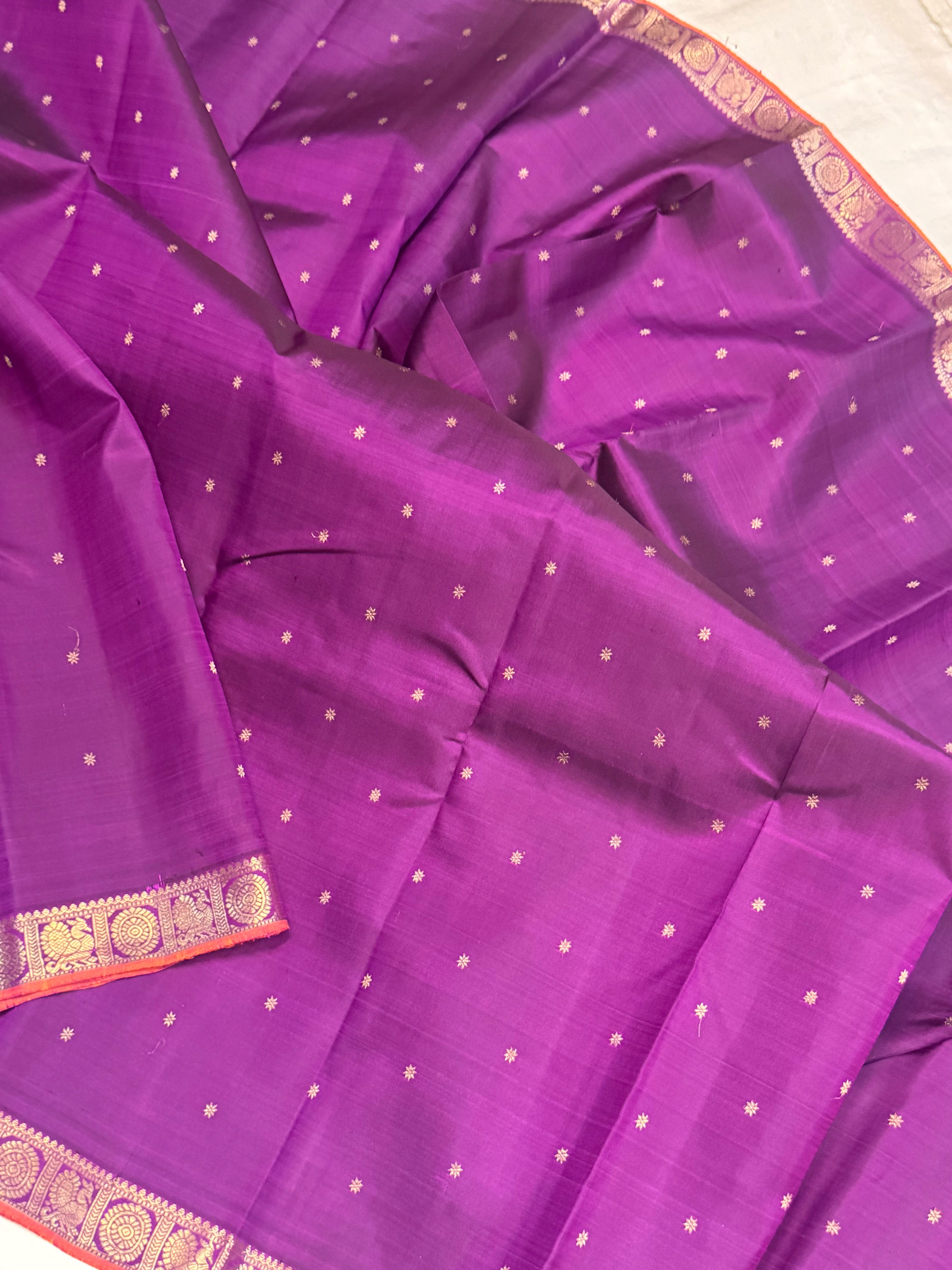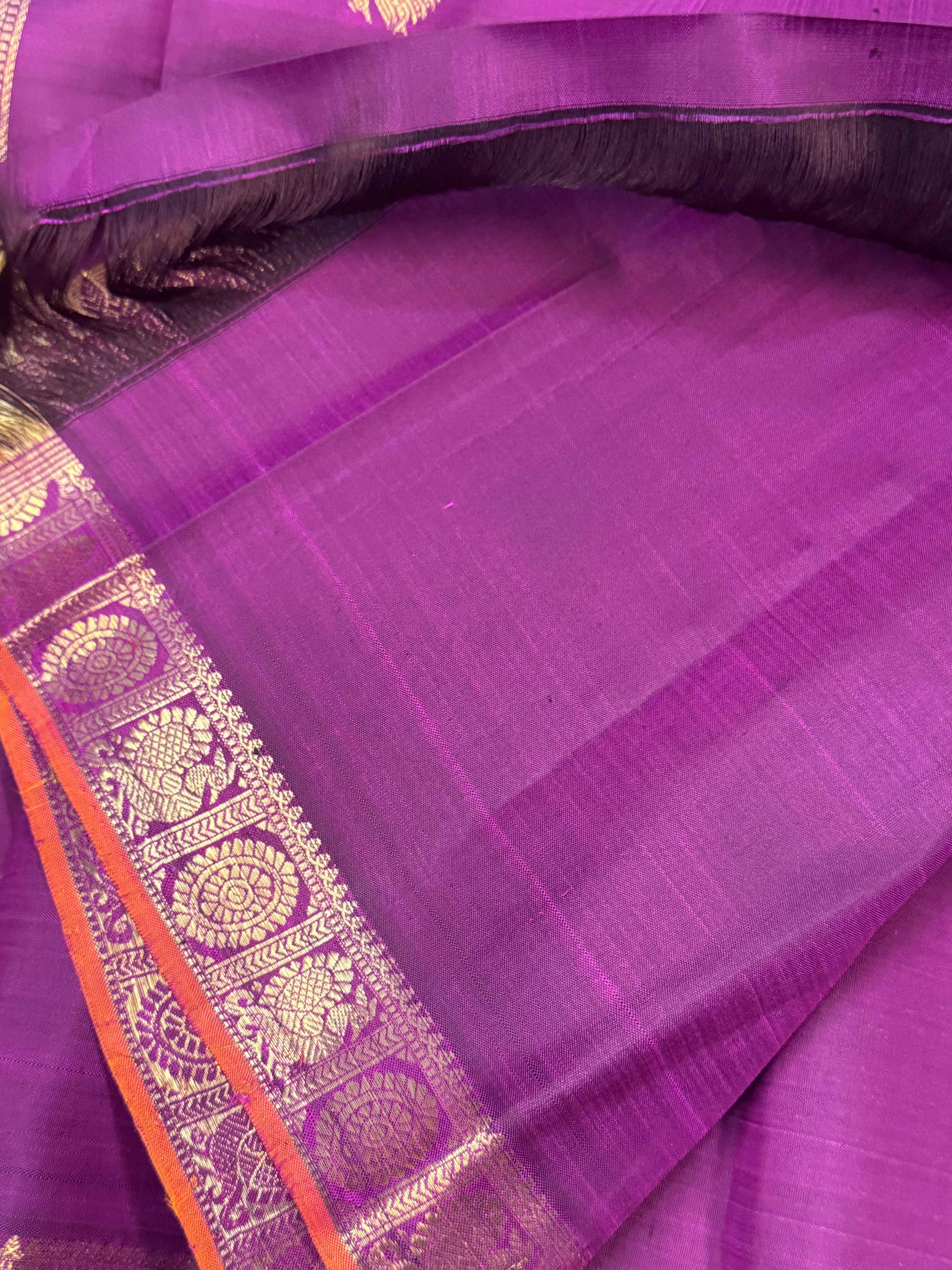 The body is aubergine colour with star Butta and the border is annam chakram small pet and orange selvedge and the Palla is dense pure zari Palla and blouse