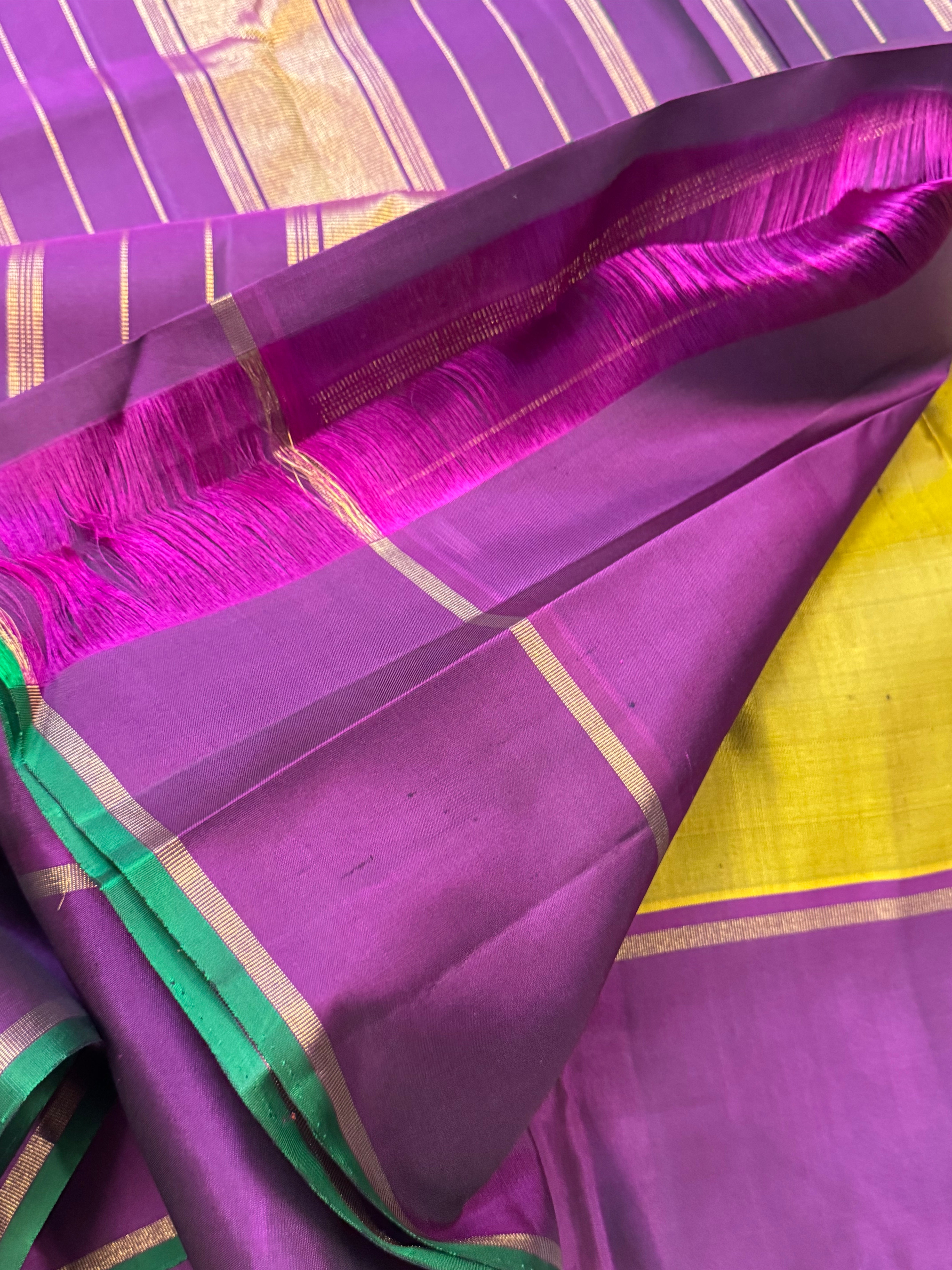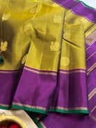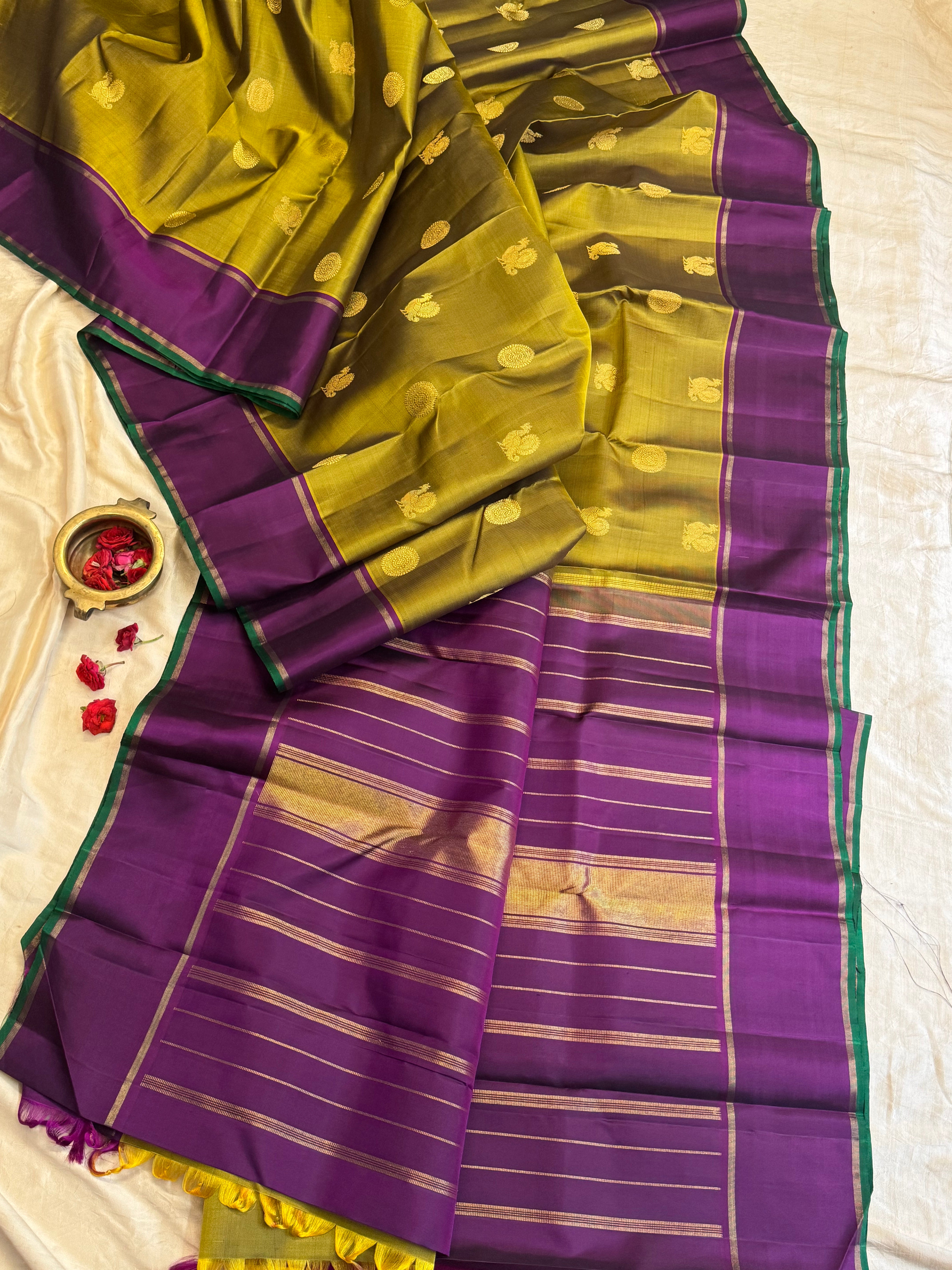 The body is olive green colour with annam chakram Butta and purple border retta zari pet and green selvedge and zari rekku Palla and blouse attached.