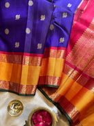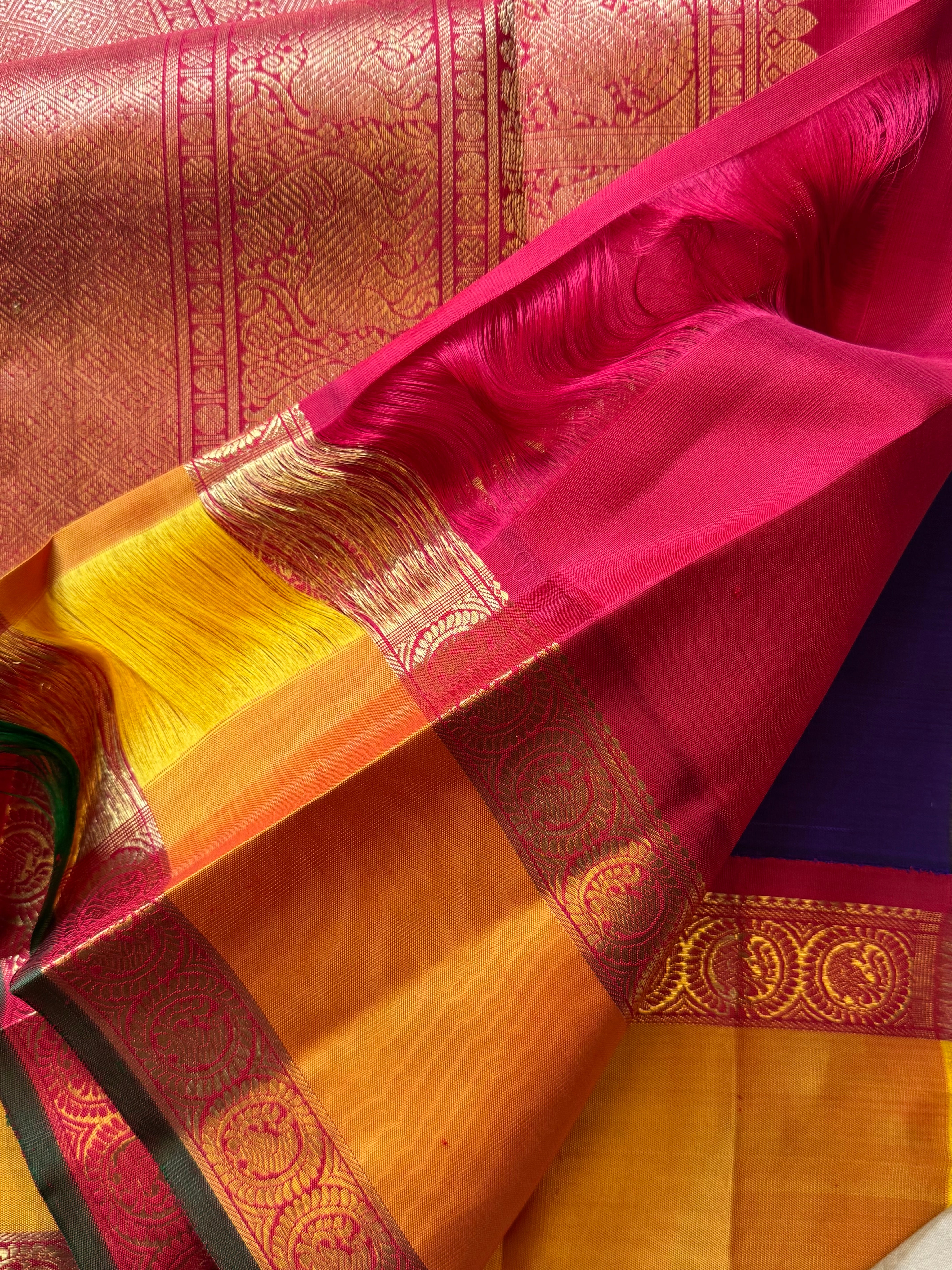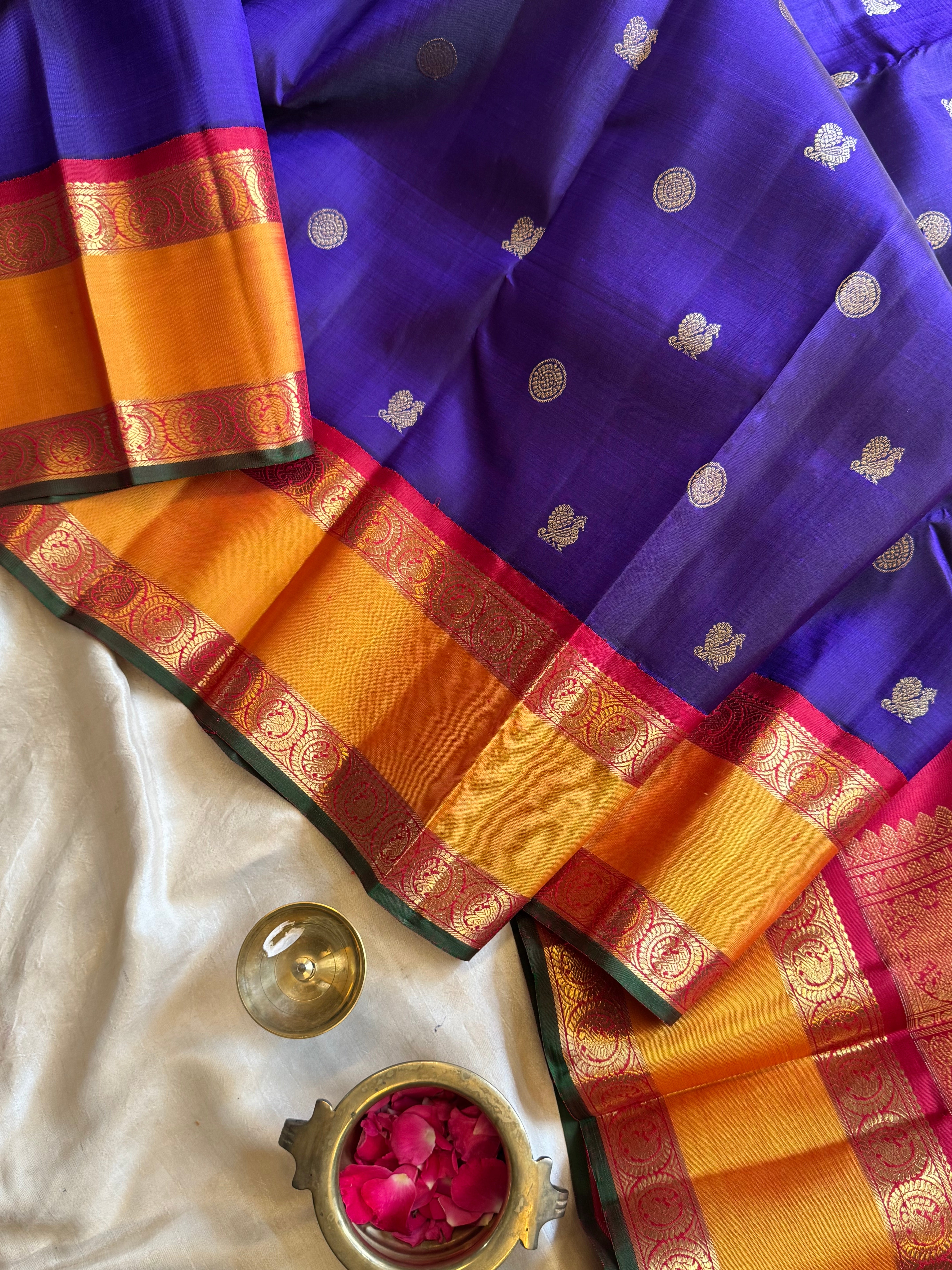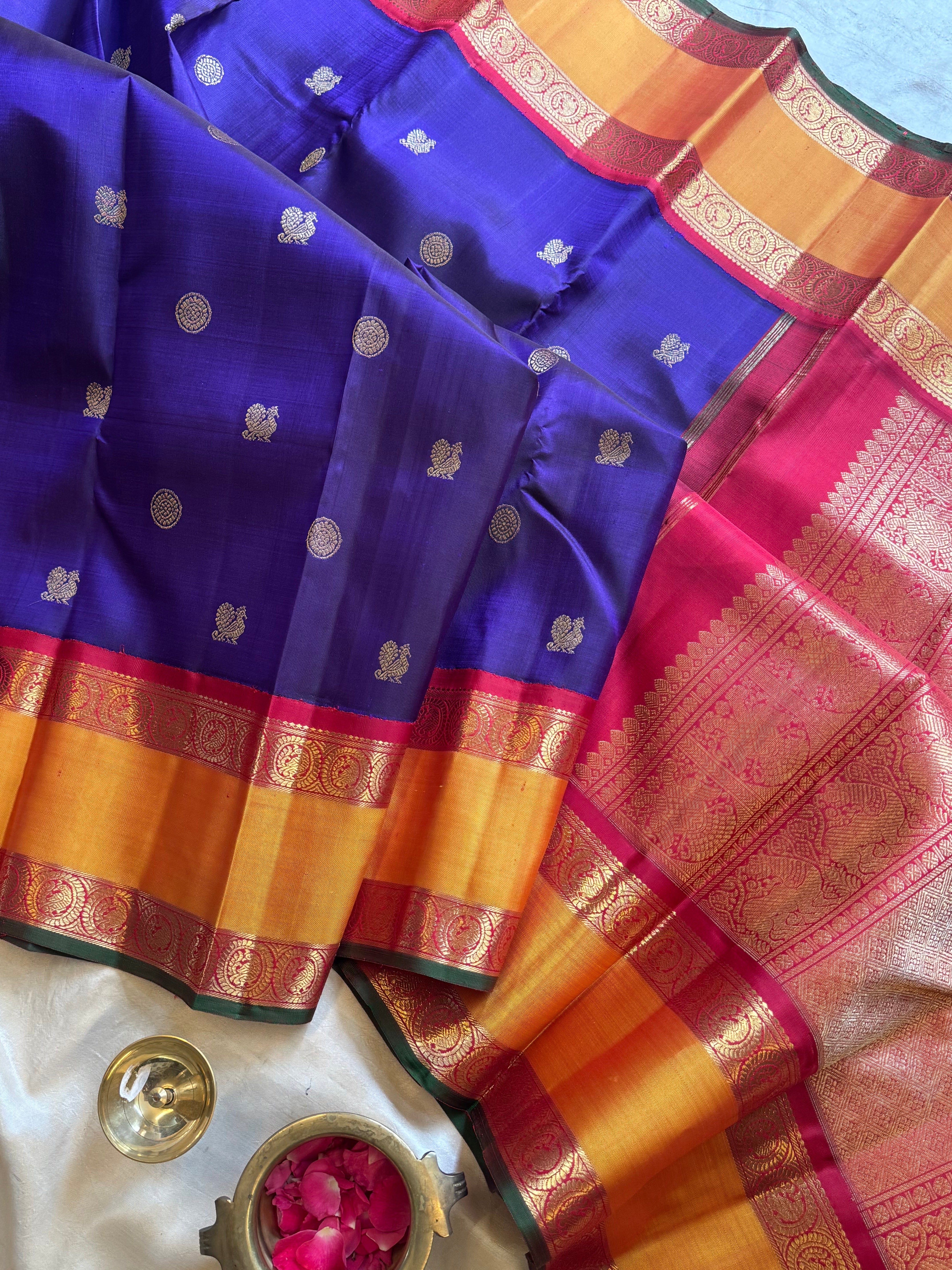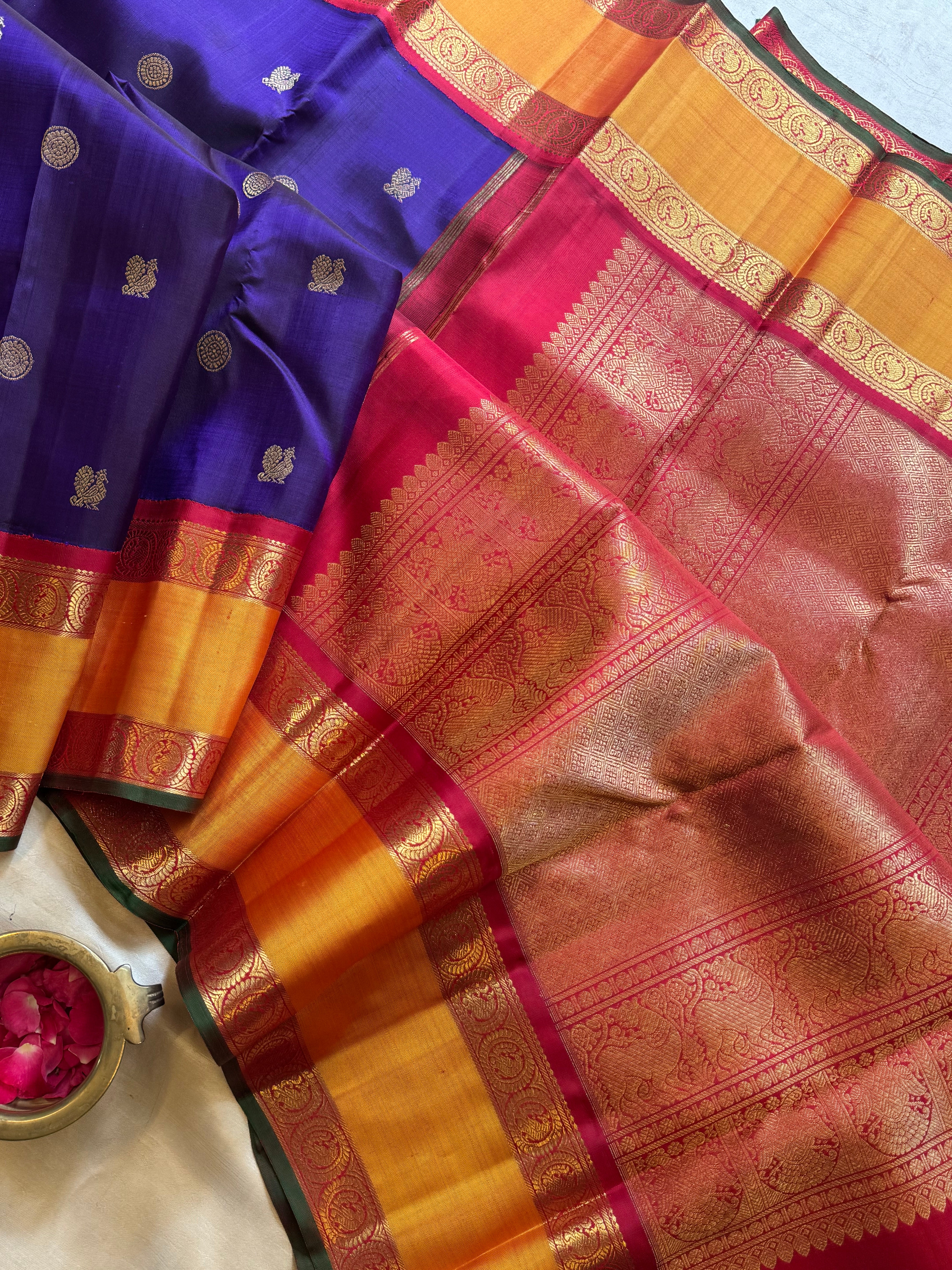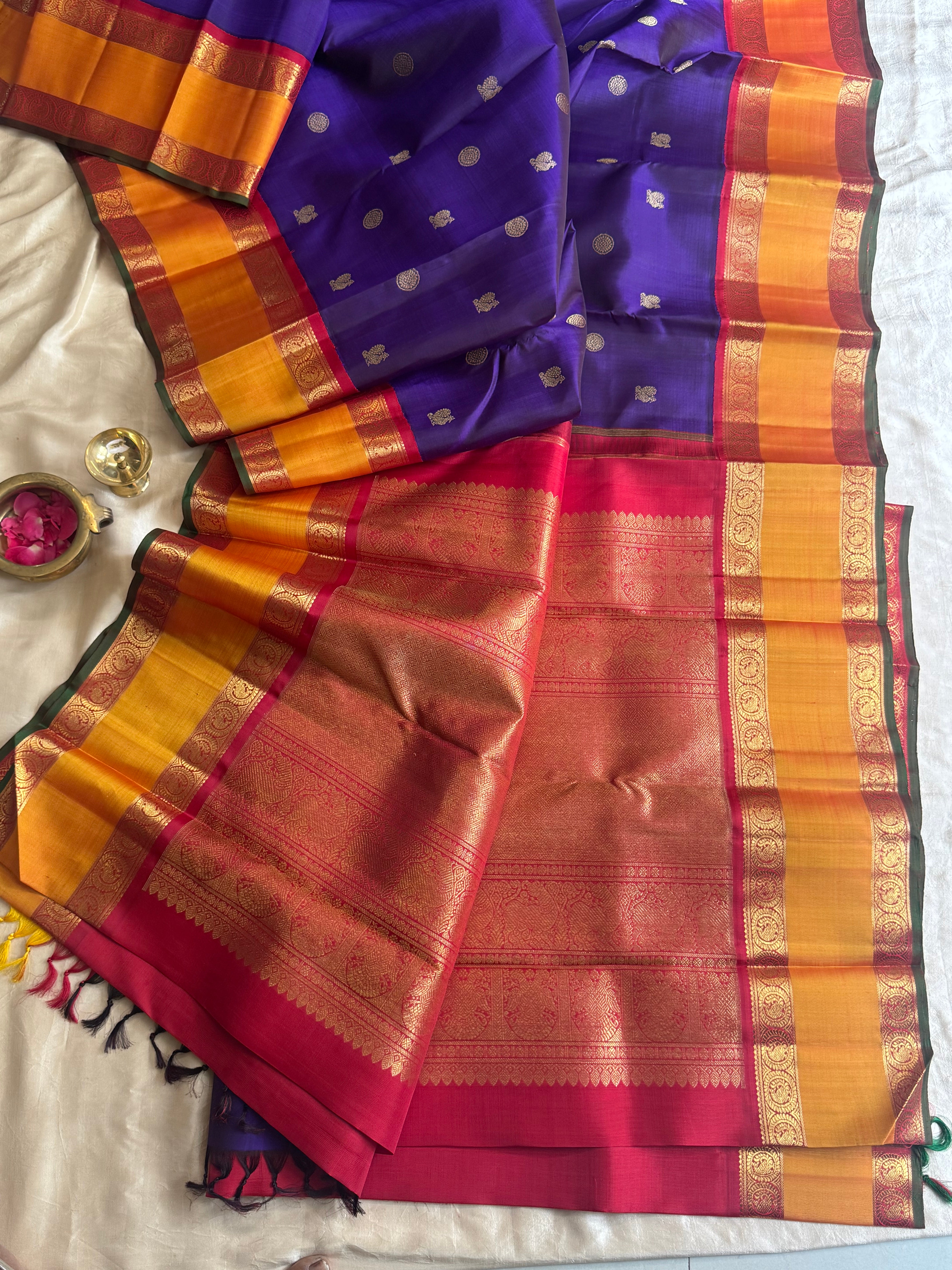The body is aubergine color with annam chakram Butta and the border is red with round annam pet with centre mustard and selvedge green and dense pure zari Palla and blouse