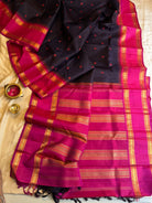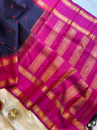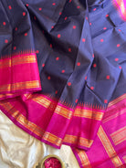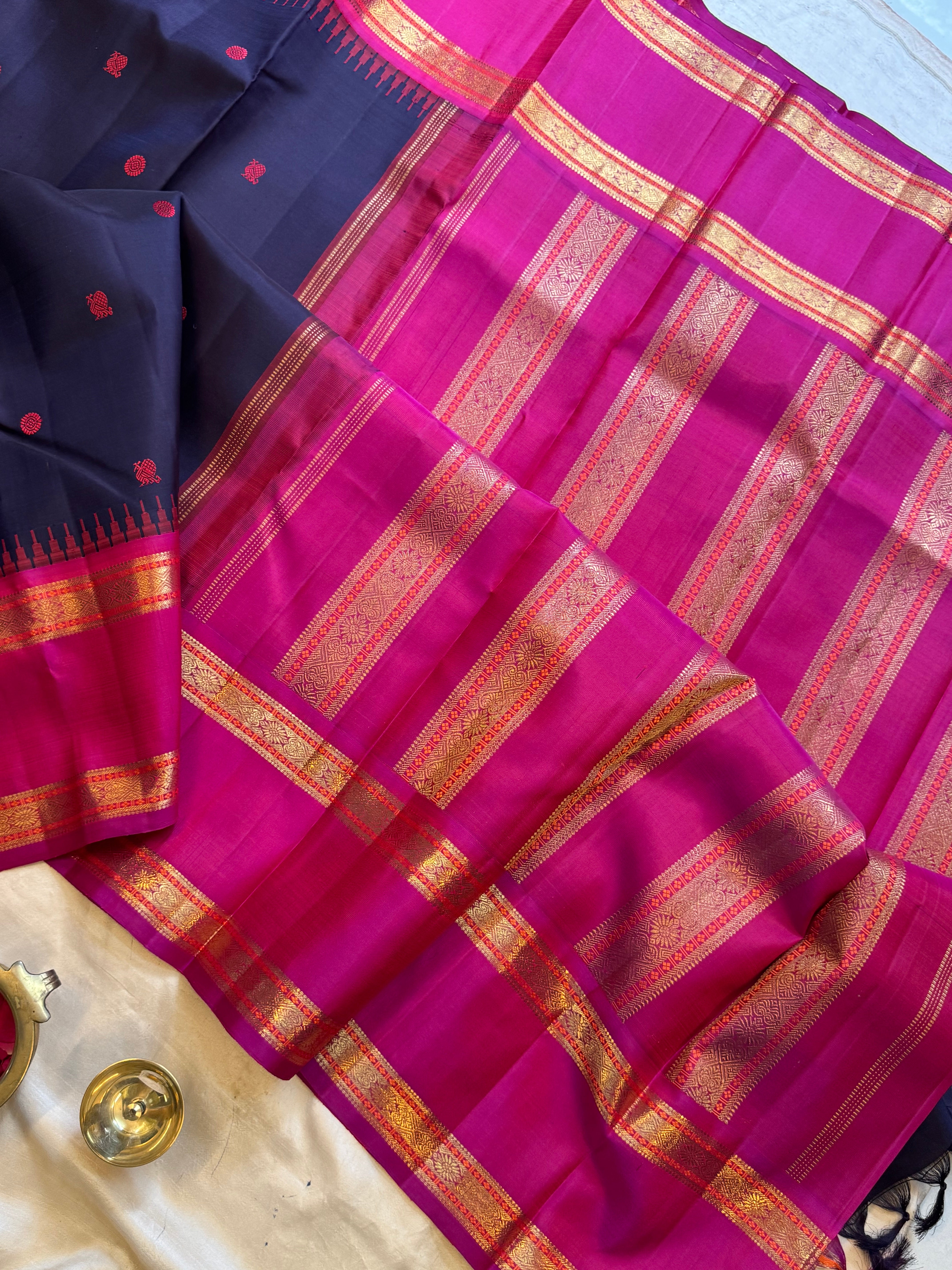 The body is dark blue color with annam chakram Butta and the border is pink retta pet border and dense pure zari Palla and blouse