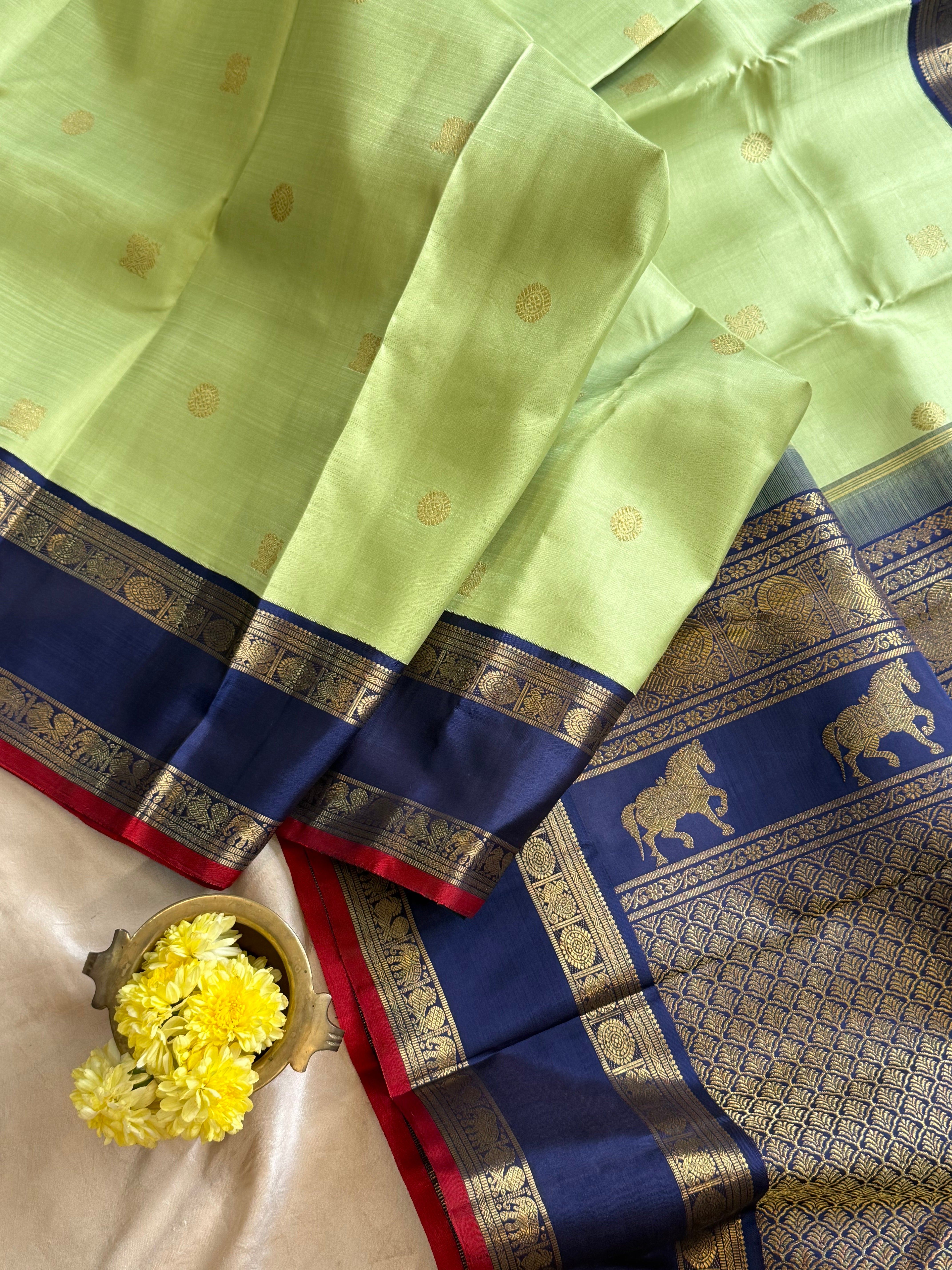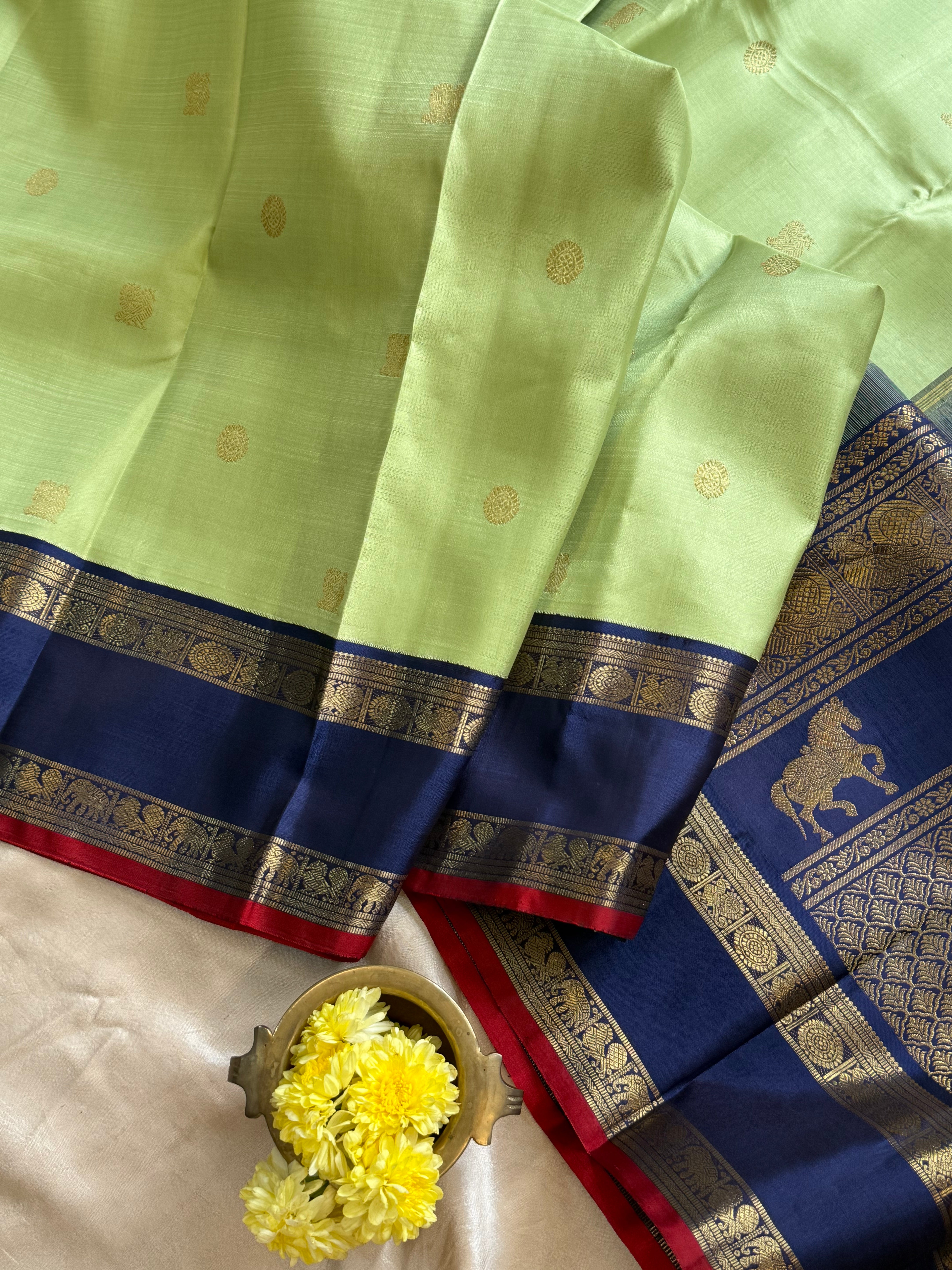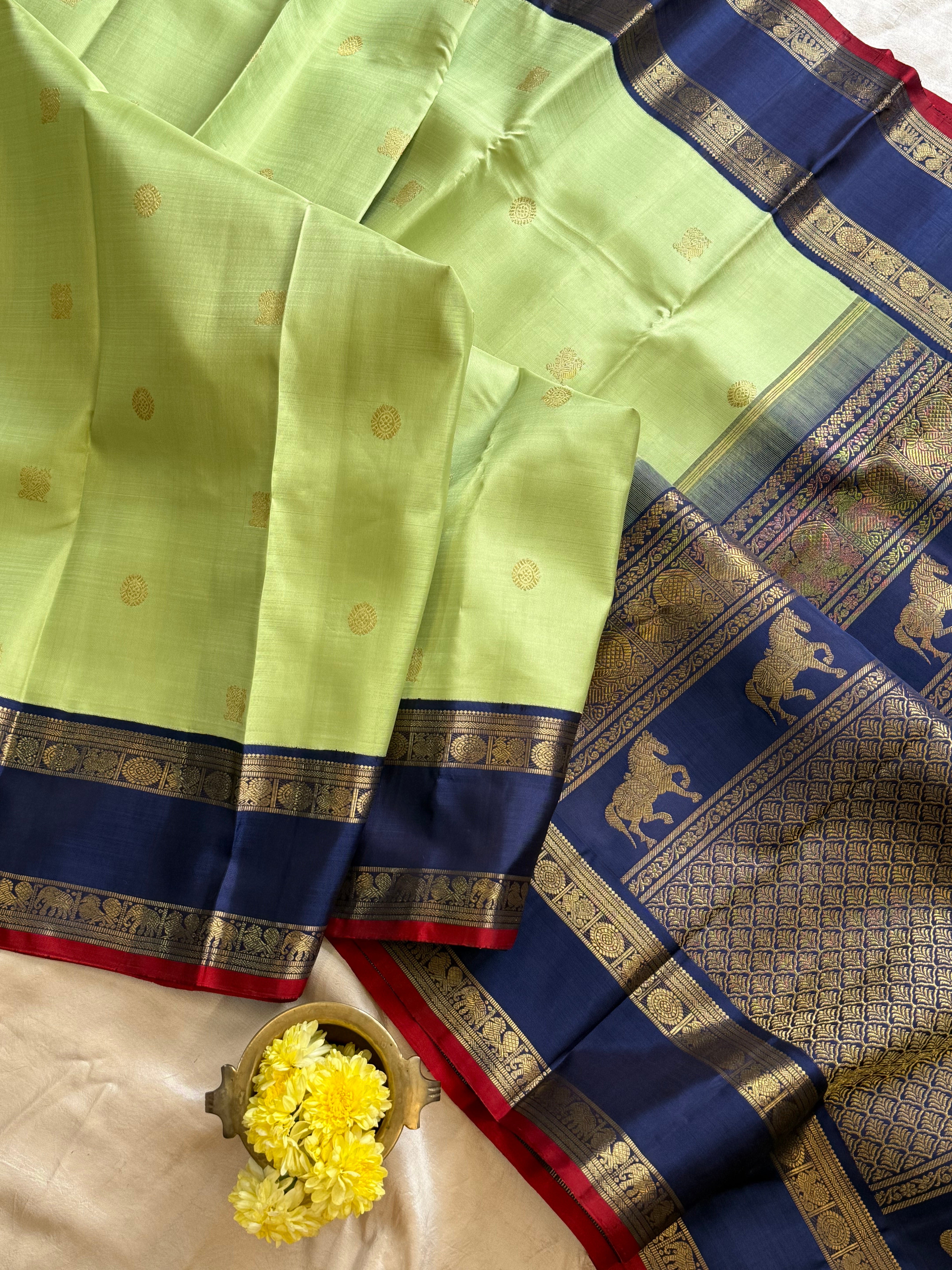 The saree is pista green colour with Annam chakram butta and the border is dark blue retta pet annam chakram with ruby red selvedge and the Palla is dense pure Zari Palla and blouse
