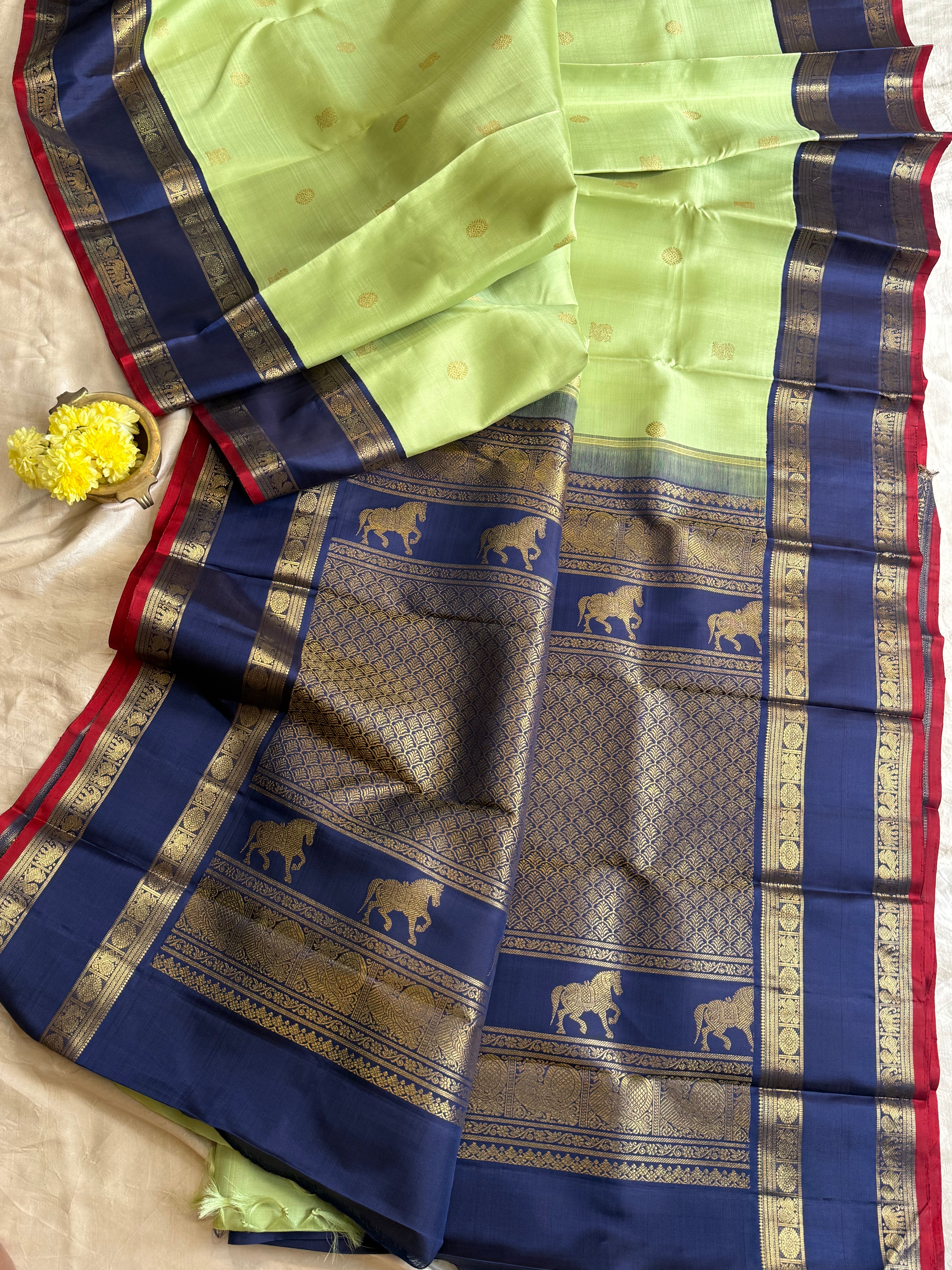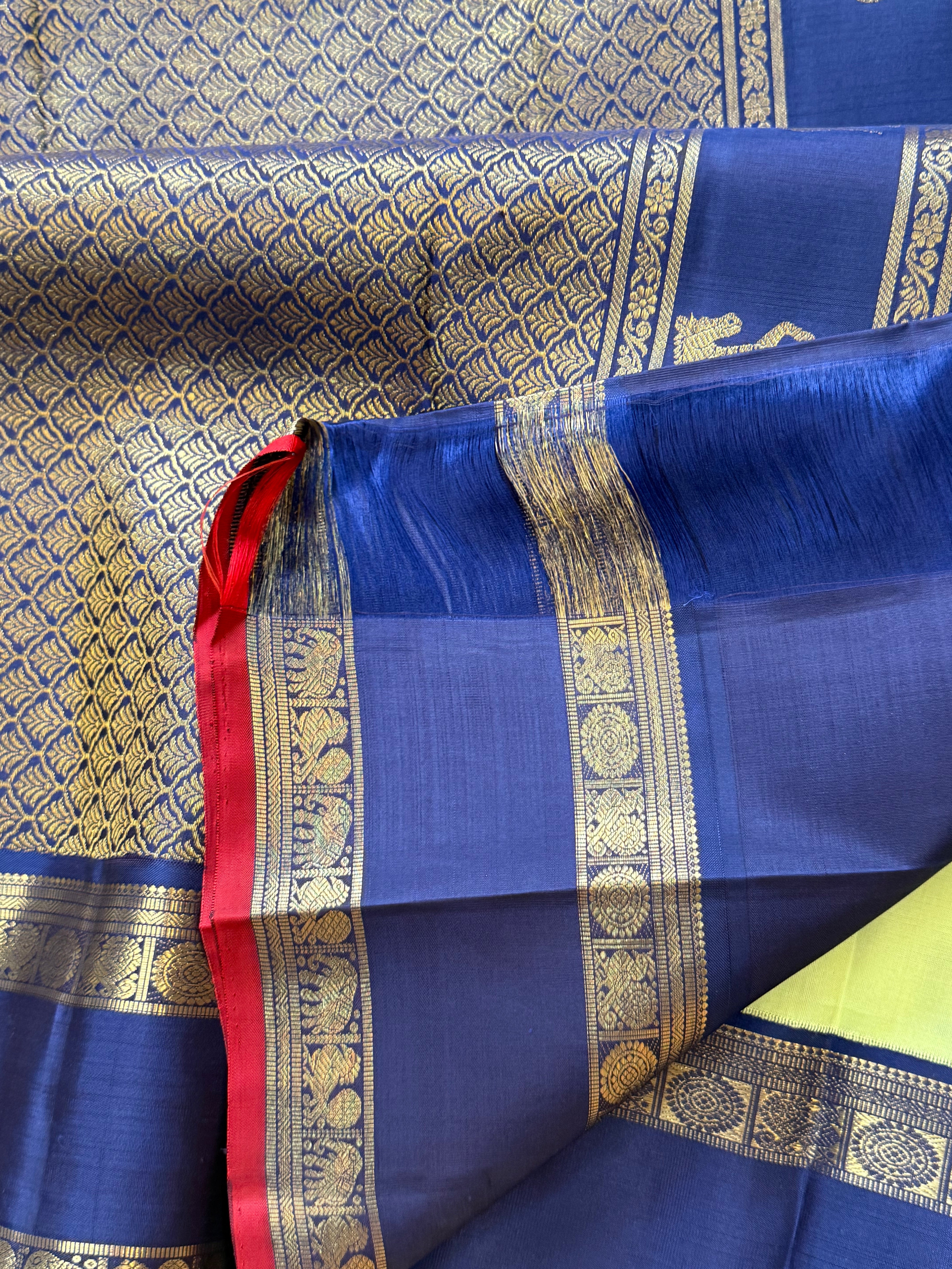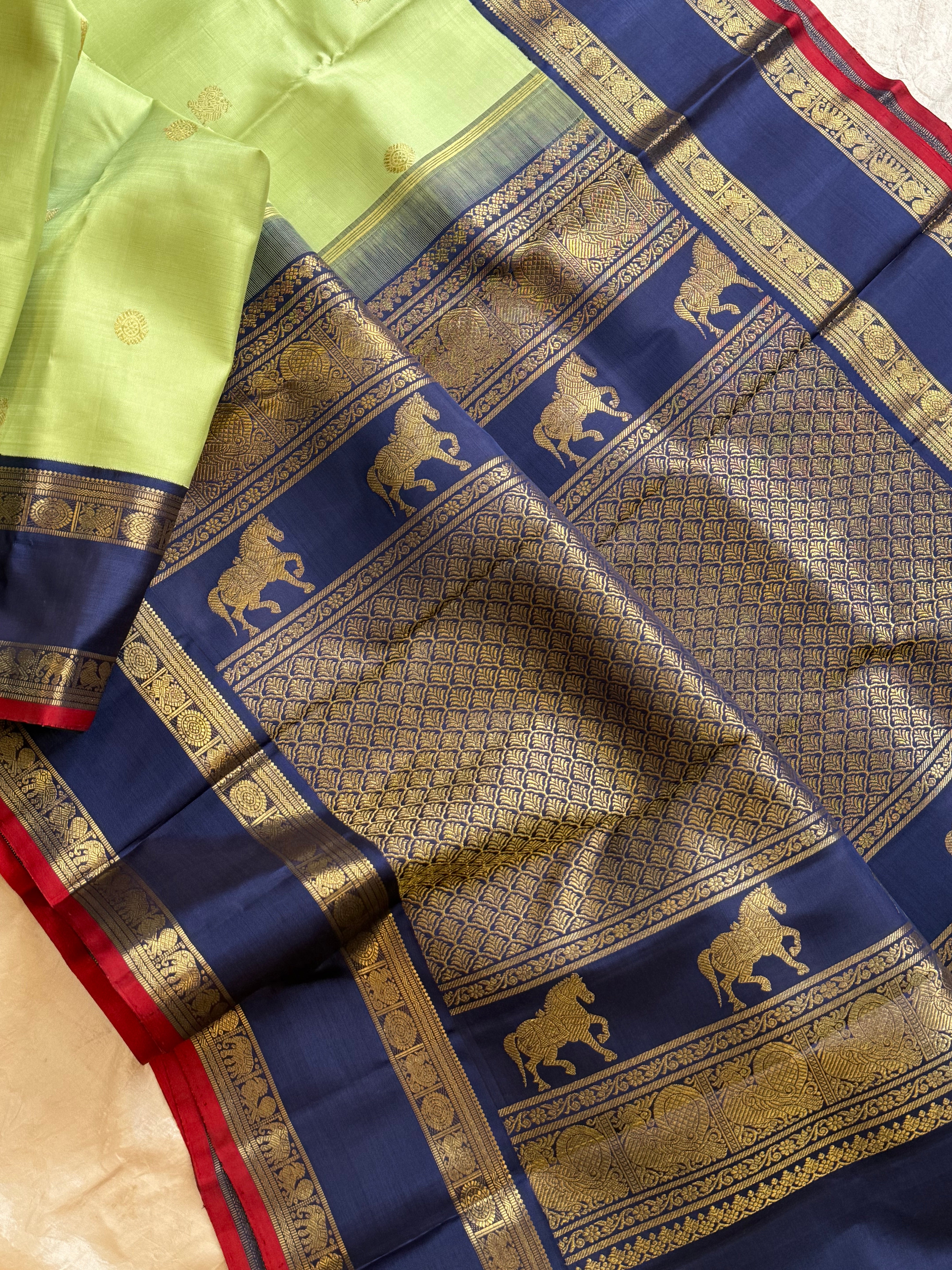 The saree is pista green colour with Annam chakram butta and the border is dark blue retta pet annam chakram with ruby red selvedge and the Palla is dense pure Zari Palla and blouse