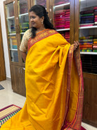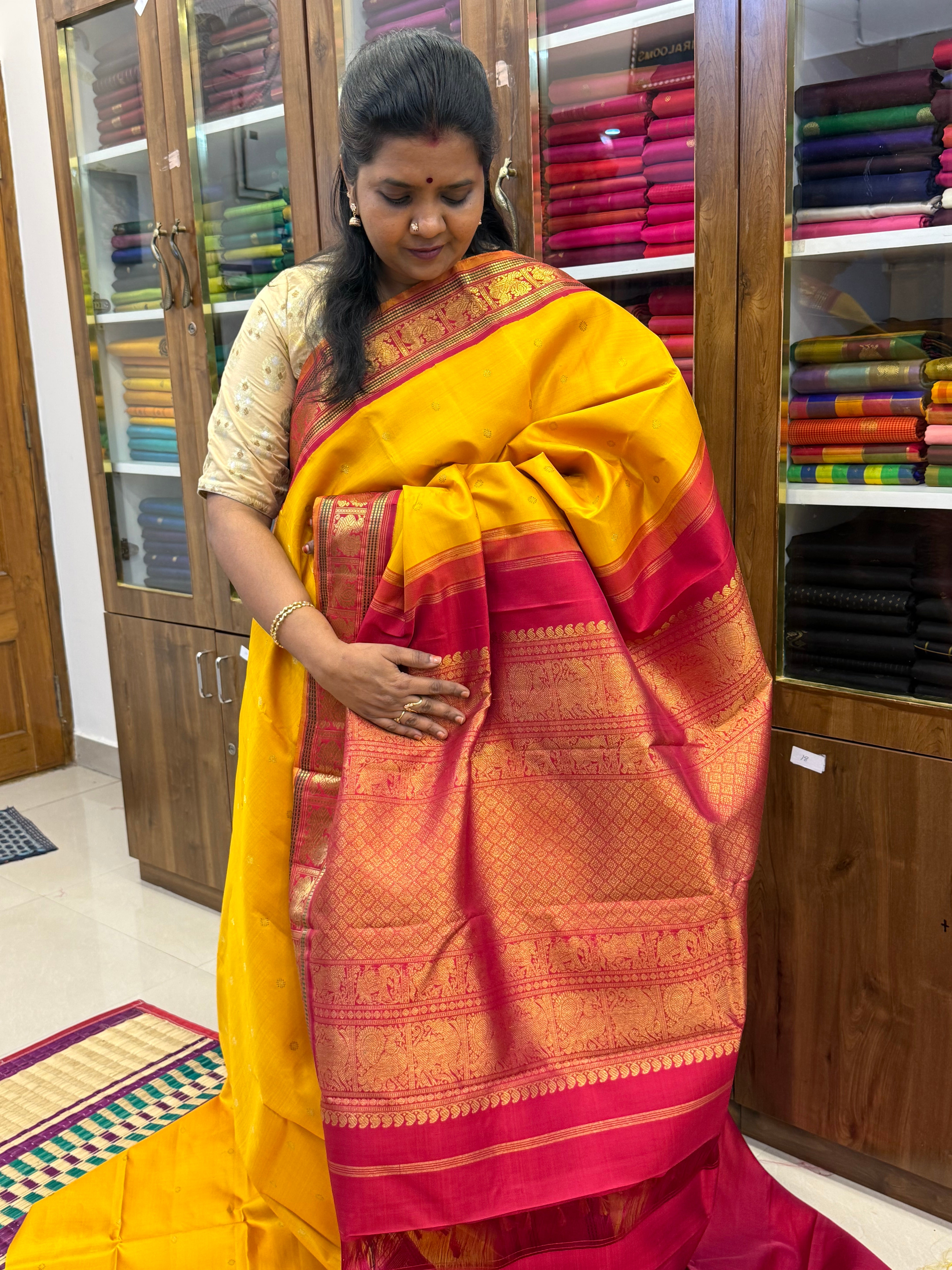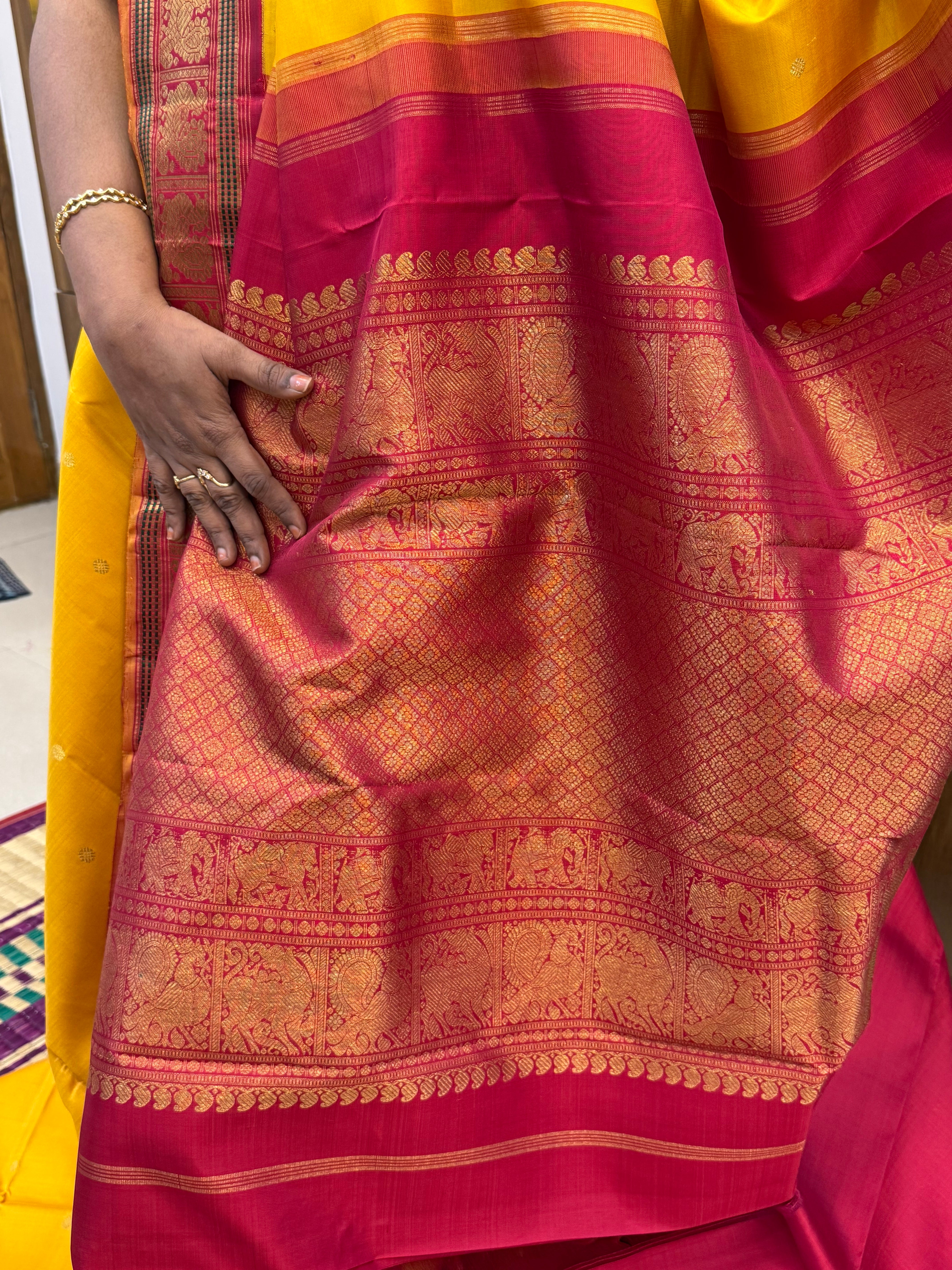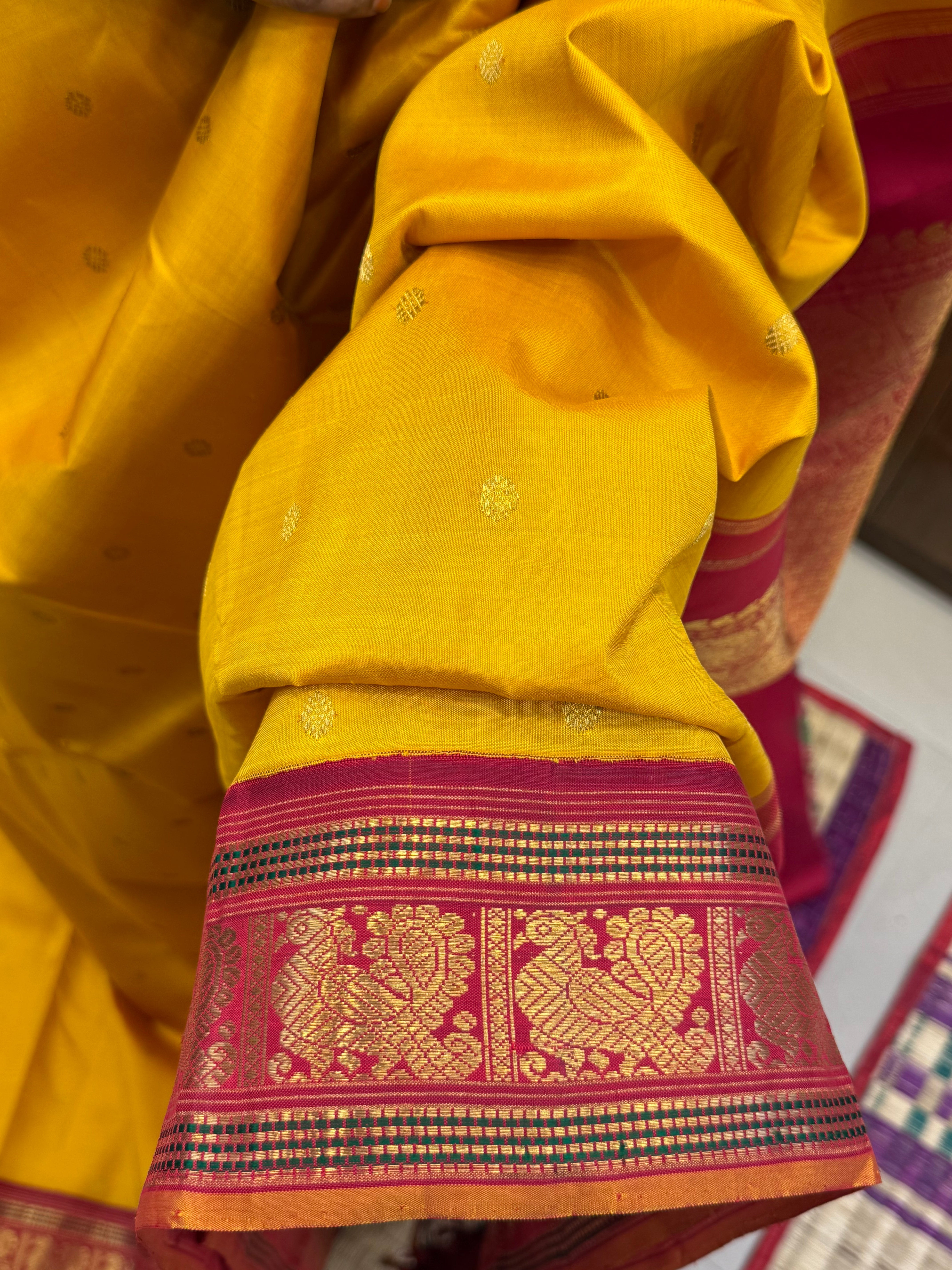 This saree is designed by master weaver with annam pet border in red Kai Korvai and yellow body with Kamalam Butta and the Palla is dense pure Zari Palla and blouse