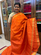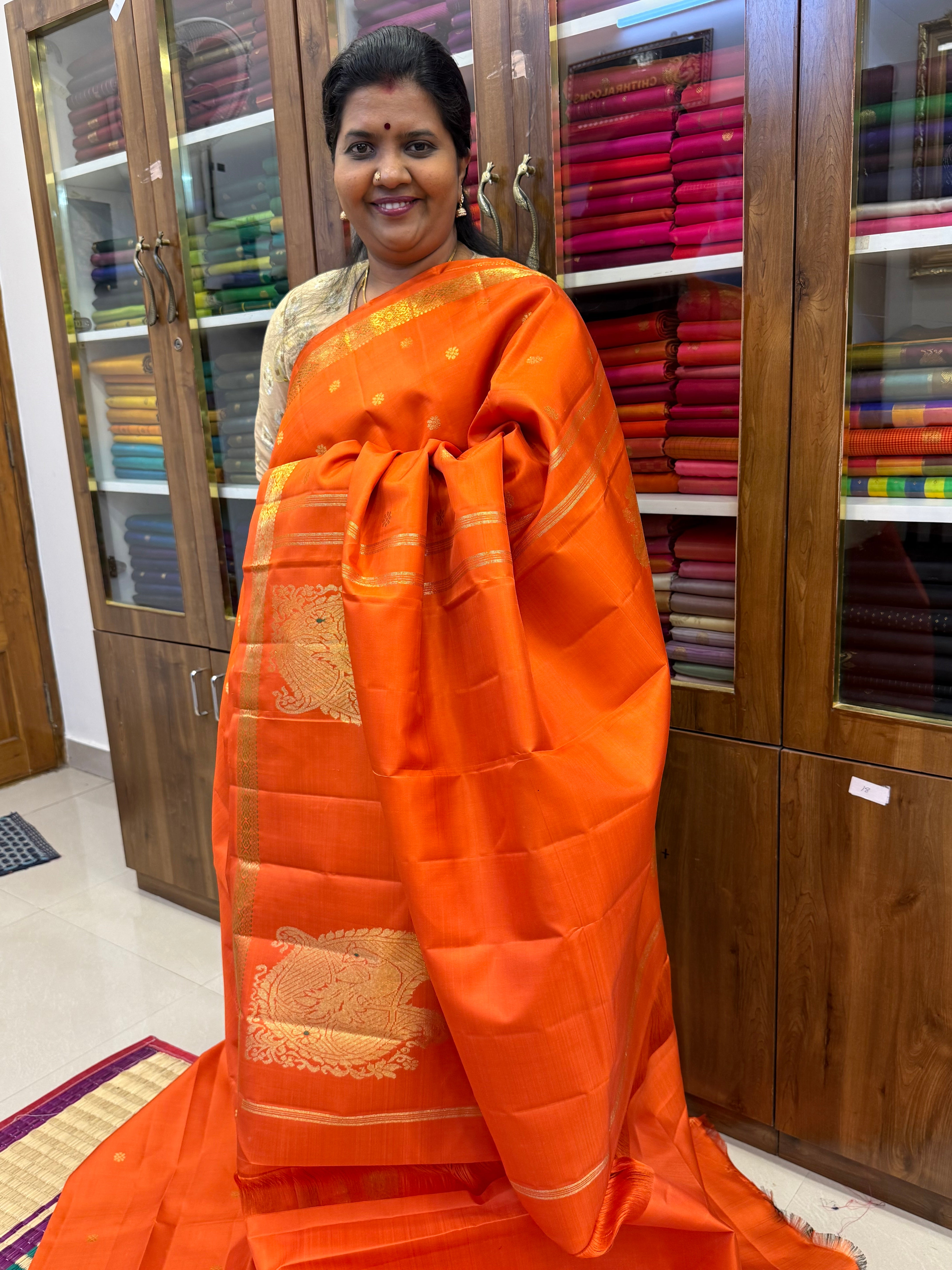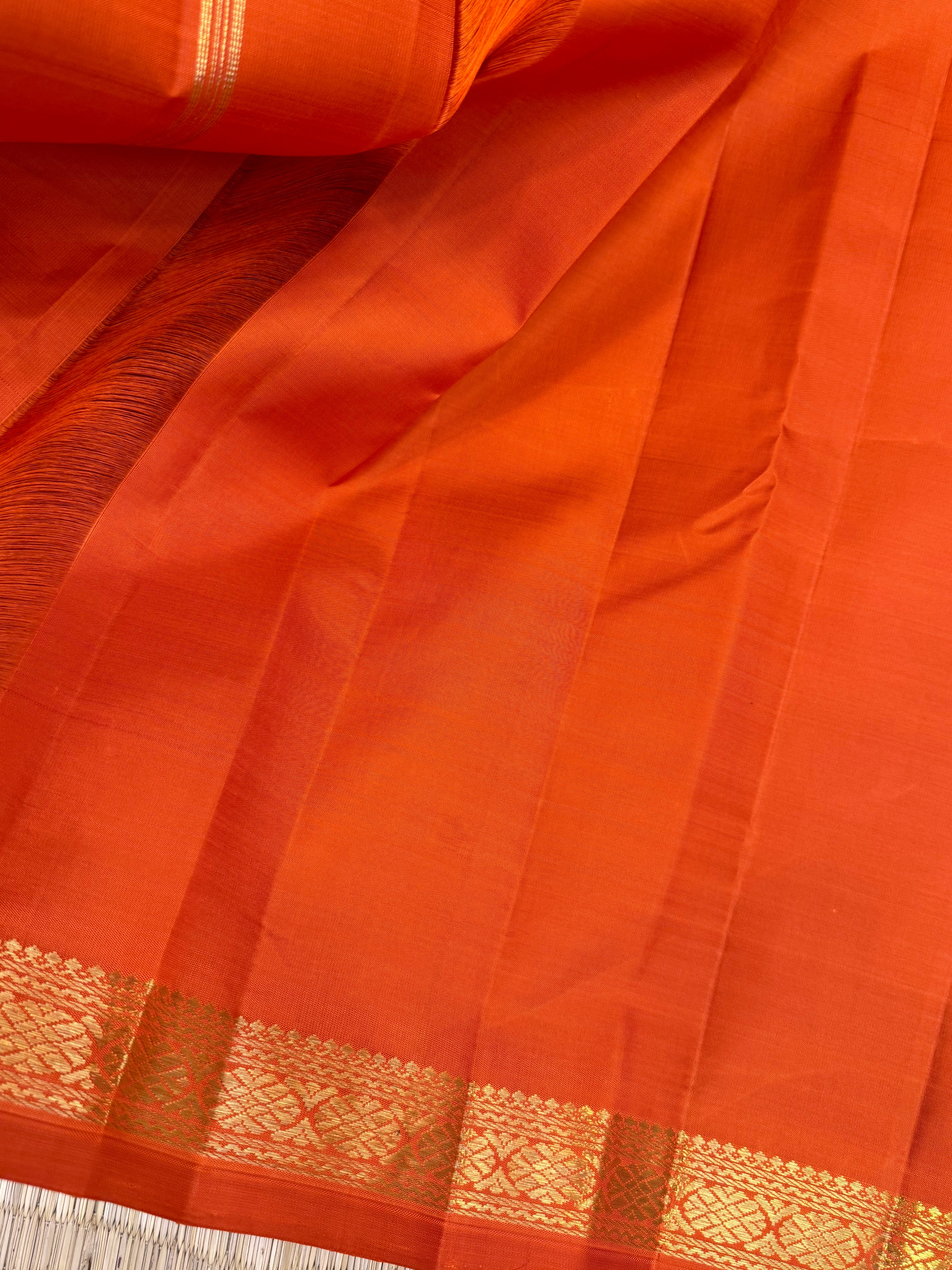 This saree is rust color with kamalam Butta and the border is Kamalam Kodi pet and 4 corner Adai Palla with paisley and annam attached blouse . Pure Zari Adai woven kanjipuram.