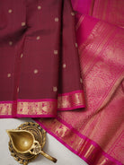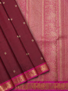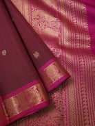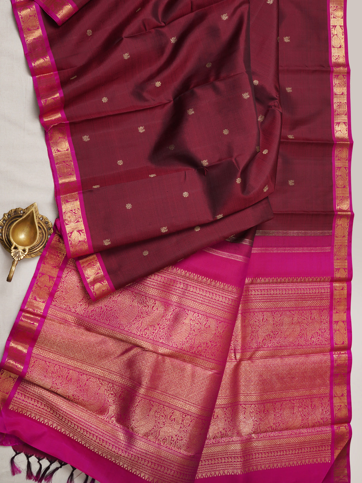 The body is deep Paaku colour with annam chakram Butta and small pink border having annam manga pet and dense pure Zari Palla and blouse