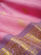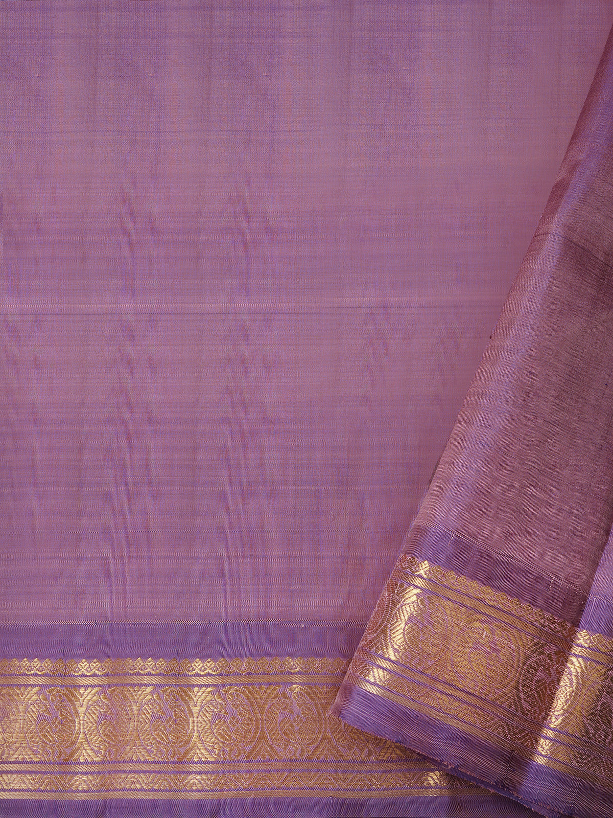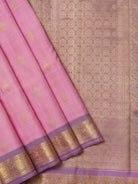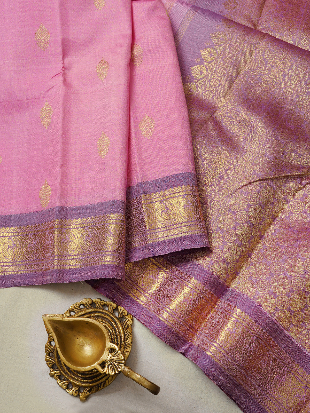 The body is pink color with Thilagam Butta and border is lavender colour with thogai annam pet and dense pure Zari Palla