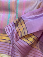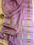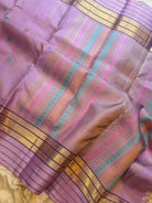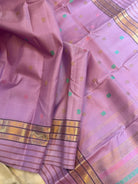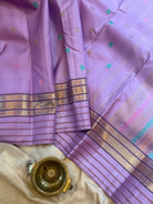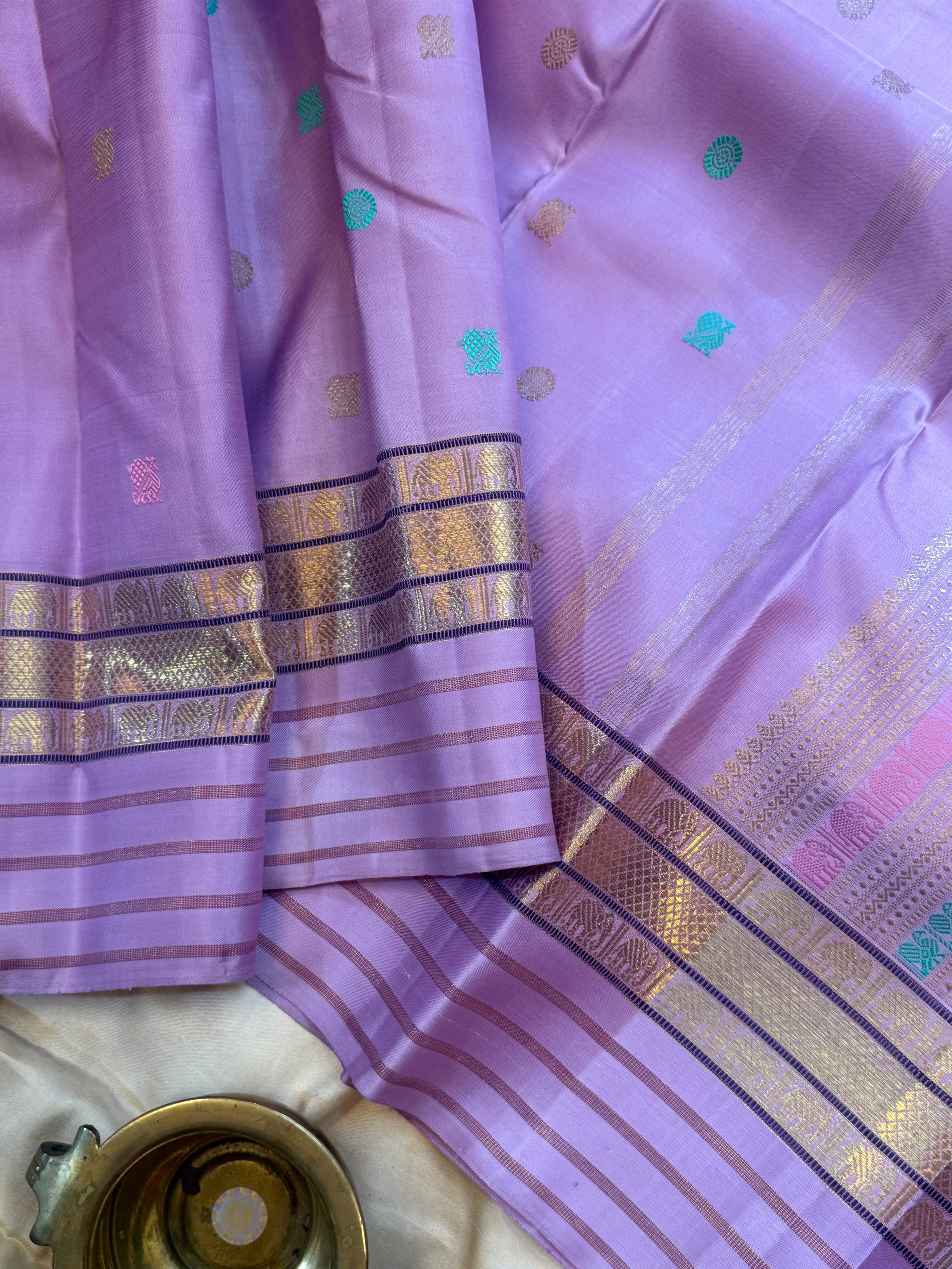 The body is lavender colour with annam chakram Butta in pure Zari and thread work and kaal erangina border in annam Kuil kann pet and dense pure Zari varisapet Palla and blouse