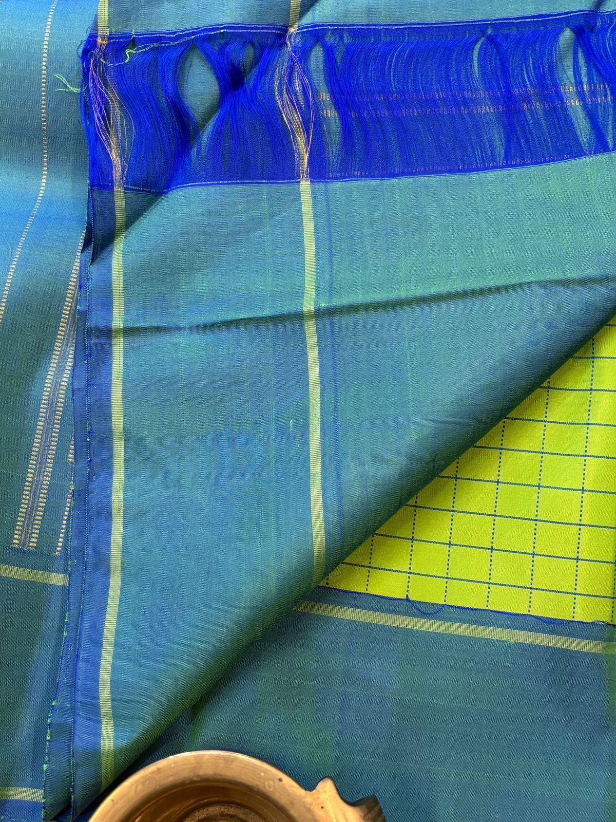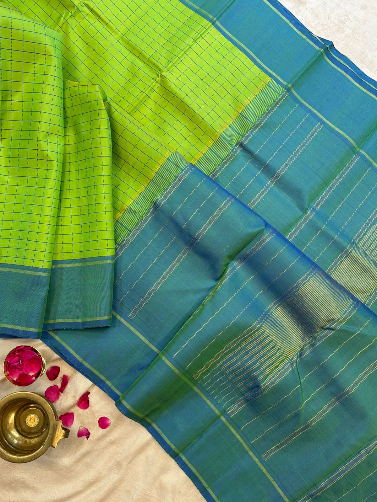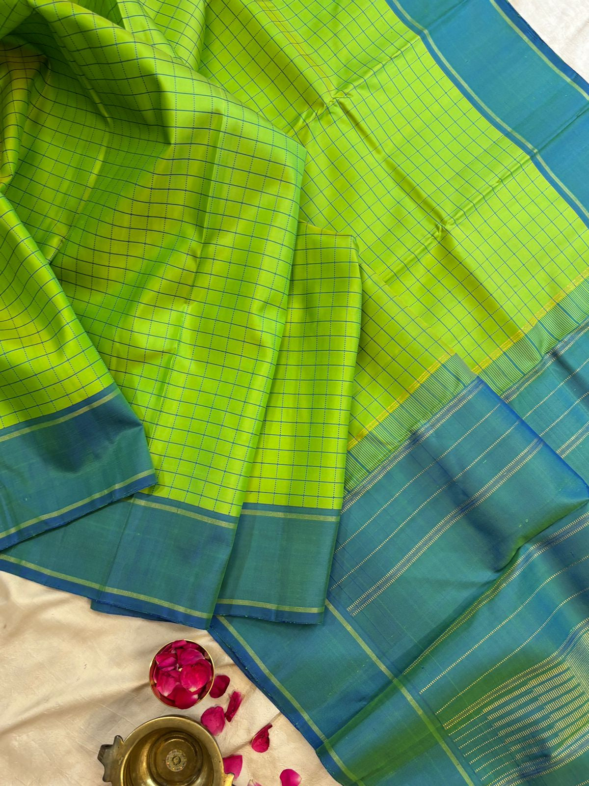 Lime green and rama blue checks / kanjipuram silk
