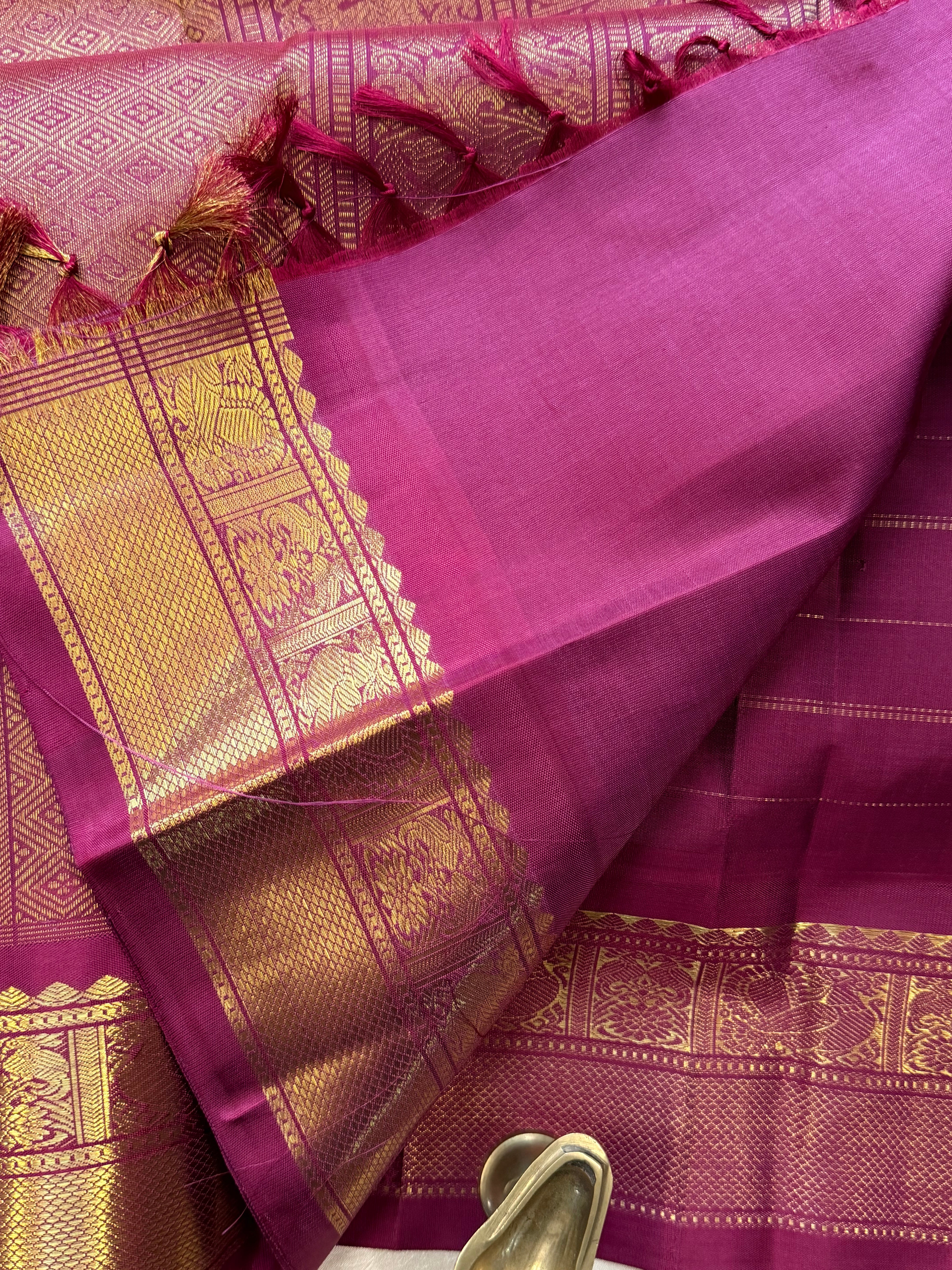 The body is mauvish pink color with retta Muthu Kattam and Zari Kattam where the criss cross portion has star Butta and the border is annam , Jodi annam pet and dense pure Zari Palla and blouse